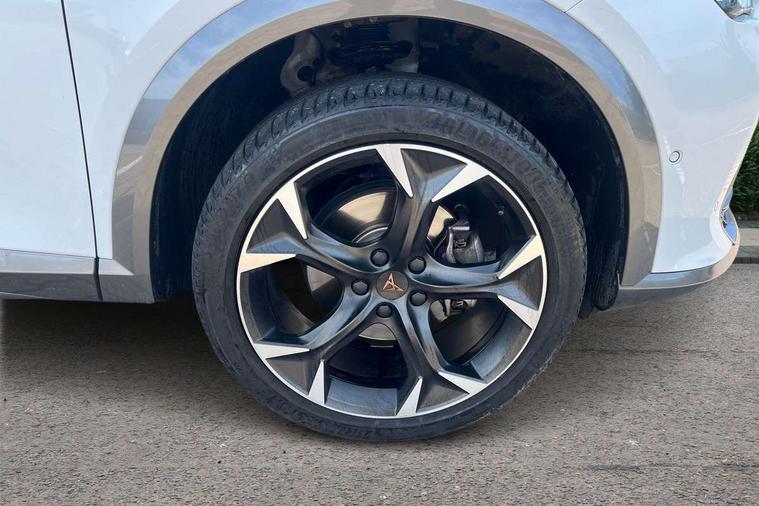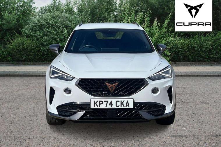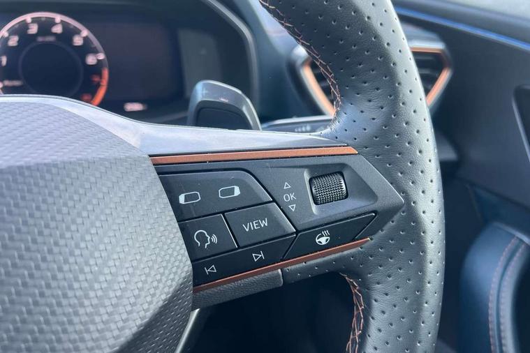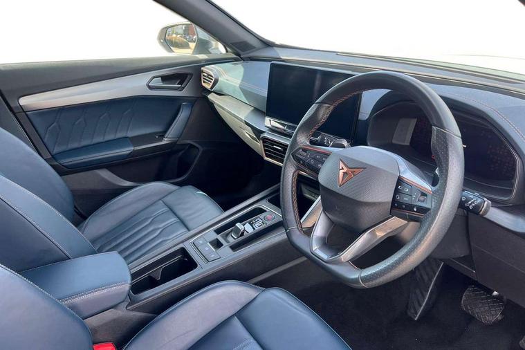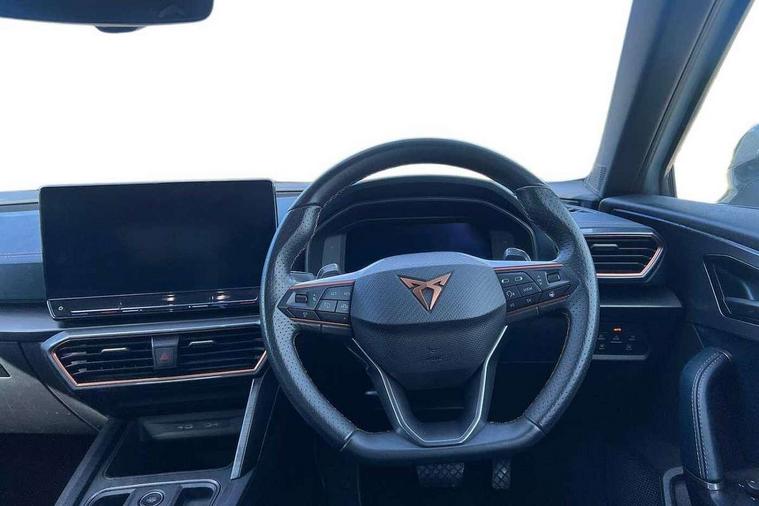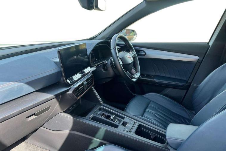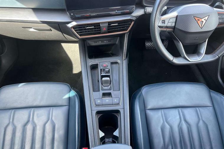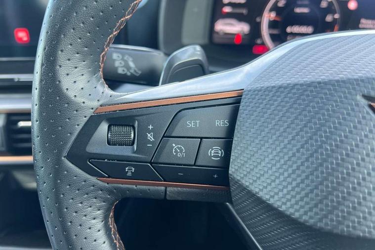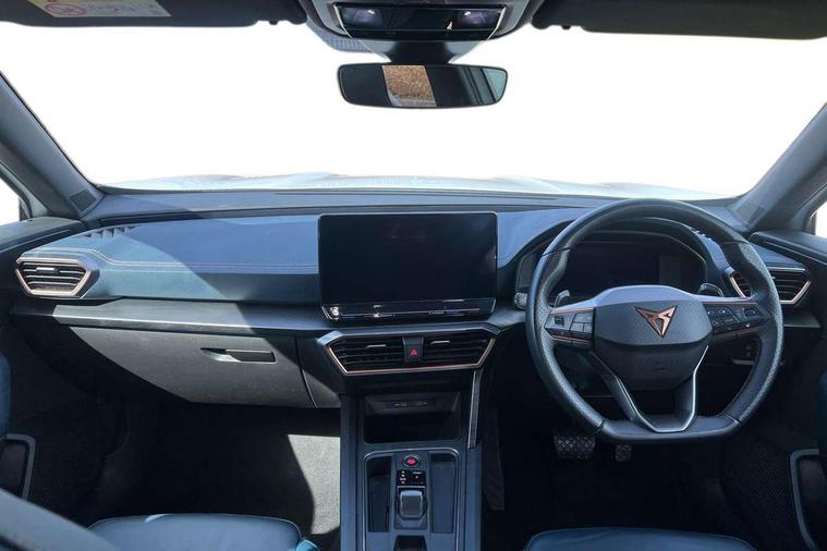 Digital cockpit and configurable dashboard, Driver alert system, Driving profile selection, Forward collision warning with automatic braking, Lane assist, Navigation system with 12'' Touchscreen Display, Park assist (inc front/rear parking sensors), PAS, Predictive adaptive cruise control with speed limiter, Rear view camera, RPM, trip computer, outside temp gauge, instrument light brightness, low fuel warning light, lights on reminder, gearshift indicator, Service interval indicator, Start/stop system with regenerative braking, Voice control system, Wired Android Auto, Wireless apple carplay, Wireless phone charger, Electronic locking differential and dynamic traction support, Standard suspension, 2 front and 2 rear USB type C sockets, Auxiliary input socket, DAB radio, Auto dimming rear view mirror, Body colour door handles, Body coloured bumpers, Dark grey wing mirror, Daytime running light with automatic headlight control and coming home feature, Dynamic headlight range control, Electric front/rear windows, Electrically adjustable heated and folding door mirrors with memory function, Front fog lamps with cornering function, Gloss black roof rails and window surrounds, LED Headlights, LED Taillights with dynamic indicator, Rain sensing wipers, Rear diffuser with black simulated exhaust pipes, Rear side wing doors, Rear wash/wipe, Third brake light, Tinted rear windows, Welcome lights, 12v power supply in centre console, 12V socket, 12v socket in loadspace, 2 front and 2 rear reading lights, 230V socket, 3 seat bench in 2nd row, 60/40 split rear bench seat with armrest and mechanical seat release, Black headlining, Dust/pollen filter, Front and rear head restraints, Front centre armrest, Height/reach adjust steering wheel, Illuminated interior front door sills, Illuminated sunvisor with mirror, Isofix, Leather multi function heated steering wheel with gear shift paddles, Luggage tie-down hooks, Single front passenger seat, Three zone climate control with control panel in rear, Variable luggage/load compartment floor, Wraparound lighting, Genuine Nappa leather Pack - Cupra, 3 point seatbelts on all rear seats, ABS, Brake control system - ESC and brake booster, Child proof door locks, Driver and front passenger airbags with front passenger airbag de-activation, Electronic parking brake, Front and rear disc brakes, Front side curtain airbags, Hill hold control, Public e-call, Seat belt reminder for front and rear seats, Tyre pressure monitoring system, Anti theft alarm system, Keyless entry and start system (KESSY), Locking wheel bolts, Copper and aluminium interior detailing, 19" 'Exclusive' machined sport matte black and silver alloy wheels,