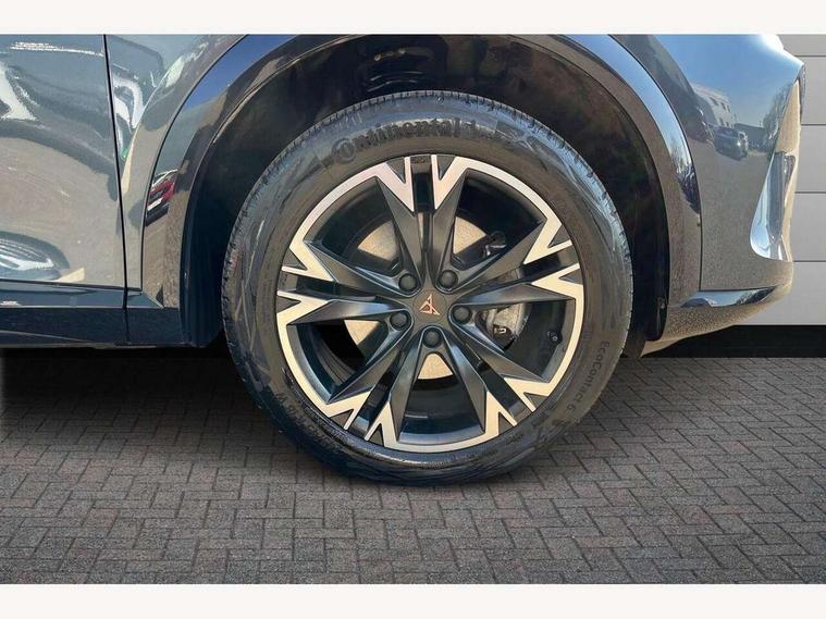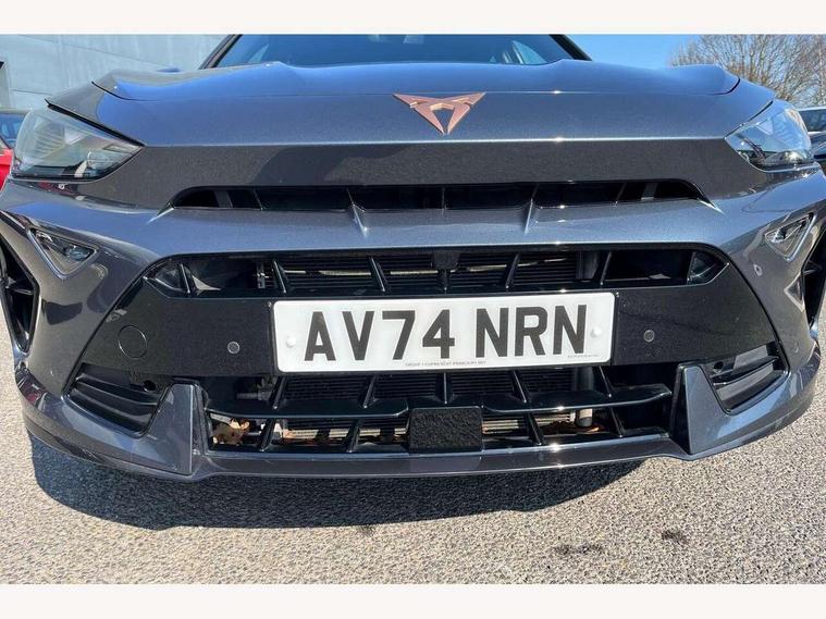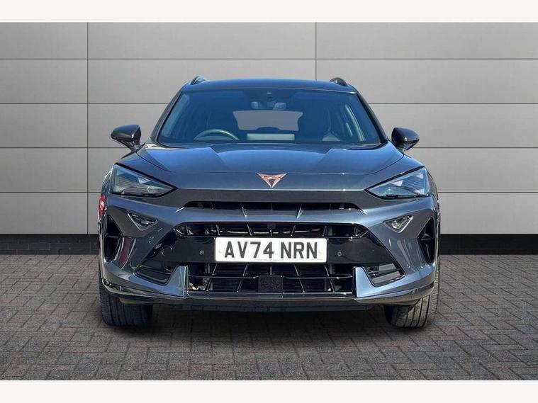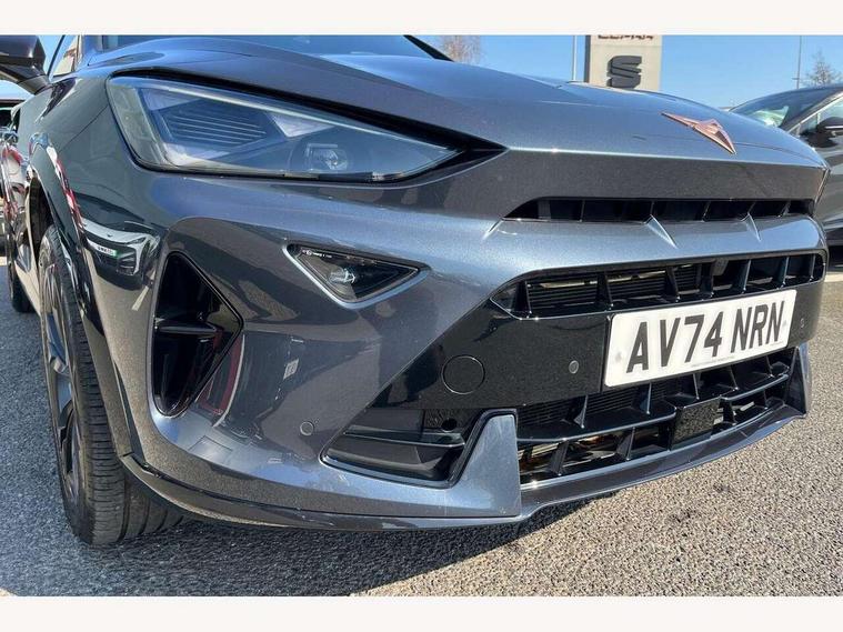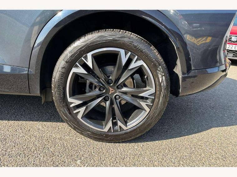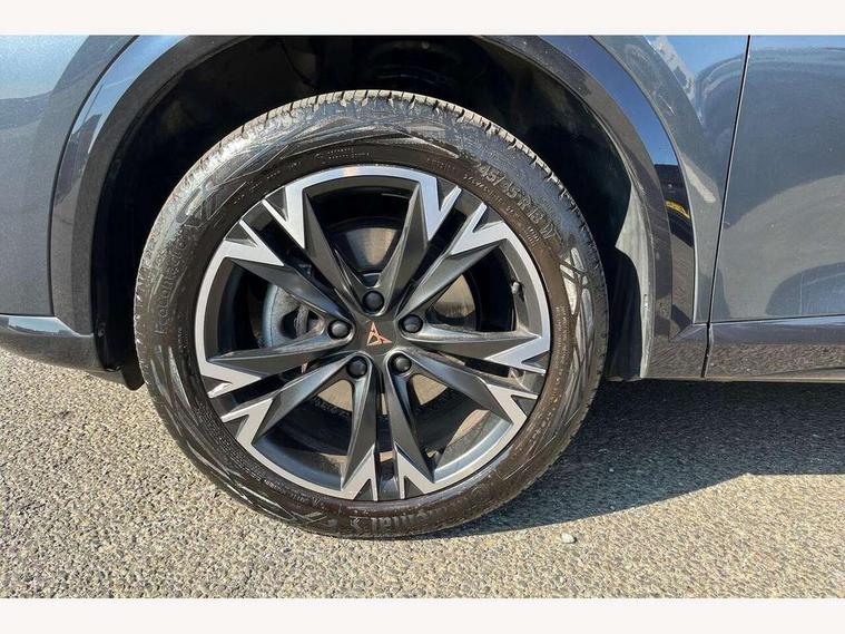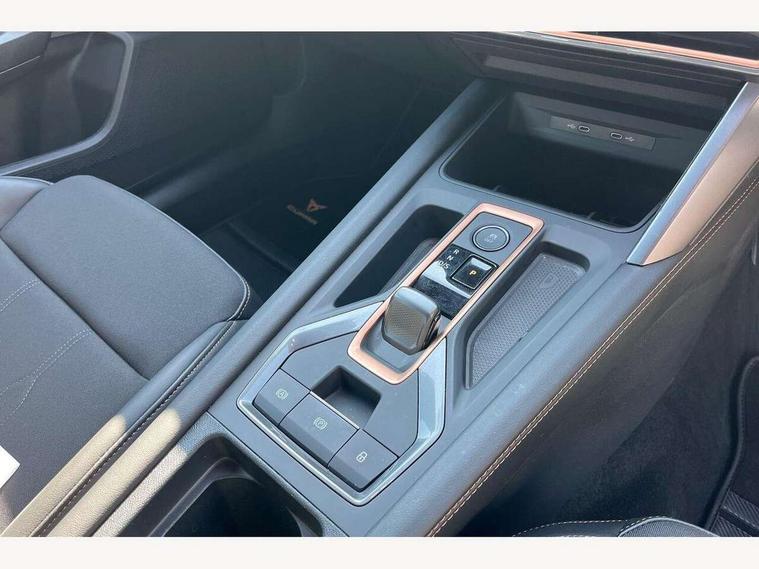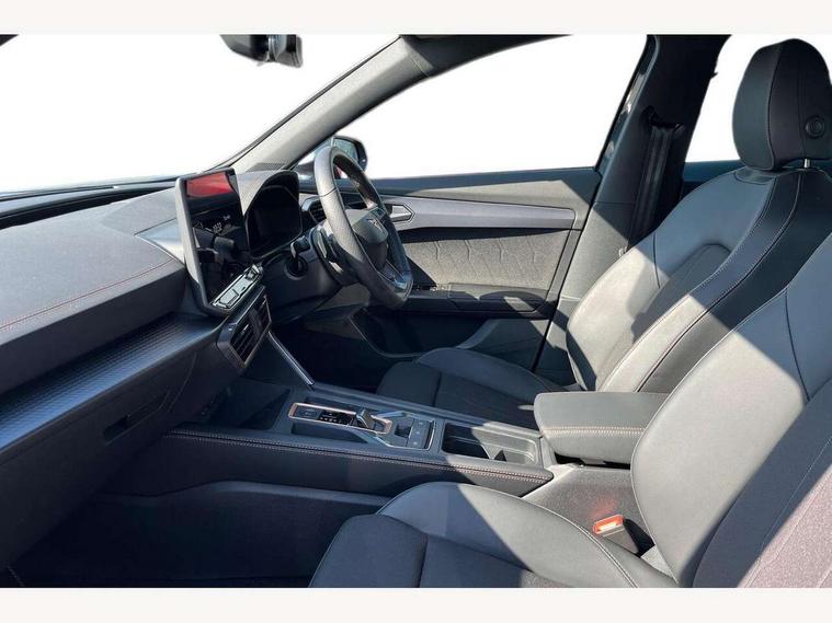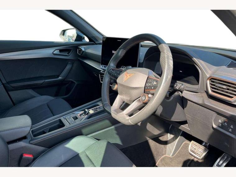 10.25" digital cockpit and configurable dashboard, Adaptive cruise control with follow-to-stop and speed limiter, Advanced driver alert system, Driving profile selection, Dynamic road sign display, Emergency steering support with turn assist, Forward collision warning with automatic braking, Front and rear parking sensors, Full link phone integration, Lane assist, Progressive steering, RPM, trip computer, outside temp gauge, instrument light brightness, low fuel warning light, lights on reminder, gearshift indicator, Service interval indicator, Start/stop system with regenerative braking, Voice control system, Wired Android Auto, Wireless apple carplay, Wireless phone charger, CUPRA sport suspension, Electronic locking differential and dynamic traction support, 2 front and 2 rear USB type C sockets, 7 speakers, Media system with navigation, 12.9" touchscreen display, voice control, DAB, steering wheel mounted controls, Auto dimming rear view mirror, Body colour door handles, Body coloured bumpers, Dark grey wing mirror, Daytime running light with automatic headlight control and coming home feature, Door panel ambient lighting, Dynamic headlight range control, Electric front/rear windows, Electrically adjustable, heated and folding door mirrors, Gloss black roof rails and window surrounds, High beam assist, LED 3rd brake light, LED front fog lamps with cornering function, LED Headlights, LED Taillights with dynamic indicator, Rain sensing wipers, Rear diffuser with black simulated exhaust pipes, Rear fog lights, Rear side wing doors, Rear wash/wipe, Tinted rear windows, Welcome lights (within exterior mirror housing), 12V socket, 2 front and 2 rear reading lights, 3 seat bench in 2nd row, 60/40 split rear bench seat with armrest and mechanical seat release, Black headlining, Black interior roof lining, Cupra sports pedals, Dust/pollen filter, Front and rear head restraints, Front centre armrest, Heated supersports multifunction leather steering wheel with satellite buttons and gear shift paddles, Height/reach adjust steering wheel, Illuminated aluminium doorsteps, Illuminated interior front door sills, Illuminated sunvisor with mirror, Interior ambient lighting, Isofix, Manually adjustable height and lumbar support for front seats, PVC/Cloth upholstery with copper stitching + Sport seats, Satellite steering wheel, Single front passenger seat, Storage pockets on rear of front seats, Three zone climate control with control panel in rear, Variable luggage/load compartment floor, 3 point seatbelts on all rear seats, ABS, Brake control system - ESC and brake booster, Child proof door locks, Driver and front passenger airbags with front passenger airbag de-activation, Electronic parking brake, Front and rear disc brakes, Front side curtain airbags, Hill hold control, Public e-call, Seat belt reminder for front and rear seats, Tyre pressure monitoring system, Anti theft alarm system, Central locking system Keyless Go, Locking wheel bolts, Copper and aluminium interior detailing, 18" Sonora machined silver alloy wheels,