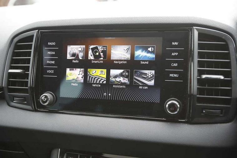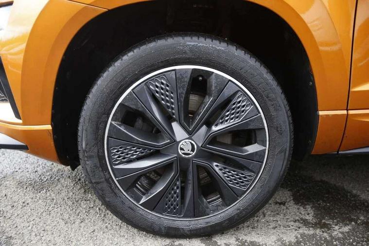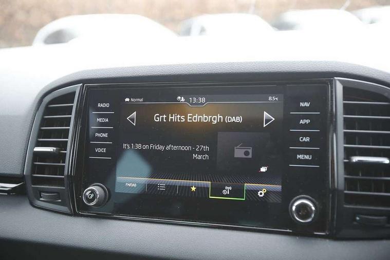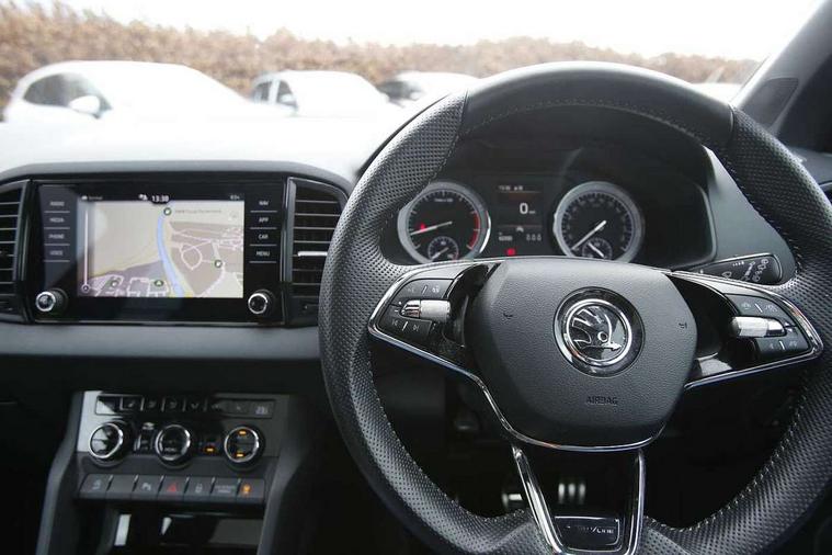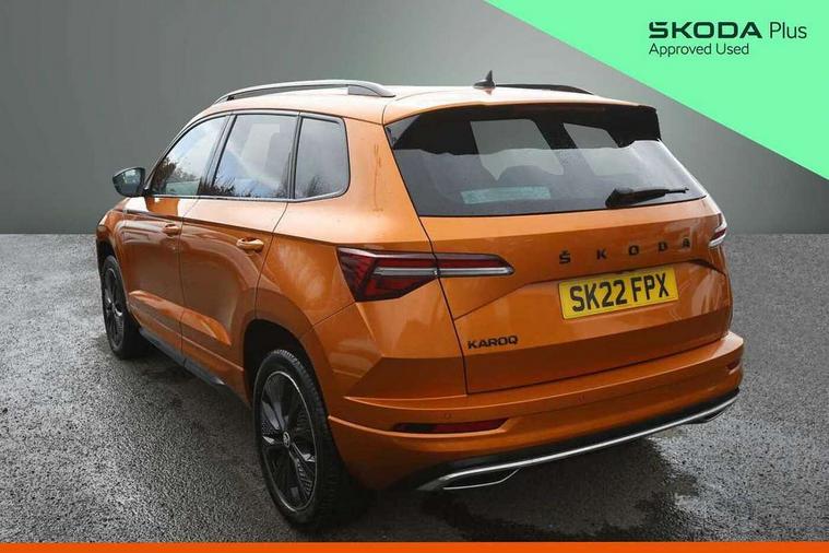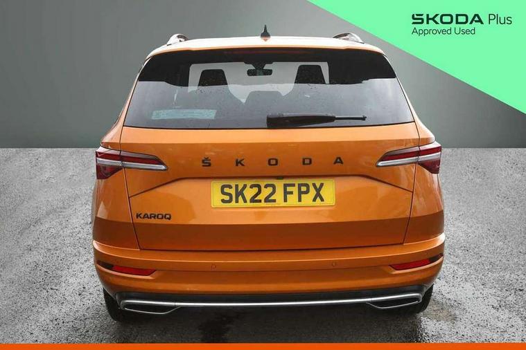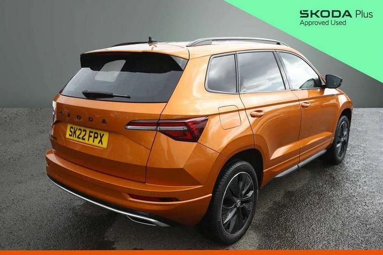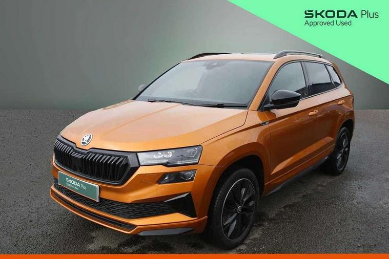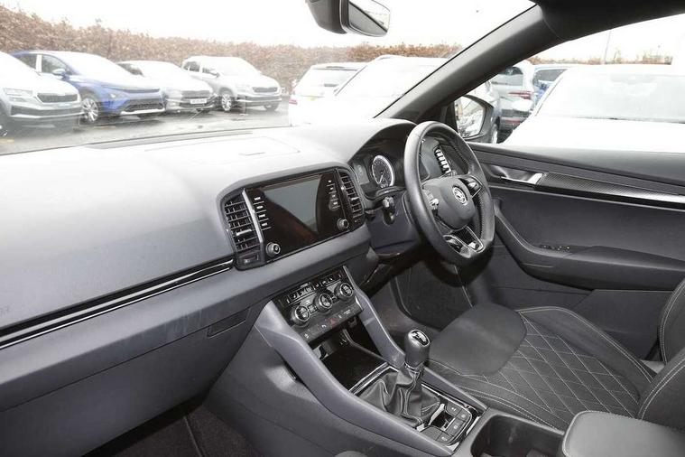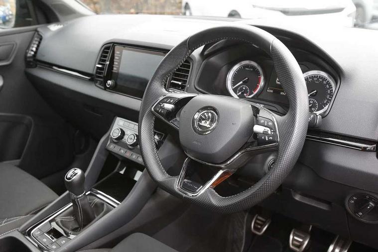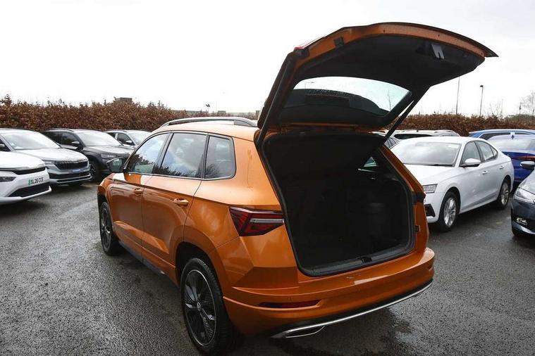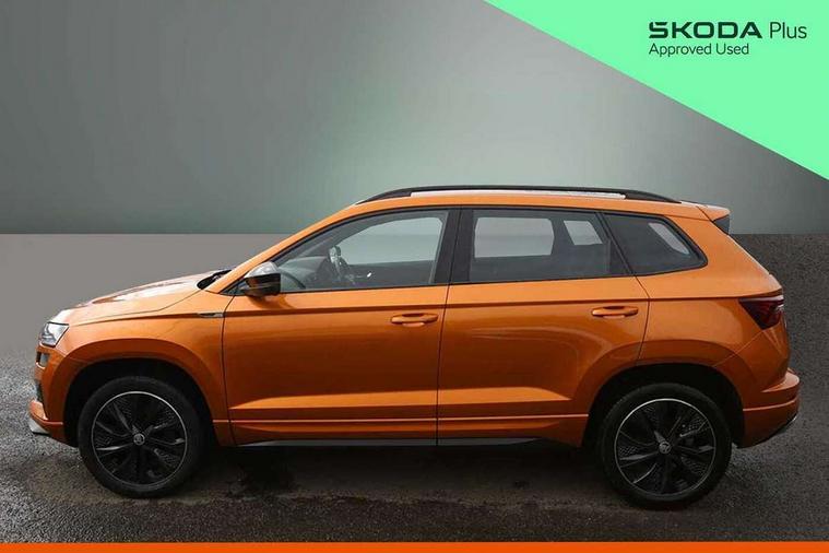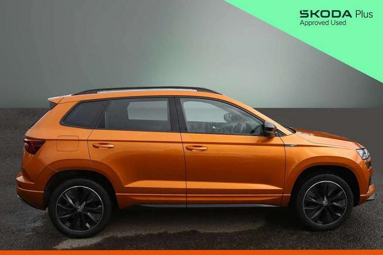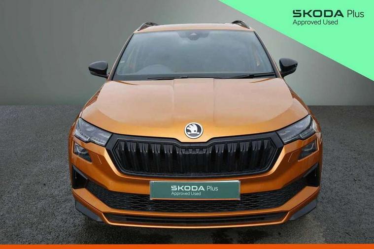 Care connect, Driver fatigue sensor, Emergency services call system, Multifunction colour trip computer, Outside temperature gauge, Service interval indicator, SmartLink wireless for Apple and wired for Android, Start/stop system with regenerative braking, USB C Port x 2 in front centre console, Virtual pedal with electrically operated boot door, 8 Speakers, DAB radio with Bluetooth, USB connection, Acoustic glass, Aero front windscreen wipers with intermittent function, Auto dimming rear view mirror with light and rain sensors, Automatic headlight control system, Black door mirrors, Black electric window control buttons, Black radiator grille, Black roof rails, Body colour door handles, Body coloured bumpers, Electric front and rear windows with child proof lock, Front door steps with SportLine logo, Heated rear windscreen, LED daytime running lights, LED rear lights with high functionality welcome effect and dynamic indicators, Light assistant (coming/leaving home/tunnel light), Panoramic sliding sunroof, Privacy glass, Protective door side sills in body colour, Rear diffuser, Rear side wing doors, Rear spoiler, Rear wiper, Safety reflectors on front doors, Skoda lettering on tailgate in black, Sportline badge on front fender, Sportline decorative inserts with badging, Sports front and rear bumpers, 1.5 litre bottle holders in driver and front passenger door panels, 12V socket in boot, 12v socket in front centre armrest with storage compartment and rear air vents, 2 Folding hooks and nets in boot, 3 rear height adjustable headrests, 3 seat bench in 2nd row, 3 spoke leather sports multifunction steering wheel and silver stitching, 4 foldable roof handles with rear coat hooks, Black floor carpet, Black roof headlining, Chrome inner door handles, Double sided boot floor, Foldable hooks in the boot, Front head restraints, Height adjustable front three point seats belts with tensioners, Height/reach adjust steering wheel, Ice scraper, Illuminated and cooled glovebox, Illuminated luggage compartment, Isofix child seat preparation outer rear, Manual lumbar support for front seats, Pen holder, Pollen filter, Rear reading lights, Rear seats fixed folding and divided 60:40, Retractable parcel shelf attachable to tailgate, Rubbish bin door, Safety vest holder, Single front passenger seat, Solid rear boot cover, Storage box in upper central dashboard closed, Sunvisors with illuminated vanity mirrors, Textile floor mats, Titan black interior ceiling, Umbrella under passenger seat, Welcome animation with sportline logo, Light Pack - Karoq, Parking pack - Karoq, Airbags - Front side, head, knee and curtain, Automatic door unlocking in case of crash, Automatic fuel cut off in case of crash, Child locks on rear doors, Driver airbag, Electronic parking brake with auto hold function, Emergency rear braking signal, ESC including ABS, MSR, ASR, EDS, HBA, DSR, RBS, MKB and traction control, Front assist radar scanning of the space in front of the car with automatic braking, Hill hold control, Passenger airbag with switch-off function, Pedestrian monitor, Seatbelt reminder signalisation and pretensioner for all seats, Three point seatbelts rear, Two tone horn, Tyre pressure display, Tyre pressure monitor, Alarm with interior monitoring, back up horn and tilt sensor with safe function, Electronic engine immobiliser, Keyless entry and start/stop system with SAFE system, Remote central locking with 2 remote folding keys, Black air vent surround, Black centre console, Satin black dashboard, Satin black door trim, 18" Procyon alloy wheels in black, Anti-theft wheel bolts protection, Matt black aero hub caps, Storage on wheel cover,
