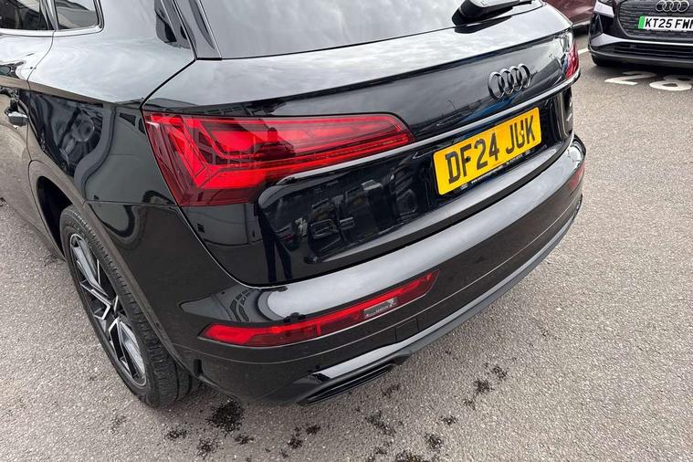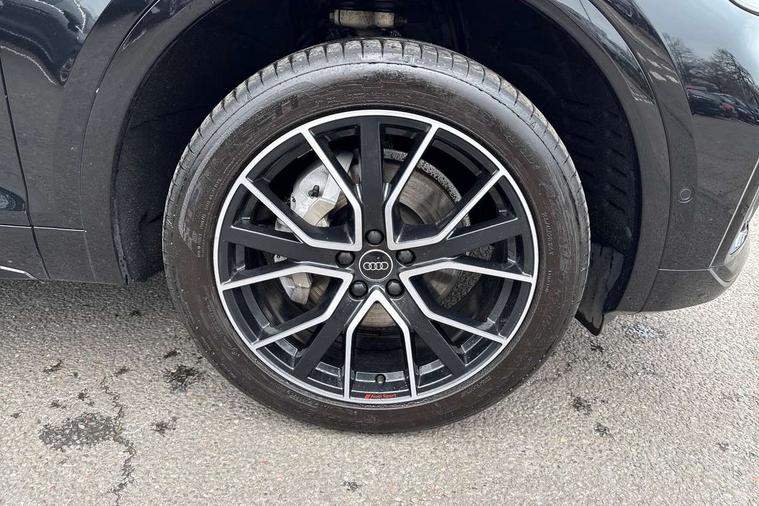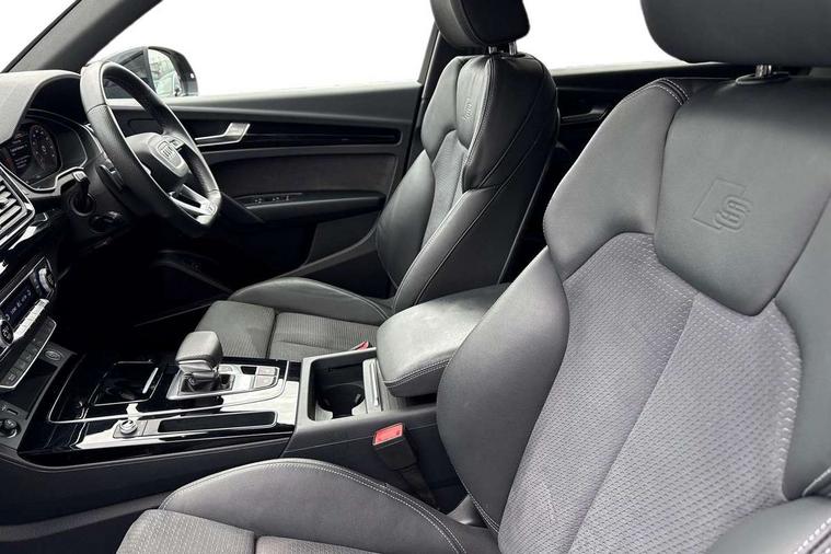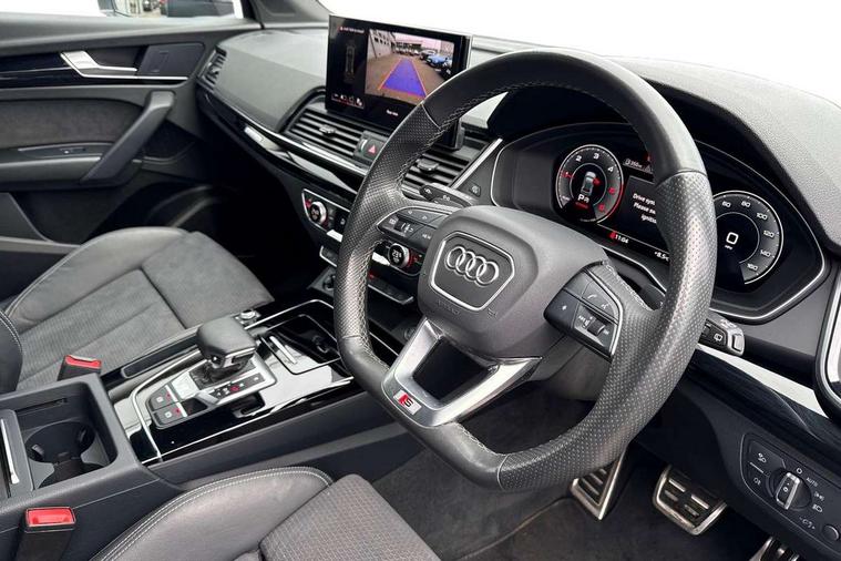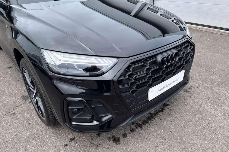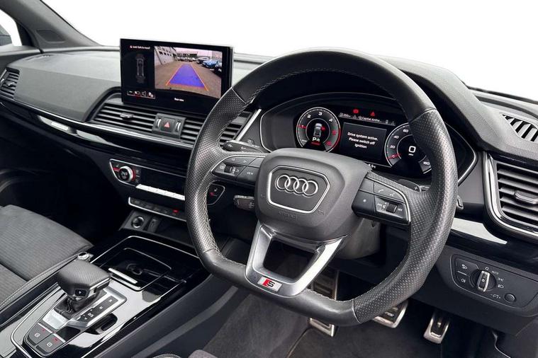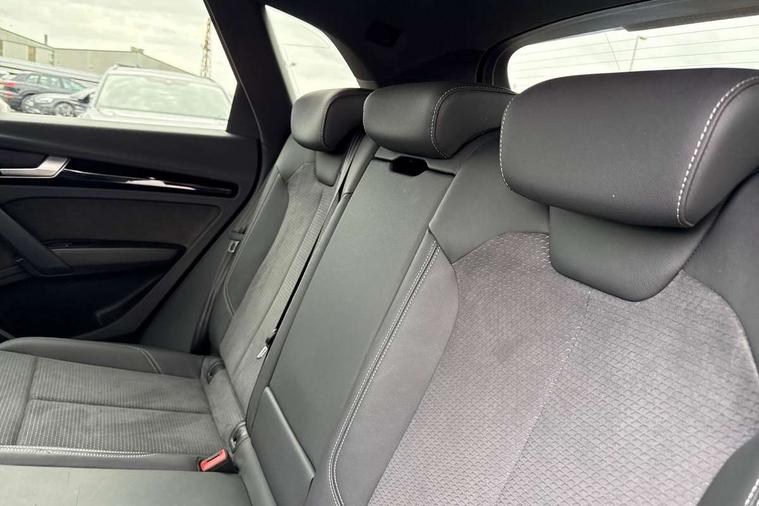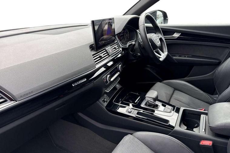 Acoustic front and rear parking sensor, Audi connect safety and service (e-call), Audi drive select, Audi virtual cockpit plus with 12.3" screen and three different layout designs, Audi wireless smartphone interface, Automatic start-stop system with coasting functionality and efficiency programme, Bluetooth interface, Camera based traffic sign recognition, Electro - mechanical power assisted steering, Lane departure warning, MMI navigation plus with 10.1" touch screen, Power tailgate, Reversing camera, Service interval indicator, Voice control system with Audi hotword activation "Hey Audi", Diesel particulate filter, Quattro on demand, S line sports suspension, 2 x USB charging port with aux input socket, 8 loudspeakers, DAB Digital radio, Acoustic windscreen, Auto dimming door mirrors, Auto dimming frameless rear view mirror, Automatic headlight adjustment, Automatic headlights and windscreen wipers, Black roof rails, Black styling with black rings, Body colour bumpers, Body colour rear diffuser with matt aluminium silver surrounds, Body colour underbody protection, Chrome plated exhaust trims, Daytime running lights, Door sills in Selenite silver, Electric adjustable/heated/folding door mirrors, Front air inlet surrounds in aluminium, Front and rear electric windows, Front radiator grille in honeycomb design, LED 3rd brake light, LED headlights and LED tail lights, Loading edge protection in stainless steel, Lower bumpers painted in contrast Manhattan grey, Rear chrome trim strip below lights, Rear privacy glass and rear side windows, Rear side wing doors, Rear wiper, Roof bars, S Line badges on the front wing panels, S Line front and rear bumpers, S Line rear spoiler, S Line side skirts, 3 rear headrests, Black cloth headlining, Comfort front centre armrest, Contrast stitching on seats, steering wheel and gear lever gaiter, Deluxe 3 zone electronic climate control, Front head restraints, Front sport seats with S embossed logo, Front/rear floor mats, Gear lever in black leather, Heated front seats, Height/reach adjustable steering column, Illuminated door sill trims with S logo, Luggage compartment cover, Manual seat adjustment with 4-way electric lumbar support, Single front passenger seat, Stainless steel pedals, Sunvisors with vanity mirrors, Top surface of the rear centre armrest in artificial leather, High gloss pack - Q5, LED interior light pack - Q5, 3 point seatbelts on all seats, 6 airbags - Driver, front passenger, curtain and side airbags, Attention and drowsiness assist, Electrically operated child locks on rear doors, Electromechanical parking brake, Electronic stabilisation control including ABS, ASR and EDL, First aid kit with warning triangle and vests, Front passenger airbag deactivation, Hill descent control, Hill hold assist, ISOFIX child seat mounting for front passenger seat and ISOFIX child seat mounting with Top Tether for outer rear seats, Multi collision brake assist, Pop-up bonnet for pedestrian protection, Pre sense city, Seatbelt monitoring, Tyre pressure warning, Anti theft alarm, Anti-theft wheel bolts, Remote central locking, Remote control key with SAFELOCK and keyless go, Air vents inserts and centre console in gloss black, Tool kit, Tyre repair kit,