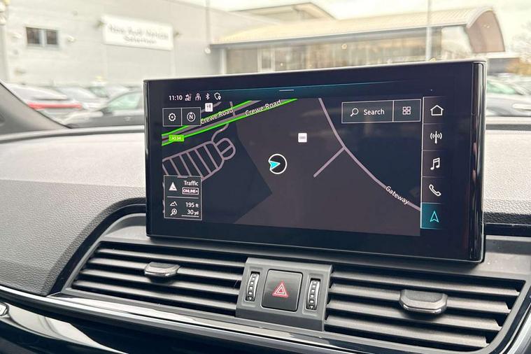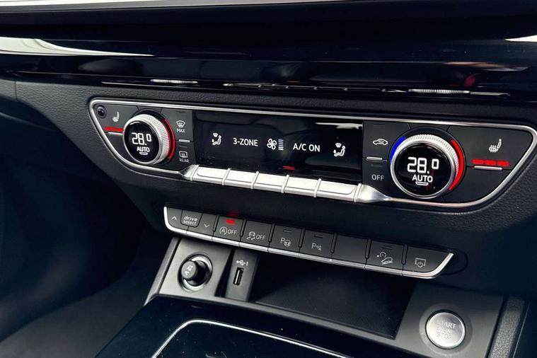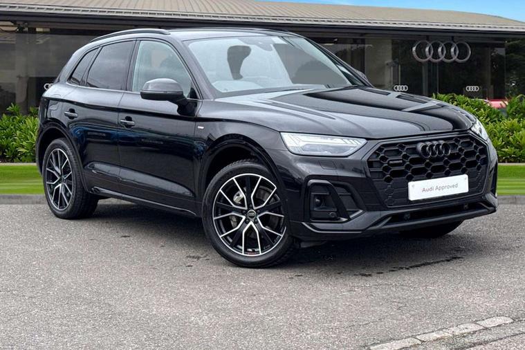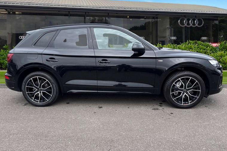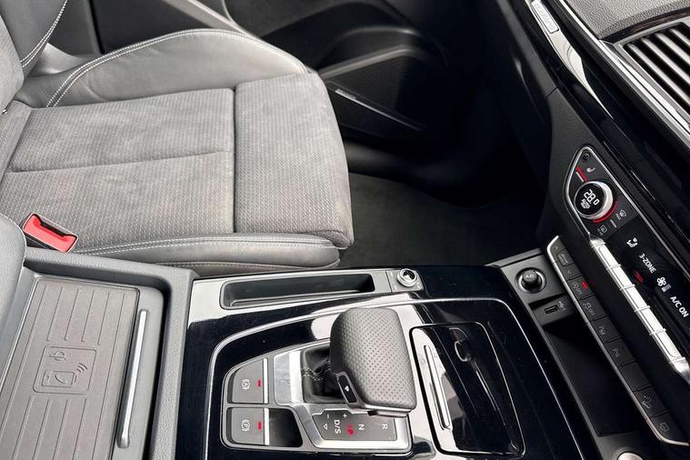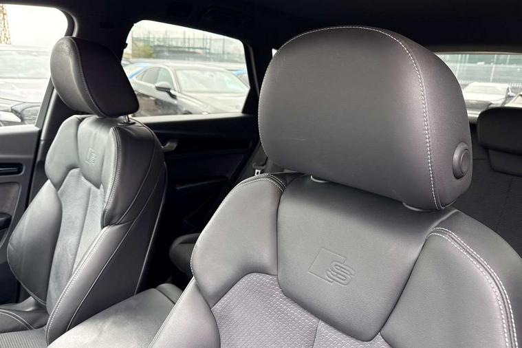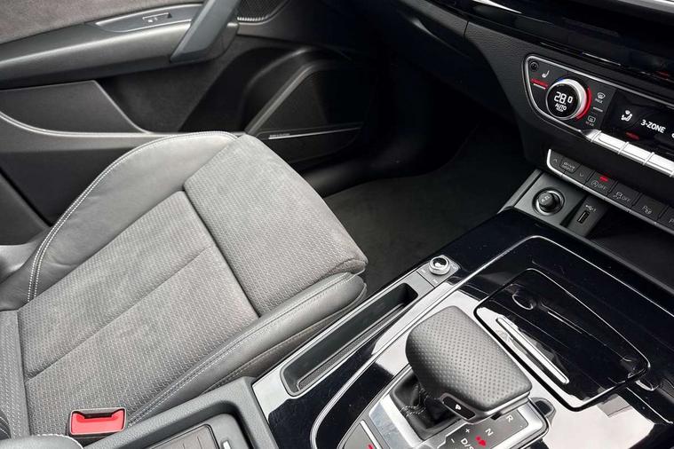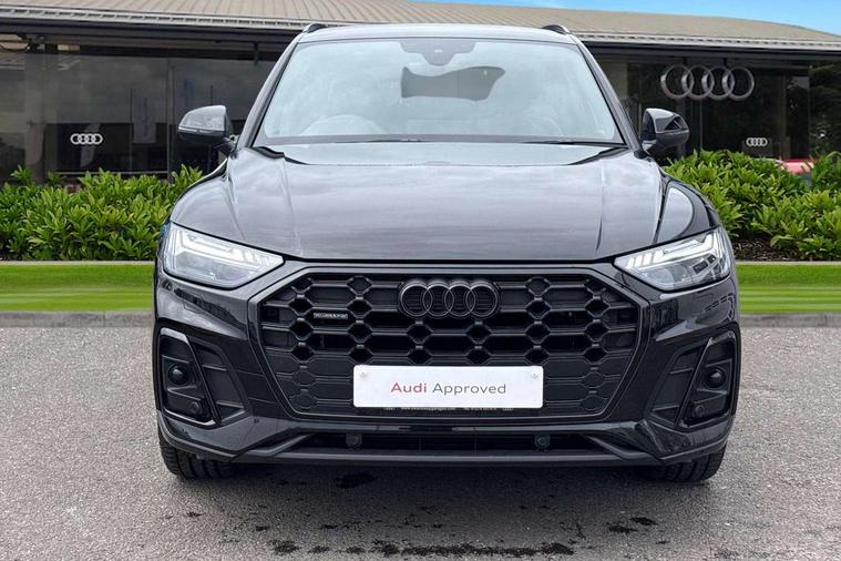 Acoustic front and rear parking sensor, Audi connect safety and service (e-call), Audi drive select, Audi virtual cockpit plus with 12.3" screen and three different layout designs, Audi wireless smartphone interface, Automatic start-stop system with coasting functionality and efficiency programme, Bluetooth interface, Camera based traffic sign recognition, Electro - mechanical power assisted steering, Lane departure warning, MMI navigation plus with 10.1" touch screen, Power tailgate, Reversing camera, Service interval indicator, Voice control system with Audi hotword activation "Hey Audi", Diesel particulate filter, Quattro on demand, S line sports suspension, 2 x USB charging port with aux input socket, 8 loudspeakers, DAB Digital radio, Acoustic windscreen, Auto dimming door mirrors, Auto dimming frameless rear view mirror, Automatic headlight adjustment, Automatic headlights and windscreen wipers, Black roof rails, Black styling with black rings, Body colour bumpers, Body colour rear diffuser with matt aluminium silver surrounds, Body colour underbody protection, Chrome plated exhaust trims, Daytime running lights, Door sills in Selenite silver, Electric adjustable/heated/folding door mirrors, Front air inlet surrounds in aluminium, Front and rear electric windows, Front radiator grille in honeycomb design, LED 3rd brake light, LED headlights and LED tail lights, Loading edge protection in stainless steel, Lower bumpers painted in contrast Manhattan grey, Rear chrome trim strip below lights, Rear privacy glass and rear side windows, Rear side wing doors, Rear wiper, Roof bars, S Line badges on the front wing panels, S Line front and rear bumpers, S Line rear spoiler, S Line side skirts, 3 rear headrests, Black cloth headlining, Comfort front centre armrest, Contrast stitching on seats, steering wheel and gear lever gaiter, Deluxe 3 zone electronic climate control, Front head restraints, Front sport seats with S embossed logo, Front/rear floor mats, Gear lever in black leather, Heated front seats, Height/reach adjustable steering column, Illuminated door sill trims with S logo, Luggage compartment cover, Manual seat adjustment with 4-way electric lumbar support, Single front passenger seat, Stainless steel pedals, Sunvisors with vanity mirrors, Top surface of the rear centre armrest in artificial leather, High gloss pack - Q5, LED interior light pack - Q5, 3 point seatbelts on all seats, 6 airbags - Driver, front passenger, curtain and side airbags, Attention and drowsiness assist, Electrically operated child locks on rear doors, Electromechanical parking brake, Electronic stabilisation control including ABS, ASR and EDL, First aid kit with warning triangle and vests, Front passenger airbag deactivation, Hill descent control, Hill hold assist, ISOFIX child seat mounting for front passenger seat and ISOFIX child seat mounting with Top Tether for outer rear seats, Multi collision brake assist, Pop-up bonnet for pedestrian protection, Pre sense city, Seatbelt monitoring, Tyre pressure warning, Anti theft alarm, Anti-theft wheel bolts, Remote central locking, Remote control key with SAFELOCK and keyless go, Air vents inserts and centre console in gloss black, Tool kit, Tyre repair kit,