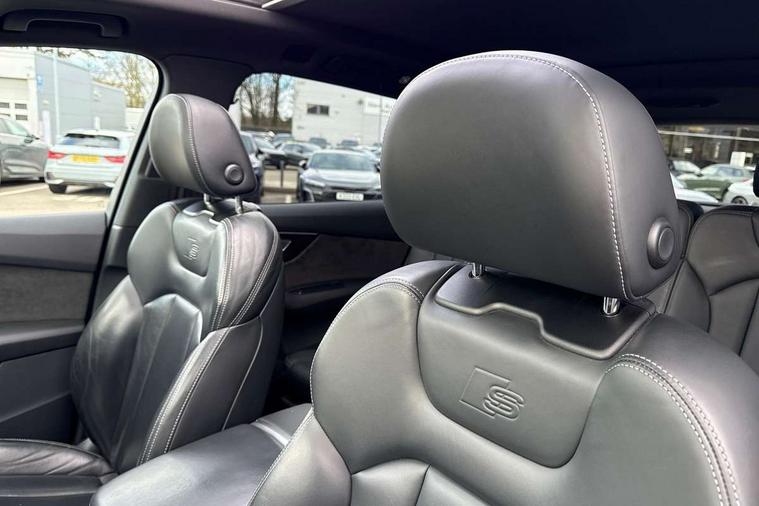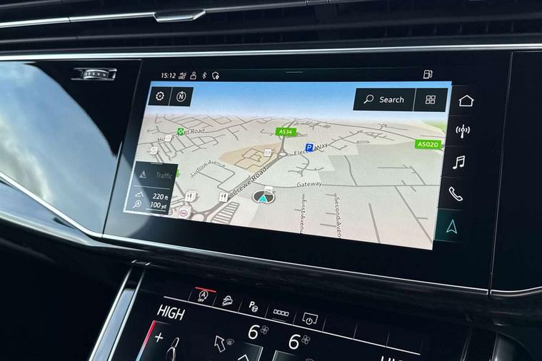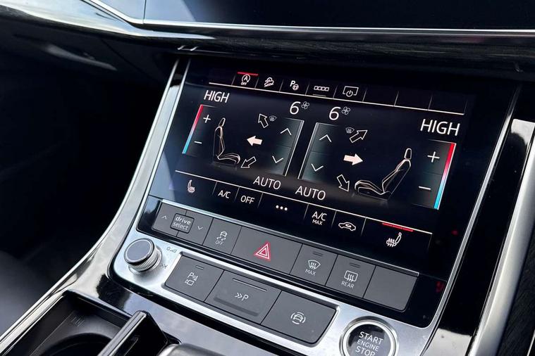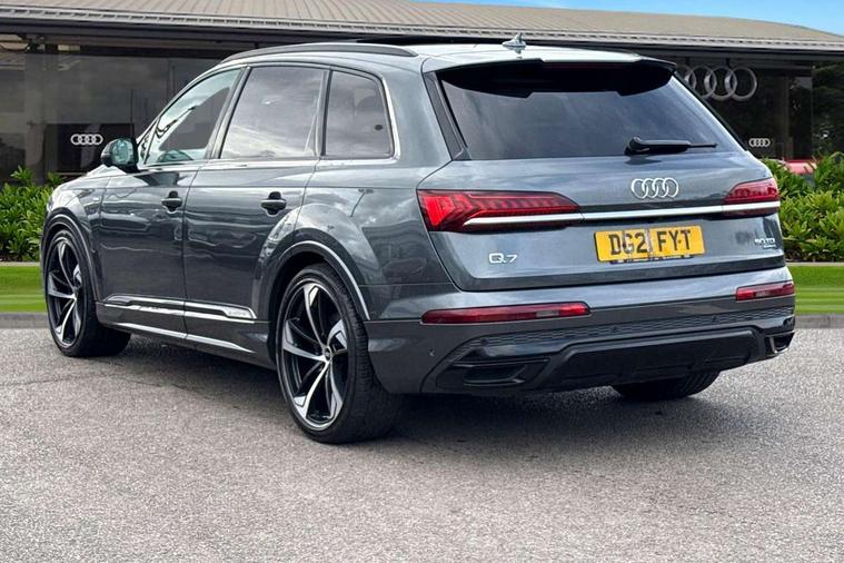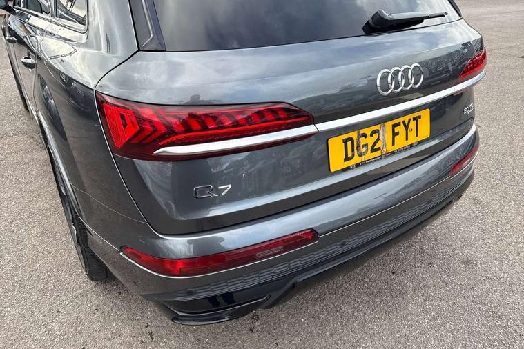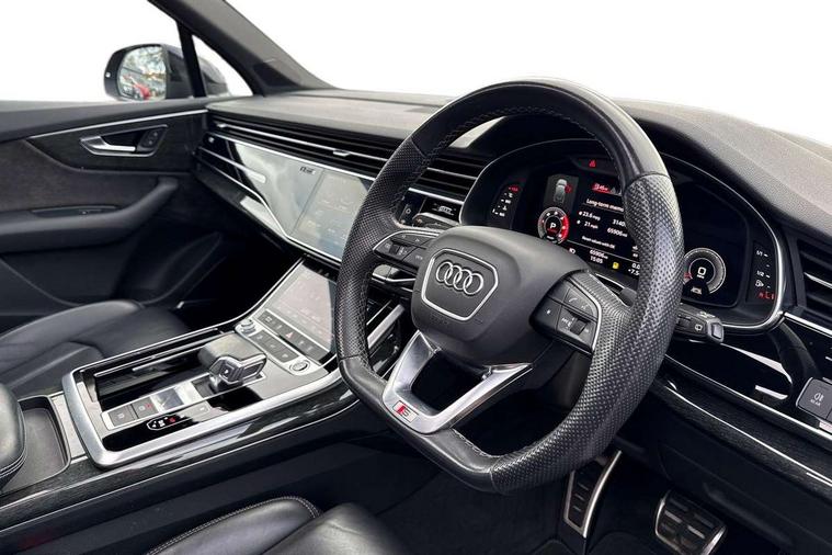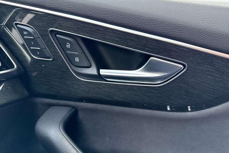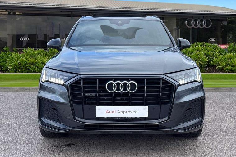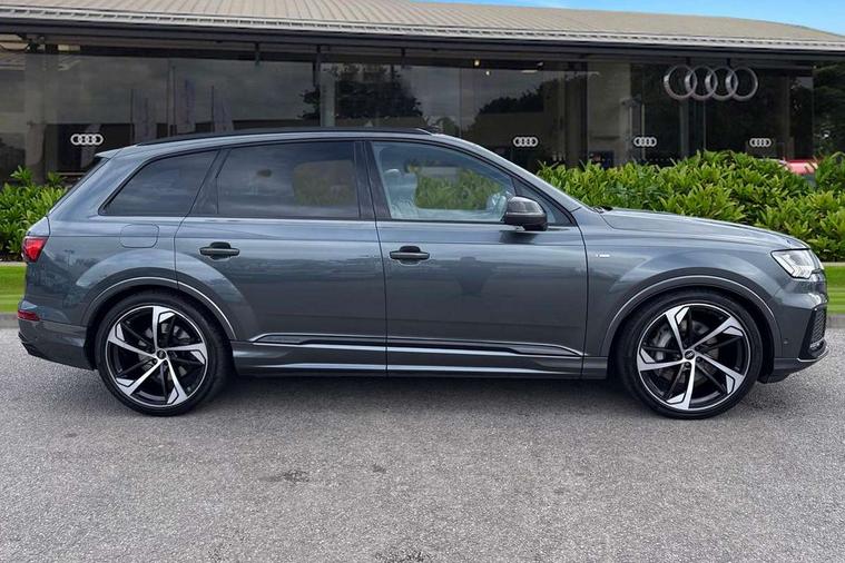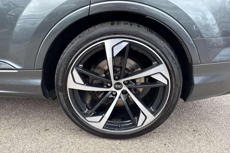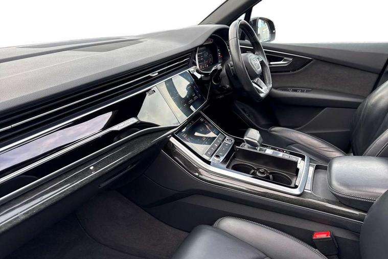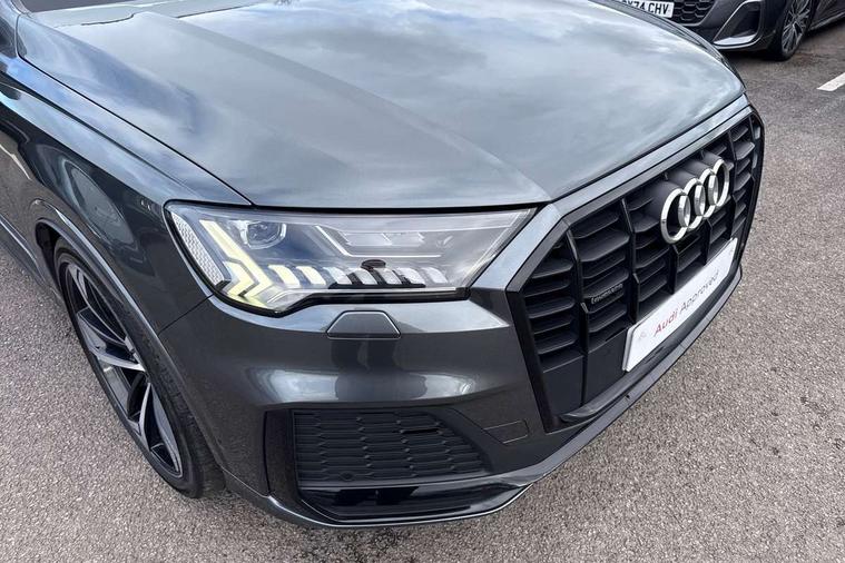 Audi connect safety and service (e-call), Audi drive select (Auto, Comfort, Dynamic, Efficiency, Individual, Off-road and All road), Audi phone box with wireless charging, Camera based traffic sign recognition, Electromechanical steering, MMI navigation plus with MMI touch screens includes 10.1" and 8.6" screens with haptic feedback, Natural voice recognition, Parking system plus - front + rear sensors, Power operated tailgate, Rear view camera, Smartphone interface includes wireless Apple carplay/Android Auto, Start/stop system, 48V Mild hybrid technology, Adaptive air sports suspension, Quattro all wheel drive with self locking centre differential, Audi music interface - front 2 USB-C ports with charger and data functions, Audi sound system with 6 channel amplifier, 180 watt amplifying capacity and 10 loudspeakers including subwoofer, DAB digital radio module, Audi matrix LED headlights with dynamic front and rear indicators, Auto dimming frameless rear view mirror, Black roof rails, Bumpers in contrast paint scandium grey finish includes door trim and wheel arch trim strips, inlays in door strip contain quattro embossing, Electrically adj heated/folding + automatically dimming exterior mirrors with memory + automatic kerb side function for passenger side exterior mirror, Heat insulating glass in windshield, Integrated LED indications in door mirrors, LED daytime running lights, LED rear tail lights, Privacy glass - dark tinted rear and rear side windows from B-pillar backwards, 4 zone deluxe automatic climate control, 7 seat layout with ISOFIX points for the front passenger seat and rear passenger seat, Black cloth headlining, Comfort front centre armrest, Folding rear seats, Front head restraints, Front/rear floor mats, Heated front seats, LED interior ambient lighting, Luggage compartment cover, Luggage compartment sill protection in stainless steel, Rear head restraints, Stainless steel pedals, Sunvisors with illuminated vanity mirrors, Titanium black styling pack - Q7/SQ7, 3 point seatbelts on all rear seats, Audi pre sense front, Driver and front passenger, front side and curtain airbags, Electromechanical parking brake, Electronic Stabilisation Control (ESC) including ABS, ASR and EDL, Extended pedestrian protection measures, Hill hold assist, Seatbelt monitoring, Tyre pressure loss indicator, Warning triangle and first aid kit, Anti theft alarm, Anti-theft wheel bolts and wheel loosening detection, Keyless go with remote central locking, Polished oak trim with grey finish inlay, Tool kit, Tyre repair kit,