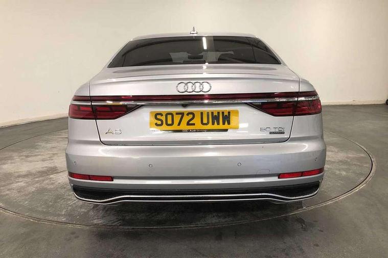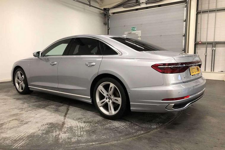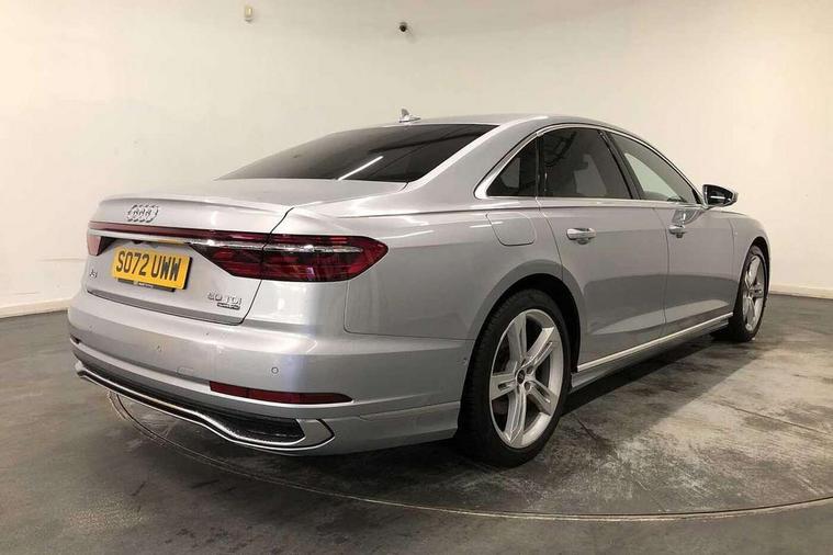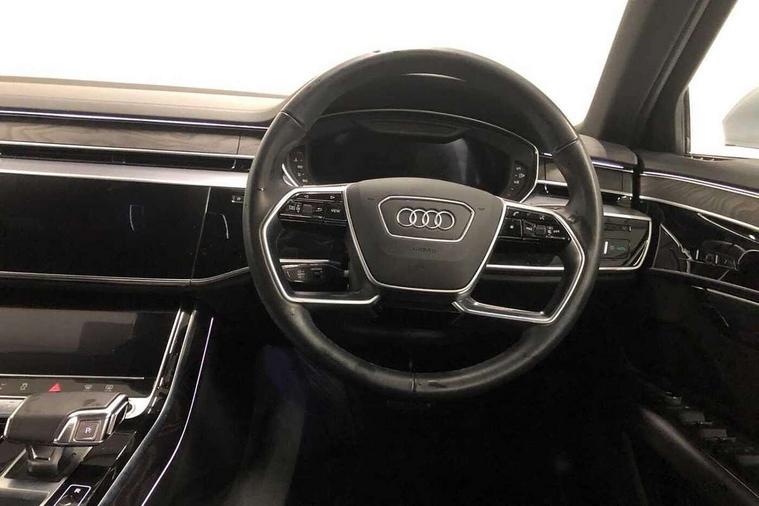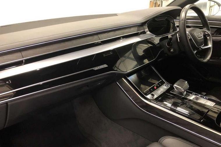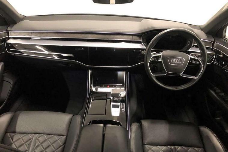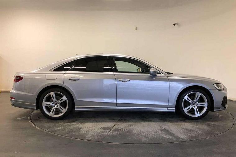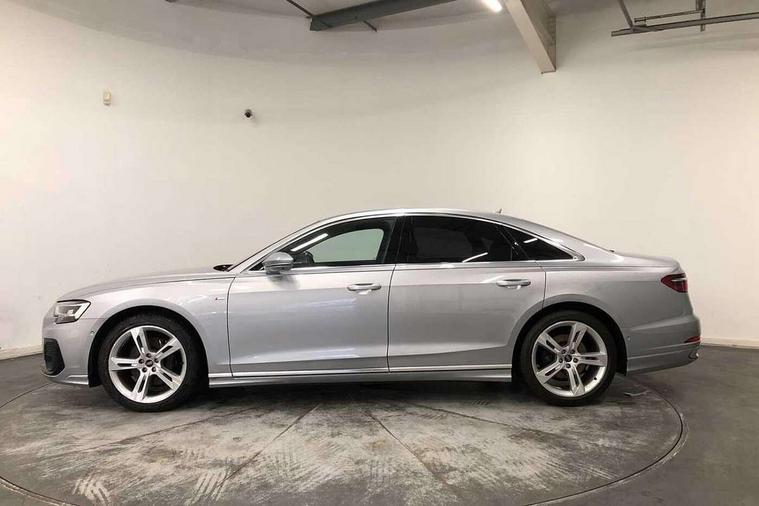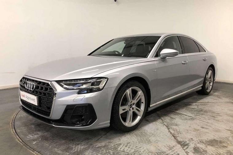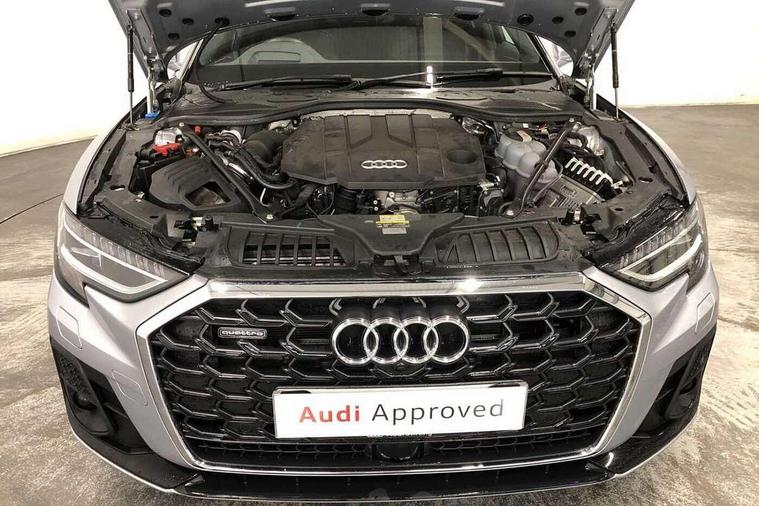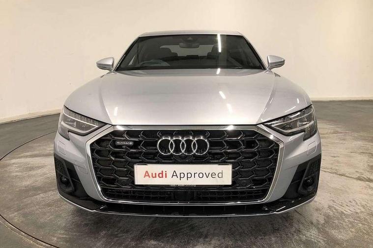 'Lights On' Reminder warning buzzer, Adaptive cruise control with cruise assist, emergency assist, efficiency assist, swerve assist, turn assist and speed limiter, Audi connect safety and service (e-call), Audi drive select, Audi virtual cockpit, Bluetooth interface, Camera based traffic sign recognition, Convenience key, Head up Display, MMI navigation plus with MMI touch + Twin touch screens with haptic feedback, Operating buttons in black, glass look with haptic feedback including extended aluminium look, Power door closure, Power operated tailgate, Rear central control unit, Remote fuel filler release, Service interval indicator, Smartphone interface with app store includes wireless Apple carplay, Android auto and Amazon alexa integration, 24 litre AdBlue tank, 48V Mild hybrid technology, 8 speed transmission with hill hold assist, 82 litre fuel tank, Adaptive air suspension, Diesel particulate filter, Quattro all wheel drive with self locking centre differential, Audi music interface, DAB digital radio module, MMI radio plus, USB connection, USB ports with charging function in the rear, Acoustic double glazing, All-weather, manoeuvring, position, static cornering, turning and motorway lights with automatic dynamic headlight range control, Audi space frame, Auto dimming rear view mirror, Body colour bumpers, Body colour exterior mirror housings, Electric front windows, Electric rear windows with isolation switch, Electric sunblinds for rear window and rear door windows, Electrically adjustable heated folding + automatically dimming exterior mirrors with memory function and integrated LED indicators, Front wash/wipe with interval delay, Headlight cleaning system, Heat insulating darkened glass in side and rear windows, Heat insulating glass windscreen, Heated rear windscreen, Heated windscreen washer jets, High beam assist, LED brake lights, LED daytime running lights, LED third brake light, OLED rear lights with changeable rear light signature, Privacy glass, Rear boot, Rear side wing doors, Welcome/leaving lighting, 4 zone control automatic air conditioning, Audi phone box light, Black cloth headlining, Centre console with cupholders, Comfort centre armrest front, Comfort rear headrests, Door pockets with bottle holder, Driver and front passenger side sunvisors with illuminated vanity mirrors, Dust/pollen filters, Electric front seats with memory function, Front floor mats, Glove compartment cooling, Heated front seats, Heated rear seats, Height/reach electric steering column with easy exit function, Illuminated door sill trims with aluminium inlays and S diamond emblem, Interior S Line Badging, Isofix child seat mounting points on outer rear seats, Leather gearknob, Passenger footwell storage net, Roof mounted sunglasses holder, Single front passenger seat, Stainless steel pedals and footrest, Upper and lower dashboard, carpet in black, Valcona leather upholstery with front sports seats in diamond quilted with S embossed logo, Chrome exterior pack - A8, Extended LED Interior multi coloured light pack - A8, High gloss styling pack - A8, S line exterior styling pack - A8, Technology pro pack - A8L, 3 point seatbelts on all rear seats, ABS/EBD, Active front headrest system, ASR traction control, Audi pre sense basic, Audi pre sense front, Black brake calipers, Driver/Front Passenger airbags, EDL traction control, Electromechanical parking brake, ESP, Extended pedestrian protection measures, Front and rear disc brakes, Front and rear side airbags with head airbag system, Front passenger airbag deactivation, Rear child proof door locks, Seatbelt reminder + electric contact in buckle + advanced safety equipment, Tyre pressure loss indicator, Warning triangle and first aid kit, Anti theft alarm tow away protection, Anti-theft wheel bolts and wheel loosening detection, Remote central locking, Dark matt brushed aluminium lower inlays, Piano black finish upper inlays,