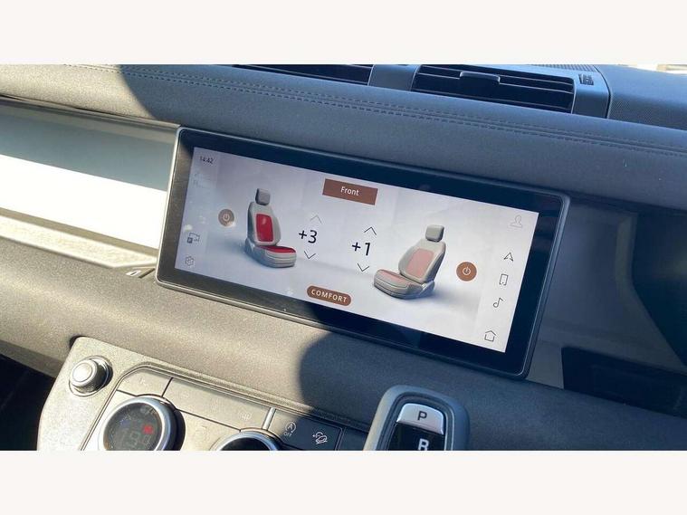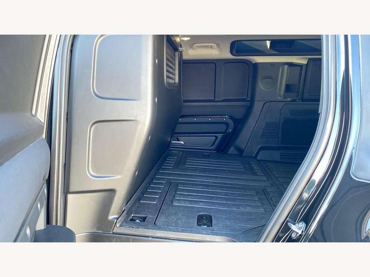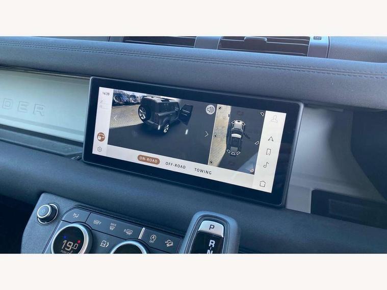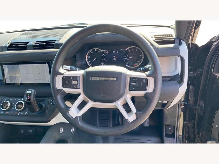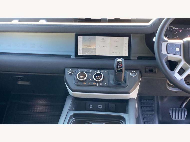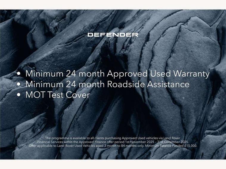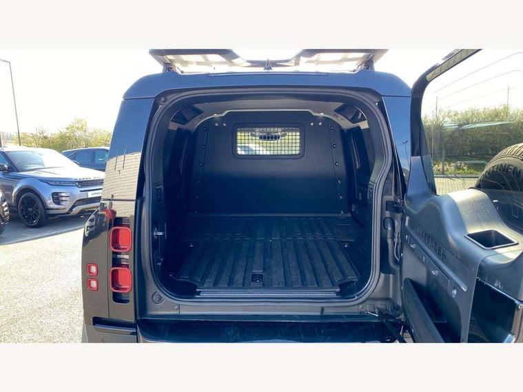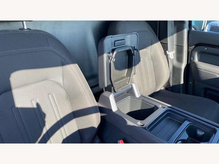 Customer Configurable Autolock, 11.4" touchscreen, 360 parking aid, 3D Surround Camera with 360 View, 180 Rear View, Front Traffic Detection, Forward Vehicle Guidance, Tow Hitch Assist and clear sight Ground View, Brake Hold, Driver condition monitor, Electric power assisted steering (EPAS), Lane keep assist, Low traction launch, Pivi pro connected, Traffic sign recognition adaptive speed limiter, Trip computer, Tyre pressure monitor, Wade Sensing, Android Auto, Apple CarPlay, DAB Radio (Digital Audio Broadcasting), Alpine lights, Assisted tailgate, Automatic headlights and rain sensitive front wipers, Centre high mounted stop light, Electric heated/power fold door mirrors with approach lights and auto dimming driver side, Electric windows with one touch open/close and anti-trap, Exterior signage panel, Follow me home lighting, Heated rear window with timer, Heated windscreen, LED tail light, Privacy glass, Puddle lights, Rear fog lights, Rear wash wiper, Side-hinged tailgate, Standard roof, Standard tread plates, 40:20:40 folding rear seats, Additional lashing points, Carpet mats, Dual zone climate control, Durable rubber cabin flooring, Footwell lights, Full height bulkhead behind row 1 seats, Glovebox storage, High sided rubber mats, Loadspace cover, Loadspace hooks, Loadspace rubber mat, Lockable and illuminated underfloor storage compartment (x1 under boot floor and x1 accessible via rear doors), Overhead stowage for sunglasses, Rear centre headrest, Rear reading light, Signature graphic, Sunvisors with illuminated vanity mirrors, Upgraded loadspace LED lighting, Online pack - Defender with data plan, Brake pad wear indicator, Electronic traction control, Emergency braking, Front airbags, with passenger seat occupant detector, Power operated child locks, Remote for (e-Call, Optimised assistance call, InControl app, Climate, beep and flash and door), Seat belt reminder, Intrusion sensor, Locking wheel nuts, 8 speed automatic transmission, ABS and EBA, All wheel drive, CBC - (Cornering brake control), Dynamic stability control, Electronic brake force distribution, Electronic park brake, Gradient acceleration control, Hill Descent Control, Hill start assist, Particulate filter (DPF), Push button start, Roll stability control, Trailer stability assist, Twin speed transfer box (high/low range),