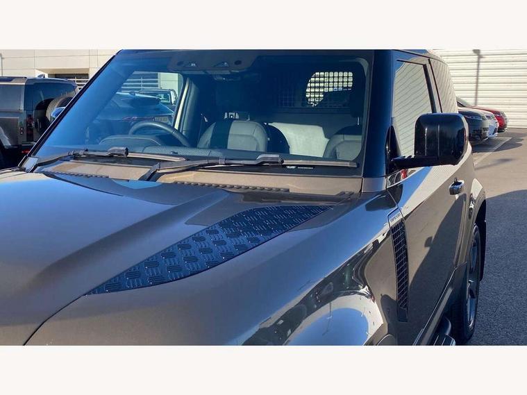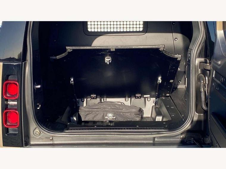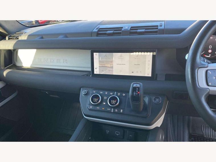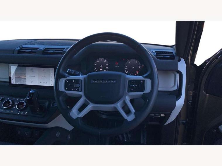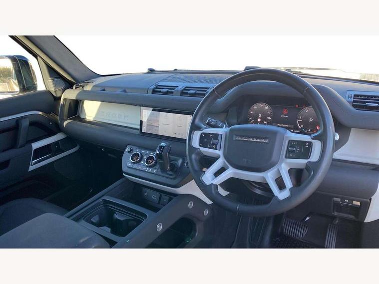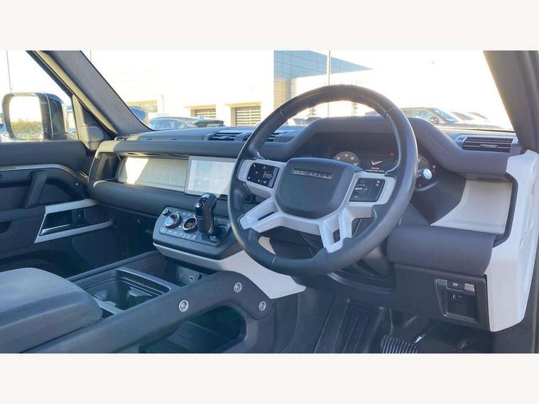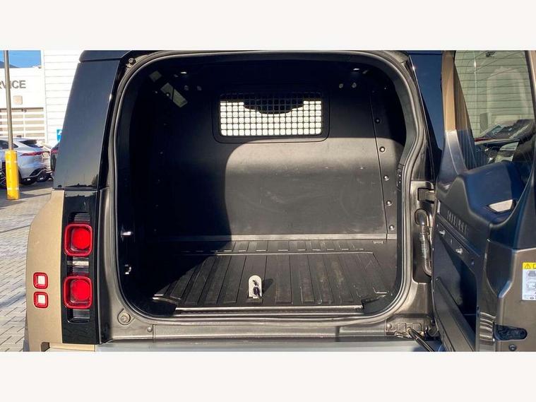 Customer Configurable Autolock, 360 parking aid, 3D Surround Camera with 360 View, 180 Rear View, Front Traffic Detection, Forward Vehicle Guidance, Tow Hitch Assist and clear sight Ground View, Blind spot assist, Brake Hold, Driver condition monitor, Electric power assisted steering (EPAS), Lane keep assist, Low traction launch, Pivi pro connected, Rear traffic monitor, Traffic sign recognition adaptive speed limiter, Trip computer, Tyre pressure monitor, Wade Sensing, Android Auto, Apple CarPlay, DAB Radio (Digital Audio Broadcasting), Meridian 280W sound audio system with 7 speakers with subwoofer, Alpine lights, Assisted tailgate, Auto High Beam Assist, Automatic headlight levelling, Automatic headlights and rain sensitive front wipers, Centre high mounted stop light, Electric heated/power fold door mirrors with approach lights and auto dimming driver side, Electric windows with one touch open/close and anti-trap, Exterior signage panel, Follow me home lighting, Front fog lights, Heated rear window with timer, Heated windscreen, LED tail light, Privacy glass, Puddle lights, Rear fog lights, Rear wash wiper, Side-hinged tailgate, Standard roof, Standard tread plates, Additional lashing points, Dual zone climate control, Durable rubber cabin flooring, Footwell lights, Full height bulkhead behind row 1 seats, Glovebox storage, High sided rubber mats, Loadspace cover, Loadspace hooks, Loadspace rubber mat, Manual adjustable steering column, Overhead stowage for sunglasses, Rear centre headrest, Rear reading light, Standard interior, Standard seating configuration, Sunvisors with illuminated vanity mirrors, Twin front cupholders, Upgraded loadspace LED lighting, Online pack - Defender with data plan, Brake pad wear indicator, Electronic traction control, Emergency braking, Front airbags, with passenger seat occupant detector, Power operated child locks, Remote for (e-Call, Optimised assistance call, InControl app, Climate, beep and flash and door), Seat belt reminder, Intrusion sensor, Keyless entry system, Locking wheel nuts, 8 speed automatic transmission, ABS and EBA, All wheel drive, CBC - (Cornering brake control), Dynamic stability control, Electronic brake force distribution, Electronic park brake, Gradient acceleration control, Hill Descent Control, Hill start assist, Particulate filter (DPF), Push button start, Roll stability control, Trailer stability assist, Twin speed transfer box (high/low range),