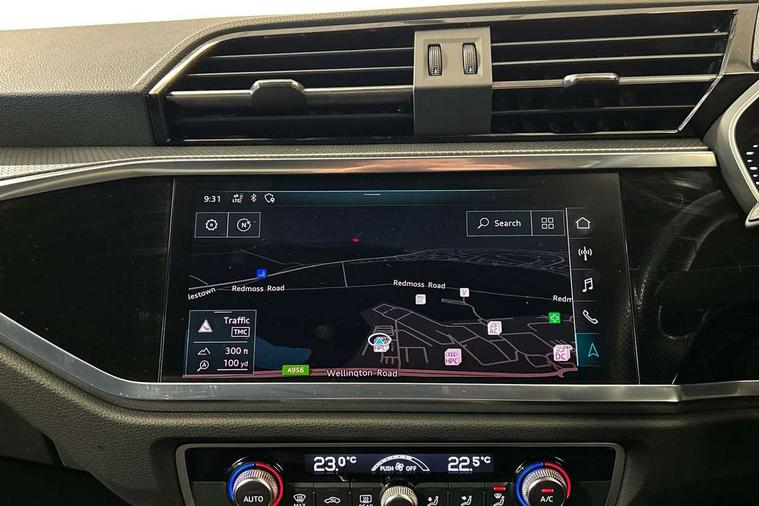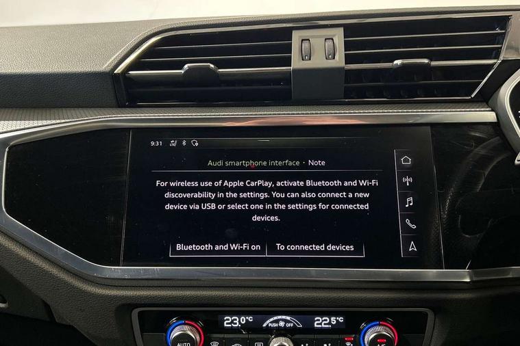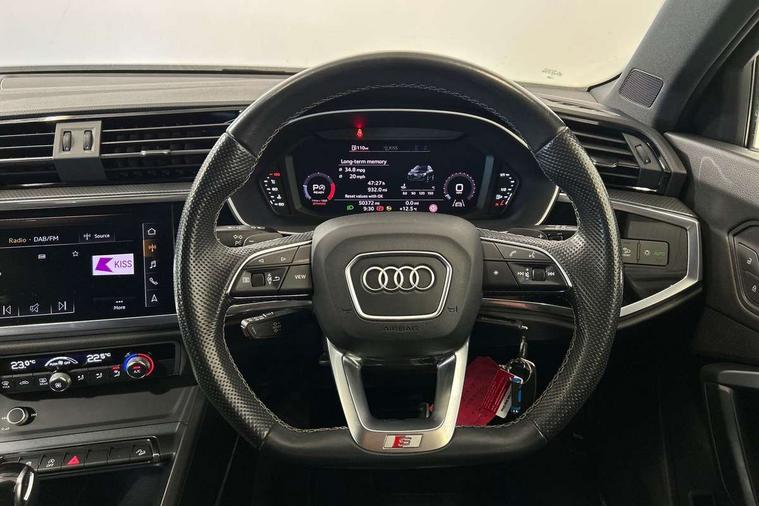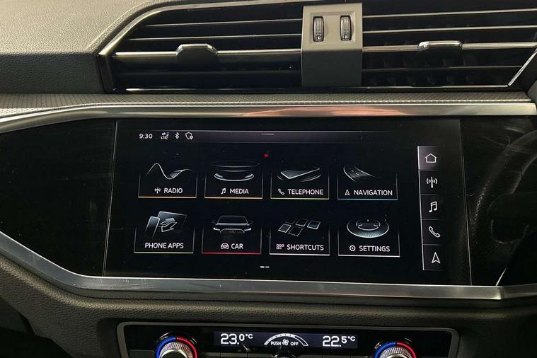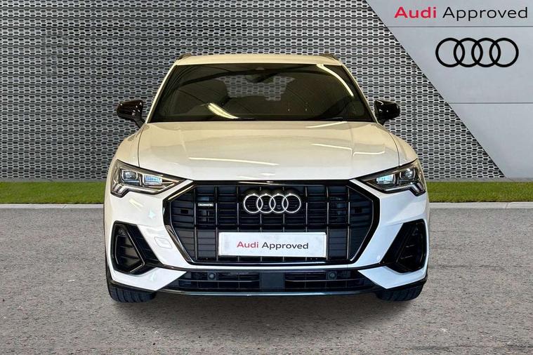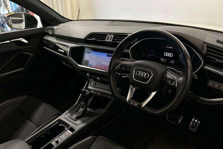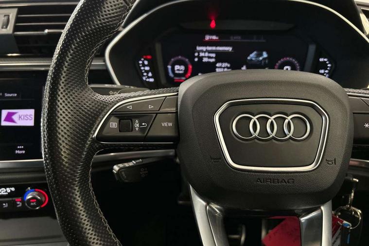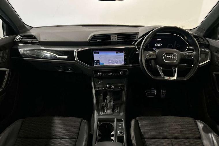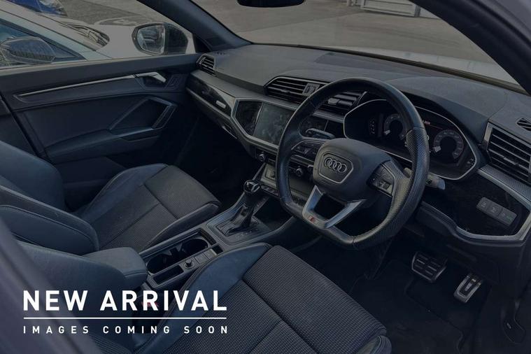 Leatherette door armrest, MMI touch colour display in glass look, black with surround in aluminium look, Piano black inlay, Black styling pack - Q3, Non smoking pack - Q3, 3x3 point rear seatbelts, 6 airbags - Driver, front passenger, curtain and side windows, Electrically operated child locks on rear doors, Electromechanical parking brake, Electronic stabilisation control including ABS, ASR and EDL, Hill descent control, Hill hold assist, Pre sense basic, Seatbelt monitoring, Tyre pressure warning, Warning triangle and first aid kit, Anti theft alarm, Anti theft wheel bolts, Audi pre-sense front with pedestrain and cyclist recognition, Remote central locking, Diesel particulate filter, Sports suspension, 2 USB-C ports with charge and data functions, 6 passive loudspeakers, DAB digital radio module, Acoustic windscreen, Auto dimming frameless rear view mirror, Black roof rails, Electrically folding, adjustable and heated door mirrors with integrated LED side indicators and kerb view function for passenger side, Front and rear electric windows, Front fog lights, Front spoiler blade in matt platinum grey, High gloss black finish B and C pillars, LED headlights with LED daytime running lights and dynamic rear indicator, LED rear lights, Privacy glass dark tinted rear and rear-side windows (from B-pillar backwards), Rain and light sensors, Rear diffuser strip in matt titanium black, S line bumpers in contrasting Manhattan grey, 12V socket in rear centre console, 40:20:40 folding with manual adjustment for 60:40 forwards/backwards position and backrest angle, Adjustable rear seat bench/backrest with centre armrest and cupholder, Black cloth headlining, Dual zone electronic climate control, Front and rear black floor mats with contrast stitching in rock grey, Front and rear headrests, Front and rear roof module including reading lights, Front centre armrest, Glove compartment lighting, Height and reach adjustable steering wheel, Illuminated door sill trims with S logo, ISOFIX child seat mounting for front passenger with airbag deactivation and outer rear seat including top tether attachment point for outer rear seats, Luggage compartment light, Manual front seats with height adjustment, Perforated leather gearknob, Stainless steel luggage compartment sill finisher, Stainless steel pedals, Audi connect safety and service (e-call), Audi drive select, Audi lane departure warning, Audi smartphone interface includes wireless Apple carplay/Android Auto, Audi Virtual Cockpit - 10.25" display, Bluetooth interface, Camera based traffic sign recognition, MMI Navigation Plus with high resolution 10.1 inch touchscreen colour display, Power operated tailgate, Progressive steering, Service interval indicator, Start stop system with recuperation, Voice control system with natural language interaction,