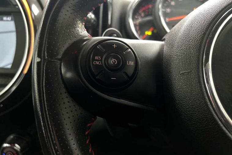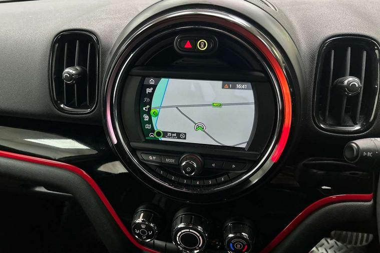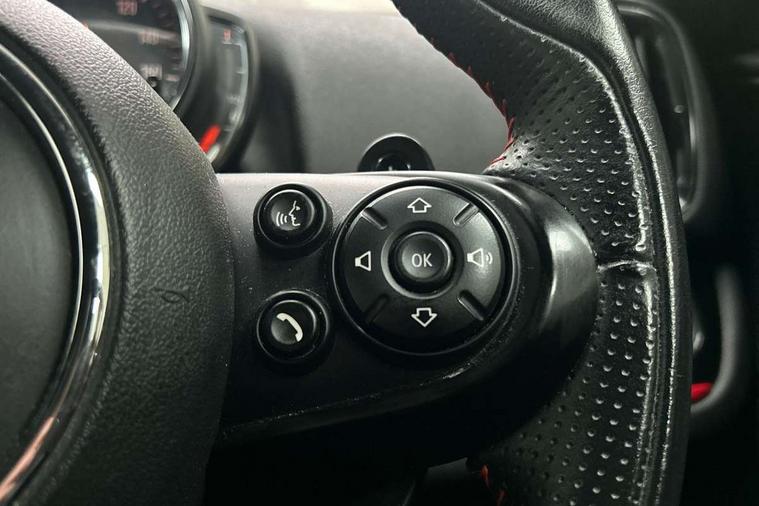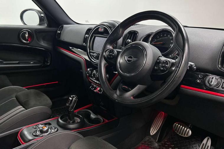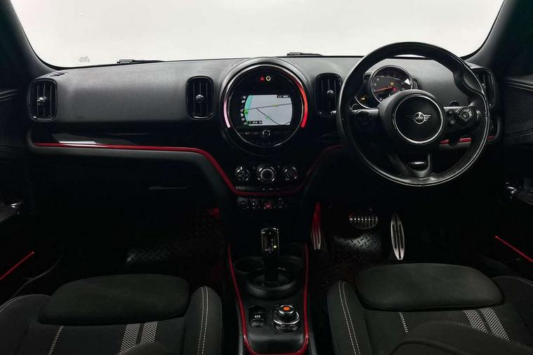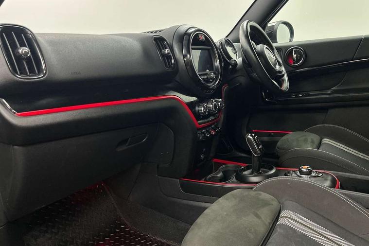 Active Guard incl speed limiting and lane departure functions with auto steering, and front collision warning with brake intervention, Automatic start/stop function with brake energy recuperation, Electro-mechanical speed dependant steering assistance, Instrument cluster, Mini E-call, MINI TeleServices, On board computer, Rear parking distance control, Double Vanos system, Fully variable valve control, High precision injection, Performance Control, Steptronic sport transmission with double clutch and steering wheel paddles, FM tuner and DAB digital radio, Bonnet scoop, Chrome border honeycomb structure radiator grille with S badge, Chrome fuel filler cap, Day time driving lights, Dynamic brake lights, Electric windows, Heated rear window, Heated windscreen washer jets, John Cooper Works - aerodynamic kit (front and rear apron, spoiler), front and rear sport bumpers and part-painted side sills with door sill finishers, John Cooper Works Logo, John Cooper Works rear spoiler, Metal door sill strips with Cooper S imprint, Model logo, Model logo on Tailgate, Rain sensor with auto headlights, Rear fog lights, Rear window wiper, Side scuttle panel with integrated indicator, Split rear doors, Sun/heat protection glass, Twin exhaust tailpipe, White indicator lenses, 12V Accessory socket in centre console, 360L luggage compartment capacity, 4 lashing eyes in luggage compartment, 40:20:40 split folding rear seats, Anthracite headlining with grab handles and clothes hooks, Chrome interior highlights, Colour line - Carbon black, Cupholders, English handbook, Front headrests, Glove compartment, Height and length steering column adjustment, Interior lighting with 12 basic colours selectable via toggle switch in roof, Isofix rear child seat preparation, John Cooper Works perforated leather steering wheel with contrast stitching in chilli red and John Cooper Works logo, Leather gearshift lever and handbrake gaiters, LED reading lights, vanity mirror lights, front foot well light and spotlight on front seats, Manual air conditioning, Mechanical seat adjustment, driver seat height adjust, forward/back and front seats backrest, Multifunction steering wheel, Passenger seat height adjuster, Rear headrests, Storage compartments in doors, Sunvisors with vanity mirrors, Tool kit, Excitement pack - Countryman, Navigation pack - Countryman, 2 tone horn, 3 point seatbelts on all seats, 6 Airbags - front, side, head and seat belt tensioners, Anti-lock braking system (ABS), DSC - Dynamic Stability Control, Electronic handbrake, Front and rear disc brakes, Hill start assist, Tyre pressure monitoring system, Alarm system with tilt sensor, monitoring doors, bonnet interior and tailgate, Auto drive away locking, Deadlocking function, Electronic vehicle immobiliser, Locking wheel bolts, Start/stop toggle with keyless go,