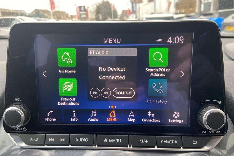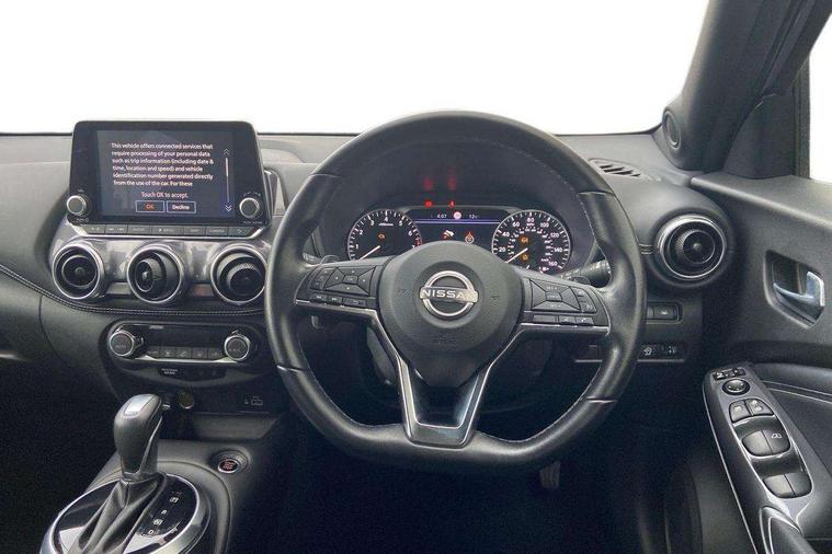 7" full colour TFT screen combimeter, Apple CarPlay and Google Android auto, Drive modes select (Eco, normal and sport), Emergency and breakdown call, Front parking sensor, Idle start/stop system, Intelligent lane intervention, Lane departure warning system, Nissan connect 8" touch screen entertainment system, Nissan connect nav with TomTom traffic, Nissan connect services and Wifi connection, Outside temperature sensor, Power Steering, Rear parking sensor, Traffic sign recognition, Trip computer, Voice recognition, Gasoline particulate filter, 6 speakers, Bluetooth system, USB, Aux-in and 12V socket, DAB Digital radio, Rear console USB port, Auto dimming interior rear view mirror, Auto headlights, Automatic hazard signal with emergency stop signal, Body colour bumpers, Body colour door handles, Electrically adjustable door mirrors with integrated indicators, Follow me home headlights, Front and rear electric window with one touch driver window, Heated and auto folding door mirrors, High beam assist, LED daytime running lights, LED headlamps, LED rear fog lamp, LED rear lamps, Rain sensor windscreen wipers, Rear privacy glass, Rear side wing doors, Rear wiper, Three blink turn signal, 3 height adjustable rear headrests, 3 seat bench in 2nd row, 60/40 split folding rear seat, Automatic climate control, Card holder on driver sunvisor, Cloth upholstery with black and metallic grey syntech leather inserts, Driver and passenger sliding and reclining seats, Driver side rear coat hanger, Driver/passenger sunvisors and vanity mirrors, Front and rear cabin lights, Front armrest, Front door pockets with bottle holders, Front head restraints, Front/rear passenger grab handles, Grey synthetic leather kneepad, Height adjustable driver's seat, Internal chrome door handles, Leather gearshift knob, Leather steering wheel, Luggage board, Luggage space lighting, Monoform sporty seats, Multifunction steering wheel, Rear door bottle holders, Single front passenger seat, Steering wheel mounted gearshift paddles, Telescopic steering wheel adjustment, Two cupholders in front centre console, Two rear isofix child seat anchorage points with top tether, Welcome light and console tray ambient lighting, ABS with EBD and brake assist, Active ride control, Active Trace Control, Driver and passenger airbags, Driver and passenger side airbags, Electric handbrake with auto hold function, Electronic Stability Programme (ESP), Front and rear curtain airbags, Height adjustable seatbelts, Hill start assist, Intelligent emergency braking with pedestrian and cyclist recognition, Rear door child safety locks, Seatbelt reminder for driver/front passenger and rear seats, Single tone horn, Three 3 point rear seatbelts, Traction control, Tyre pressure monitoring system, VDC Dynamic Vehicle Control, Ventilated rear brake discs, Alarm, Immobiliser, Intelligent key and start push button with walk away lock and approach unlock functions, Remote central locking,