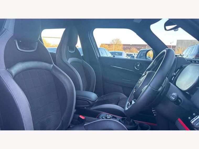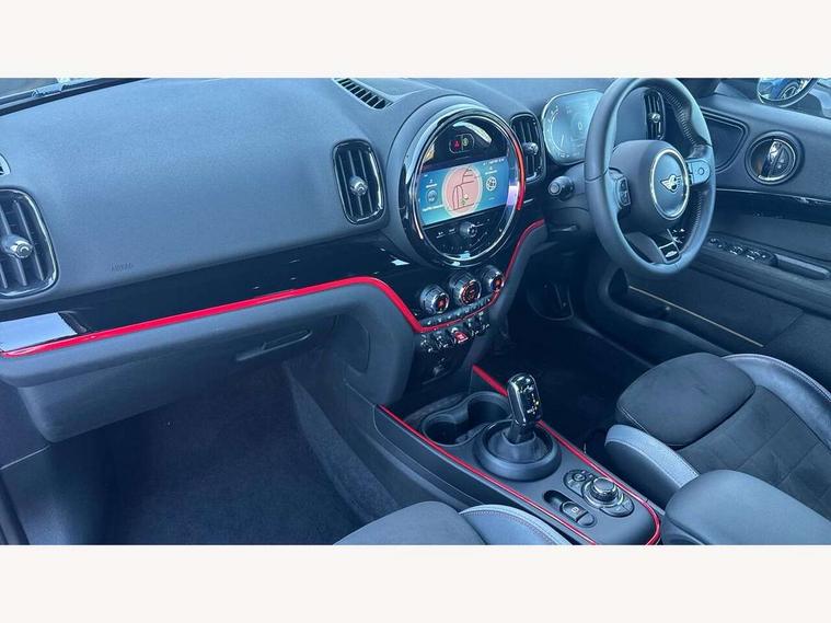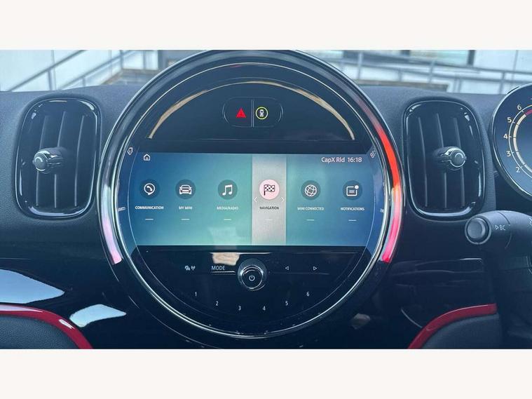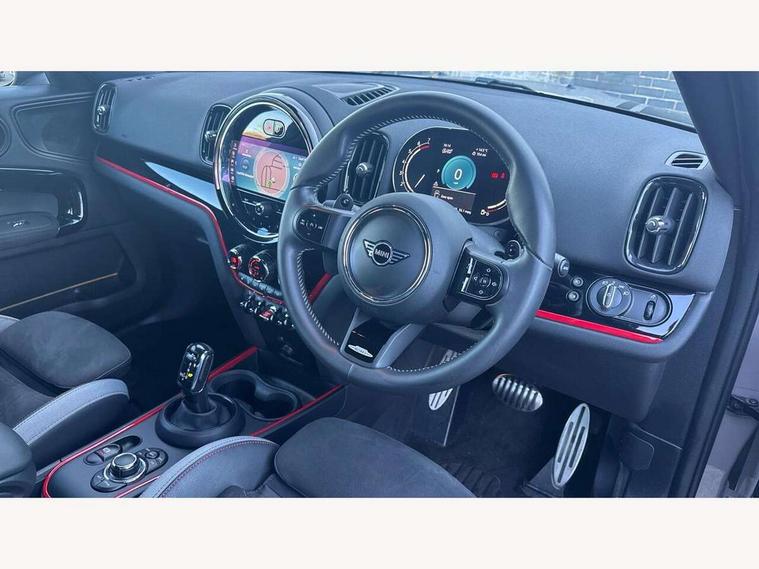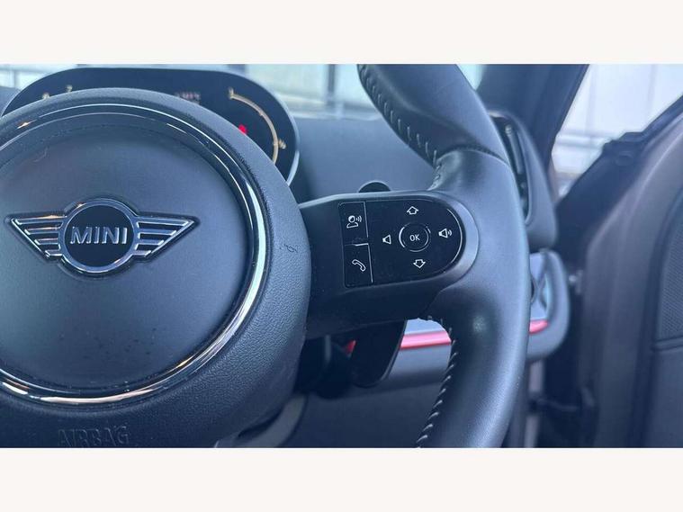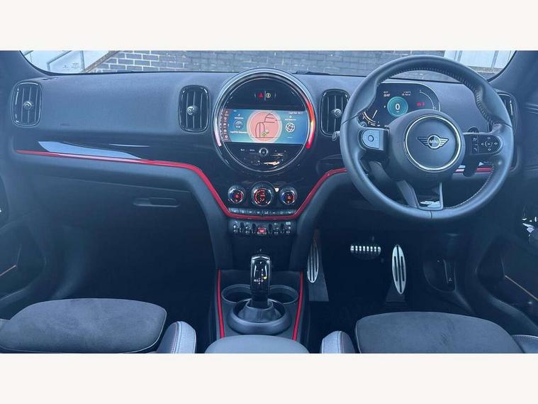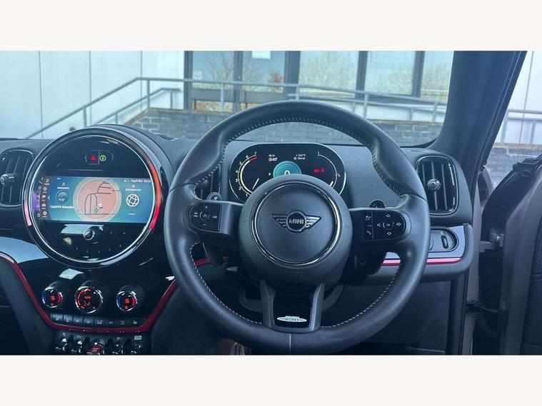 Active Guard incl speed limiting and lane departure functions with auto steering, and front collision warning with brake intervention, Automatic start/stop function with brake energy recuperation, Compatible mobile phone bluetooth with audio streaming, Cruise control with brake assist, Electro-mechanical speed dependant steering assistance, Instrument cluster, MINI Driving Modes - centre toggle switch to control driving setting (sport, mid and green), Mini E-call, On board computer, Rear parking distance control, 51 Litre fuel tank, Double Vanos system, Fully variable valve control, High precision injection, Performance Control, Sport automatic transmission with steering wheel paddles, FM tuner and DAB digital radio, 3rd brake light, Bonnet scoop, Chrome fuel filler cap, Day time driving lights, Dynamic brake lights, Electric windows, Heated rear window, Heated windscreen washer jets, John Cooper Works - aerodynamic kit (front and rear apron, spoiler), front and rear sport bumpers and part-painted side sills with door sill finishers, John Cooper Works Logo, LED fog lights, LED Headlights, Metal door sill strips with Cooper S imprint, Model logo, Model logo on Tailgate, Rain sensor with auto headlights, Rear fog lights, Rear side wing doors, Rear window wiper, Side scuttle panel with integrated indicator, Split rear doors, Sun/heat protection glass, White indicator lenses, 12V socket in centre console, 3 seat bench in 2nd row, 360L luggage compartment capacity, 4 lashing eyes in luggage compartment, 40:20:40 split folding rear seats, Anthracite headlining with grab handles and clothes hooks, Chrome interior highlights, Colour line - Carbon black, Cupholders, English handbook, Floor mats, Front headrests, Glove compartment, Height and length steering column adjustment, Interior lighting with 12 basic colours selectable via toggle switch in roof, Isofix rear child seat preparation, LED reading lights, vanity mirror lights, front foot well light and spotlight on front seats, Manual air conditioning, Mini John Cooper Works leather gearshift lever and handbrake gaiters, Multifunction steering wheel, Nappa leather steering wheel with MINI Yours logo, Rear headrests, Single front passenger seat, Stainless steel pedals and foot rest, Storage compartments in doors, Sunvisors with vanity mirrors, Excitement pack - Countryman, Navigation pack - Countryman, Piano black exterior pack - Countryman Cooper S/SD/SE/Boardwalk, 2 tone horn, 3 point seatbelts on all seats, 6 Airbags - front, side, head and seat belt tensioners, Anti-lock braking system (ABS), DSC - Dynamic Stability Control, Electronic handbrake, Front and rear disc brakes, Hill start assist, Manual rear child locks, Tyre pressure monitoring system, Alarm system with tilt sensor, monitoring doors, bonnet interior and tailgate, Auto drive away locking, Deadlocking function, Electronic vehicle immobiliser, Locking wheel bolts, Start/stop toggle with keyless go, Piano black JCW interior trim, Tool kit,