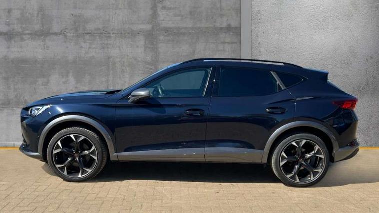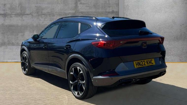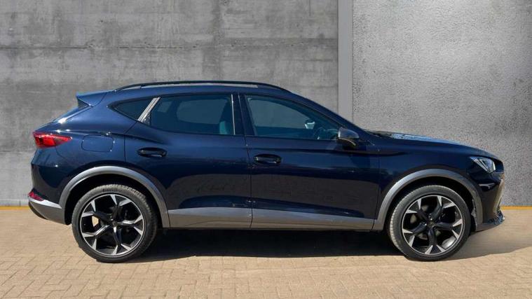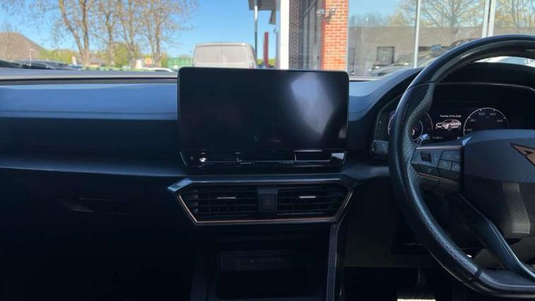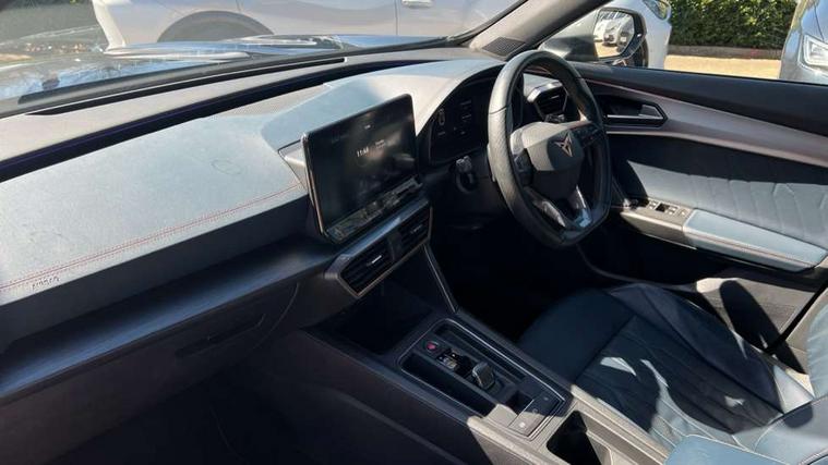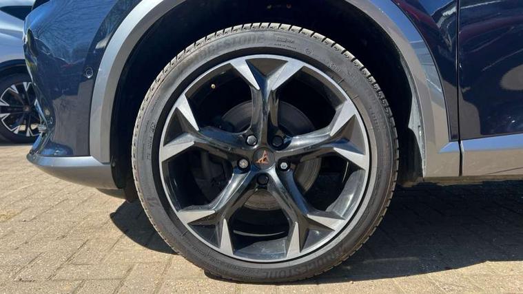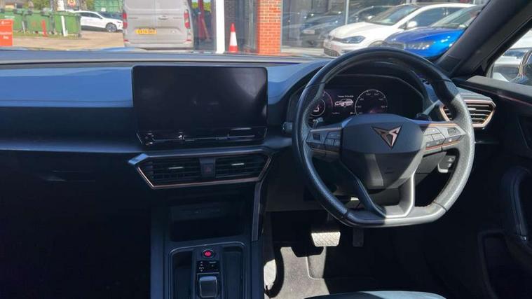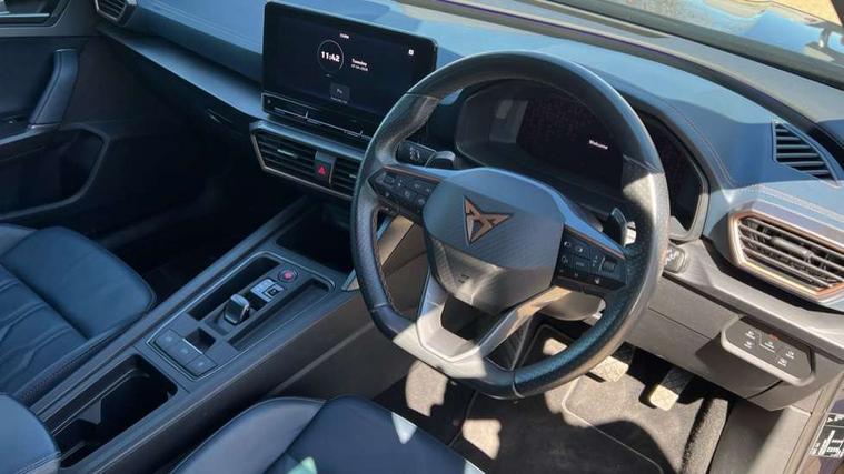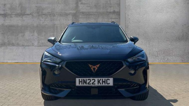 Digital cockpit and configurable dashboard, Driver alert system, Driving profile selection, E-call, Forward collision warning with automatic braking, Lane assist, Park assist (inc front/rear parking sensors), PAS, Predictive adaptive cruise control with speed limiter, Rear view camera, RPM, trip computer, outside temp gauge, instrument light brightness, low fuel warning light, lights on reminder, gearshift indicator, Service interval indicator, Start/stop system with regenerative braking, Wireless apple carplay, Wireless phone charger, Electronic locking differential and dynamic traction support, Standard suspension, 2 front and 2 rear USB type C sockets, Auxiliary input socket, DAB radio, Auto dimming rear view mirror, Body colour door handles, Body coloured bumpers, Dark grey wing mirror, Daytime running light with automatic headlight control and coming home feature, Dynamic headlight range control, Electric front/rear windows, Electrically adjustable heated and folding door mirrors with memory function, Electrically adjustable, heated and folding door mirrors, Front fog lamps with cornering function, Gloss black roof rails and window surrounds, LED Headlights, LED Taillights with dynamic indicator, Rain sensing wipers, Rear diffuser with black simulated exhaust pipes, Rear side wing doors, Rear wash/wipe, Third brake light, Tinted rear windows, Welcome lights, 12v power supply in centre console, 12V socket, 12v socket in loadspace, 2 front and 2 rear reading lights, 230V socket, 3 seat bench in 2nd row, 60/40 split rear bench seat with armrest and mechanical seat release, Dust/pollen filter, Front and rear head restraints, Front centre armrest, Heated steering wheel, Height/reach adjust steering wheel, Illuminated interior front door sills, Illuminated sunvisor with mirror, Isofix, Leather multi function heated steering wheel with gear shift paddles, Leather multi function steering wheel with gear shift paddles, Luggage tie-down hooks, Single front passenger seat, Three zone climate control with control panel in rear, Variable luggage/load compartment floor, Wraparound lighting, Genuine Nappa leather Pack - Cupra, Navigation system pack with 10" navigation system - Formentor, 3 point seatbelts on all rear seats, ABS, Brake control system - ESC and brake booster, Child proof door locks, Driver and front passenger airbags with front passenger airbag de-activation, Electronic parking brake, Front and rear disc brakes, Front side curtain airbags, Hill hold control, Seat belt reminder for front and rear seats, Tyre pressure monitoring system, Anti theft alarm system, Keyless entry and start system (KESSY), Locking wheel bolts, Copper and aluminium interior detailing, 19" 'Exclusive' machined sport matte black and silver alloy wheels,