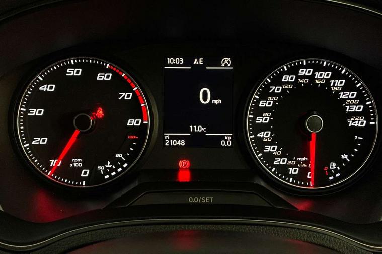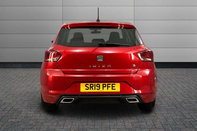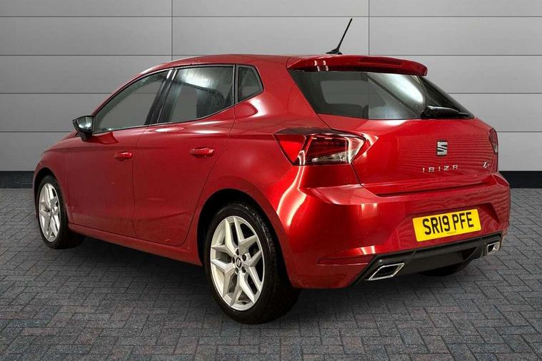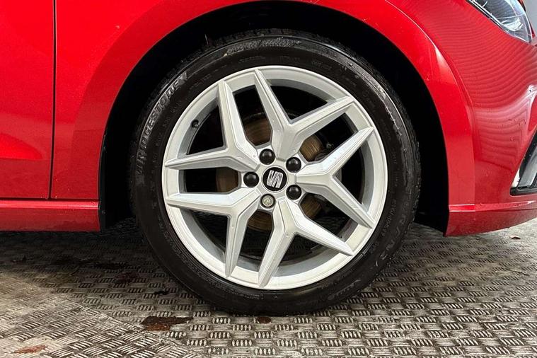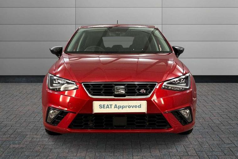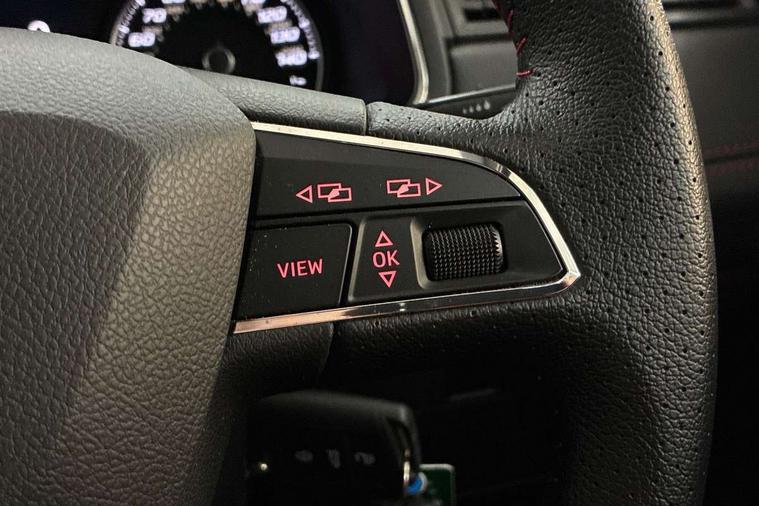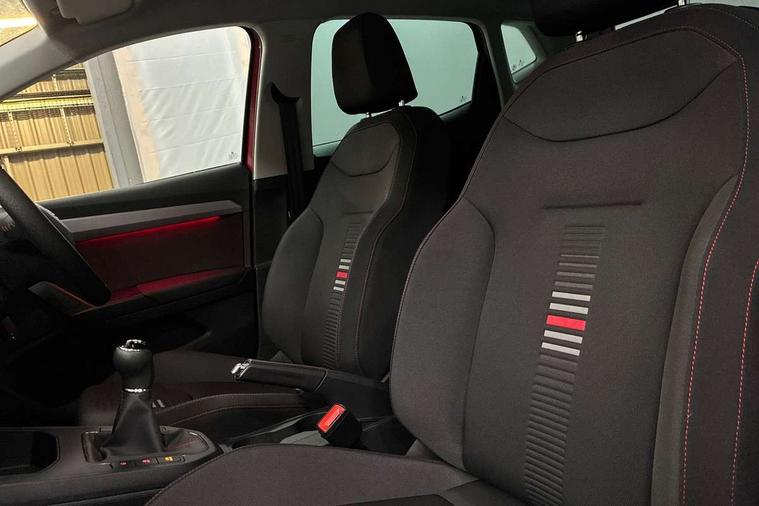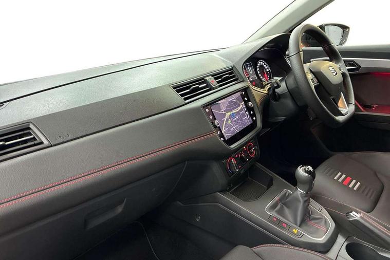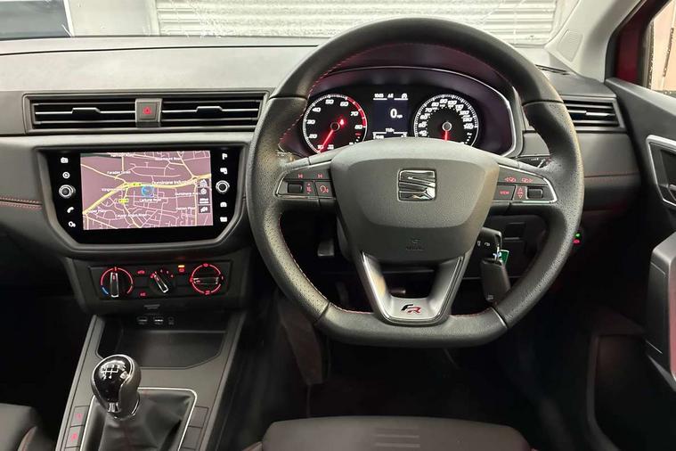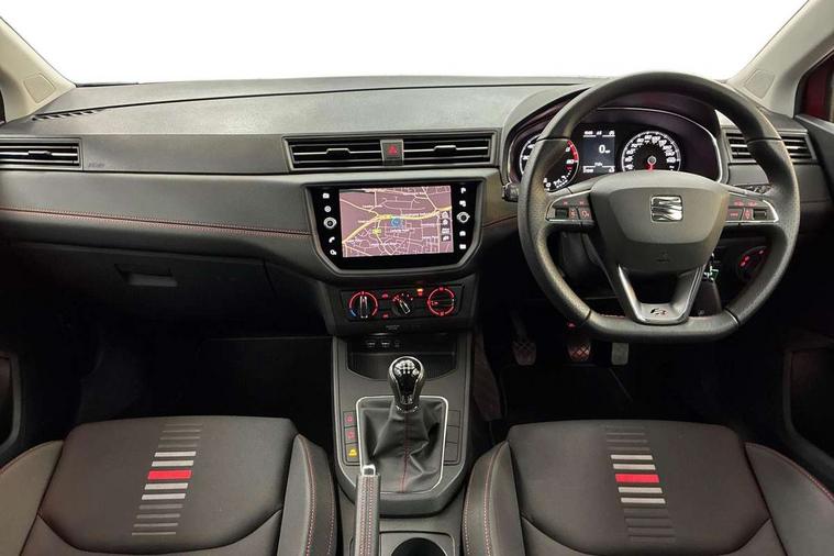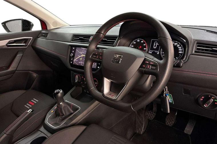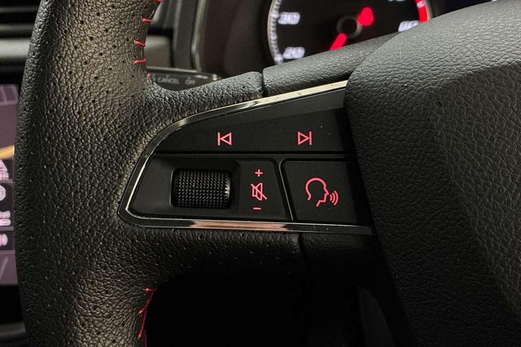 'Lights On' Reminder warning buzzer, Bluetooth Handsfree Phone Connection, Cruise control, Digital clock, Full Link Smartphone Integration with Mirror Link, Apple Car Play, Google Android Auto, Low fuel warning light, Outside temperature gauge, Satellite navigation system with 3D mapping, 8" touch screen, voice control and additional USB port, SEAT Drive profile, SEAT logo boot release, Speed sensitive power steering, Trip computer, Sports suspension, 6 speakers, Auxiliary input socket, CD player, Digital Audio Broadcast (DAB) Tuner, Radio/MP3 player, SD card slot, SEAT USB media cable, Steering wheel mounted controls, USB port, Anti theft roof antenna, Auto dimming rear view mirror, Automatic headlights, Automatic rain sensing wipers, Body colour bumpers, Body colour door handles, Brilliant black door mirrors, Chrome front grille frame, Chrome grille, Coming/leaving home lighting function, Cornering front fog lights, Dark tinted rear windows, Electric folding door mirrors, Electric front windows, Electric headlight adjustment, Electrically adjustable and heated door mirrors, Exclusive FR rear bumper, Full LED headlights, LED daytime running lights, LED tail lights, Rear fog lights, Twin exhaust pipes, 3 rear headrests, 60/40 split folding rear seat, Air conditioning, Door and steering wheel ice metal decorative inserts, Driver's sunvisor with ticket holder/vanity mirror, Dust/pollen filter, Flat bottomed perforated leather steering wheel with red stitching and FR logo, Front courtesy lights, Front cupholders x 2, Front reading lights, Gear shift indicator, Glovebox, Height adjustable driver's seat, Height adjustable front/rear head restraints, Height adjustable passenger seat, Height/reach adjust steering wheel, Illuminated boot, Instrument lighting with brightness control, Leather handbrake, Leather steering wheel and gear knob, Multi-colour ambient interior lighting, Nora cloth upholstery, Passenger sunvisor, Rear top tether child seat ISOFIX attachment, Sports seats, Full LED headlight pack - Ibiza, 3 point seatbelts on all 3 rear seats, ABS, Active front headrests, Child locks on rear doors, Curtain airbags, Driver/Front Passenger airbags, ESP+EBA, Front assist (AEB), Front passenger airbag deactivation, Front side airbags, Hill hold control, Multi-Collision braking, Seatbelt warning, Tiredness recognition system, Tyre pressure monitoring system, 2 folding remote keys with window open/close function, Electronic engine immobiliser, Locking wheel bolts, Remote central locking + deadlocks, Volumetric alarm with back up horn, Black dash trim, Leather dashboard, 17" Dynamic alloy wheels,
