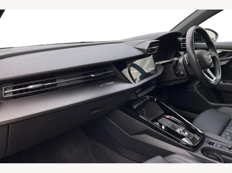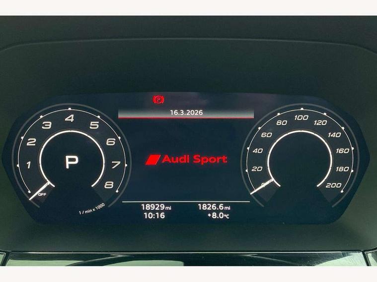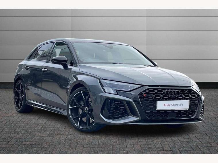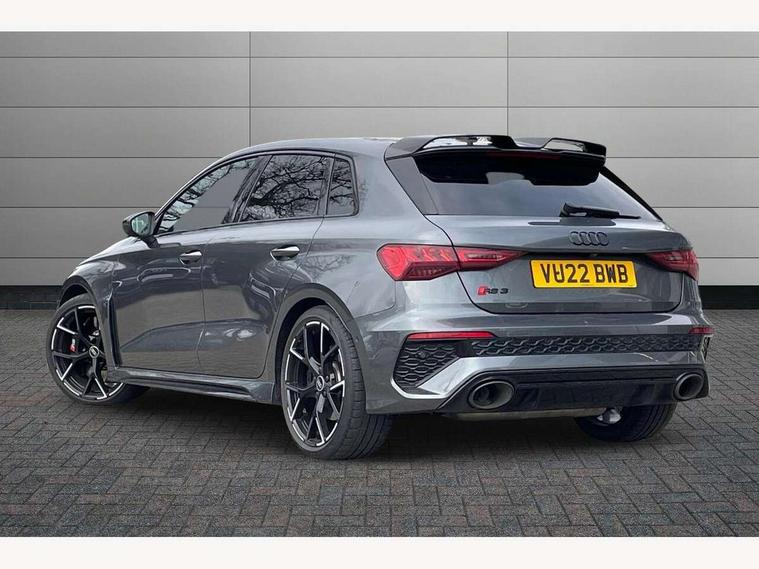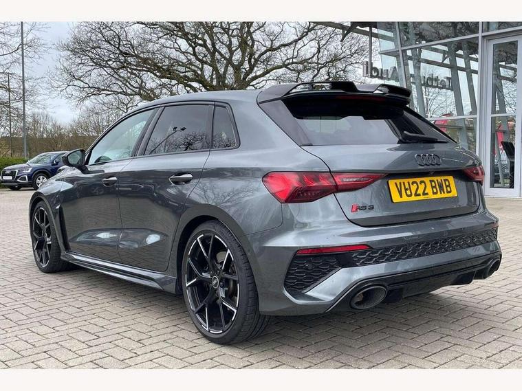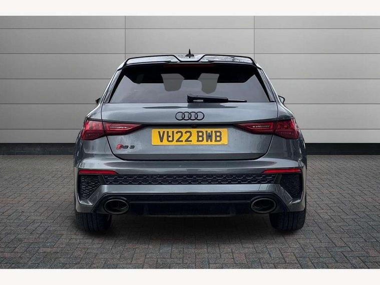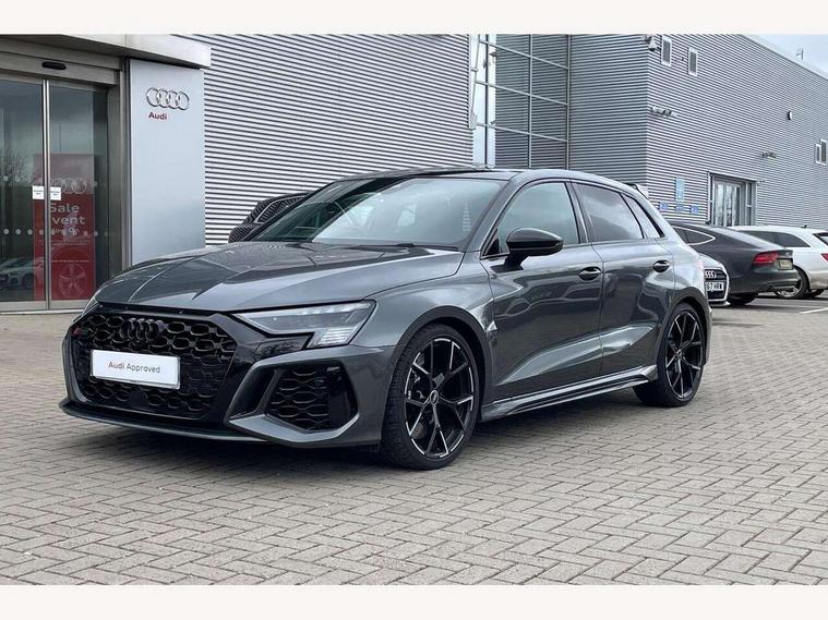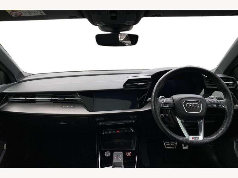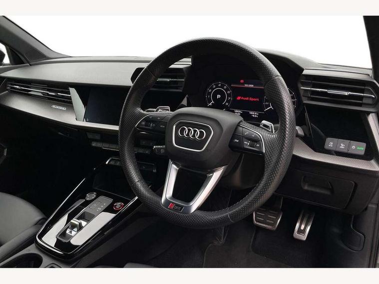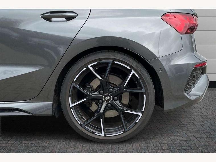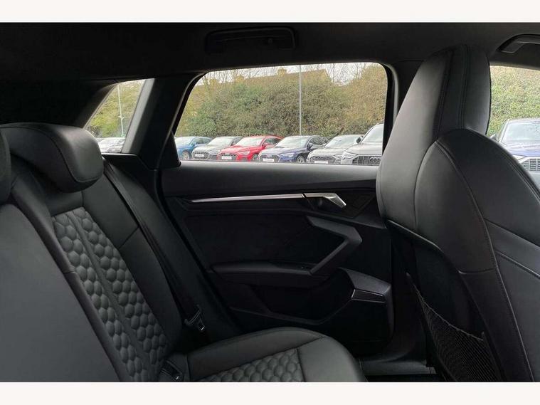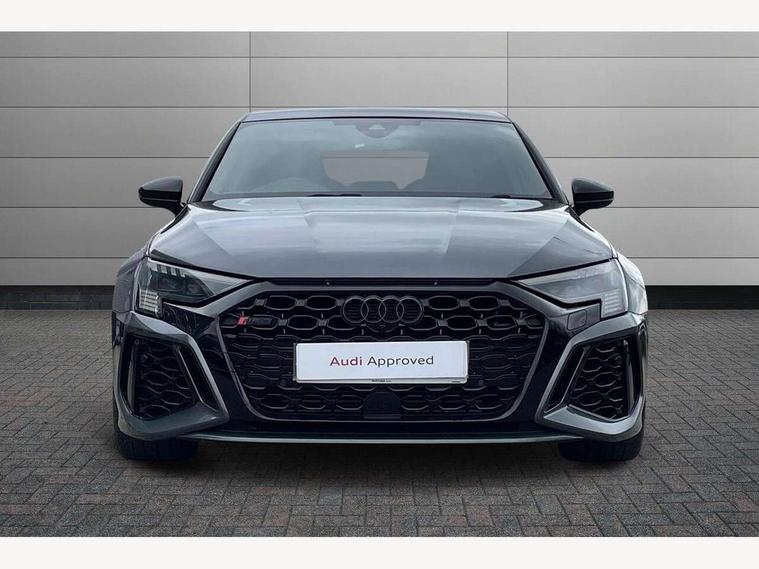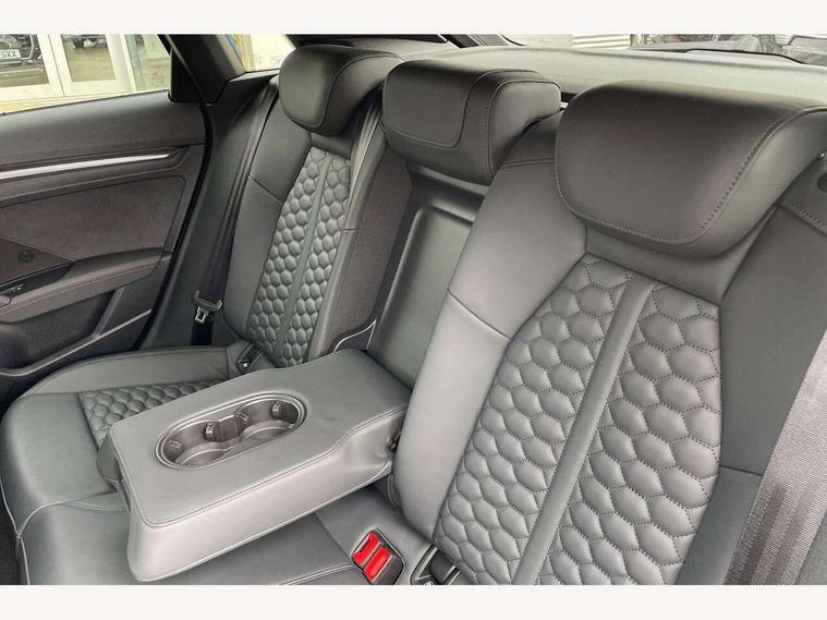 Adaptive cruise assist, Adaptive cruise control, Audi connect emergency call and service, Audi smartphone interface, Audi virtual cockpit with RS specific display 12.3" full colour digital instrument cluster, Automatic start/stop system with recuperation, Bluetooth interface, Camera based traffic sign recognition, Collision avoidance assistant, Head up Display, Lane departure warning system, Legal emergency call, Parking assist with parking system plus, Power operated tailgate - Luggage compartment lid opens electrically, Progressive power assisted steering, Reversing camera, Quattro permanent four wheel drive, Rear suspension, DAB Digital radio, 3rd brake light, Acoustic glass windscreen, Audi beam uses LEDs to project the Audi sport logo onto the ground as you exit your RS 3, Audi matrix LED headlights, LED rear lights, dynamic front and rear indicators and headlight cleaning system, Auto dimming rear view mirror, Black side skirts, Body colour roof, Carbon exterior door mirror, Carbon fibre engine cover, Electric adj heated/folding + auto dimming exterior mirrors with memory + LED indicator + auto kerb side function for passenger side exterior mirror, Front spoiler in high gloss black, Heat insulating glass windscreen, Light and rain sensors, Panoramic glass sunroof, Privacy glass - dark tinted rear and rear side windows from B-pillar backwards, Rear window wiper and washer system, RS exterior features in gloss black, RS sports exhaust system, 3 spoke leather multifunction steering wheel with gear shift paddles, 4 way lumbar support for front seats, 40/20/40 split folding rear seat bench, Black cloth headlining, Dual zone electronic climate control, Electrically adjustable front seats with memory function for driver's side, Front and rear headrests, Front centre armrest, Front sports seats RS embossed logo, Front/rear floor mats, Heated front seats, Honeycomb stitching and RS embossing, Illuminated door sill trims inlays in aluminium with RS 3 logo, RS emblems, Stainless steel pedals and front footrest in black, Aluminium interior elements pack - RS3, Ambient lighting pack - RS3, Comfort and sound pack - RS3, Driver assistance pack with 3 spoke leather multi function steering wheel - RS3, MMI navigation plus with MMI touch - RS3, RS bodystyling - RS3, Storage Pack - RS3, 3x3 point rear seat belts, ABS/EBD, ASR, Audi pre sense front, Driver/Front Passenger airbags, EDL, ESC - Electronic Stability Control + traction control, Front passenger airbag deactivation, Front side airbags with head airbags and interaction airbag, Hill hold assist, Seat belt reminder with passenger presence detection in rear, Tyre pressure loss indicator, Warning triangle and first aid kit, Anti theft alarm, Anti-theft wheel bolts, Electronically operated child lock, Remote control central locking, Full decorative carbon trim, 19" 5 Y spoke black with graphic print alloy wheels, Tool kit, Tyre repair kit,