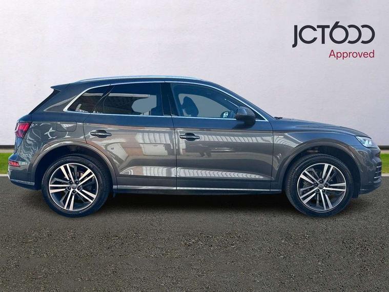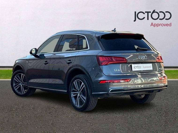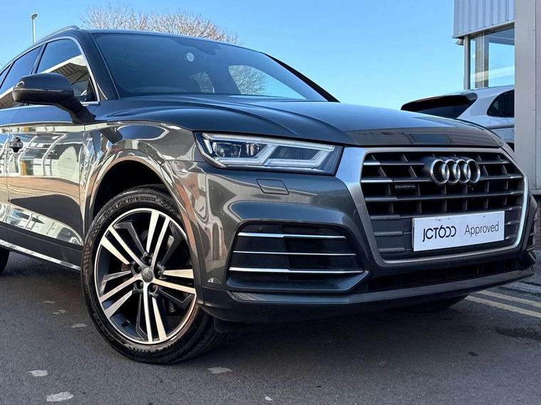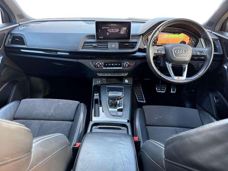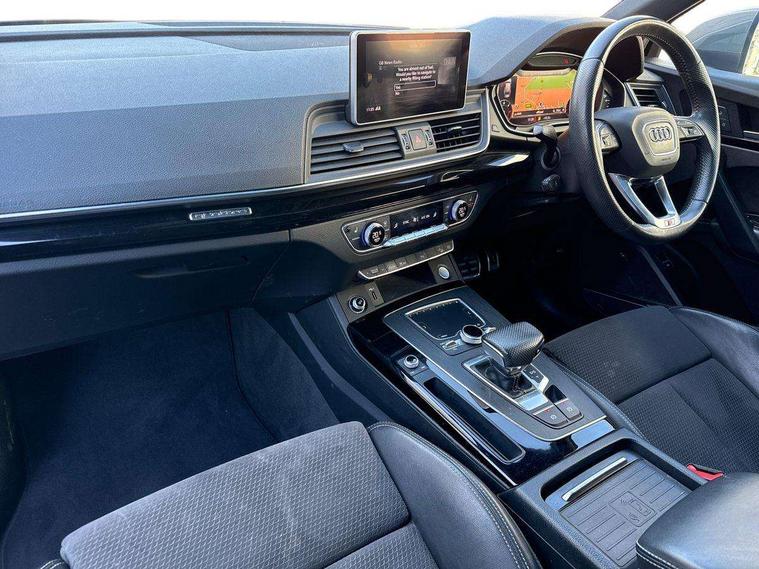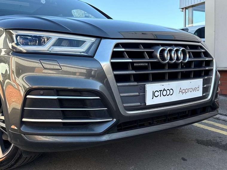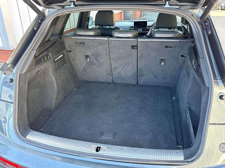 7" Colour driver information system, Audi connect safety and service (e-call), Audi drive select, Audi parking system plus with front and rear sensors, Audi Pre sense collision avoidance, Audi smartphone interface, Automatic start-stop system with coasting functionality and efficiency programme, Cruise control + speed limiter, Electro - mechanical power assisted steering, MMI Navigation, Mobile telephone preparation - bluetooth interface, Power tailgate, Service interval indicator, Voice control system, Diesel particulate filter, Dynamic suspension, Quattro on demand, 2 x USB charging port with aux input socket, 2x SD card slot, CD player, DAB Digital radio, MMI radio plus with 7" colour MMI screen and MMI controller, Acoustic windscreen, Air inlets in matt titanium black with blades in matt aluminium silver, Aluminium roof rails, Auto dimming rear view mirror, Automatic headlight levelling, Body colour bumpers, Body colour door mirrors, Body colour rear diffuser with matt aluminium silver surrounds, Body colour S Line side skirts, Body colour underbody protection, Chrome exhaust tailpipe, Electric adjustable/heated/folding door mirrors, Front and rear electric windows, High beam assistant, LED headlights with LED rear lights + dynamic rear indicators, Light and rain sensor for auto activation of lights and windscreen wipers, Loading sill protector in stainless steel, Privacy glass with front acoustic glazing, Rear wiper, S front and rear bumpers, S Line badges on the front wings, S Line rear spoiler, Twilight grey matt radiator grille with matt aluminium horizontal chrome struts, 3 rear headrests, 40:20:40 split folding rear seat with rear centre armrest, Black cloth headlining, Contrast stitching on seats, steering wheel and gear lever gaiter, Deluxe 3 zone electronic climate control, Front centre armrest, Front sport seats with S embossed logo, Front/rear floor mats, Heated front seats, Height adjustable front head restraints, Height/reach adjustable steering column, Illuminated door sill trims with S logo, ISOFIX child seat mounting and top tether, Luggage compartment carpet, Manual seat adjustment with 4-way electric lumbar support, Perforated leather gearknob, Removable luggage compartment floor, Stainless steel pedals, Sunvisors with vanity mirrors, Trunk roller cover, High gloss pack - Q5, LED interior light pack - Q5, Non Smokers pack, 3 point seatbelts on all seats, 6 airbags - Driver, front passenger, curtain and side airbags, Electromechanical parking brake, Electronic stabilisation control including ABS, ASR and EDL, Front passenger airbag deactivation, Hill descent control, Hill hold assist, Multi collision brake assist, Pop-up bonnet for pedestrian protection, Pre sense city, Seat belt force limiter, Seatbelt monitoring, Tyre pressure warning, Warning triangle and first aid kit, Anti theft alarm, Anti-theft wheel bolts, Keyless Go access/ignition system, Remote central locking, Matt brushed aluminium inlays, Tool kit,