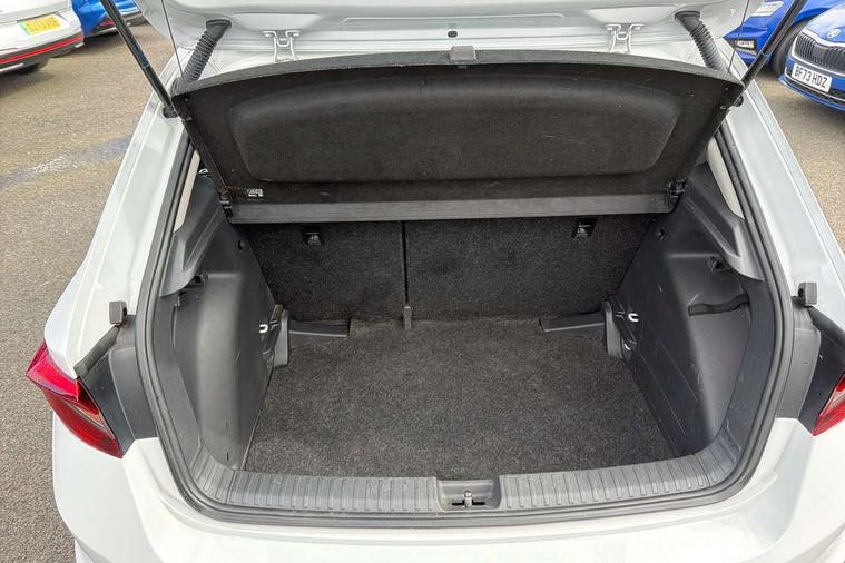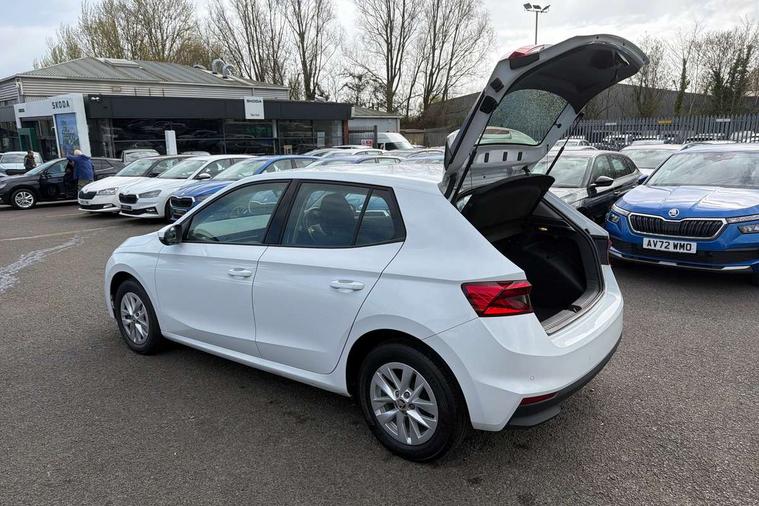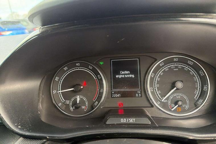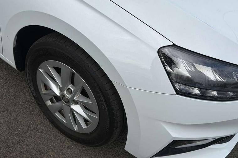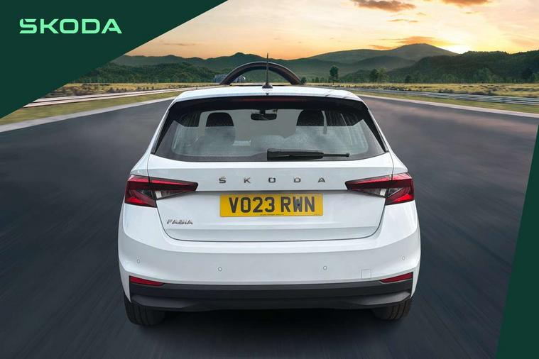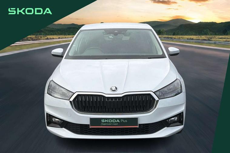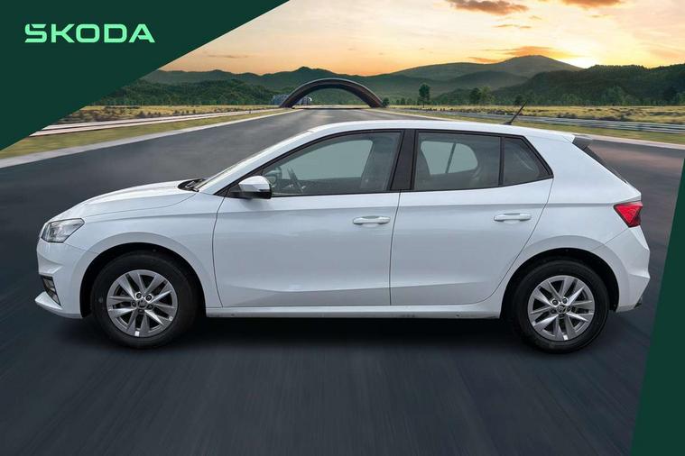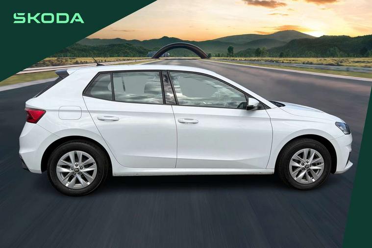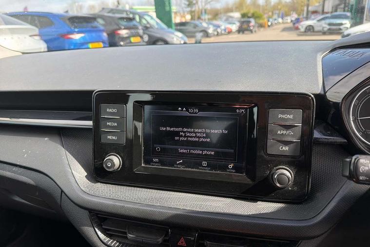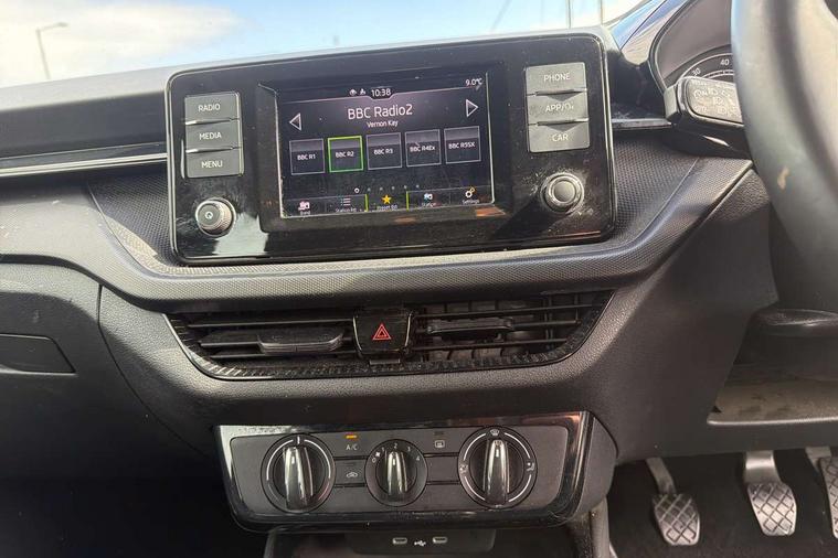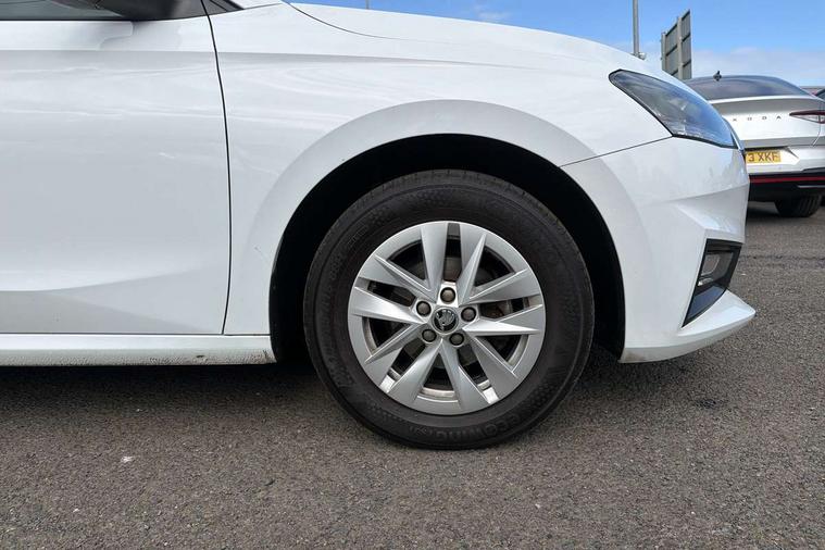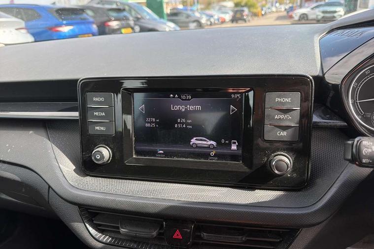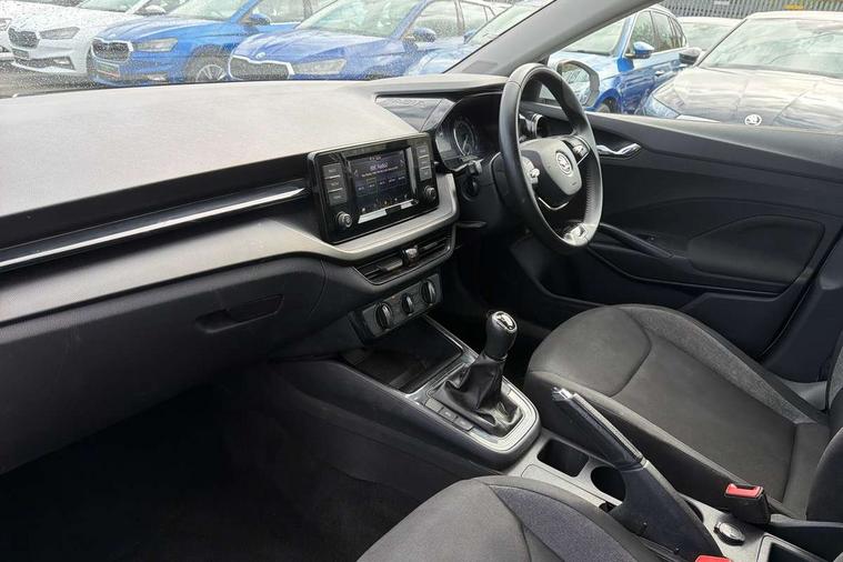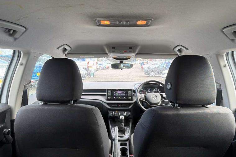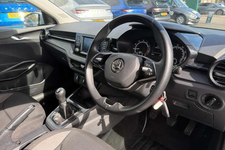 Bluetooth connection, Driver alert system - DAS, Electromechanical power steering, Exterior temperature gauge, Lane assist including road edge detection, Multifunction trip computer in black and white, Service interval indicator, Speed limiter, 2x USB-C in the front (for data transmission and charging), 4 speakers in front, Auxiliary socket for external MP3 player, DAB digital radio reception, Radio Swing with 6.5" colour display, Basic LED Headlights, Basic rear lights, Body colour door mirrors, Body coloured bumpers, Dimming rear view mirror with black frame, Door mirror integrated indicators, Electrically adjustable and heated door mirrors, Electrically adjustable front windows with function auto up/down, Front fog lights, Front window wiper intermittent control, Headlight range control - Automatic, Ice scraper in fuel cap, LED daytime running lights with coming and leaving home feature, Mechanical adjustable rear windows, Rain sensor, Rear LED fog light, Rear side wing doors, Rear window wiper with washing nozzles, Roof mounted spoiler, SKODA tailgate lettering in chrome, Third brake light, 2 reading lights in front and 2 reading lights in rear, 2 spoke leather multifunction steering wheel, 3 rear headrests, Backrest split and folding, Central console with fixed cup holder and storage box, Chrome handbrake release button, Fabric upholstery, Gearshift knob/handle in leather, Grain satin black interior door handles, Hand brake lever handle in leather, Height adjustable front headrests, Height adjustable front seats, Height adjustable steering wheel, ISOFIX and TopTether anchorage points to the outer rear seats, ISOFIX and TopTether on the front passenger seat, Luggage compartment lighting, Manual air conditioning, Manually adjustable lumbar support in front seats, Pollen filter, Rear seat bench unsplit, Single front passenger seat, Storm grey headlining, Sun visors with mirror and airbag label on passenger side, Ticket holder, 3-point height adjustable front seats belts with pretensioner and force limiter, Automatic warning lights in case of crash, Driver and passengers airbag with switch off function, e-Call+, ESC including ABS, MSR, ASR, EDS, HBA and XDS, Front and rear seat belt warning, FRONT ASSIST (AEB City and AEB Inter Urban), Front side airbags, Head airbags, One tone horn, Pedestrian protection, Three rear 3-points safety seat belts with pretensioner and force limiter including stop function for outer rear seat belts, Tyre pressure monitoring system, Anti-theft alarm system including immobiliser, interior monitoring, backup horn, and towing protection, Central locking with radio remote control, interior controls, SAFE function and 2 foldable keys, Black painted air vents, Glossy black decorative trim, Grain satin black central console cover, Grain satin black lower decorative trim, Satin black door and side trim panel in front, Anti-theft wheel bolts protection, Super-low rolling resistance tyres,