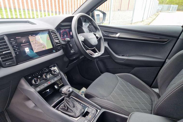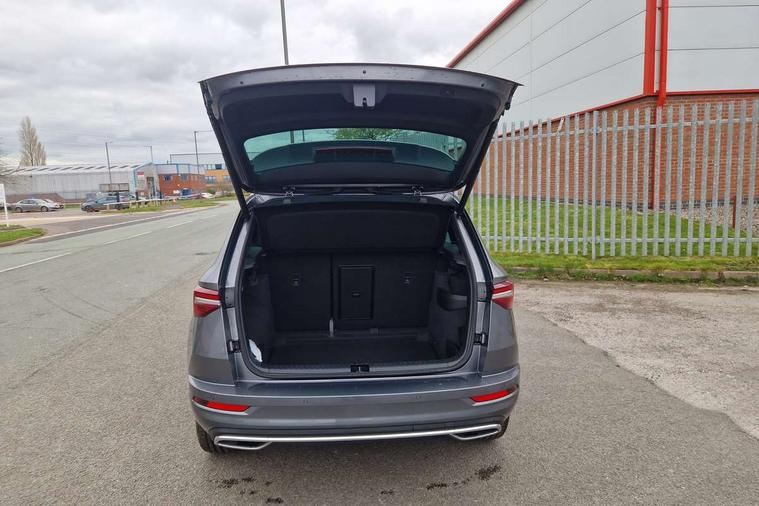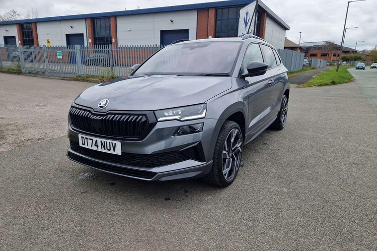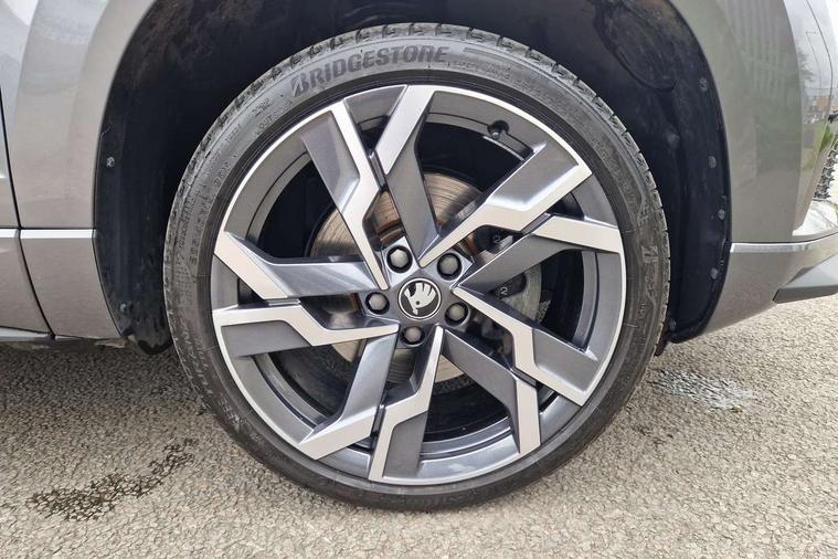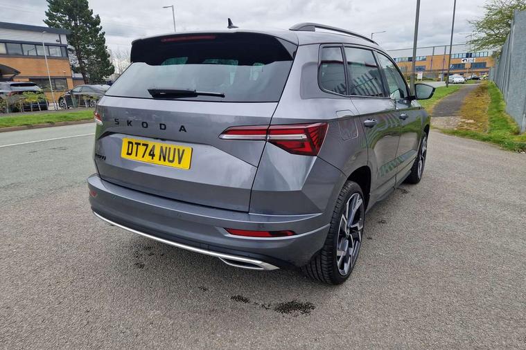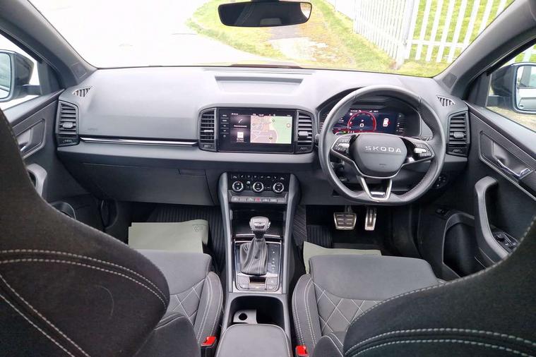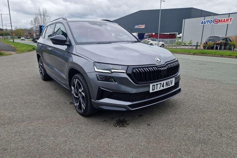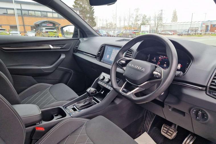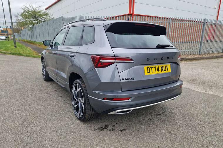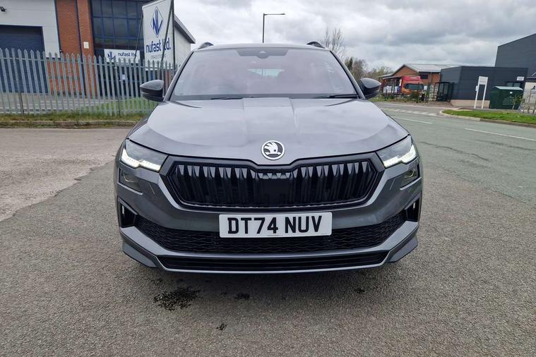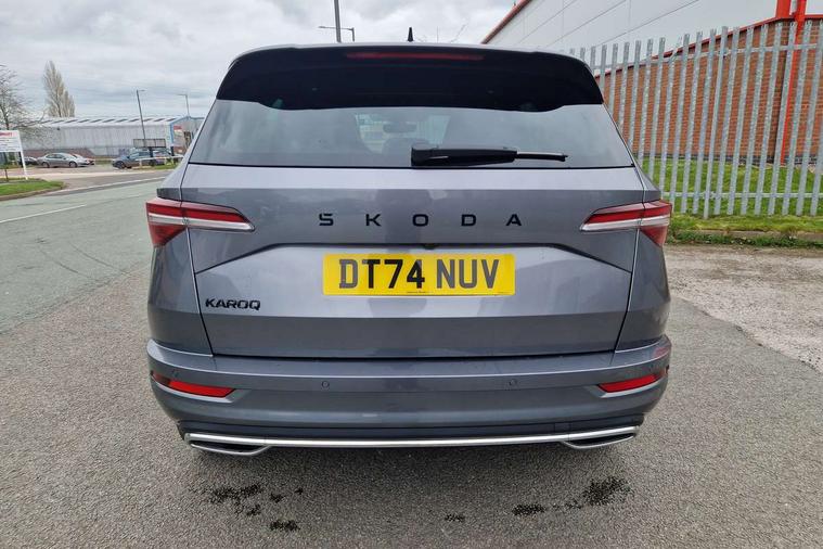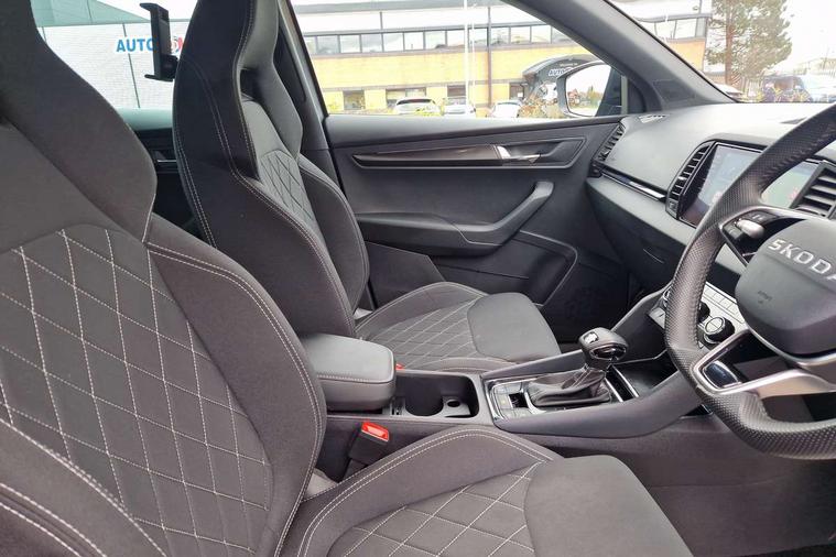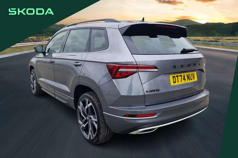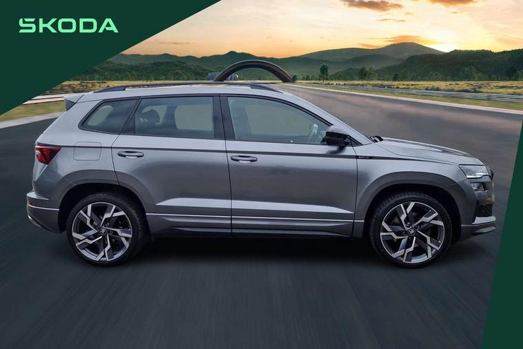 Advanced driver attention and drowsiness monitor, Emergency services call system, Outside temperature gauge, Sensor for driver assistance systems, Service interval indicator, SmartLink wireless for Apple and wired for Android, Start/stop system with regenerative braking, Traffic sign recognition, USB C Port x 2 in front centre console, Virtual Cockpit - 10.25" digital display, Virtual pedal with electrically operated boot door, Wireless smartphone charging, DAB radio with Bluetooth, USB connection, Acoustic glass, Aero front windscreen wipers with intermittent function, Auto dimming rear view mirror with light and rain sensors, Black door mirrors, Black electric window control buttons, Black radiator grille, Black roof rails, Body colour door handles, Electric front and rear windows with child proof lock, Extended rear roof spoiler, Front door steps with SportLine logo, Heated rear windscreen, LED daytime running lights, LED rear lights with high functionality welcome effect and dynamic indicators, Light assistant (coming/leaving home/tunnel light), Panoramic sliding sunroof, Plastic scuff plates in door apertures, Privacy glass, Protective door side sills in body colour, Rear diffuser, Rear side wing doors, Rear window wiper with washer system and intermittent control, Safety reflectors on front doors, Skoda lettering on tailgate in black, Sportline badge on front fender, Sports front and rear bumpers, Third brake light, Unique dark chrome design logo on alloy wheels, 1.5 litre bottle holders in driver and front passenger door panels, 12V socket in boot, 12v socket in front centre armrest with storage compartment and rear air vents, 2 x Tablet holder, 3 rear height adjustable headrests, 3 seat bench in 2nd row, 3 spoke sports leather heated multifunction steering wheel with DSG paddles, 4 foldable roof handles with rear coat hooks, Black floor carpet, Cargo elements in boot, Chrome inner door handles, Foldable hooks in the boot, Front head restraints, Height adjustable front three point seats belts with tensioners, Height/reach adjust steering wheel, Ice scraper, Illuminated glovebox, Illuminated luggage compartment, Isofix child seat preparation for front passenger seat, Isofix child seat preparation outer rear, Manual lumbar support for front seats, Pen holder, Pollen filter, Rear backrest release from boot, Rear boot cover, Rear package tray, Rear reading lights, Rear seats fixed folding and divided 60:40, Rubbish bin door, Safety vest holder, Single front passenger seat, Skoda lettering on steering wheel, Sportline decorative inserts, Storage box in upper central dashboard closed, Sunvisors with illuminated vanity mirrors, Textile floor mats, Ticket holder, Titan black interior ceiling, Umbrella under passenger seat, Under passenger seat storage compartment, Columbus pack - Karoq, LED Interior lighting pack with Skoda welcome logo - Karoq, Light Pack - Karoq, Non Smokers pack, Performance pack - Karoq, Winter plus pack with heated front and rear seats - Karoq, Automatic door unlocking in case of crash, Automatic fuel cut off in case of crash, Driver airbag, Electronic parking brake with auto hold function, Emergency rear braking signal, ESC (incl. ABS+MSR+ASR+EDS+HBA+DSR+RBS+MKB), Front side airbags, Head airbags, Hill hold control, Knee airbags, Passenger airbag with switch-off function, Pedestrian monitor, Seatbelt reminder signalisation and pretensioner for all seats, Three point seatbelts rear, Two tone horn, Tyre pressure monitor, Alarm with interior monitoring, back up horn and tilt sensor with safe function, Electronic engine immobiliser, Keyless entry and start/stop, Remote central locking with 2 remote folding keys, Black air vent surround, Black centre console, carbon door decor, Satin black dashboard, Satin black door trim, 19" Sagittarius anthracite alloy wheels, Anti-theft wheel bolts protection, Breakdown and tool kit,
