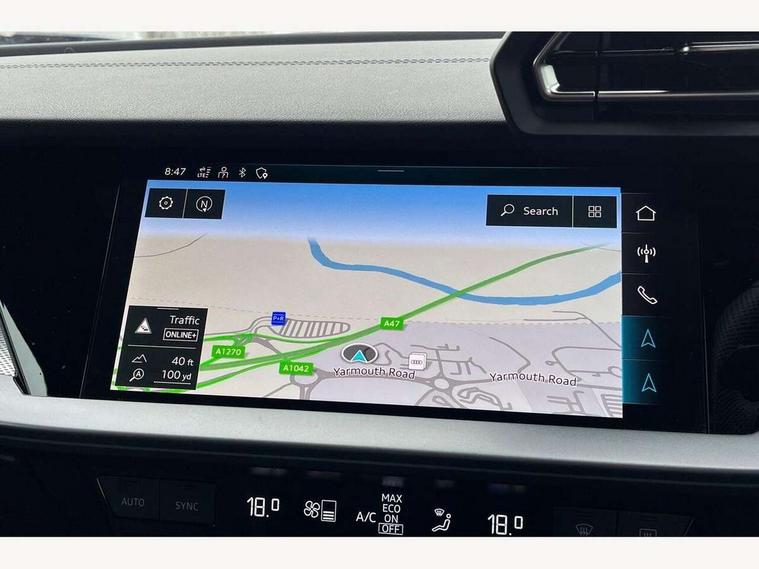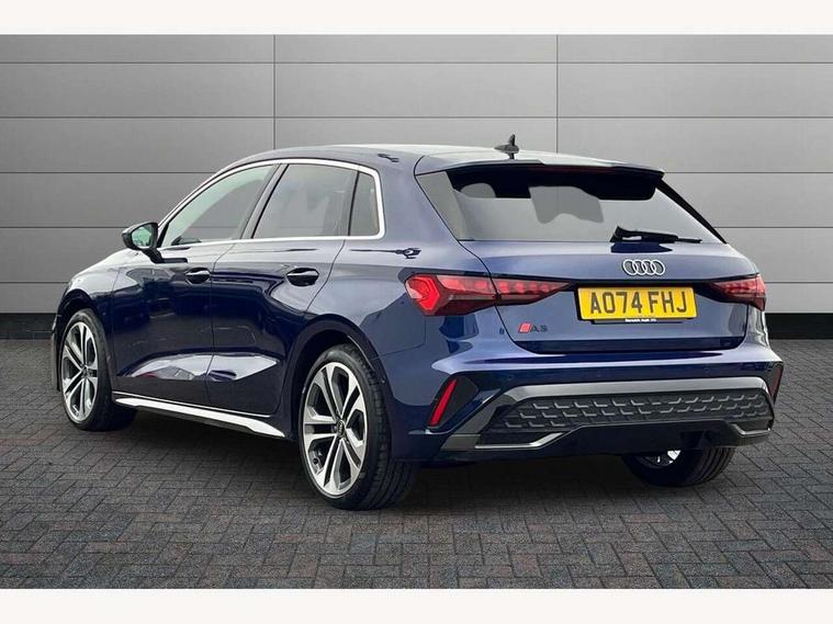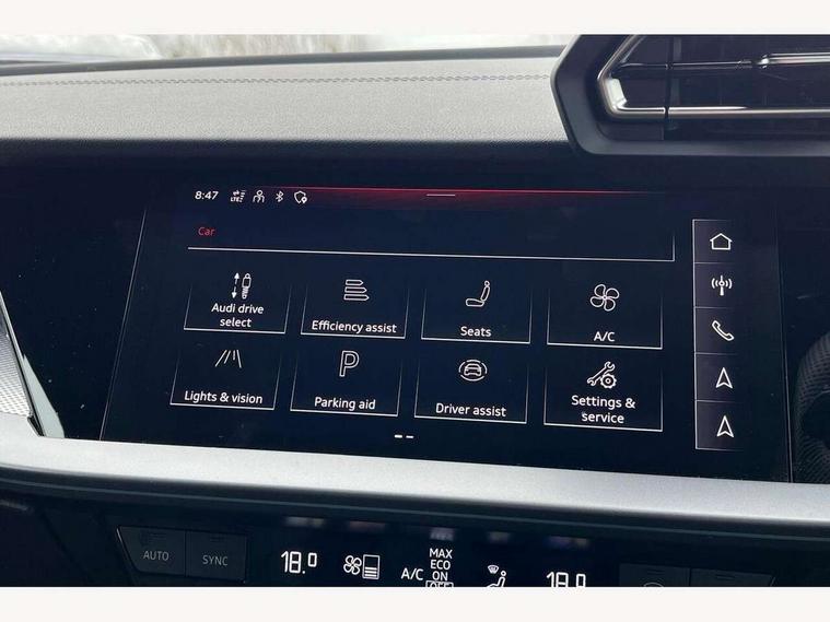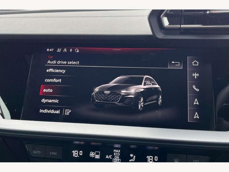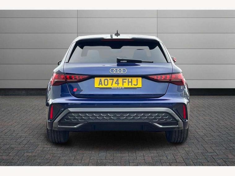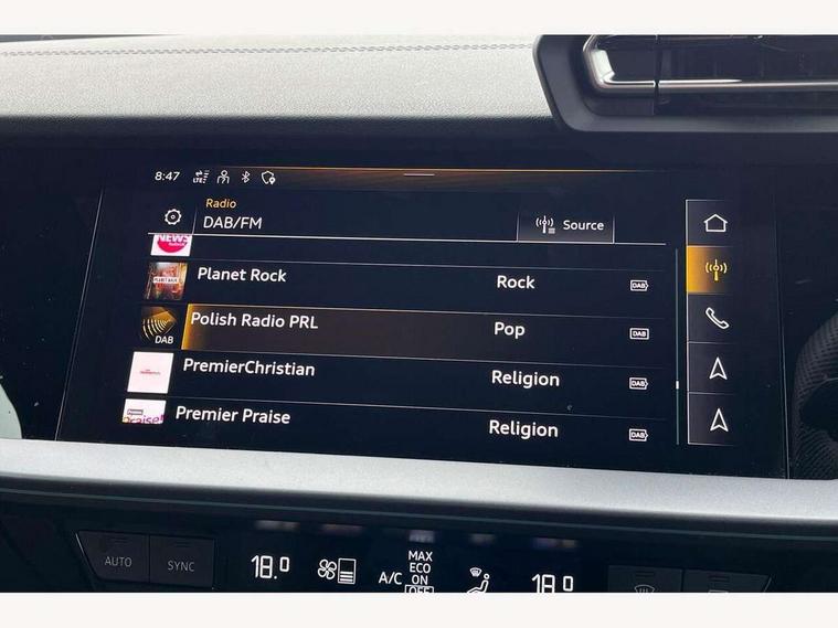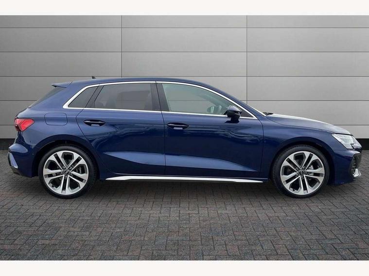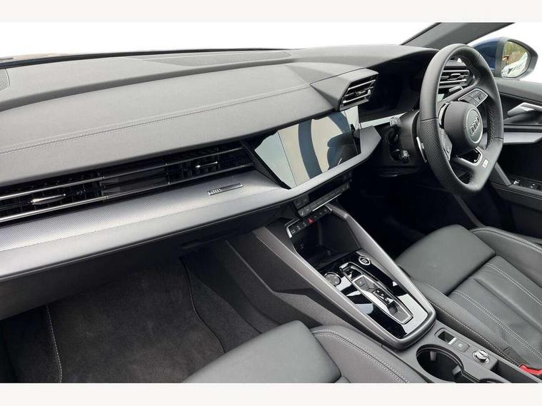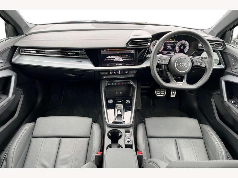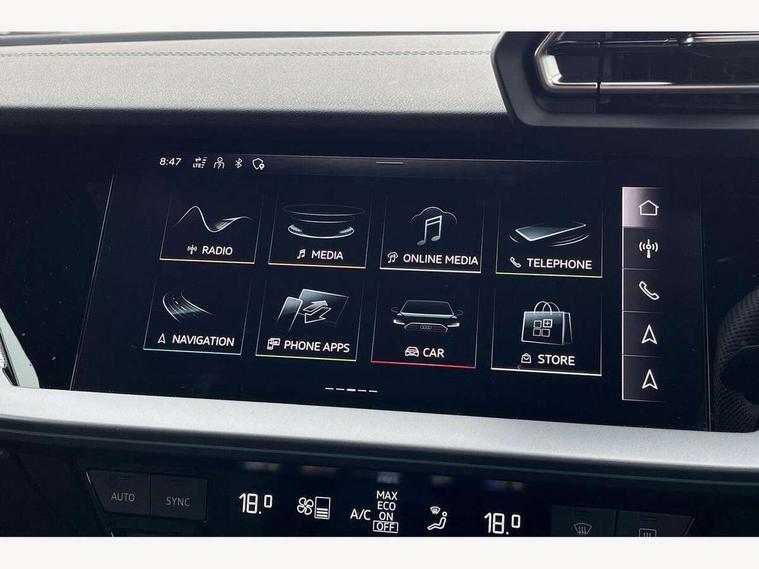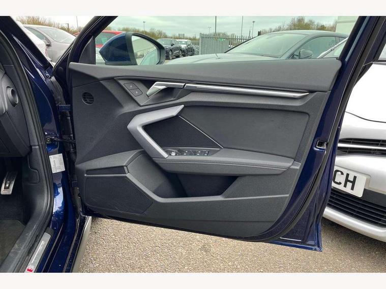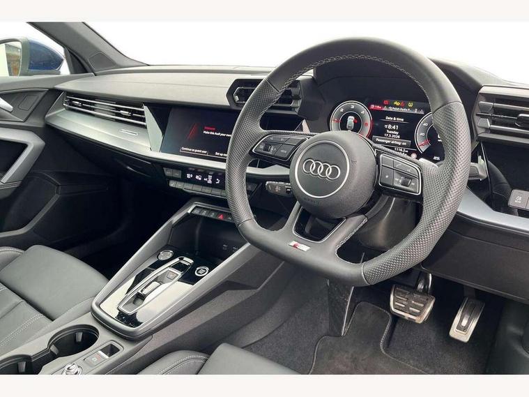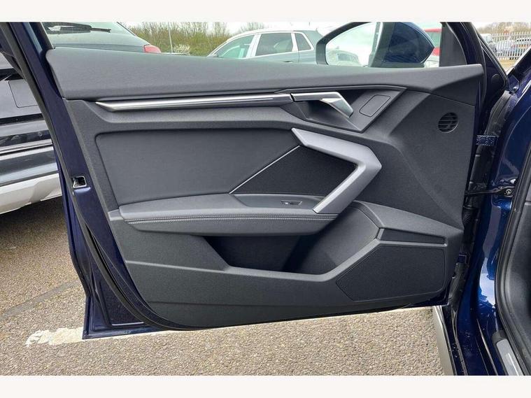Adjustable speed limiter, Audi drive select, Audi smartphone interface with app store includes wireless Apple carplay, Android auto and Amazon alexa integration, Audi virtual cockpit plus - 12.3" full HD resolution dynamic digital instrument cluster, Automatic start/stop system with recuperation, Bluetooth interface, Camera based traffic sign recognition, Collision avoidance assistant, Cruise control, Distraction and Fatigue warning, e-Call (emergency call), Electromechanical power speed sensitive steering, Lane departure warning system, MMI Navigation Plus with high resolution 10.1" colour touch screen display, Park Assist with parking system Plus, Service indicator, Tailgate, Trip computer, Voice control system with natural language interaction, Diesel particulate filter, Sports suspension, Audi Phonebox light with wireless charging, Audi sound system - 10 loudspeakers including centre loudspeaker and subwoofer, DAB Digital radio, USB ports with charging function in the rear, Acoustic glass windscreen, Aluminium window trim, Auto dimming frameless rear view mirror, Body colour exterior mirrors, Chrome exhaust tailpipes, Electrically adjustable/heated/folding/auto dimming door mirrors with integrated LED indications + kerb view function for passenger side, Exterior model badging, Front and rear side air inlets in grained matt black with dark liquid chrome frame, Front electric windows, Front radiator grill in high gloss dark chrome, Heat insulating glass windscreen, Illuminated door sills with aluminium inserts at the front with S logo, LED 3rd brake light, LED daytime running lights, LED headlights with LED rear lights and dynamic rear indicators, Light and rain sensors, Privacy glass - dark tinted rear window, rear door and side windows, Rear diffuser and grill in grained matt black with inlay in dark liquid chrome, Rear electric windows, Rear side wing doors, Rear wiper, S line bumpers, S roof spoiler, Side S line emblems on front wings, Side sill trim in dark liquid chrome, 12V socket and storage compartment in front centre console, 3 seat bench in 2nd row, 3 spoke flat bottomed leather multifunction sport steering wheel with gear shift paddles, 3-zone deluxe automatic air conditioning, 4 way electrically adjustable lumbar support for driver and front passenger, 40/20/40 split folding rear seat bench, Black cloth headlining, Front and rear centre armrest in artificial leather, Front and rear headrests, Front/rear floor mats, Heated front seats, Height and reach adjustable steering wheel, Manual boot compartment lid, Manually adjustable front seats, Rear cup holders, S badging on the steering wheel, Seat side bolsters, Single front passenger seat, Stainless steel pedals and front footrest in black, Twin leather upholstery with front sports seats S embossed logo, Aluminium interior elements pack - A3 Sportback, Multi-coloured LED interior lighting package - A3, 3x3 point rear seat belts, Driver and front passenger airbag with passenger airbag deactivation, Electronic Stabilisation Control (ESC) including ABS, ASR and EDL, First aid kit with warning triangle and 2 safety vests, Front side airbags with head airbags and interaction airbag, Hill hold assist, Pre-sense front with pedestrian and cyclist detection, Seatbelt monitoring, Tyre pressure loss indicator, Anti theft alarm, Anti-theft wheel bolts, Electronically operated child locks, Immobiliser, Remote central locking with safelock, Dash & door Inlay in dark aluminium Spectrum,