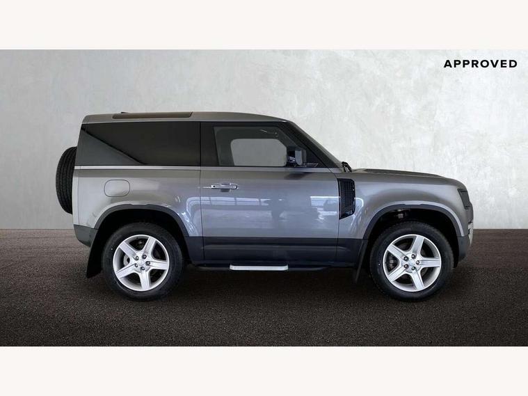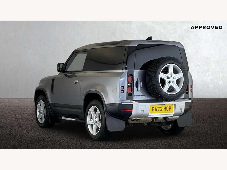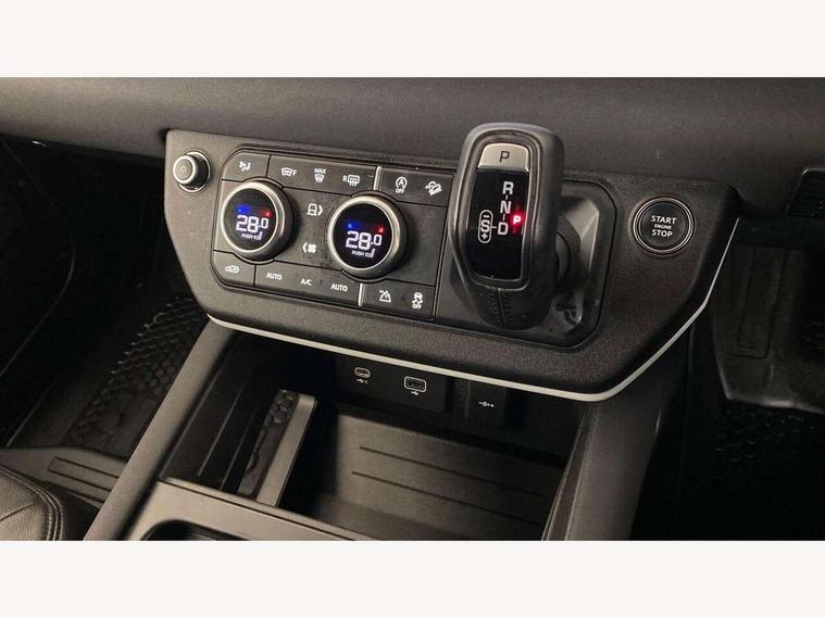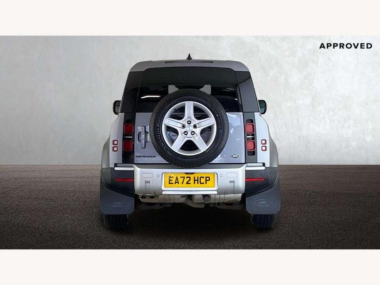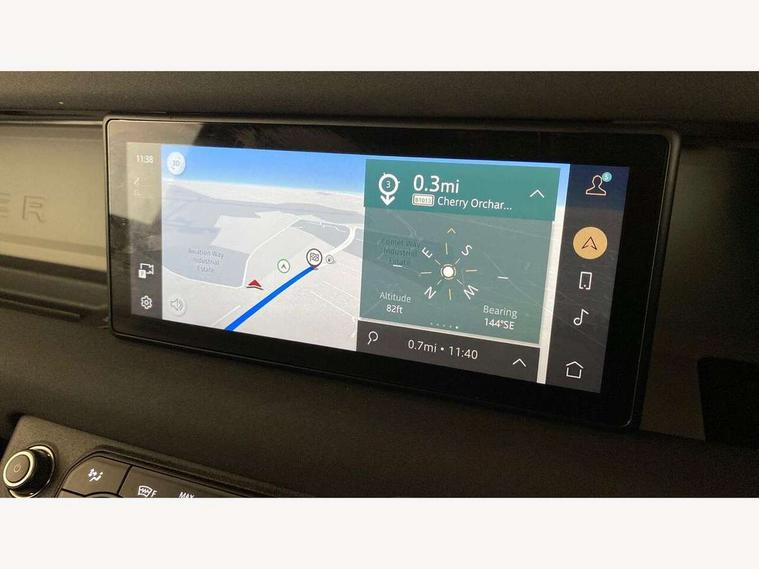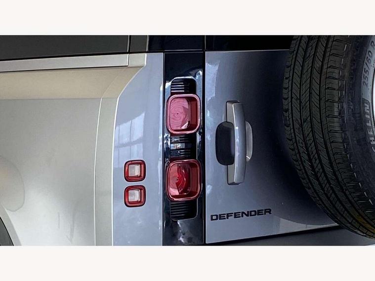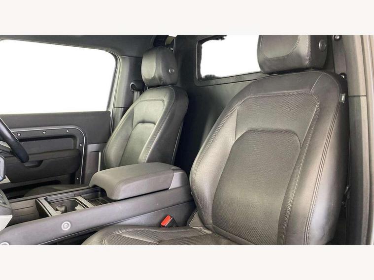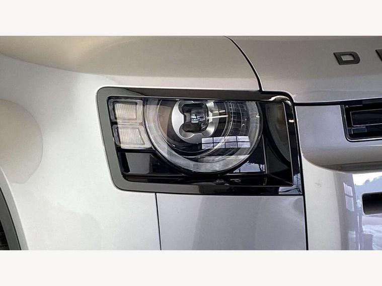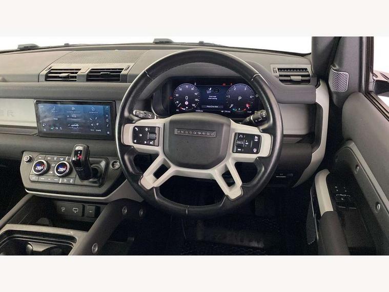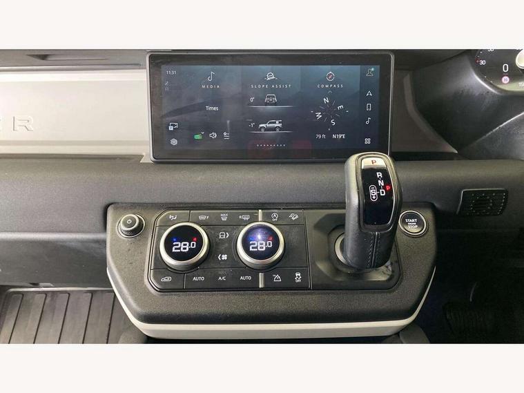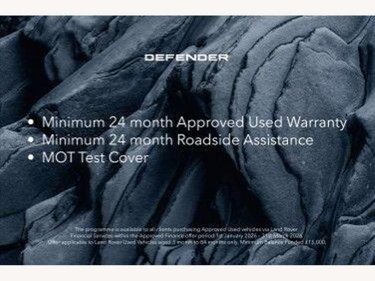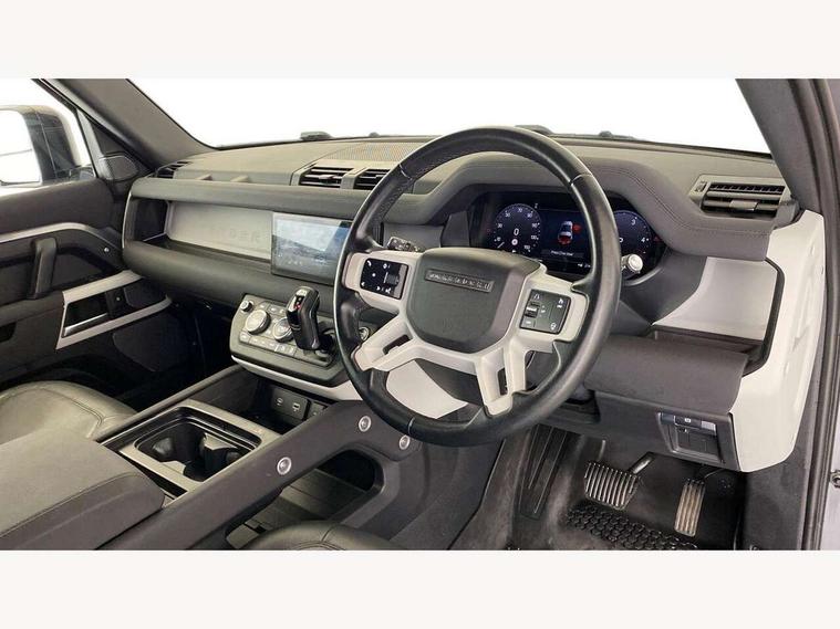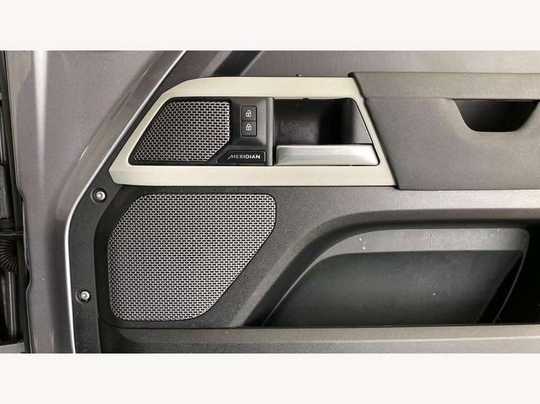 Customer Configurable Autolock, 360 parking aid, 3D Surround Camera with 360 View, 180 Rear View, Front Traffic Detection, Forward Vehicle Guidance, Tow Hitch Assist and clear sight Ground View, Blind spot assist, Brake Hold, Driver condition monitor, Electric power assisted steering (EPAS), Lane keep assist, Low traction launch, Pivi pro connected, Rear traffic monitor, Traffic sign recognition adaptive speed limiter, Trip computer, Tyre pressure monitor, Wade Sensing, Android Auto, Apple CarPlay, DAB Radio (Digital Audio Broadcasting), Meridian 280W sound audio system with 7 speakers with subwoofer, Alpine lights, Assisted tailgate, Auto High Beam Assist, Automatic headlight levelling, Automatic headlights and rain sensitive front wipers, Centre high mounted stop light, Electric heated/power fold door mirrors with approach lights and auto dimming driver side, Electric windows with one touch open/close and anti-trap, Exterior signage panel, Follow me home lighting, Front fog lights, Heated rear window with timer, Heated windscreen, LED tail light, Privacy glass, Puddle lights, Rear fog lights, Rear wash wiper, Side-hinged tailgate, Standard roof, Standard tread plates, Additional lashing points, Dual zone climate control, Durable rubber cabin flooring, Footwell lights, Full height bulkhead behind row 1 seats, Glovebox storage, High sided rubber mats, Loadspace cover, Loadspace hooks, Loadspace rubber mat, Manual adjustable steering column, Overhead stowage for sunglasses, Rear centre headrest, Rear reading light, Standard interior, Standard seating configuration, Sunvisors with illuminated vanity mirrors, Twin front cupholders, Upgraded loadspace LED lighting, Online pack - Defender with data plan, Brake pad wear indicator, Electronic traction control, Emergency braking, Front airbags, with passenger seat occupant detector, Power operated child locks, Remote for (e-Call, Optimised assistance call, InControl app, Climate, beep and flash and door), Seat belt reminder, Intrusion sensor, Keyless entry system, Locking wheel nuts, 8 speed automatic transmission, ABS and EBA, All wheel drive, CBC - (Cornering brake control), Dynamic stability control, Electronic brake force distribution, Electronic park brake, Gradient acceleration control, Hill Descent Control, Hill start assist, Particulate filter (DPF), Push button start, Roll stability control, Trailer stability assist, Twin speed transfer box (high/low range),