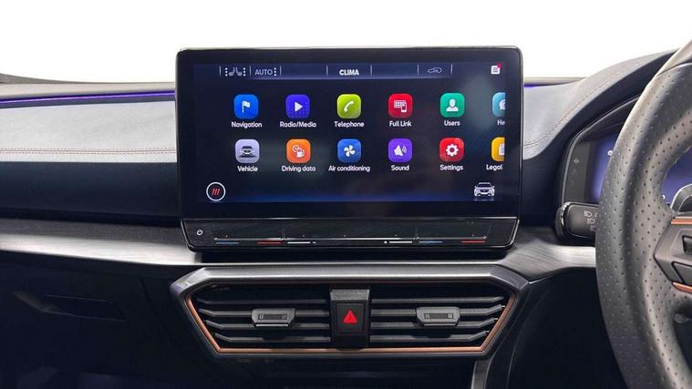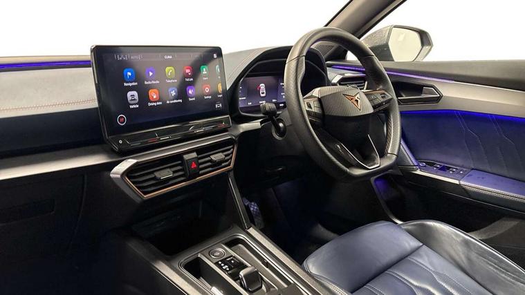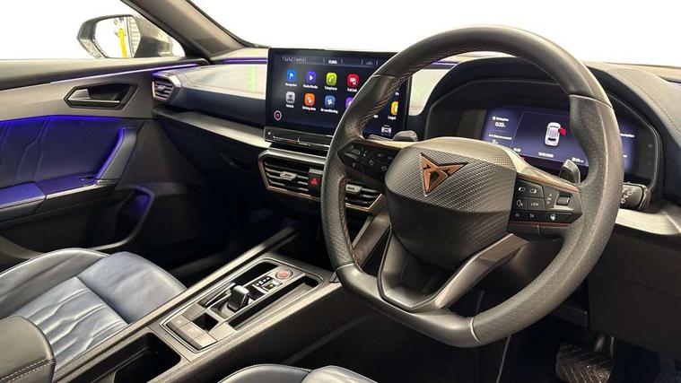 Digital cockpit and configurable dashboard, Driver alert system, Driving profile selection, Forward collision warning with automatic braking, Lane assist, Navigation system with 12'' Touchscreen Display, Park assist (inc front/rear parking sensors), PAS, Predictive adaptive cruise control with speed limiter, Rear view camera, RPM, trip computer, outside temp gauge, instrument light brightness, low fuel warning light, lights on reminder, gearshift indicator, Service interval indicator, Start/stop system with regenerative braking, Voice control system, Wireless apple carplay, Wireless phone charger, Electronic locking differential and dynamic traction support, Standard suspension, 2 front and 2 rear USB type C sockets, Auxiliary input socket, DAB radio, Auto dimming rear view mirror, Body colour door handles, Body coloured bumpers, Dark grey wing mirror, Daytime running light with automatic headlight control and coming home feature, Dynamic headlight range control, Electric front/rear windows, Electrically adjustable heated and folding door mirrors with memory function, Front fog lamps with cornering function, Gloss black roof rails and window surrounds, LED Headlights, LED Taillights with dynamic indicator, Rain sensing wipers, Rear diffuser with black simulated exhaust pipes, Rear side wing doors, Rear wash/wipe, Third brake light, Tinted rear windows, Welcome lights, 12v power supply in centre console, 12V socket, 12v socket in loadspace, 2 front and 2 rear reading lights, 230V socket, 3 seat bench in 2nd row, 60/40 split rear bench seat with armrest and mechanical seat release, Black headlining, Dust/pollen filter, Front and rear head restraints, Front centre armrest, Height/reach adjust steering wheel, Illuminated interior front door sills, Illuminated sunvisor with mirror, Isofix, Leather multi function heated steering wheel with gear shift paddles, Luggage tie-down hooks, Single front passenger seat, Three zone climate control with control panel in rear, Variable luggage/load compartment floor, Wraparound lighting, Genuine Nappa leather Pack - Cupra, 3 point seatbelts on all rear seats, ABS, Brake control system - ESC and brake booster, Child proof door locks, Driver and front passenger airbags with front passenger airbag de-activation, Electronic parking brake, Front and rear disc brakes, Front side curtain airbags, Hill hold control, Public e-call, Seat belt reminder for front and rear seats, Tyre pressure monitoring system, Anti theft alarm system, Keyless entry and start system (KESSY), Locking wheel bolts, Copper and aluminium interior detailing, 19" 'Exclusive' machined sport matte black and silver alloy wheels,