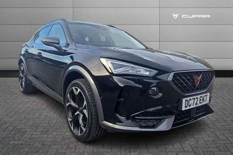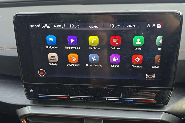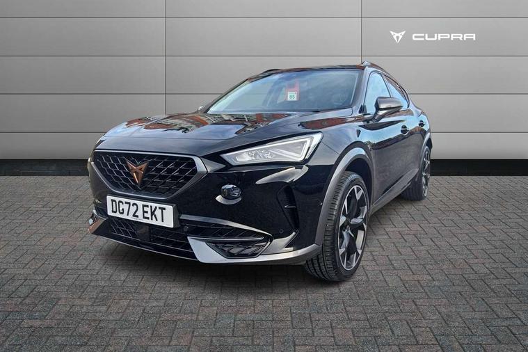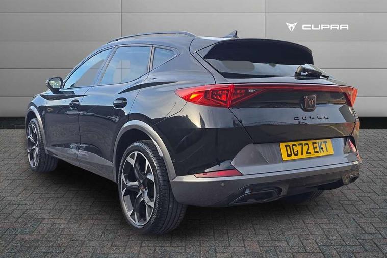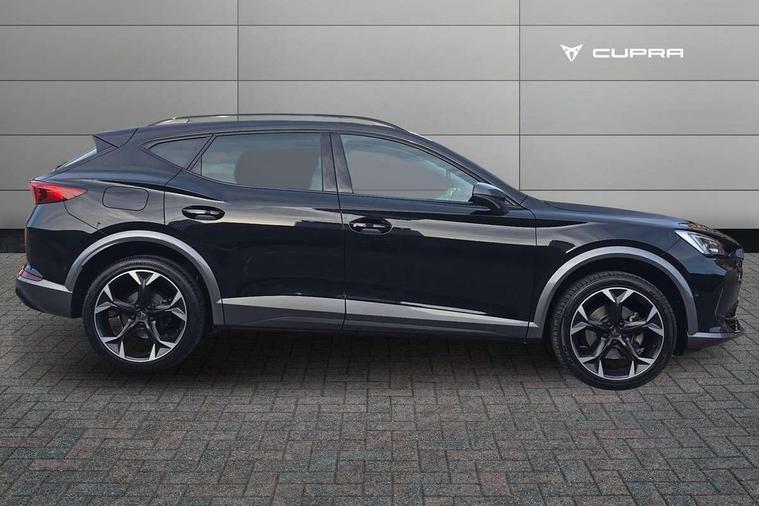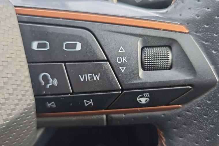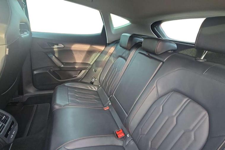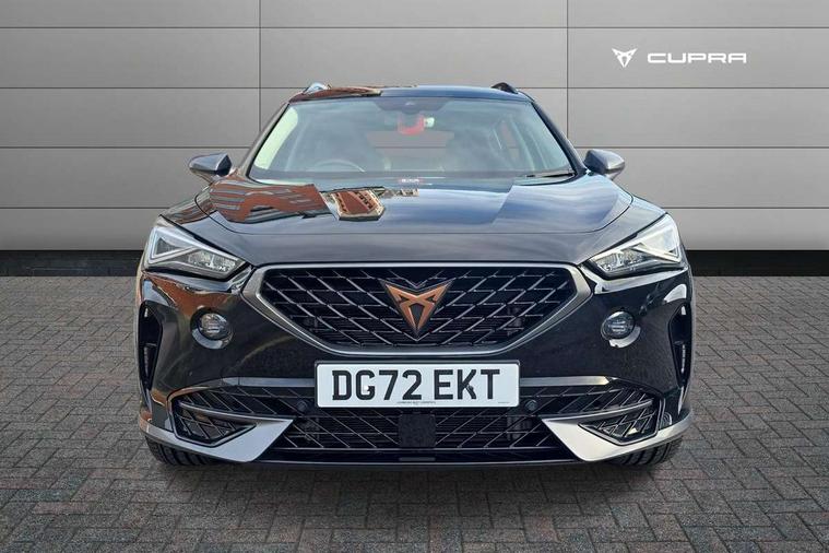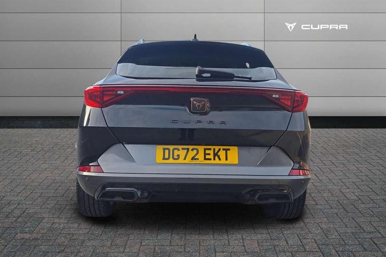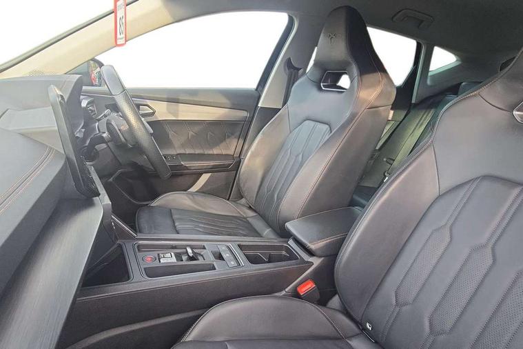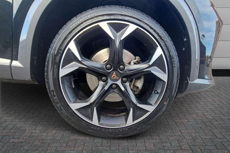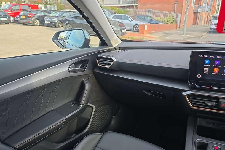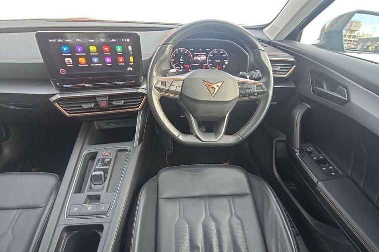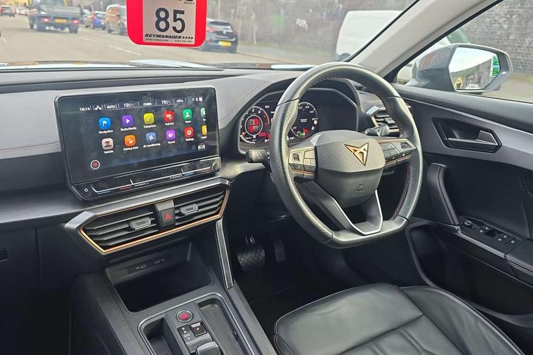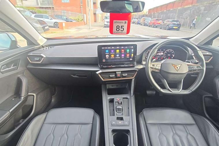 Digital cockpit and configurable dashboard, Driver alert system, Driving profile selection, E-call, Forward collision warning with automatic braking, Lane assist, Navigation system with 12'' Touchscreen Display, Park assist (inc front/rear parking sensors), PAS, Predictive adaptive cruise control with speed limiter, Rear view camera, RPM, trip computer, outside temp gauge, instrument light brightness, low fuel warning light, lights on reminder, gearshift indicator, Service interval indicator, Start/stop system with regenerative braking, Voice control system, Wireless apple carplay, Wireless phone charger, Electronic locking differential and dynamic traction support, Standard suspension, 2 front and 2 rear USB type C sockets, Auxiliary input socket, DAB radio, Auto dimming rear view mirror, Body colour door handles, Body coloured bumpers, Dark grey wing mirror, Daytime running light with automatic headlight control and coming home feature, Dynamic headlight range control, Electric front/rear windows, Electrically adjustable heated and folding door mirrors with memory function, Front fog lamps with cornering function, Gloss black roof rails and window surrounds, LED Headlights, LED Taillights with dynamic indicator, Rain sensing wipers, Rear diffuser with black simulated exhaust pipes, Rear side wing doors, Rear wash/wipe, Third brake light, Tinted rear windows, Welcome lights, 12v power supply in centre console, 12V socket, 12v socket in loadspace, 2 front and 2 rear reading lights, 230V socket, 3 seat bench in 2nd row, 60/40 split rear bench seat with armrest and mechanical seat release, Black headlining, Dust/pollen filter, Front and rear head restraints, Front centre armrest, Height/reach adjust steering wheel, Illuminated interior front door sills, Illuminated sunvisor with mirror, Isofix, Leather multi function heated steering wheel with gear shift paddles, Luggage tie-down hooks, Single front passenger seat, Three zone climate control with control panel in rear, Variable luggage/load compartment floor, Wraparound lighting, Genuine Nappa leather Pack - Cupra, 3 point seatbelts on all rear seats, ABS, Brake control system - ESC and brake booster, Child proof door locks, Driver and front passenger airbags with front passenger airbag de-activation, Electronic parking brake, Front and rear disc brakes, Front side curtain airbags, Hill hold control, Seat belt reminder for front and rear seats, Tyre pressure monitoring system, Anti theft alarm system, Keyless entry and start system (KESSY), Locking wheel bolts, Copper and aluminium interior detailing, 19" 'Exclusive' machined sport matte black and silver alloy wheels,