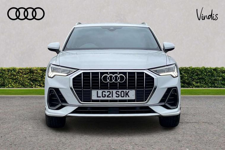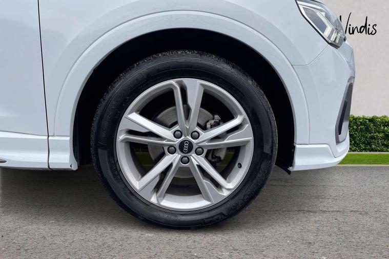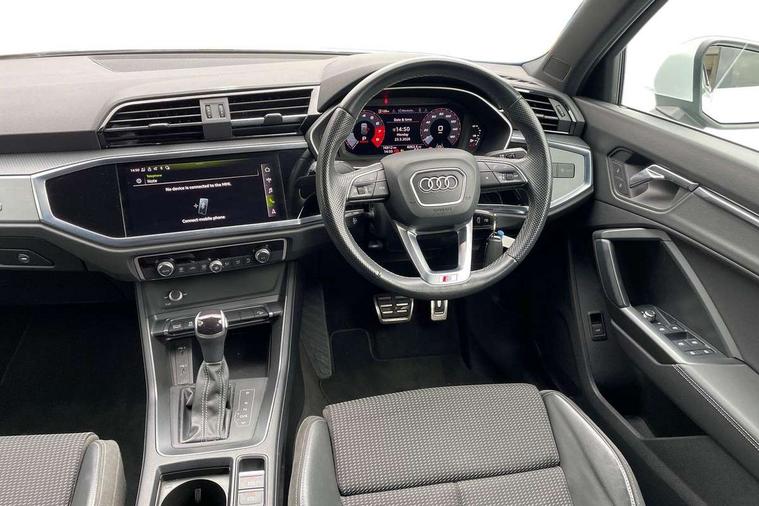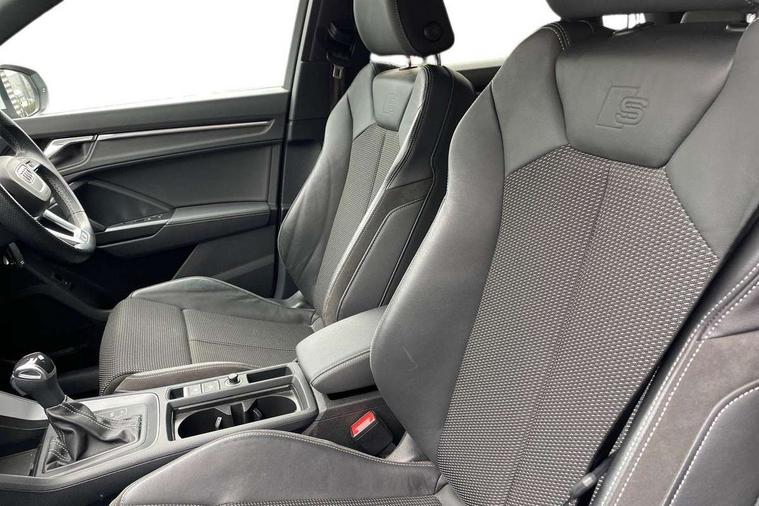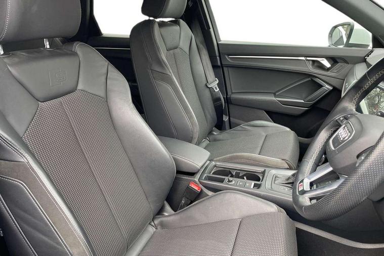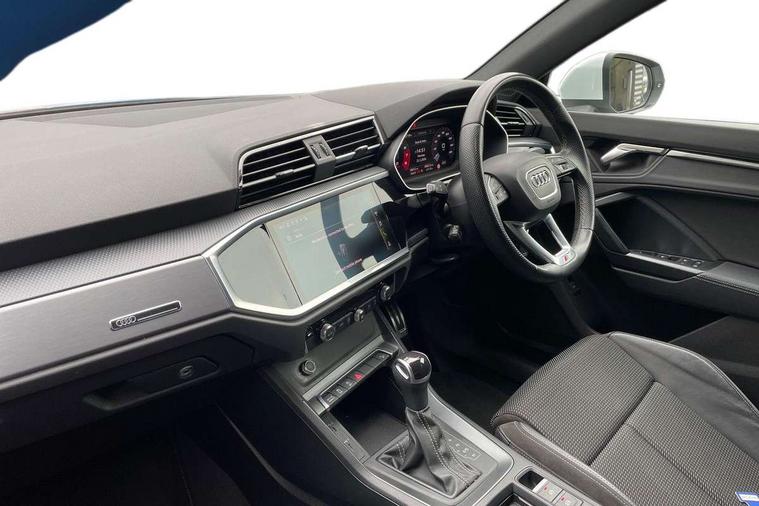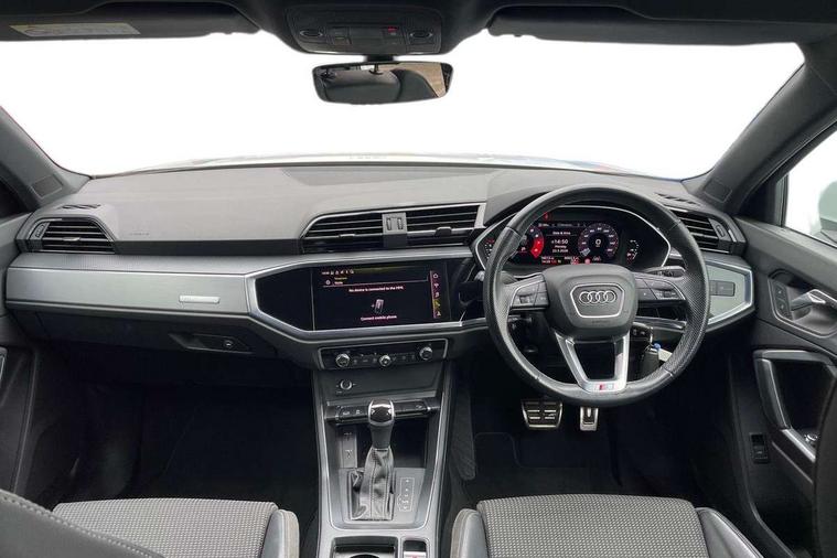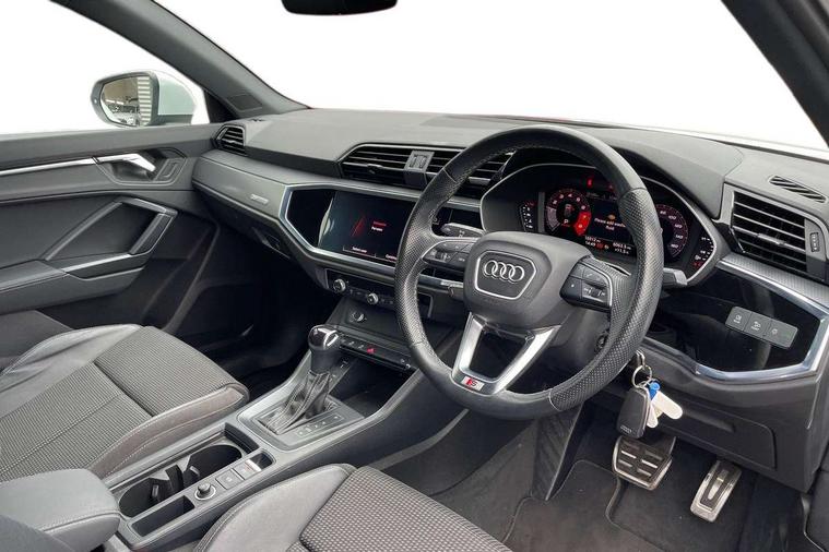 Amazon alexa Integration, Audi connect safety and service (e-call), Audi drive select, Audi lane departure warning, Audi Virtual Cockpit - 10.25" display, Bluetooth interface, Camera based traffic sign recognition, MMI Navigation Plus with high resolution 10.1 inch touchscreen colour display, Power operated tailgate, Progressive steering, Service interval indicator, Smartphone interface includes wireless Apple carplay/Android Auto, Start stop system with recuperation, Voice control system with natural language interaction, 48V Mild hybrid technology, Sports suspension, 2 USB-C ports with charge and data functions, 6 passive loudspeakers, DAB digital radio module, Acoustic windscreen, Aluminium roof rails, Aluminium window trim, Auto dimming frameless rear view mirror, Body coloured bumpers, Electrically folding, adjustable and heated door mirrors with integrated LED side indicators and kerb view function for passenger side, Front and rear electric windows, Front fog lights, Front side air inlets in matt platinum grey, Front spoiler blade in matt platinum grey, Grille vertical bars in aluminium silver/Matt, High gloss black finish B and C pillars, LED headlights with LED daytime running lights and dynamic rear indicator, LED rear lights, Privacy glass dark tinted rear and rear-side windows (from B-pillar backwards), Rain and light sensors, Rear diffuser strip in matt titanium black, S line badges on front wings, S Line front and rear bumpers, Side skirt insert in matt Platinium grey, Silver chrome grille surround, Titanium black radiator grille, 12V socket in rear centre console, 40:20:40 folding with manual adjustment for 60:40 forwards/backwards position and backrest angle, Adjustable rear seat bench/backrest with centre armrest and cupholder, Black cloth headlining, Dual zone electronic climate control, Front and rear black floor mats with contrast stitching in rock grey, Front and rear headrests, Front and rear roof module including reading lights, Front centre armrest, Glove compartment lighting, Height and reach adjustable steering wheel, Illuminated door sill trims with S logo, ISOFIX child seat mounting for front passenger with airbag deactivation and outer rear seat including top tether attachment point for outer rear seats, Luggage compartment light, Manual front seats with height adjustment, Perforated leather gearknob, Stainless steel luggage compartment sill finisher, Stainless steel pedals, Non smoking pack - Q3, 3x3 point rear seatbelts, 6 airbags - Driver, front passenger, curtain and side windows, Audi pre-sense front with pedestrain and cyclist recognition, Electrically operated child locks on rear doors, Electromechanical parking brake, Electronic stabilisation control including ABS, ASR and EDL, Hill descent control, Hill hold assist, Pre sense basic, Seatbelt monitoring, Tyre pressure warning, Warning triangle and first aid kit, Anti theft alarm, Anti theft wheel bolts, Remote central locking, Dark matt brushed aluminium inlay, Detail dashboard around MMI touch colour display in glass look, black with surround in aluminium look, Leatherette door armrest, Tool kit, Tyre repair kit,