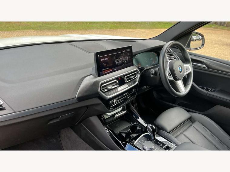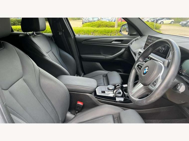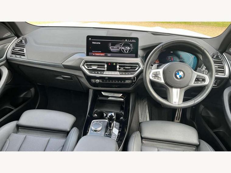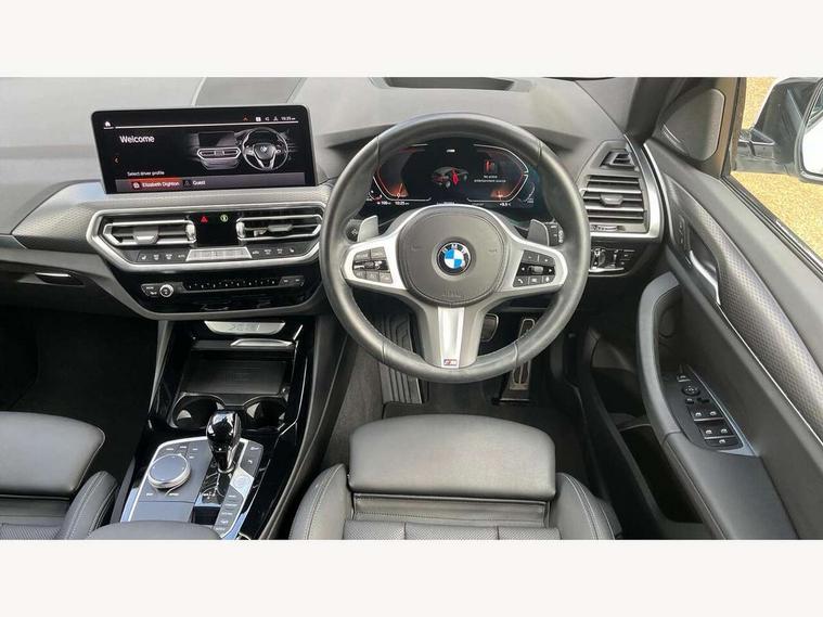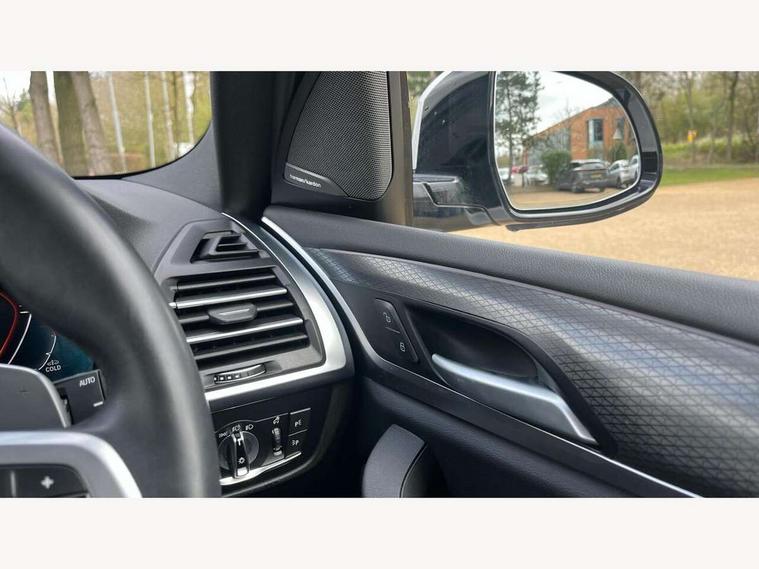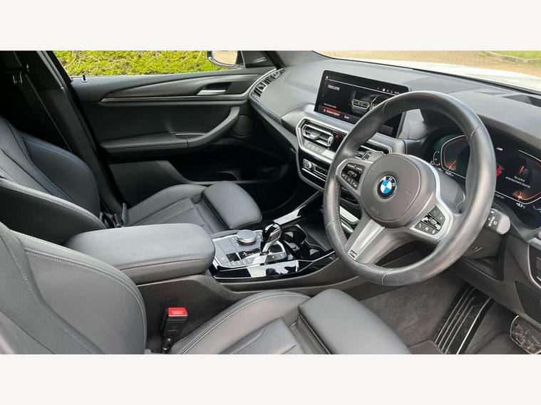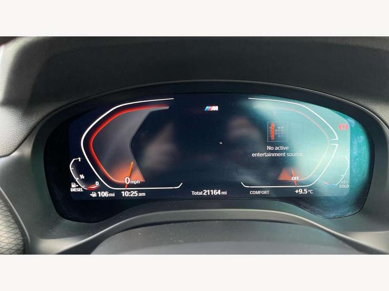 Active Guard, Attentiveness assist, BMW Live Cockpit Professional nav system including 12.3" instrument display + 12.3 high resolution control display, BMW Online services, BMW Teleservices, Brake pad wear indicator in front and rear, Check Control warning system for monitoring of lights and door/luggage compartment open warning, Condition based service - BMW service history, electronic service booklet, integrated owner's handbook, Connected drive services, Electric boot lid, Front/rear Parking distance control, iDrive touch controller with 8 favourite buttons, Instrument cluster with speedometer with mph readout, tachometer, fuel gauge and oil temperature gauge, Lights on warning by audio warning signal when ignition is switched off, Oil sensor for level and grade, warning by check control system, On board computer - average speed+fuel consumption, service interval, clock/date, odometer/trip meter, outside temperature display and ice warning, Optimum shift indicator, Personal Profile - automatic lock when driving away selectable, Run flat indicator, Stop/start system, Variable sports power steering with drive performance control Sport+ mode, Automatic transmission with gearshift paddles, Diesel particulate filter, Incorrect fuelling protection, Larger capacity fuel tank, M sport suspension, Multi-link rear suspension, BMW professional radio/CD/MP3, DAB tuner, Acoustic glazing, Automatic windscreen wipers and automatic headlight, Black finish on B pillars, Body colour door handles, Body colour electric adjust heated aspherical door mirrors, Body colour roof mouldings, Body coloured bumpers, Direction indicator, side repeaters, integrated in exterior mirrors, Dynamic brake lights, Exhaust tailpipes - dual, round, split left and right with chrome finisher, Fingertip control / anti-trap function on electric window, Folding wing mirrors with auto dimming, Follow me home headlights, Front and rear bumper system with replaceable deformation elements, Front and rear electric windows, Gloss chrome tailpipes finishers, Green tinted heat insulating glass, Heated windscreen washer jets, High beam assistant, High gloss black shadow line roof rails, High gloss shadowline exterior trim in decorative moulding side frame/recess cover/guide rail/B, C pillars/mirror frame and triangle with mirror base, High level 3rd brake light incorporating LED Technology, Interior rear view electrochromatic mirror with automatic anti dazzle function, LED tail lights, Lightweight engineering, M aerodynamic bodystyling, M Sport entry door sill strips, Model designation, Rain sensor, Rear side wing doors, Rear wing door, Rear wiper, Shark fin antenna, Side exterior M designation badges, Visible VIN plate, Welcome lighting, Windscreen wipers with adjustable interval, 12V power point in luggage area, 12V power socket in front centre console, 2 x USB Type C ports for charging and data transmission (front centre console) and 2 x USB Type C ports for charging (rear centre console), 3 rear headrests, 3 seat bench in 2nd row, 3 zone automatic air conditioning, 4 lashing points to secure luggage, 40:20:40 split folding rear seat with loading system, Ambient lighting, Anthracite headlining, Automatic interior light when door is opened/ignition switched off or via remote key, Floor mats in velour, Foldable storage floor with compartment, Four grab handles integrated in roof lining, Front and rear bottle holders integrated into door trim storage compartments, Front and rear side armrests integrated into door trim, Front centre armrest with storage compartment, Front footwell lights, Front head restraints, Front passenger seat, Front sports seats, Front/rear courtesy lights with soft on/off dimming, Front/rear reading lights, Heated front seats, Isofix rear child seat preparation, Leather gear knob, Lockable glove compartment, Luggage area underfloor compartment, Luggage compartment lighting, M sport leather steering wheel, Multifunction steering wheel, Parcel shelf removeable and storable under boot floor, Reach and rake adjustable steering column, Rear centre armrest with 2 cupholders, Removable / retractable luggage cover, Slope adjustable rear seats, Storage compartment in rear centre console and front/rear door trims, Sun visors with vanity mirrors and ticket pocket, Toolkit located in luggage compartment, Two front cupholders with removable oddments tray/lid, Connected pro pack - X3, ADB - Automatic Differential Brake, Anti-lock braking system (ABS) with brake assist, Automatic Stability Control (ASC), Battery safety cut-off, BMW emergency call, Brake drying, Brake energy regeneration, Braking pre-tensioning, Child locks on rear doors, Cornering brake control (CBC), Crash Sensor - activation of central locking release, hazard warning light and interior lighting, Deactivation of fuel pump in the event of a crash, Driver and front passenger front and side airbags with passenger deactivation and ITS front and rear head airbags, Driver and front passenger knee airbag, DSC+, Dynamic brake control, Dynamic Traction Control - DTC, Electromechanical parking brake, Hill descent control, Hill start assist, Seatbelt security check for front seats, Side impact protection, Three point seatbelts to all seats with front and outer rear pyrotechnic belt tensioners and seat belt force limiters, Two tone horn, Tyre pressure sensor, Ventilated front and rear disc brakes, Warning triangle and first aid kit, Central locking switch for all doors, fuel filler cap and luggage compartment, Electronic engine immobiliser, Locking wheel nuts, Remote control including two integrated key - one button for open/close all lockable content, windows and separate button for open luggage compartment, Remote control Thatcham category 1 alarm, Start/stop button with Comfort Go keyless engine start and auto Start/stop deactivation button, Low rolling resistance tyres,