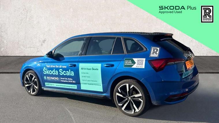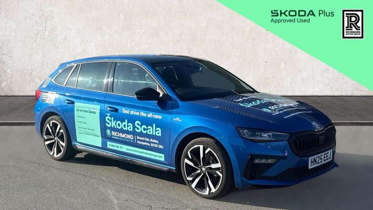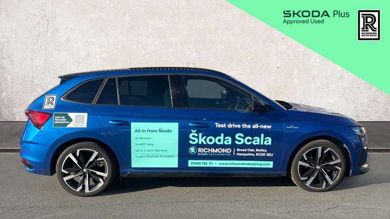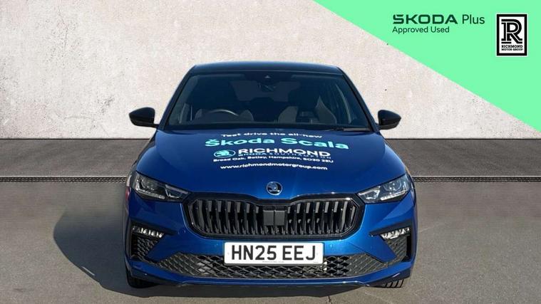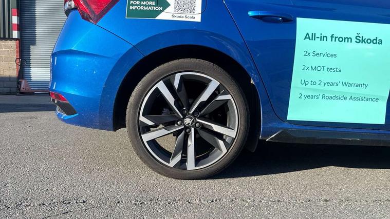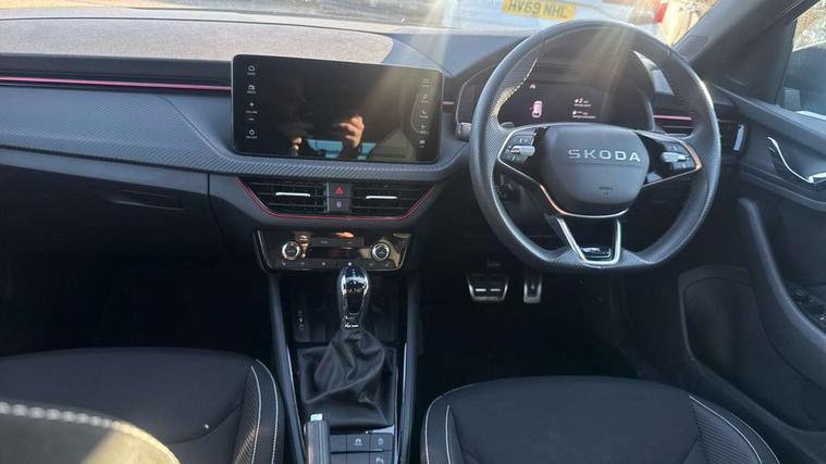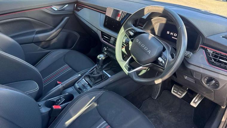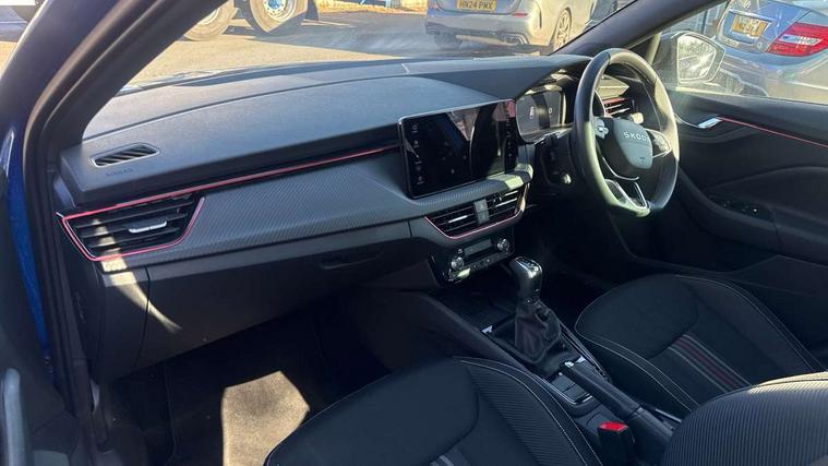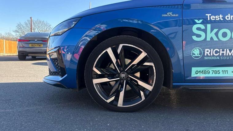 Advanced driver attention and drowsiness monitor, Bluetooth, e-Call (emergency call), Front assist system, PAS, Rear parking sensors, Rear view camera, Speed limiter, Tailgate, Traffic sign recognition, Virtual Cockpit - 10.25" digital display, Voice control system, Wireless smartlink, 4 USB C ports, 8 Speakers, 9.2" Skoda navigation display, DAB radio, Auto dimming rear view mirror, Automatic headlamp activation with Coming home and Leaving home feature, Automatic high/low beam, Automatic intermittent wipers, Black door mirrors, Black lettering on boot lid, Black radiator grille, Black rear diffuser, Black roof spoiler, Body colour bumpers, Body colour door handles, Chrome moulding around grille, Extended tailgate glass, Front and rear electric windows, Heated rear window, LED 3rd brake light, LED brake lights, LED daytime running lights, LED high beam, LED low beam, Light sensors, Monte carlo plaque, Panoramic glass roof, Privacy glass, Rear LED fog light, Rear side wing doors, Rear wiper, Tinted windows, Unique dark chrome design logo on alloy wheels, 12V socket in luggage compartment, 3 seat bench in 2nd row, Aluminium pedals, Ambient lighting in white/red, Black / White armrest stitching, Black ceiling, Black roof headlining, Cargo elements, Chrome inner door handles, Door inserts in art.leather carbon, Driver and passenger sun visors with vanity mirror, Dual zone climate control, Front and rear roof lights, Front centre armrest, Front head restraints, Height adjustable driver seat, Height adjustable passenger seat, Ice scraper, Illuminated glove compartment, Inner circulation control with pollen filter, ISOFIX for front passenger seat, Isofix preparation for back seats, Leather gearknob and handbrake lever, Luggage net under rear parcel shelf, Manual lumbar support for front seats, Monte Carlo cloth upholstery, Net package and top tether hooks in boot space, Pocket on the back of both front seats, incl. mobile phone pockets, Rear centre armrest, Red hotstamping, Single front passenger seat, Skoda lettering on steering wheel, Sport seats, Textile floor mats, Third rear headrest, Ticket holder, Top tether for front passenger seat, Umbrella in driver's door, Light and view plus pack - Scala, 3x3 point rear seatbelts, ABS, Child locks, Curtain airbags and front side airbags, Disc brakes, Driver and front passenger airbags, ESP, Hill hold control, Manual leather parking brake, One tone horn, Passenger airbag switch off function, Seatbelt reminder for driver and front passenger, Tyre pressure monitoring system, Anti theft alarm system with interior monitoring, backup horn and towing protection, Anti-theft wheel bolts, Remote central locking with 2 remote folding keys, SAFE function for remote central locking, Carbon effect decorative inserts, 18" Ursa black diamond cut alloy wheels,