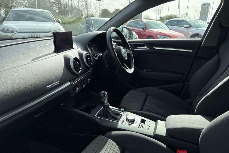 Audi connect, Audi drive select, Audi smartphone interface, Colour driver's information system display, Electro-mechanical PAS, HDD satellite navigation system radio single CD/DVD player MMI control system, Mobile telephone preparation - bluetooth interface, Service interval indicator, Speed limit display, Voice control system, 2 USB ports, Audi music interface, Auxiliary input socket, CD player, DAB Digital radio, MMI radio plus with 7" colour MMI screen and MMI controller, Aluminium window trim, Auto dimming rear view mirror with light and rain sensors, Body colour bumpers, Body colour door mirrors with integral indicators, Body colour roof spoiler, Chrome exhaust tailpipes, Electric front windows, Electric operated/heated door mirrors, Electric rear windows, Heated windscreen washer jets, LED daytime running lights, Matt black radiator grille, Rear wiper, Sport specific side air inlet grille and diffuser insert, Xenon headlights, 3 adjustable rear headrests, 4 lashing points to secure luggage, Adjustable front armrest, Aluminium door sill trims, Dual zone electronic climate control, Front and rear interior lights with delay, Front passenger seat isofix location point, Front sports seats, Front/rear floor mats, Height/depth adjustable steering column, Illuminated glovebox, ISOFIX child seat preparation+airbag deactivation, Jack and tool kit, Rock grey headlining, Steering wheel gearshift paddles, Storage compartment in centre console, Storage compartment under front seats, Storage compartments in doors, Non smoking pack - A3, 3 point seatbelts on all seats, ABS/EBD, Active bonnet, Active front headrests, ASR, Curtain airbags, Driver and passenger side airbags, Driver/Front Passenger airbags, Drivers knee airbag, EDL, Electromechanical parking brake, ESC - Electronic Stability Control + traction control, Front passenger airbag deactivation, Manual rear child locks, Multi-Collision braking, Seatbelt warning, Tyre pressure warning, Warning triangle and first aid kit, Anti theft alarm, Anti-theft wheel bolts, Remote control central locking, Thatcham category 1 alarm + immobiliser, Aluminium air vent surrounds, Aluminium mistral silver inlay, Aluminium trim elements, 17" 5 Arm design alloy wheels, Space saver spare wheel,