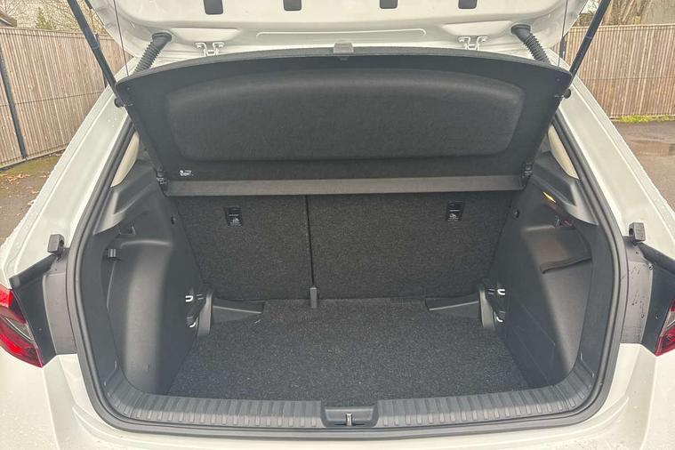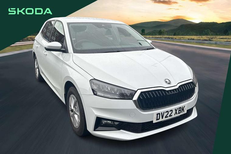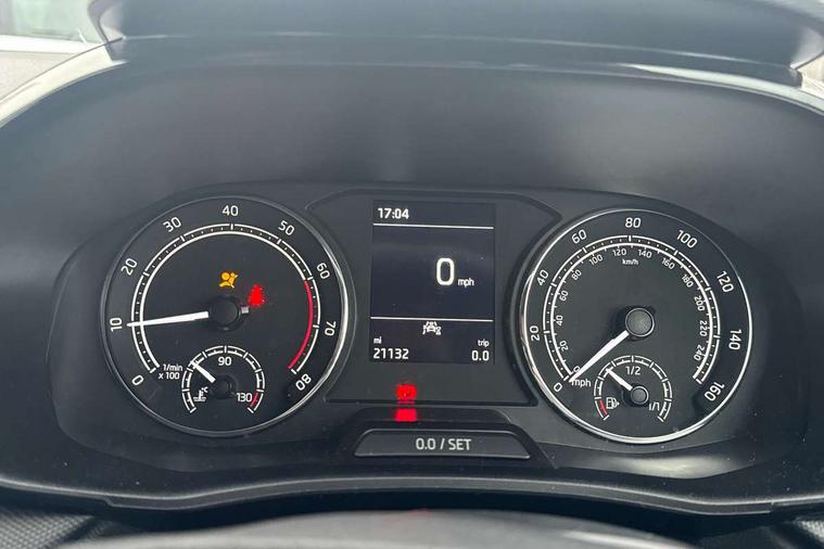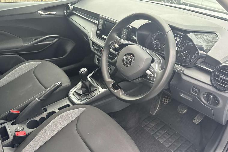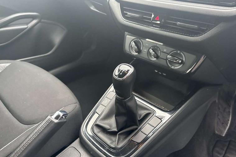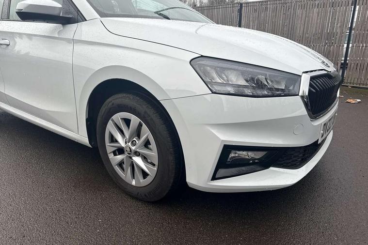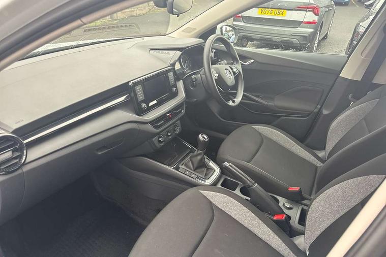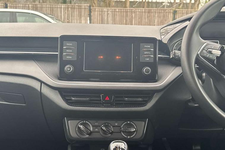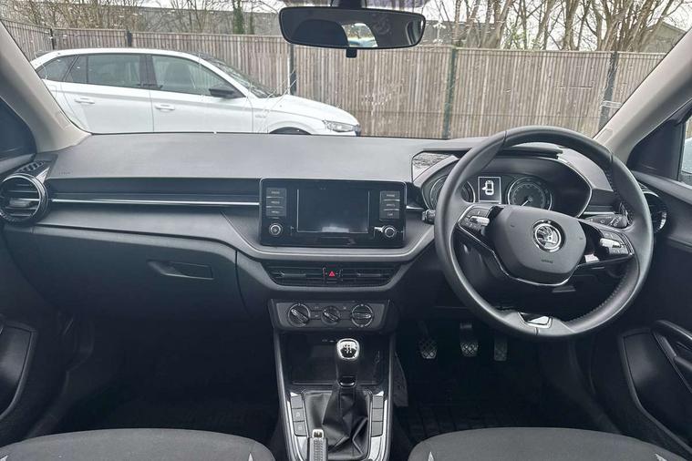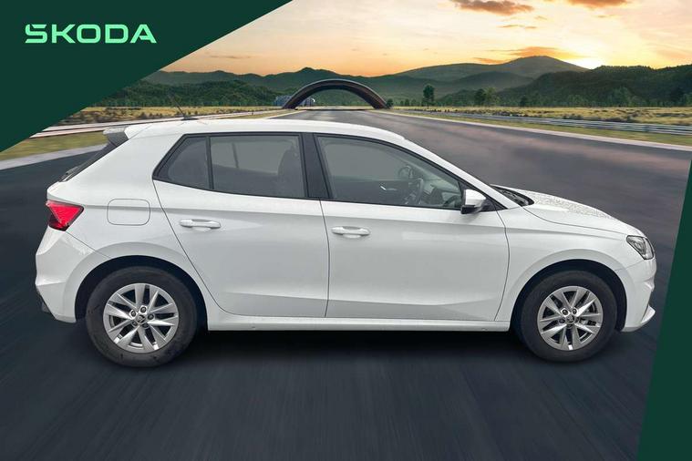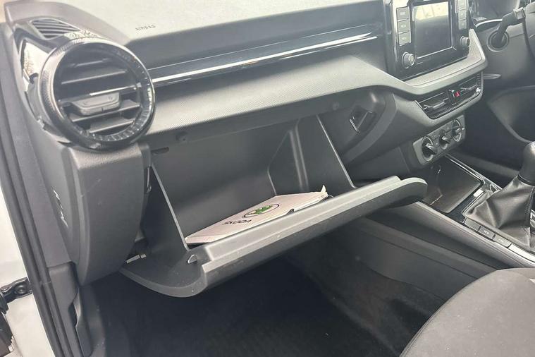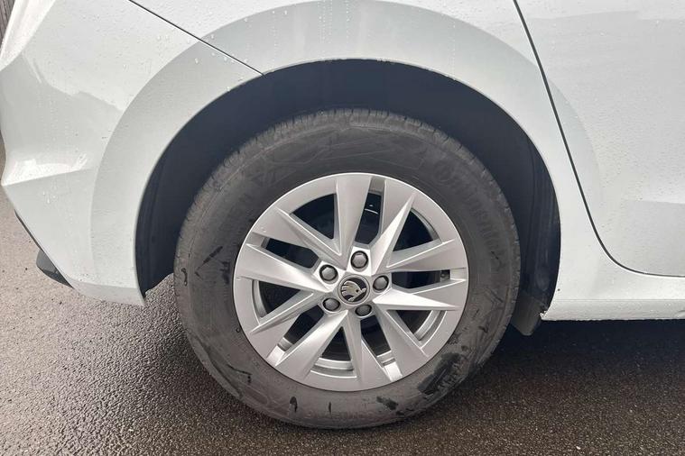 Bluetooth connection, Driver alert system - DAS, Electromechanical power steering, Exterior temperature gauge, Lane assist including road edge detection, Multifunction trip computer in black and white, Service interval indicator, Speed limiter, 2x USB-C in the front (for data transmission and charging), 4 speakers in front, Auxiliary socket for external MP3 player, DAB digital radio reception, Radio Swing with 6.5" colour display, Basic LED Headlights, Basic rear lights, Body colour door mirrors, Body coloured bumpers, Dimming rear view mirror with black frame, Door mirror integrated indicators, Electrically adjustable and heated door mirrors, Electrically adjustable front windows with function auto up/down, Front fog lights, Front window wiper intermittent control, Headlight range control - Automatic, Ice scraper in fuel cap, LED daytime running lights with coming and leaving home feature, Mechanical adjustable rear windows, Rain sensor, Rear LED fog light, Rear side wing doors, Rear window wiper with washing nozzles, Roof mounted spoiler, SKODA tailgate lettering in chrome, Third brake light, 2 reading lights in front and 2 reading lights in rear, 2 spoke leather multifunction steering wheel, 3 rear headrests, Backrest split and folding, Central console with fixed cup holder and storage box, Chrome handbrake release button, Fabric upholstery, Gearshift knob/handle in leather, Grain satin black interior door handles, Hand brake lever handle in leather, Height adjustable front headrests, Height adjustable front seats, Height adjustable steering wheel, ISOFIX and TopTether anchorage points to the outer rear seats, ISOFIX and TopTether on the front passenger seat, Luggage compartment lighting, Manual air conditioning, Manually adjustable lumbar support in front seats, Pollen filter, Rear seat bench unsplit, Single front passenger seat, Storm grey headlining, Sun visors with mirror and airbag label on passenger side, Ticket holder, 3-point height adjustable front seats belts with pretensioner and force limiter, Automatic warning lights in case of crash, Driver and passengers airbag with switch off function, e-Call+, ESC including ABS, MSR, ASR, EDS, HBA and XDS, Front and rear seat belt warning, FRONT ASSIST (AEB City and AEB Inter Urban), Front side airbags, Head airbags, One tone horn, Pedestrian protection, Three rear 3-points safety seat belts with pretensioner and force limiter including stop function for outer rear seat belts, Tyre pressure monitoring system, Anti-theft alarm system including immobiliser, interior monitoring, backup horn, and towing protection, Central locking with radio remote control, interior controls, SAFE function and 2 foldable keys, Black painted air vents, Glossy black decorative trim, Grain satin black central console cover, Grain satin black lower decorative trim, Satin black door and side trim panel in front, Anti-theft wheel bolts protection, Super-low rolling resistance tyres,