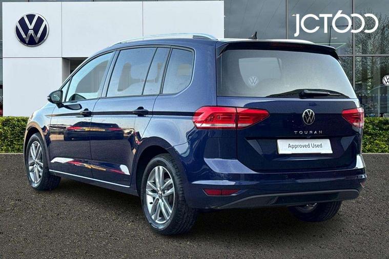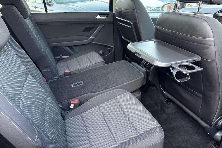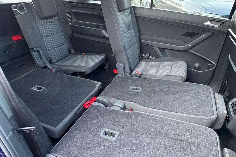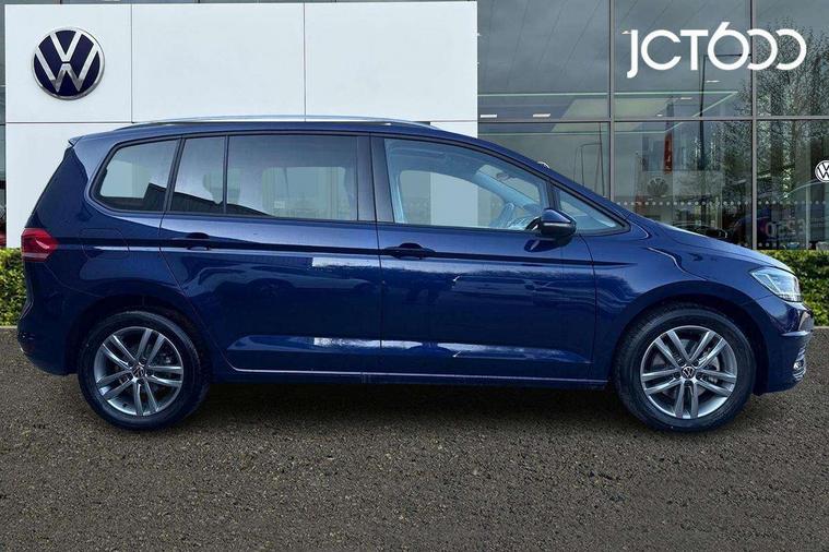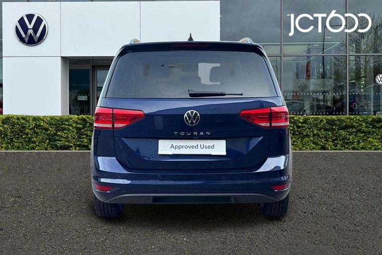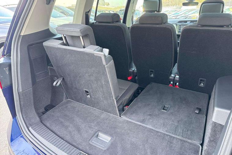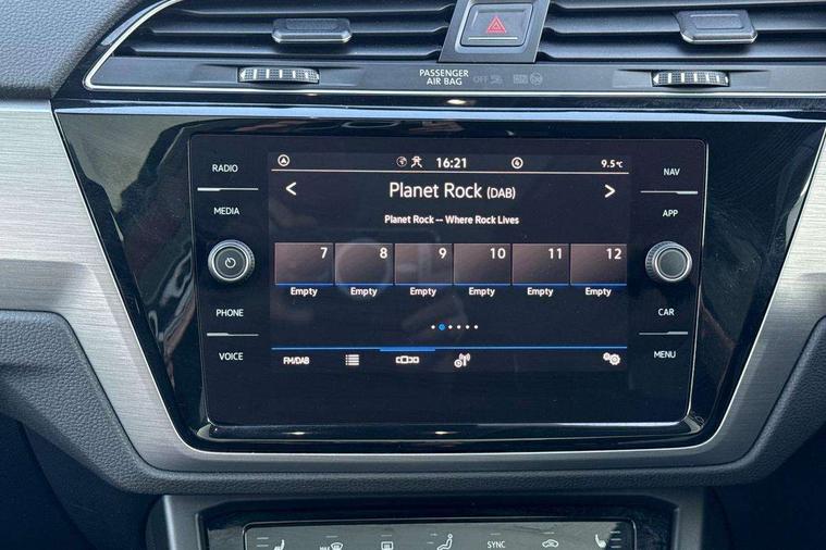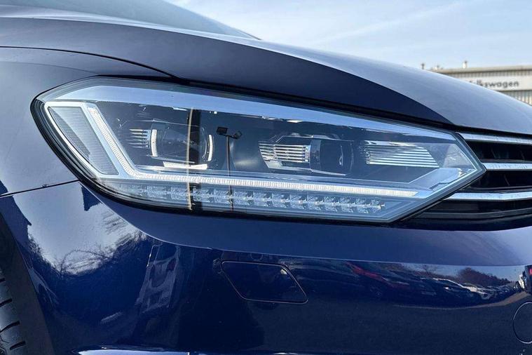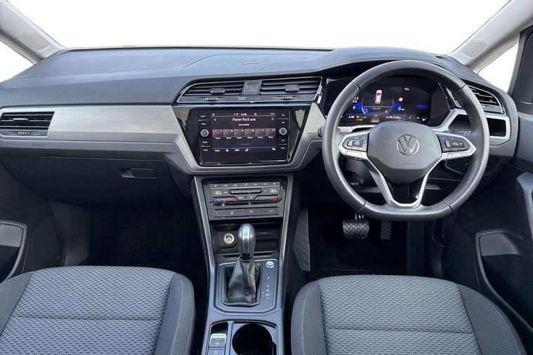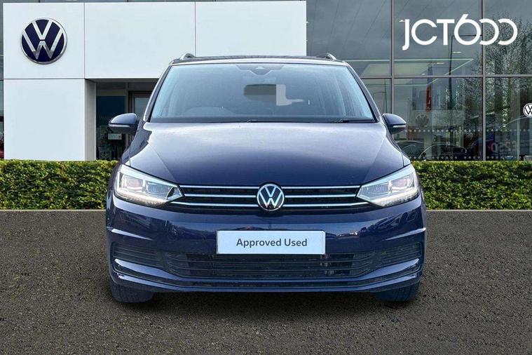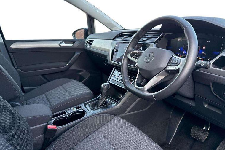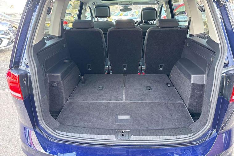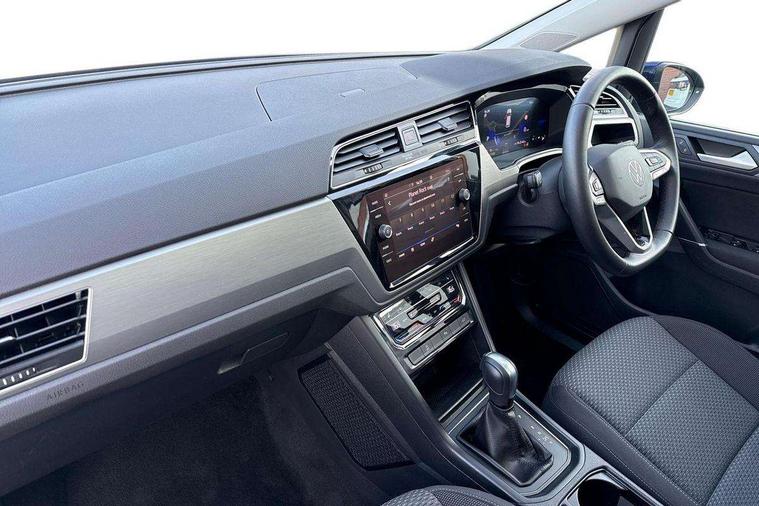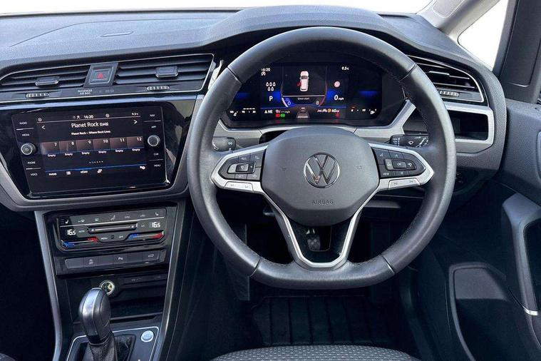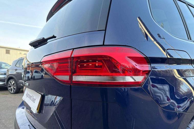 Adaptive cruise control, Audible lights on warning, Discover media navigation touchscreen navigation/radio system with streaming and internet, Driver alert system, Driver profile selection, Dynamic road sign display, Electric tailgate, Electronic odometer, Emergency services call system, Extended, crash-active and proactive Pedestrian and cyclist monitoring, External temperature gauge, Front parking sensors, Lane change system side assist and rear traffic alert, Lane keep assist, Misfuelling protection device, Mobile pairing with SMS function, Mobile phone interface with inductive charging, Rear view camera displayed via vehicles audio system display, Rev counter with fuel gauge, Side scan, Speed limiter, Speed sensitive power steering, Stop/start system, Think blue trainer driver tips and journey analysis, Trip and service interval display, We connect' and 'We connect plus' functionality, Petrol Particulate Filter, Rear stabiliser bar, XDS electronic differential lock, 4x20 watt output, 8 Speakers, Audio Connectivity System, DAB Digital radio, External USB-C data socket with increased charging performance - 2 USB sockets 45W, MP3/WMA compatability, SD card slot, Title and cover art display, USB connection, Aerial integrated into side window, Auto dimming door mirrors, on driver side, surround lighting and front passenger side mirror lowering function, Auto dimming rear view mirror, Automatic coming/leaving home lighting function, Body colour bumpers, Body colour door handles, Body colour door mirrors with integral indicators, Door mirrors with memory function, Dusk sensor + auto driving lights, Electric folding door mirrors, Electric heated + adjustable door mirrors, Electric, glass sliding/tilting panoramic sunroof including integrated roller blind and LED lighting around aperture, Front and rear electric windows, Fully galvanised body, Gloss black finish B pillar, Green tinted heat insulating glass, High level third brake light, Rain sensor, Rear fog lights, Rear side wing doors, Rear tinted glass from B-pillar backwards approx 65% tinted, Rear wash/wipe with intermittent wipe setting, Removable engine badge, Silver roof rails, Tailgate wiper- reverse gear activation, Twin chrome exhaust tailpipes, Volkswagen roundel, Windscreen wipers intermittent wipe, 12V power point for Row 2, 12V socket in luggage compartment, 2 individual fold flat 3rd row seats, 2 three point seatbelts in 3rd row, 2nd row centre armrest, 2nd row centre seat converts into table, 3 single slide/fold/removable 2nd row seats, 3 spoke steering wheel, 3x3 point seatbelts on 2nd row with height adjust on outer seats, 4 boot load lashing points, 4 way adjustable front head restraints, 5 headrests, Activated charcoal canister for intensified evaporation system, Air care climatronic 3 zone air conditioning system with rear air conditioning control panel, Chrome plated radiator grille inserts, air vent surrounds and light switch surrounds, Driver and front passenger under seat drawer, Dust/pollen filters, Foldable front passenger seat backrest with load through function, Front and rear reading lights X 2, Front centre armrest with storage compartment, Front comfort seats with lumbar support, Front cupholders x 2, Front passenger seat height adjust, Front seat storage pockets, Front seatback folding tables, Height adjustable driver's seat, Height/reach adjust steering wheel, Illuminated glovebox, Instrument lighting white adjustable panel illumination with red night time illumination, Interior light with delay, Isofix on 2nd row outer seats, Isofix on 3rd row seats, Large storage compartment in roof console, Lasano cloth upholstery, Leather multifunction steering wheel with gear knob, Leatherette on rear of front seats, Low tunnel 2nd row seat, Luggage compartment lighting, Media box in dashboard on passenger side, Multi storage in passenger/luggage areas, Multi-function centre console with storage facilities, Retractable luggage cover, Split folding rear seat backrests, Storage bins on all doors, Sun visors with illuminated vanity mirrors, Family Pack - Touran, Winter pack without heated washer jet - Touran, 3 point height adjustable front seatbelts, Auto hold function, Automatic post collision braking system, Door open warning reflectors, Driver/Front Passenger airbags, Drivers knee airbag, EDL + ASR, Electronic parking brake, Energy recovery system, ESC with ABS, First aid kit, Front and rear (row 2) curtain airbags, Front assist with autonomous emergency braking, Front seat side impact airbags, Front seatbelt pretensioners, Front/rear disc brakes, Hill hold control, Hydraulic Brake Assist (HBA), Loose wheel warning function, Manual passenger airbag deactivation function, Pre crash preventive occupant protection, Proactive passenger protection system with front and side assist, Rear child proof door locks, Road sign recognition, Seatbelt warning lamp and buzzer, Traction control, Two tone horn, Warning triangle, Alarm with remote central locking and interior protection, Electronic engine immobiliser, Keyless Access Keyless locking and starting system with SAFELOCK, New brushed design decorative inserts in dash and front doors, 17" Salvador alloy wheels with anti-theft wheel bolts, 215/55 R17 self sealing tyres with low rolling resistance,