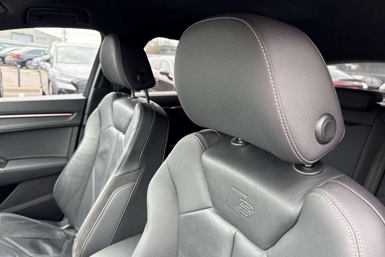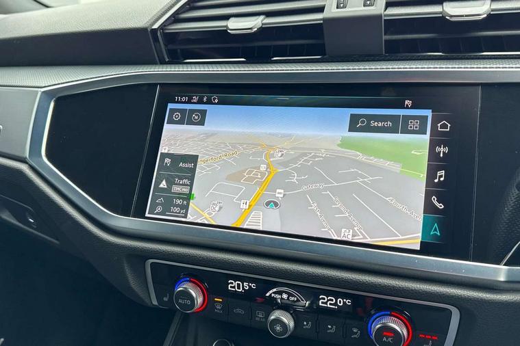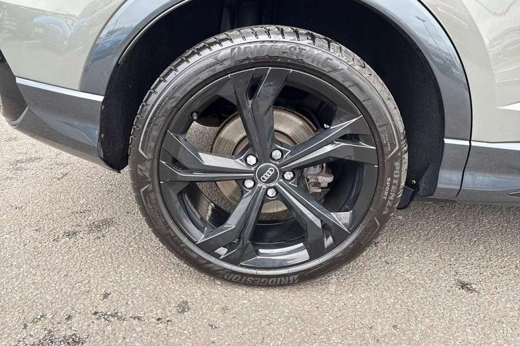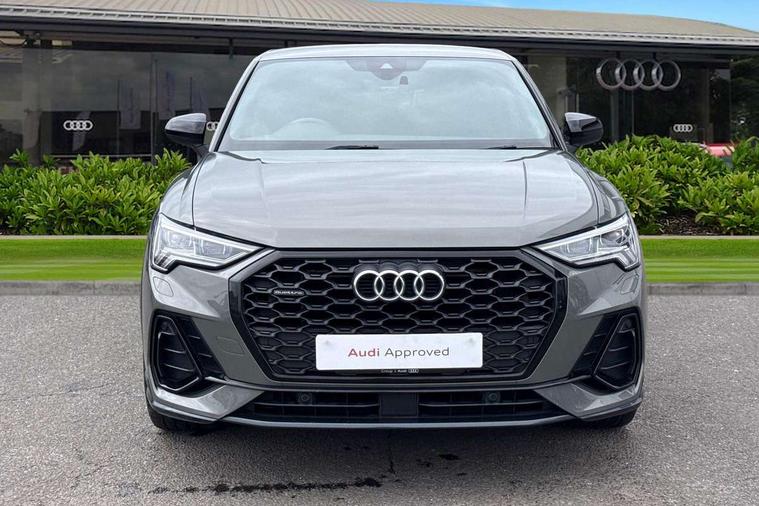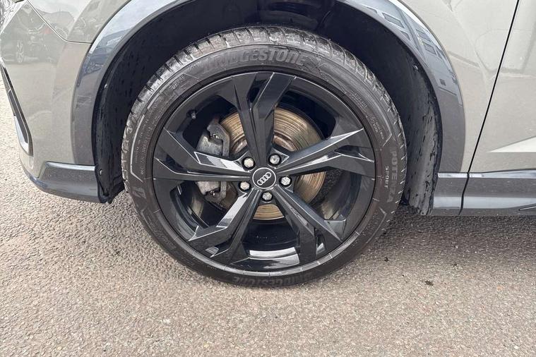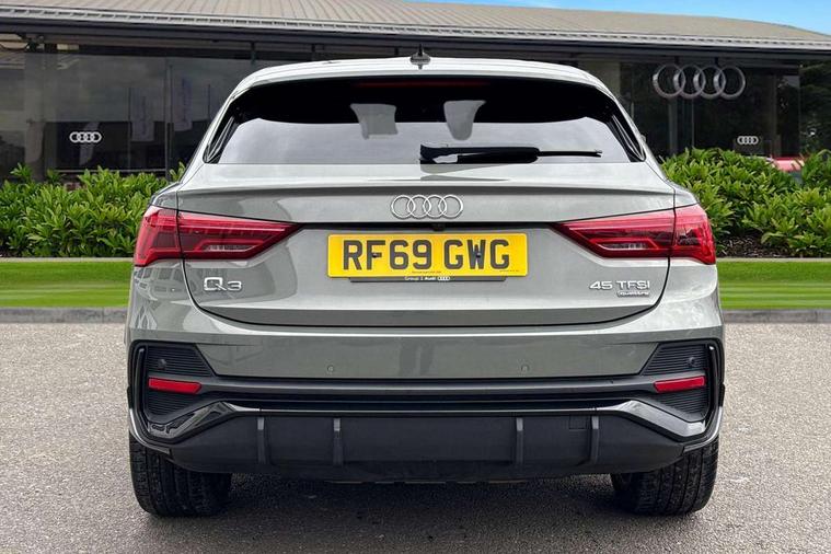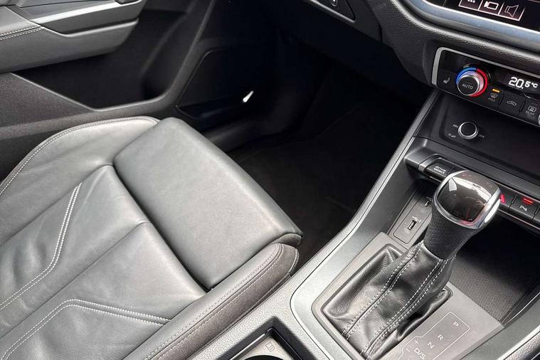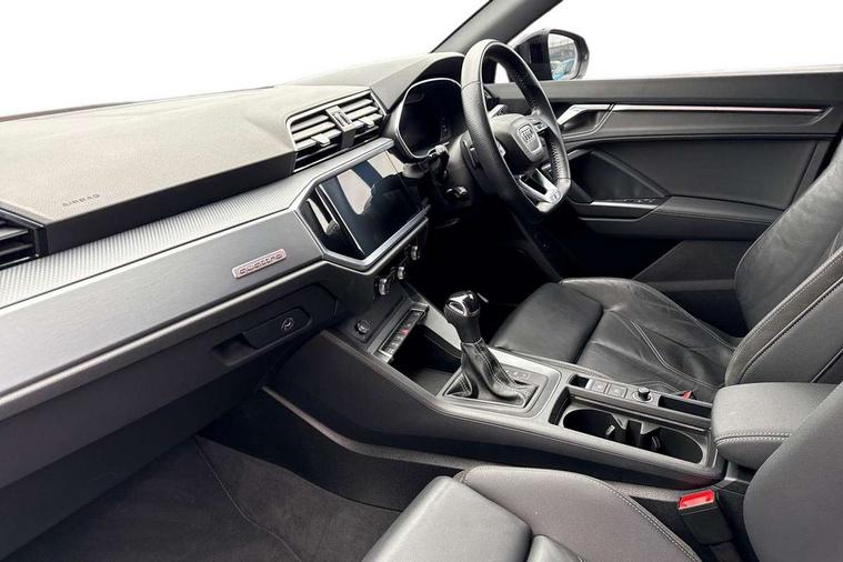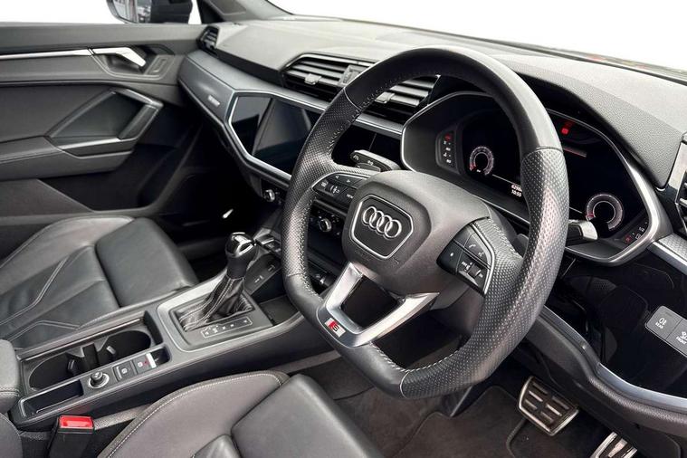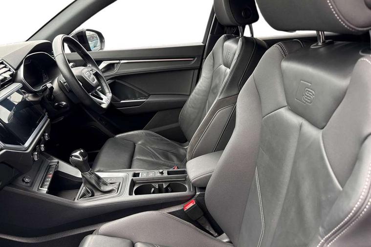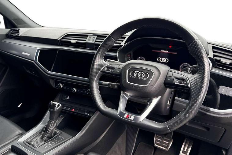 Audi connect safety and service (e-call), Audi drive select, Audi lane departure warning, Audi side assist, Audi smartphone interface, Audi virtual cockpit plus, Bluetooth interface, Camera based traffic sign recognition, MMI Navigation Plus with high resolution 10.1 inch touchscreen colour display, Power operated tailgate, Progressive steering, Service interval indicator, Start stop system with recuperation, Voice control system with natural language interaction, Sports suspension, 1 x USB type C and 1 USB type A charging points, 6 passive loudspeakers, DAB digital radio module, Acoustic windscreen, Audi Beam uses LEDs to project the Audi Sport logo, Auto dimming frameless rear view mirror, Diffuser grille in grained matt black, Diffuser trim in selenite silver, Electrically folding, adjustable and heated door mirrors with integrated LED side indicators and kerb view function for passenger side, Front and rear electric windows, Front fog lights, Front underbody protection in manhattan grey paint finish, Headlight washers, High gloss black finish B and C pillars, Matrix LED headlights with LED rear lights and dynamic front and rear indicator, Privacy glass dark tinted rear and rear-side windows (from B-pillar backwards), Rain and light sensors, Rear underbody protection in matt black, 12V socket in rear centre console, 3 spoke flat bottomed high multi-function leather sport steering wheel with gearshift paddles, 4 way electric lumbar support for driver and front passenger, 40:20:40 folding with manual adjustment for 60:40 forwards/backwards position and backrest angle, Adjustable rear seat bench/backrest with centre armrest and cupholder, Black cloth headlining, Dual zone climate control, Electrically adjustable front seats, Front and rear black floor mats with contrast stitching, Front and rear headrests, Front and rear roof module including reading lights, Front centre armrest, Glove compartment lighting, Heated front seats, Illuminated door sill trims with S logo, ISOFIX child seat mounting and Top Tether with front passenger airbag deactivation, Luggage compartment light, Perforated leather gearknob, Stainless steel luggage compartment sill finisher, Stainless steel pedals, Black styling pack - Q3, Multi coloured extended ambient interior lighting pack - Q3, Non smoking pack - Q3, 3x3 point rear seatbelts, 6 airbags - Driver, front passenger, curtain and side windows, Audi pre-sense front with pedestrain and cyclist recognition, Electrically operated child locks on rear doors, Electromechanical parking brake, Electronic stabilisation control including ABS, ASR and EDL, Hill descent control, Hill hold assist, Pre sense basic, Seatbelt monitoring, Tyre pressure warning, Warning triangle and first aid kit, Anti theft alarm, Anti theft wheel bolts, Remote central locking, Dark matt brushed aluminium inlay, Detail dashboard around MMI touch colour display in glass look, black with surround in aluminium look, Leatherette door armrest,