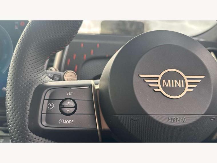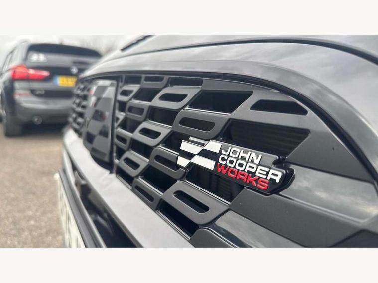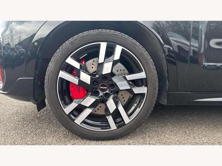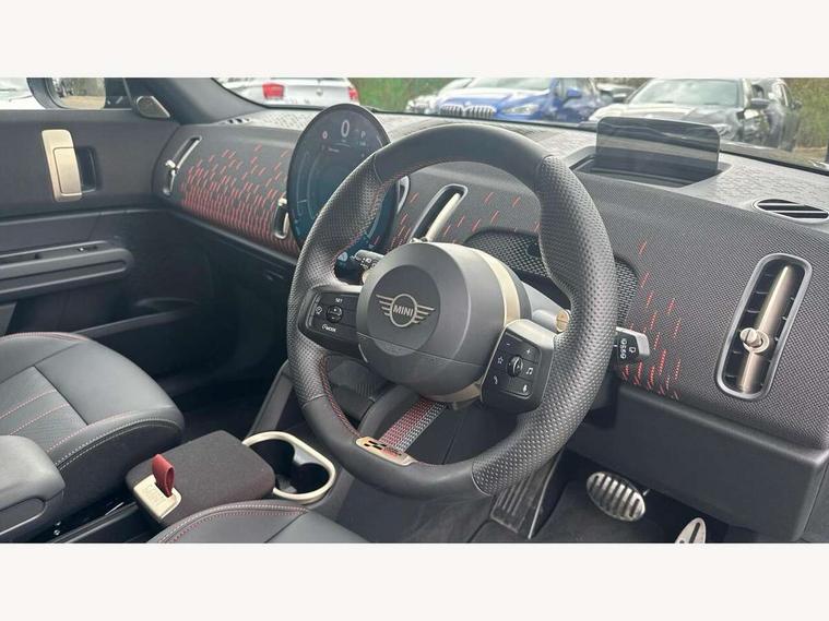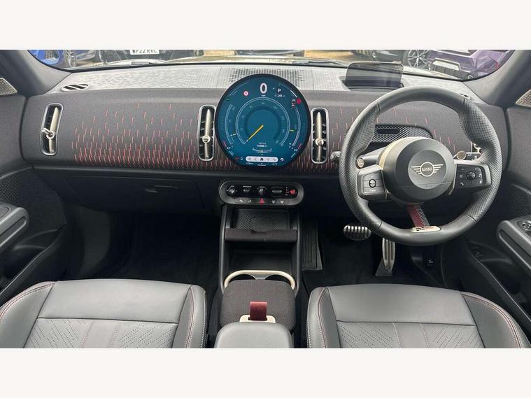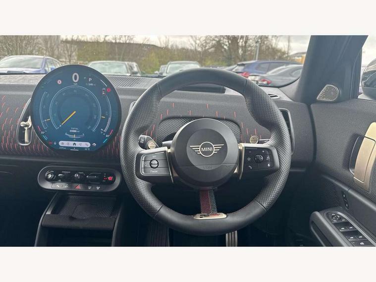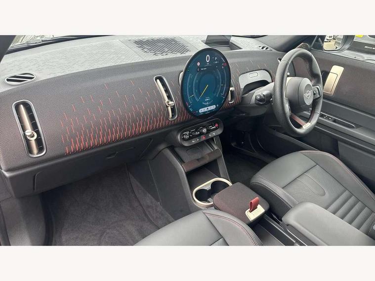 Bluetooth connection, Circular OLED Screen, Compatible mobile phone bluetooth with audio streaming, Cruise Control (DCC), Digital dashboard display, Driving assistant, Driving Assistant Plus Preparation, E-call, Electro-mechanical speed dependant steering assistance, MINI Experience Modes, MINI Head up display, Mini navigation system, MINI TeleServices, Parking assistant in camera and ultrasound based assistance system, rear view camera, parking aid and distance control, Adaptive suspension, Double clutch sports transmission, Larger capacity fuel tank, Quad exhaust system, DAB Digital radio, Harman Kardon surround sound system, Personal eSim, Auto tailgate, Electric adjustable heated door mirrors, Front and rear apron, Front and rear electric windows, Heated rear window, High beam assistant, High gloss hexagonal patterned grille surround, Interior rear-view mirror with automatic anti-dazzle function, LED daytime running lights, LED headlights with extended contents including Adaptable light signatures, LED rear lights, LED third brake light, Rain sensor with auto headlights, Rear roof spoiler with airblades, Rear side wing doors, Rear window wiper, Roof rails, 3 seat bench in 2nd row, 60/40 split rear bench seat, Anthracite headliner, Auto air conditioning, Driver and front passenger seat heating, Floor mats, Front armrest, Front headrests, Heated steering wheel, Height and length steering column adjustment, JCW Front sports seats, Lidded storage box in Black/Red knit, Luggage compartment separating net, Perforated Vescin steering wheel, Rear headrests, Seat adjustment for rear seats, Single front passenger seat, Sunvisors with vanity mirrors, Wireless charging tray, Interior and exterior mirror package - Mini Countryman, 3x3 point rear seat belts, 6 Airbags - front, side, head and seat belt tensioners, ABS, DSC - Dynamic Stability Control, Electronic handbrake, Electronic Stability Programme (ESP), Front ISOFIX (iSize), Hill descent control, Hill hold assist, Hill start assist, JCW logo in brake calipers, JCW Sport brakes with Chilli Red calipers, Manual rear child locks, Traction control, Tyre pressure monitoring system, Warning triangle, Alarm system with tilt sensor, monitoring doors, bonnet interior and tailgate, Auto drive away locking, Comfort access system, Deadlocking function, Electronic vehicle immobiliser, Locking wheel bolts, Remote control locking, Start/stop toggle with keyless go, 19" JCW Runway Spoke Black alloy wheels, Tyre repair kit plus,
