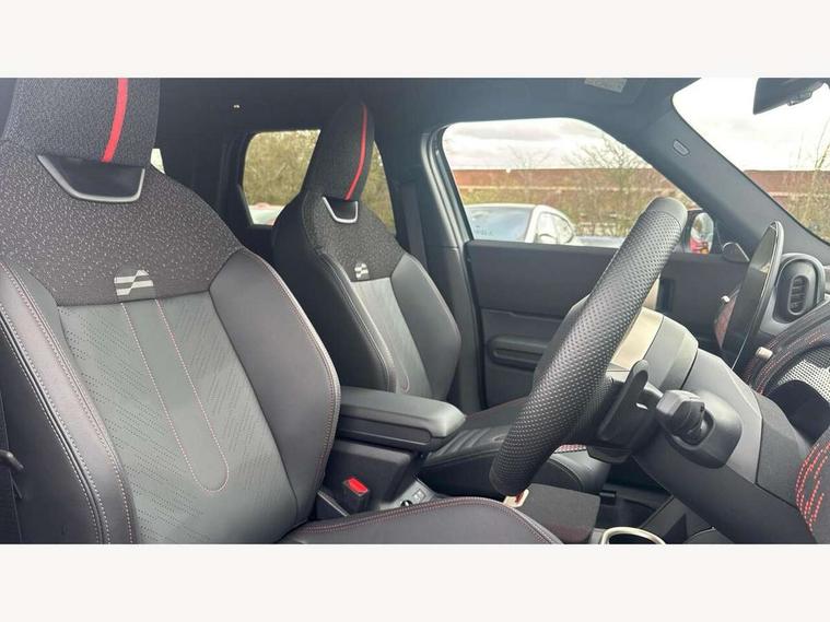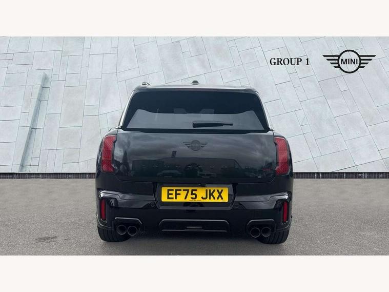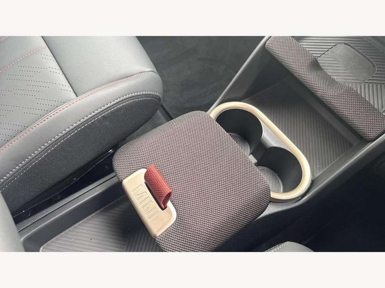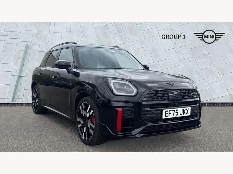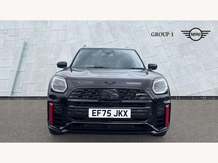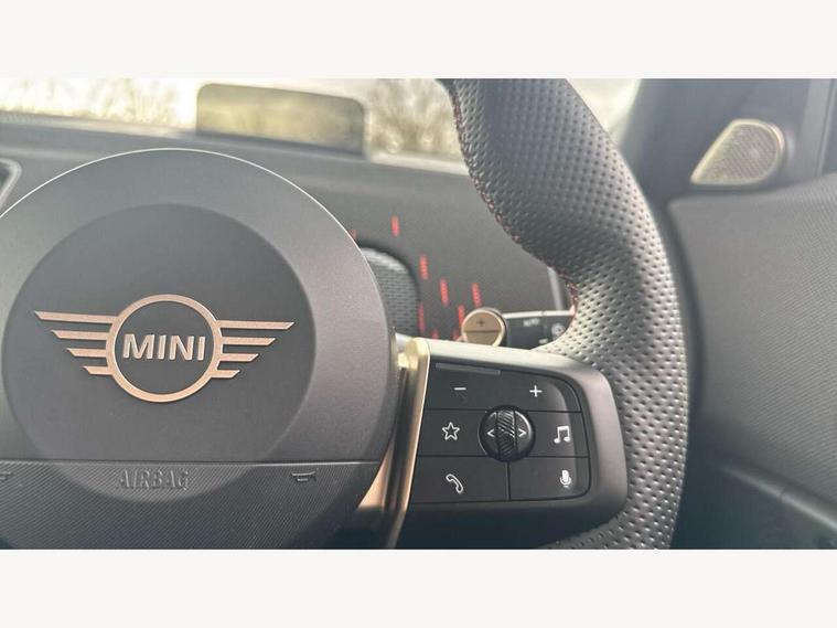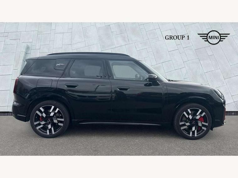 Bluetooth connection, Circular OLED Screen, Compatible mobile phone bluetooth with audio streaming, Cruise Control (DCC), Digital dashboard display, Driving assistant, Driving Assistant Plus Preparation, E-call, Electro-mechanical speed dependant steering assistance, MINI Experience Modes, MINI Head up display, Mini navigation system, MINI TeleServices, Parking assistant in camera and ultrasound based assistance system, rear view camera, parking aid and distance control, Adaptive suspension, Double clutch sports transmission, Larger capacity fuel tank, Quad exhaust system, DAB Digital radio, Harman Kardon surround sound system, Personal eSim, Auto tailgate, Electric adjustable heated door mirrors, Front and rear apron, Front and rear electric windows, Heated rear window, High beam assistant, High gloss hexagonal patterned grille surround, Interior rear-view mirror with automatic anti-dazzle function, LED daytime running lights, LED headlights with extended contents including Adaptable light signatures, LED rear lights, LED third brake light, Rain sensor with auto headlights, Rear roof spoiler with airblades, Rear side wing doors, Rear window wiper, Roof rails, 3 seat bench in 2nd row, 60/40 split rear bench seat, Anthracite headliner, Auto air conditioning, Driver and front passenger seat heating, Floor mats, Front armrest, Front headrests, Heated steering wheel, Height and length steering column adjustment, JCW Front sports seats, Lidded storage box in Black/Red knit, Luggage compartment separating net, Perforated Vescin steering wheel, Rear headrests, Seat adjustment for rear seats, Single front passenger seat, Sunvisors with vanity mirrors, Wireless charging tray, Interior and exterior mirror package - Mini Countryman, 3x3 point rear seat belts, 6 Airbags - front, side, head and seat belt tensioners, ABS, DSC - Dynamic Stability Control, Electronic handbrake, Electronic Stability Programme (ESP), Front ISOFIX (iSize), Hill descent control, Hill hold assist, Hill start assist, JCW logo in brake calipers, JCW Sport brakes with Chilli Red calipers, Manual rear child locks, Traction control, Tyre pressure monitoring system, Warning triangle, Alarm system with tilt sensor, monitoring doors, bonnet interior and tailgate, Auto drive away locking, Comfort access system, Deadlocking function, Electronic vehicle immobiliser, Locking wheel bolts, Remote control locking, Start/stop toggle with keyless go, 19" JCW Runway Spoke Black alloy wheels, Tyre repair kit plus,