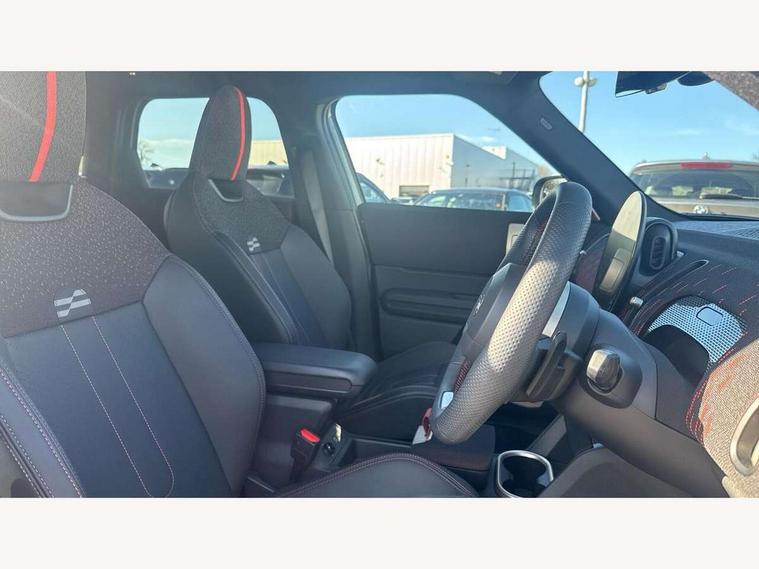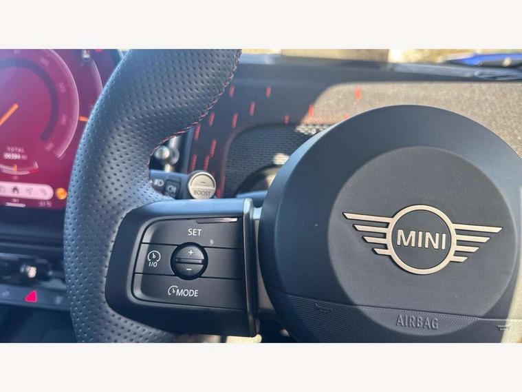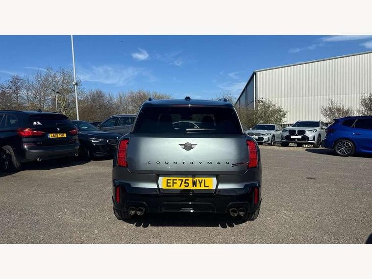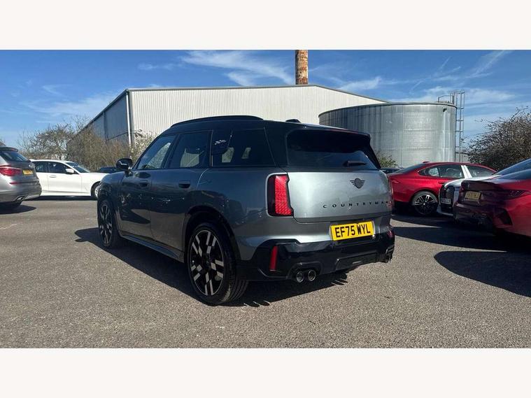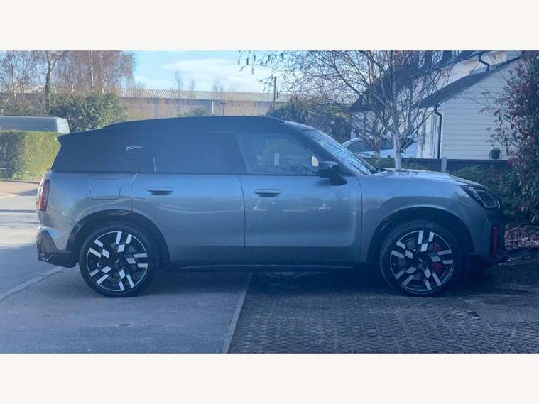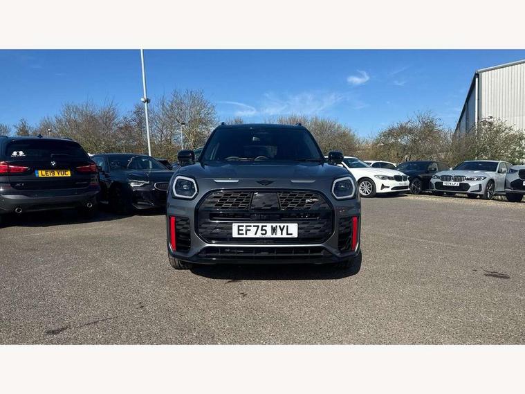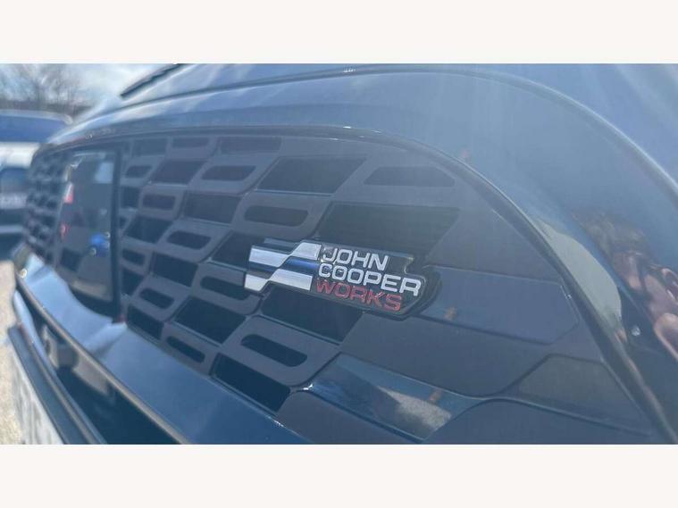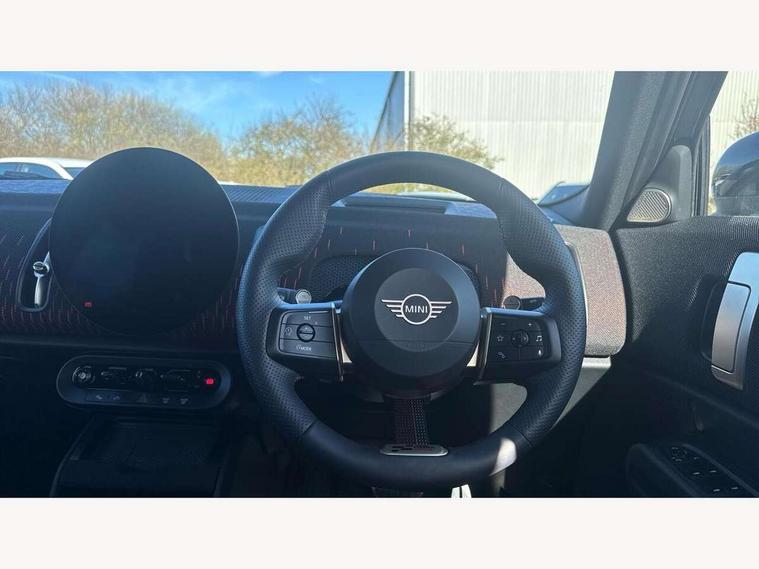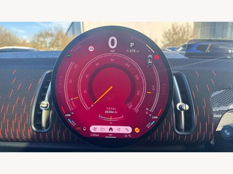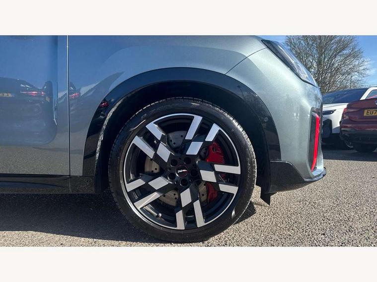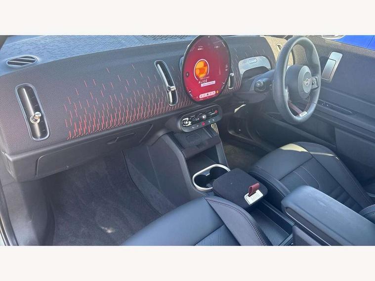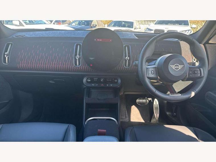 Bluetooth connection, Circular OLED Screen, Compatible mobile phone bluetooth with audio streaming, Cruise Control (DCC), Digital dashboard display, Driving assistant, Driving Assistant Plus Preparation, E-call, Electro-mechanical speed dependant steering assistance, MINI Experience Modes, MINI Head up display, Mini navigation system, MINI TeleServices, Parking assistant in camera and ultrasound based assistance system, rear view camera, parking aid and distance control, Adaptive suspension, Double clutch sports transmission, Larger capacity fuel tank, Quad exhaust system, DAB Digital radio, Harman Kardon surround sound system, Personal eSim, Auto tailgate, Electric adjustable heated door mirrors, Front and rear apron, Front and rear electric windows, Heated rear window, High beam assistant, High gloss hexagonal patterned grille surround, Interior rear-view mirror with automatic anti-dazzle function, LED daytime running lights, LED headlights with extended contents including Adaptable light signatures, LED rear lights, LED third brake light, Rain sensor with auto headlights, Rear roof spoiler with airblades, Rear side wing doors, Rear window wiper, Roof rails, 3 seat bench in 2nd row, 60/40 split rear bench seat, Anthracite headliner, Auto air conditioning, Driver and front passenger seat heating, Floor mats, Front armrest, Front headrests, Heated steering wheel, Height and length steering column adjustment, JCW Front sports seats, Lidded storage box in Black/Red knit, Luggage compartment separating net, Perforated Vescin steering wheel, Rear headrests, Seat adjustment for rear seats, Single front passenger seat, Sunvisors with vanity mirrors, Wireless charging tray, Interior and exterior mirror package - Mini Countryman, 3x3 point rear seat belts, 6 Airbags - front, side, head and seat belt tensioners, ABS, DSC - Dynamic Stability Control, Electronic handbrake, Electronic Stability Programme (ESP), Front ISOFIX (iSize), Hill descent control, Hill hold assist, Hill start assist, JCW logo in brake calipers, JCW Sport brakes with Chilli Red calipers, Manual rear child locks, Traction control, Tyre pressure monitoring system, Warning triangle, Alarm system with tilt sensor, monitoring doors, bonnet interior and tailgate, Auto drive away locking, Comfort access system, Deadlocking function, Electronic vehicle immobiliser, Locking wheel bolts, Remote control locking, Start/stop toggle with keyless go, 19" JCW Runway Spoke Black alloy wheels, Tyre repair kit plus,