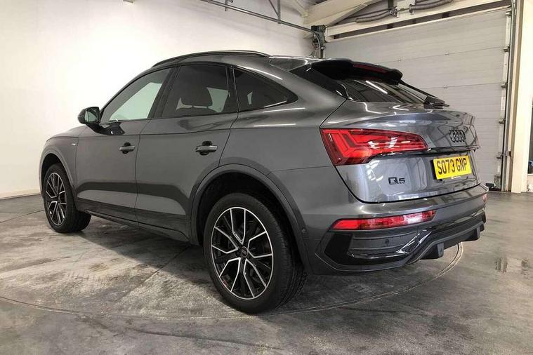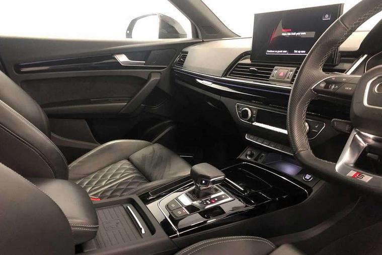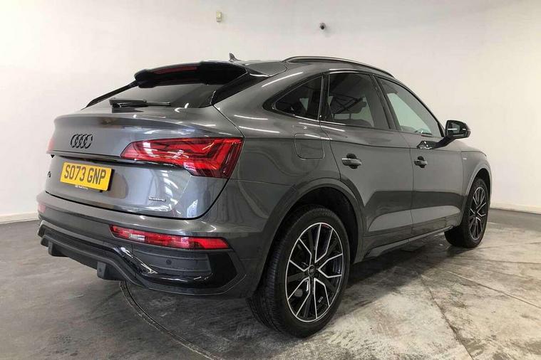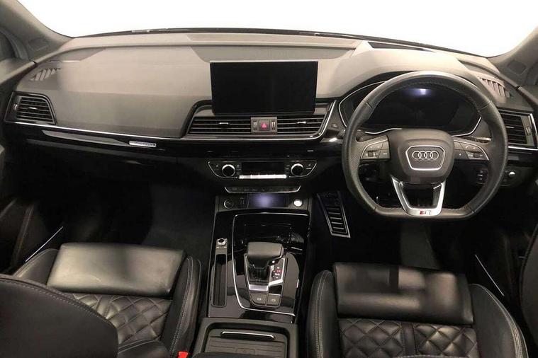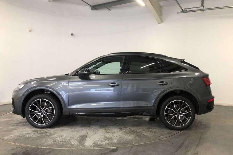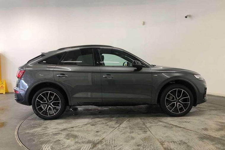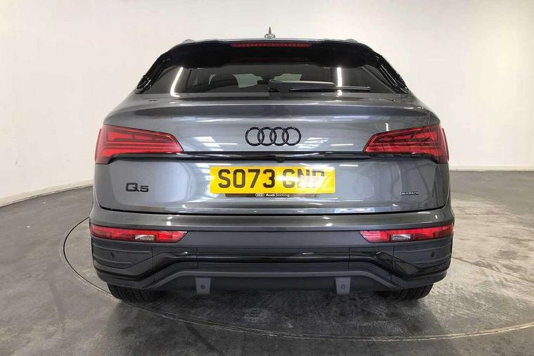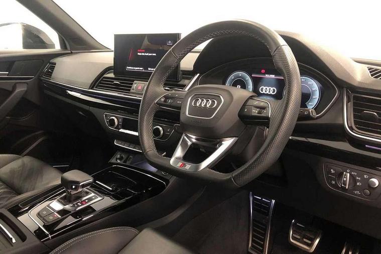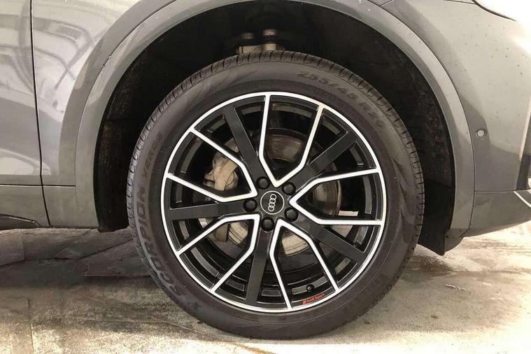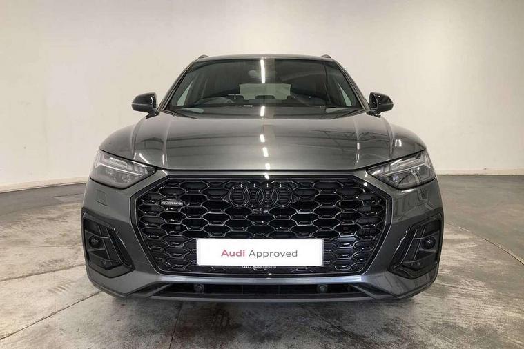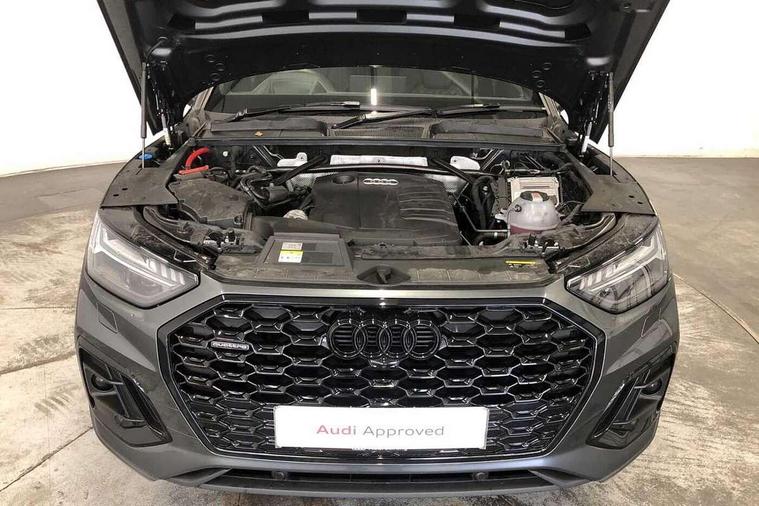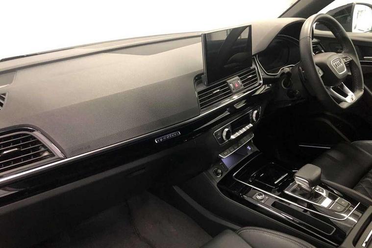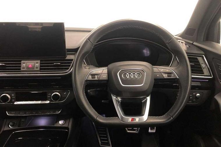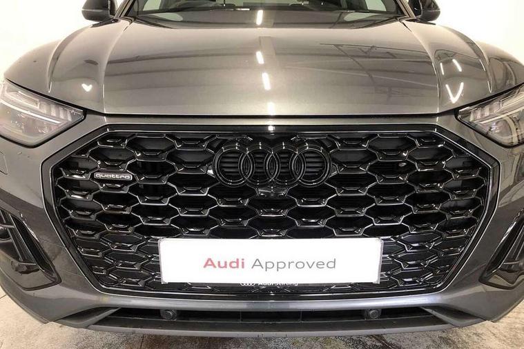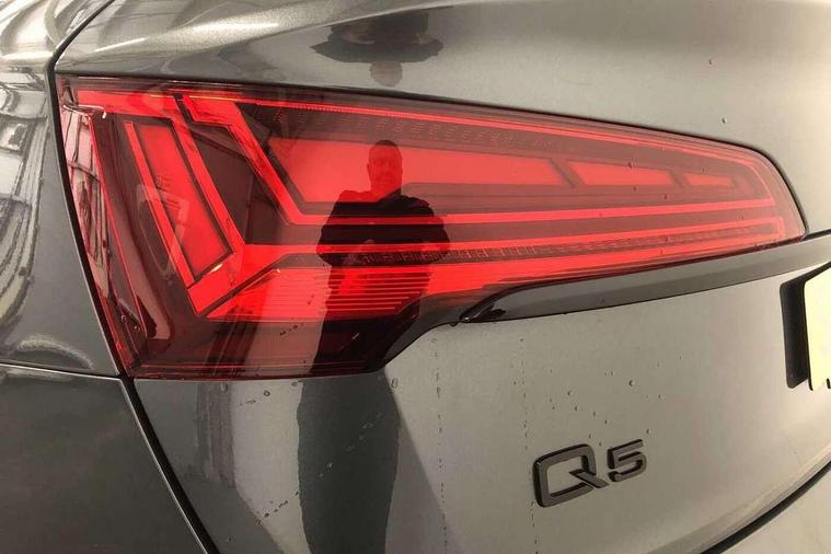 Acoustic front and rear parking sensor, Audi connect safety and service (e-call), Audi drive select, Audi virtual cockpit plus with 12.3" screen and three different layout designs, Audi wireless smartphone interface, Automatic start-stop system with coasting functionality and efficiency programme, Bluetooth interface, Camera based traffic sign recognition, Electro - mechanical power assisted steering, Lane departure warning, MMI navigation plus with 10.1" touch screen, Power tailgate, Reversing camera, Service interval indicator, Voice control system with Audi hotword activation "Hey Audi", Diesel particulate filter, Quattro on demand, S line sports suspension, 2 x USB charging port with aux input socket, 8 loudspeakers, DAB Digital radio, Acoustic windscreen, Auto dimming door mirrors, Auto dimming frameless rear view mirror, Automatic headlight adjustment, Automatic headlights and windscreen wipers, Black roof rails, Black styling with black rings, Body colour bumpers, Body colour rear diffuser with matt aluminium silver surrounds, Body colour underbody protection, Chrome plated exhaust trims, Daytime running lights, Door sills in Selenite silver, Electric adjustable/heated/folding door mirrors, Front air inlet surrounds in aluminium, Front and rear electric windows, Front radiator grille in honeycomb design, LED 3rd brake light, LED headlights and LED tail lights, Loading edge protection in stainless steel, Lower bumpers painted in contrast Manhattan grey, Rear chrome trim strip below lights, Rear privacy glass and rear side windows, Rear side wing doors, Rear wiper, Roof bars, S Line badges on the front wing panels, S Line front and rear bumpers, S Line rear spoiler, S Line side skirts, 3 rear headrests, Black cloth headlining, Comfort front centre armrest, Contrast stitching on seats, steering wheel and gear lever gaiter, Deluxe 3 zone electronic climate control, Front head restraints, Front sport seats with S embossed logo, Front/rear floor mats, Gear lever in black leather, Heated front seats, Height/reach adjustable steering column, Illuminated door sill trims with S logo, Luggage compartment cover, Manual seat adjustment with 4-way electric lumbar support, Single front passenger seat, Stainless steel pedals, Sunvisors with vanity mirrors, Top surface of the rear centre armrest in artificial leather, High gloss pack - Q5, LED interior light pack - Q5, 3 point seatbelts on all seats, 6 airbags - Driver, front passenger, curtain and side airbags, Attention and drowsiness assist, Electrically operated child locks on rear doors, Electromechanical parking brake, Electronic stabilisation control including ABS, ASR and EDL, First aid kit with warning triangle and vests, Front passenger airbag deactivation, Hill descent control, Hill hold assist, ISOFIX child seat mounting for front passenger seat and ISOFIX child seat mounting with Top Tether for outer rear seats, Multi collision brake assist, Pop-up bonnet for pedestrian protection, Pre sense city, Seatbelt monitoring, Tyre pressure warning, Anti theft alarm, Anti-theft wheel bolts, Remote central locking, Remote control key with SAFELOCK and keyless go, Air vents inserts and centre console in gloss black, Tool kit, Tyre repair kit,