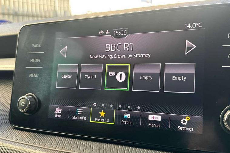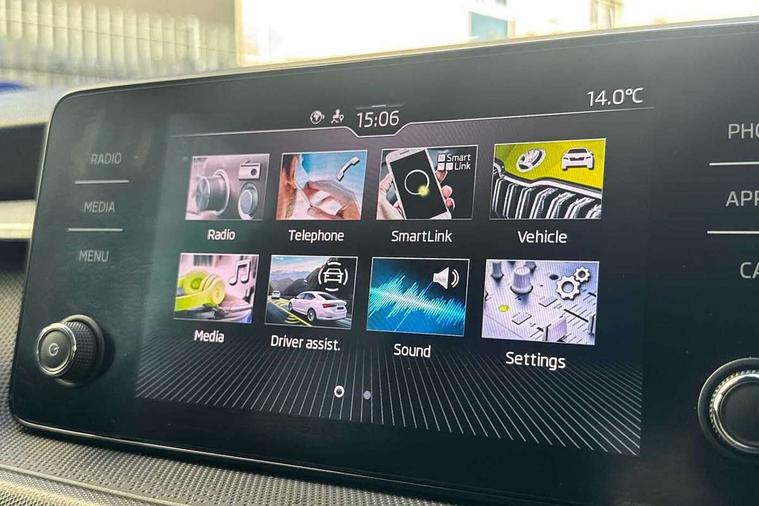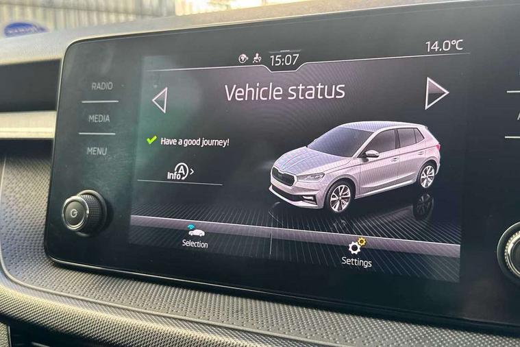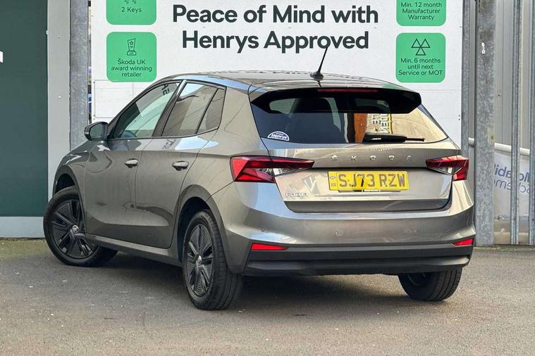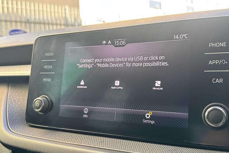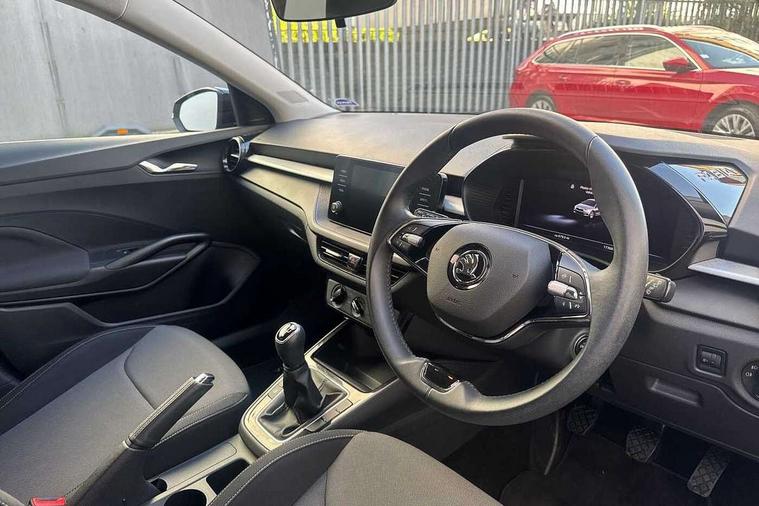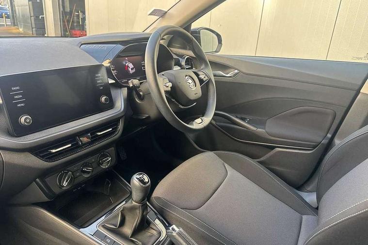 Bluetooth connection, Driver alert system - DAS, Electromechanical power steering, Exterior temperature gauge, Lane assist including road edge detection, Service interval indicator, Virtual cockpit with 10.25" colour display, 2x USB-C in the front (for data transmission and charging), 6 Speakers (4 in front and 2 in rear), Auxiliary socket for external MP3 player, Bolero radio with 8" colour display, DAB digital radio reception, Basic rear lights, Body coloured bumpers, Dimming rear view mirror with black frame, Door mirror integrated indicators, Electrically adjustable and heated door mirrors, Electrically adjustable front windows with function auto up/down, Front window wiper intermittent control, Headlight range control - Automatic, Ice scraper in fuel cap, LED daytime running lights with coming and leaving home feature, Mechanical adjustable rear windows, Privacy glass, Rear LED fog light, Rear side wing doors, Rear window wiper with washing nozzles, Roof colour door mirrors, Roof mounted spoiler, SKODA tailgate lettering in chrome, Third brake light, 3 rear headrests, Backrest split and folding, Central console with fixed cup holder and storage box, Chrome handbrake release button, Fabric upholstery, Gearshift knob/handle in leather, Grain satin black interior door handles, Hand brake lever handle in leather, Height adjustable front headrests, Height adjustable steering wheel, ISOFIX and TopTether anchorage points to the outer rear seats, ISOFIX and TopTether on the front passenger seat, Luggage compartment lighting, Pollen filter, Rear seat bench unsplit, Single front passenger seat, Storm grey headlining, Sun visors with mirror and airbag label on passenger side, Ticket holder, Umbrella in drivers door, 3-point height adjustable front seats belts with pretensioner and force limiter, Automatic warning lights in case of crash, Driver and passengers airbag with switch off function, e-Call+, ESC including ABS, MSR, ASR, EDS, HBA and XDS, Front and rear seat belt warning, FRONT ASSIST (AEB City and AEB Inter Urban), Front side airbags, Head airbags, One tone horn, Pedestrian protection, Three rear 3-points safety seat belts with pretensioner and force limiter including stop function for outer rear seat belts, Tyre pressure monitoring system, Anti-theft alarm system including immobiliser, interior monitoring, backup horn, and towing protection, Anodized cross line upper decorative trim, Colour Edition air vents, Grain satin black central console cover, Grain satin black lower decorative trim, Satin black door and side trim panel in front, Anti-theft wheel bolts protection, Super-low rolling resistance tyres,
