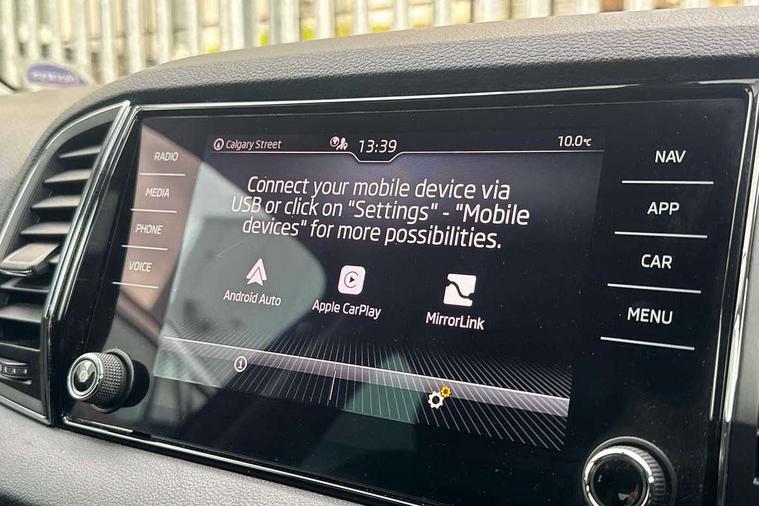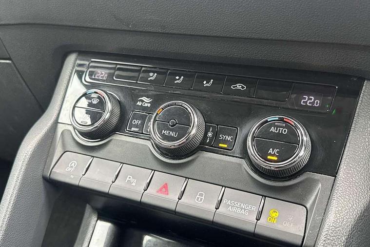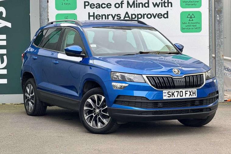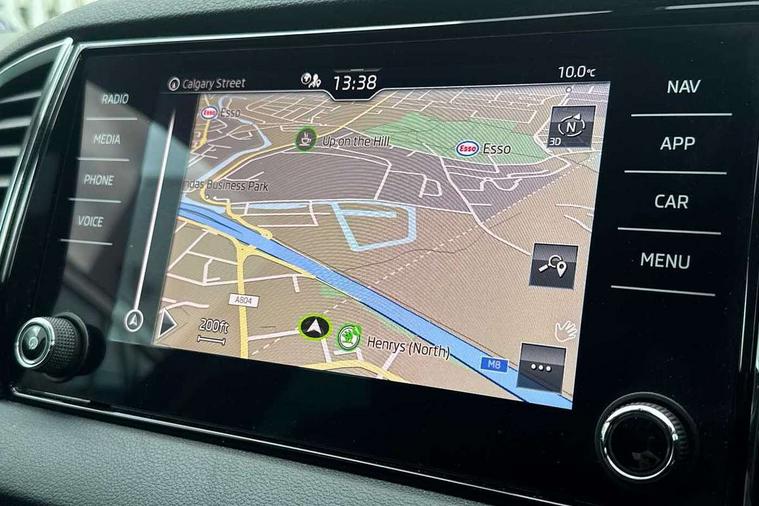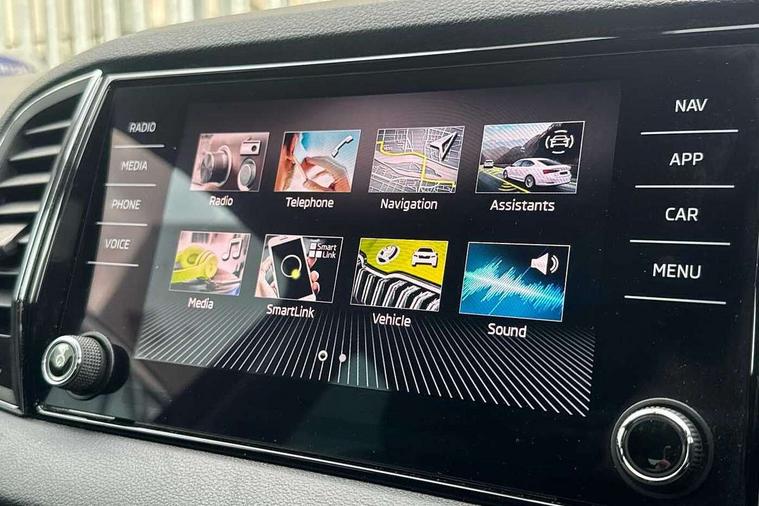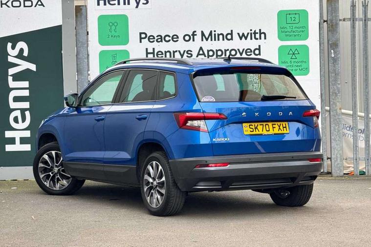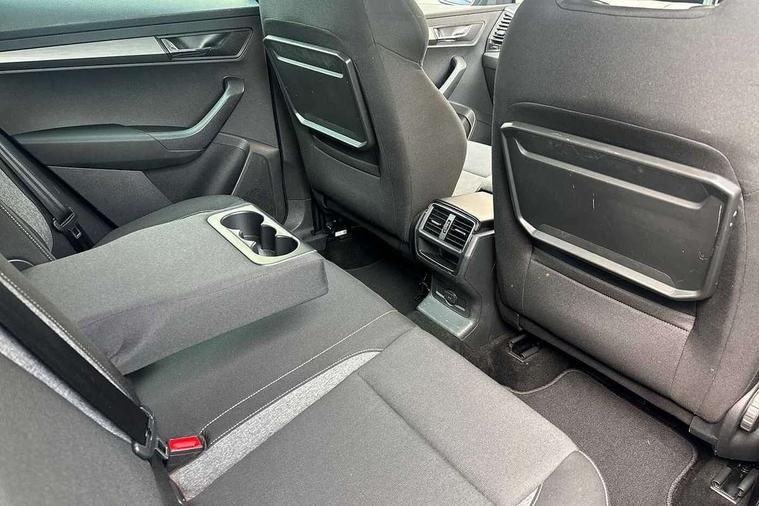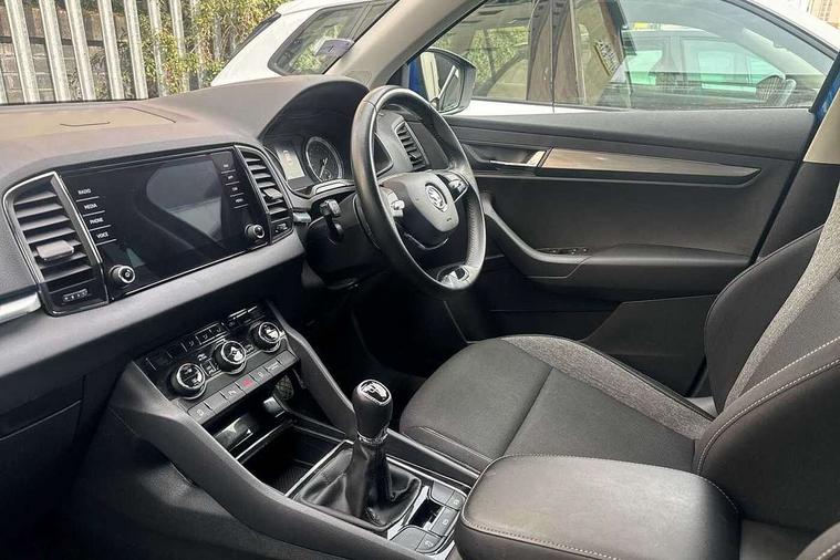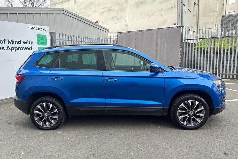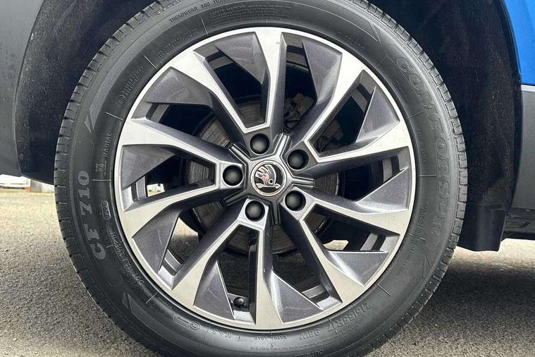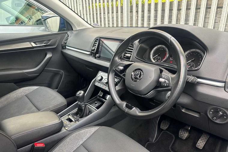 Amundsen satellite navigation with 8" touchscreen display with maps Europe, WLAN and web radio, Care connect, Driver alert system, Driver fatigue sensor, Driver profile selection, Electro-mechanical PAS, Multifunction colour trip computer, Outside temperature gauge, Rear view camera, Service interval indicator, SmartLink + wireless for Apple and wired for Android, Start/stop system with regenerative braking, USB C Port x 2 in front centre console, DAB radio with Bluetooth, SD card slot, USB connection, Acoustic glass, Aero front windscreen wipers with intermittent function, Automatic headlight control system, Black electric window control buttons, Body colour door mirrors and handles, Body coloured bumpers, Doors steps in front with Karoq badging, Electric front and rear windows with child proof lock, Electrically adjustable heated folding and auto dimming door mirrors, Heated rear windscreen, LED rear lights with high functionality, Light assistant (coming/leaving home/tunnel light), Privacy glass, Safety reflectors on front doors, Third brake light, 1.5 litre bottle holders in driver and front passenger door panels, 12V socket in boot, 12v socket in front centre armrest with storage compartment and rear air vents, 2 Folding hooks and nets in boot, 2 Front readings lights for driver and passenger, 3 rear height adjustable headrests, 4 foldable roof handles with rear coat hooks, 4 lashing points on luggage floor, Backrest release, Cargo elements in boot, Chrome inner door handles, Door sill scuff plates, Driver and passenger seats height adjust, Fabric upholstery, Folding tables on the front seat backrests, Front head restraints, Front seat and rear pockets, Height adjustable front three point seats belts with tensioners, Height/reach adjust steering wheel, Ice scraper, Illuminated and cooled glovebox, Illuminated luggage compartment, Isofix child seat preparation outer rear, Manual lumbar support for front seats, Net programme in boot, Pen holder, Pollen filter, Rear boot cover, Rear reading lights, Rear seats fixed folding and divided 60:40, Safety vest holder, Storage box in upper central dashboard closed, Sunvisors with illuminated vanity mirrors, Textile floor mats, Umbrella under passenger seat, LED Interior lighting pack with Skoda welcome logo - Karoq, Airbags - Front side, head, knee and curtain, Automatic door unlocking in case of crash, Automatic fuel cut off in case of crash, Driver airbag, Electronic parking brake with auto hold function, Emergency rear braking signal, ESC including ABS, MSR, ASR, EDS, HBA, DSR, RBS, MKB and traction control, Front assist radar scanning of the space in front of the car with automatic braking, Hill hold control, Passenger airbag with switch-off function, Pedestrian monitor, Seatbelt reminder signalisation and pretensioner for all seats, Three point seatbelts rear, Two tone horn, Tyre pressure display, Tyre pressure monitor, Alarm with interior monitoring, back up horn and tilt sensor with safe function, Electronic engine immobiliser, Remote central locking with 2 remote folding keys, Chrome framed air vents, 17" Aero alloy wheels with anti theft wheel bolts, Storage on wheel cover,
