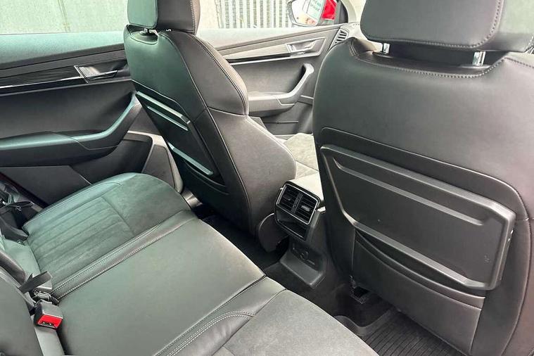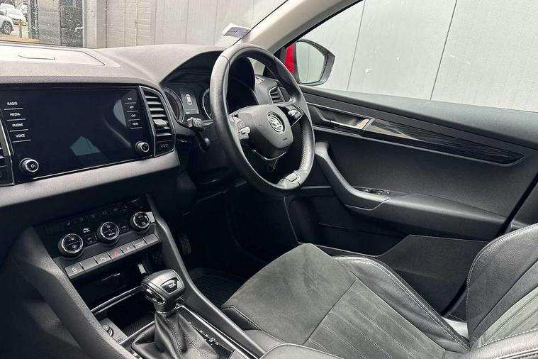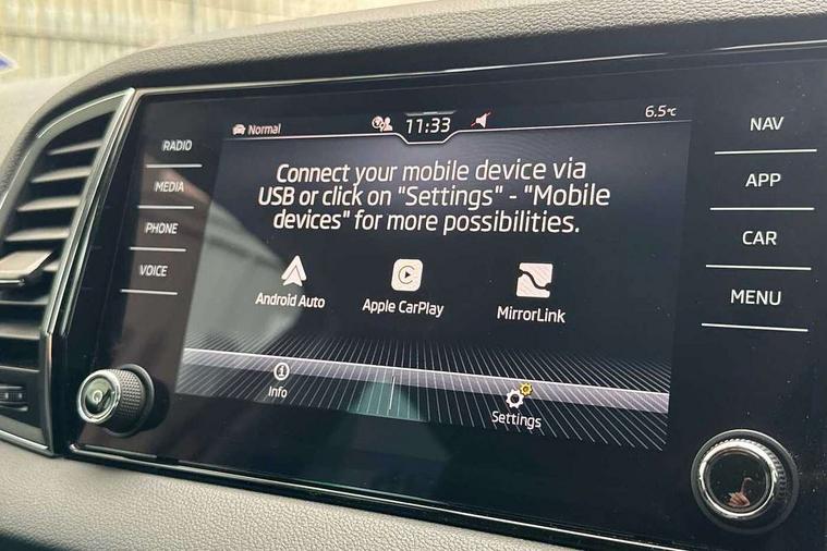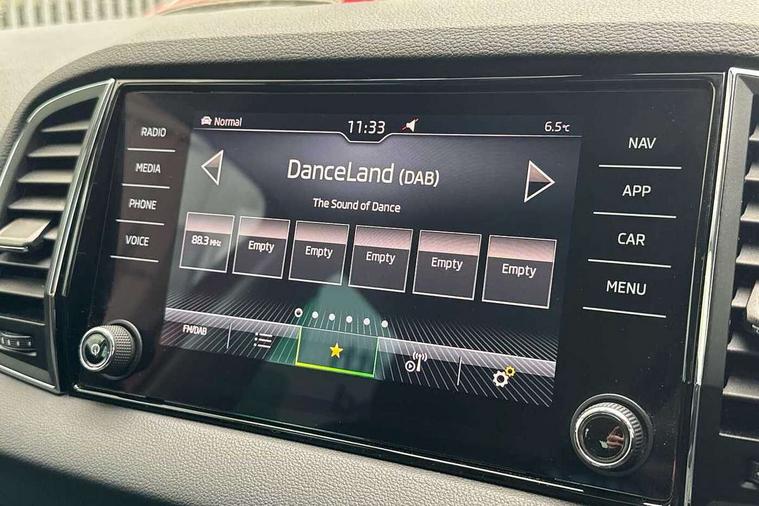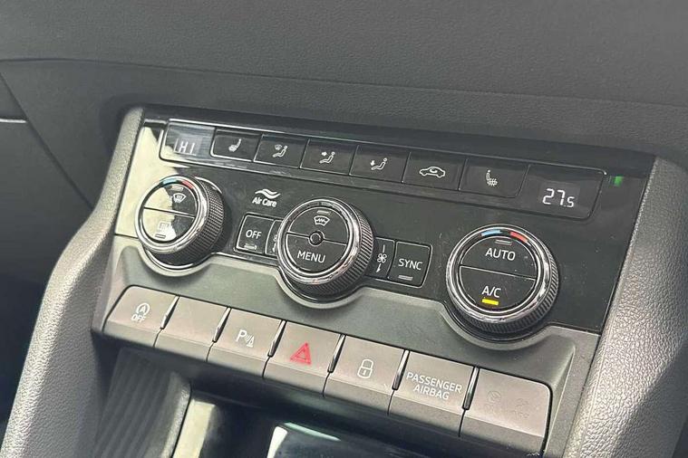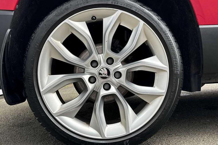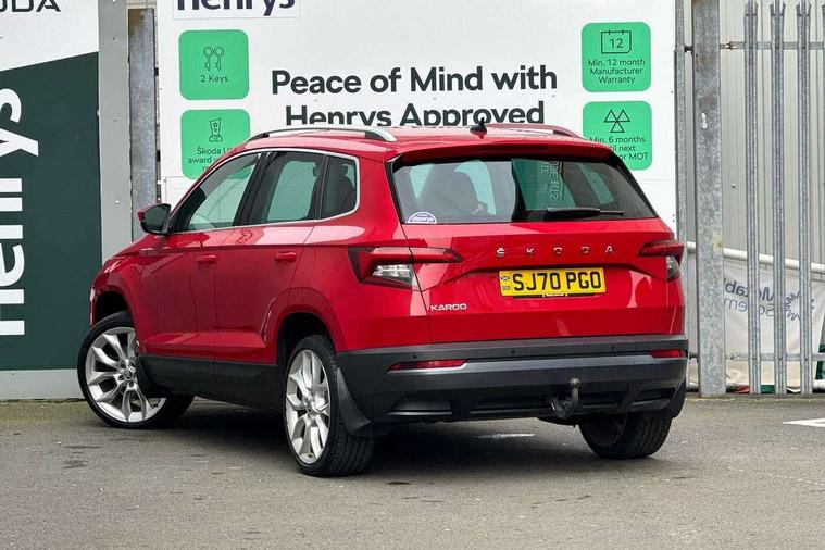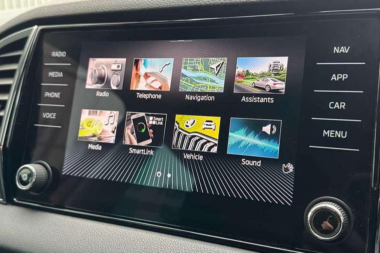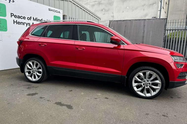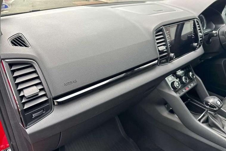 Care connect, Drive mode selector, Driver alert system, Driver fatigue sensor, Driver profile selection, Multifunction colour trip computer, Outside temperature gauge, Rear view camera, Service interval indicator, SmartLink + wireless for Apple and wired for Android, Start/stop system with regenerative braking, USB C Port x 2 in front centre console, DAB radio with Bluetooth, SD card slot, USB connection, Acoustic glass, Aero front windscreen wipers with intermittent function, Automatic headlight control system, Black electric window control buttons, Body colour door mirrors and handles, Body coloured bumpers, Electric front and rear windows with child proof lock, Full LED headlights + adaptive front light system + LED daytime running lights and front cornering fog lights, Headlight washers, Heated rear windscreen, LED rear lights with high functionality, Light assistant (coming/leaving home/tunnel light), Privacy glass, Safety reflectors on front doors, Third brake light, 1.5 litre bottle holders in driver and front passenger door panels, 12V socket in boot, 12v socket in front centre armrest with storage compartment and rear air vents, 2 Folding hooks and nets in boot, 2 Front readings lights for driver and passenger, 3 rear height adjustable headrests, 4 foldable roof handles with rear coat hooks, 4 lashing points on luggage floor, Backrest release, Cargo elements in boot, Chrome inner door handles, Folding tables on the front seat backrests, Front head restraints, Front seat and rear pockets, Height adjustable front three point seats belts with tensioners, Height adjustable passenger seat, Height/reach adjust steering wheel, Ice scraper, Illuminated and cooled glovebox, Illuminated luggage compartment, Isofix child seat preparation outer rear, Net programme in boot, Pen holder, Pollen filter, Rear boot cover, Rear reading lights, Rear seats fixed folding and divided 60:40, Retractable parcel shelf attachable to tailgate, Safety vest holder, Storage box in upper central dashboard closed, Storage compartment below the passenger seat, Sunvisors with illuminated vanity mirrors, Textile floor mats, Umbrella under passenger seat, VarioFlex seats with retractable parcel shelf, Chrome roof rails + chrome pack - Karoq, Airbags - Front side, head, knee and curtain, Automatic door unlocking in case of crash, Automatic fuel cut off in case of crash, Driver airbag, Electronic parking brake with auto hold function, Emergency rear braking signal, ESC including ABS, MSR, ASR, EDS, HBA, DSR, RBS, MKB and traction control, Front assist radar scanning of the space in front of the car with automatic braking, Hill hold control, Passenger airbag with switch-off function, Pedestrian monitor, Seatbelt reminder signalisation and pretensioner for all seats, Three point seatbelts rear, Two tone horn, Tyre pressure display, Tyre pressure monitor, Alarm with interior monitoring, back up horn and tilt sensor with safe function, Electronic engine immobiliser, Keyless entry and keyless start with safe system, Remote central locking with 2 remote folding keys, Chrome framed air vents, 19" Crater alloy wheels with anti theft wheel bolts, Storage on wheel cover,