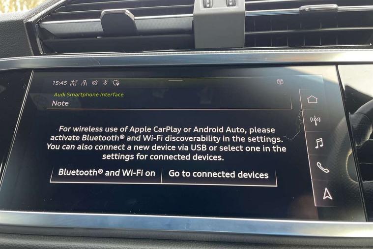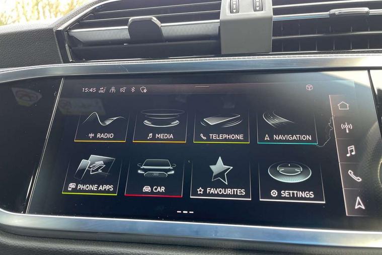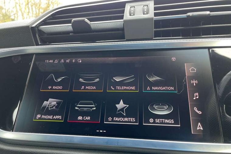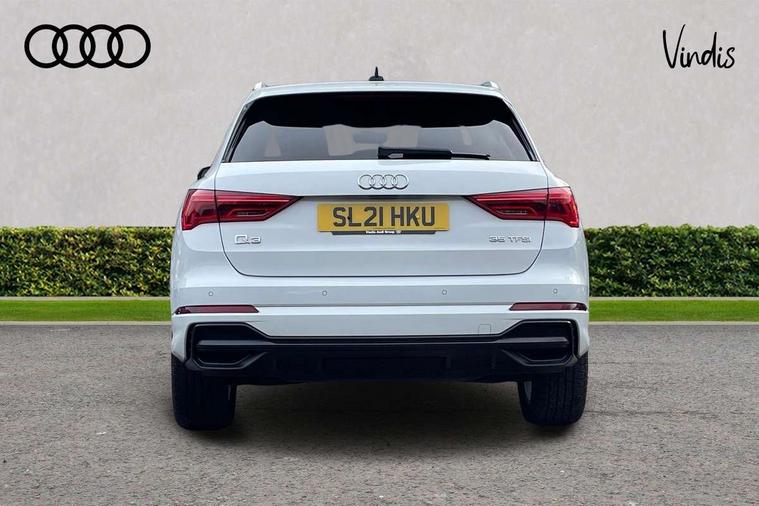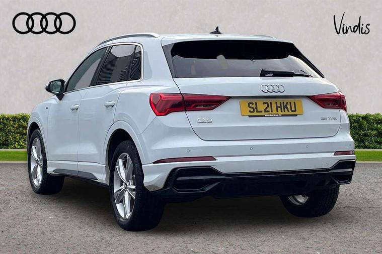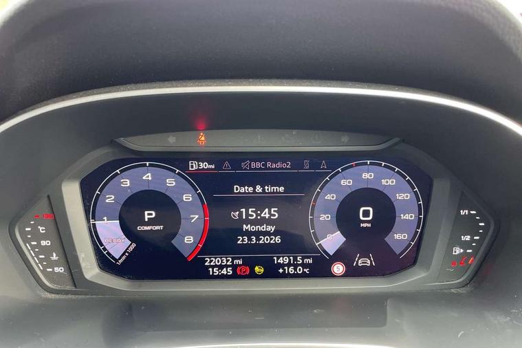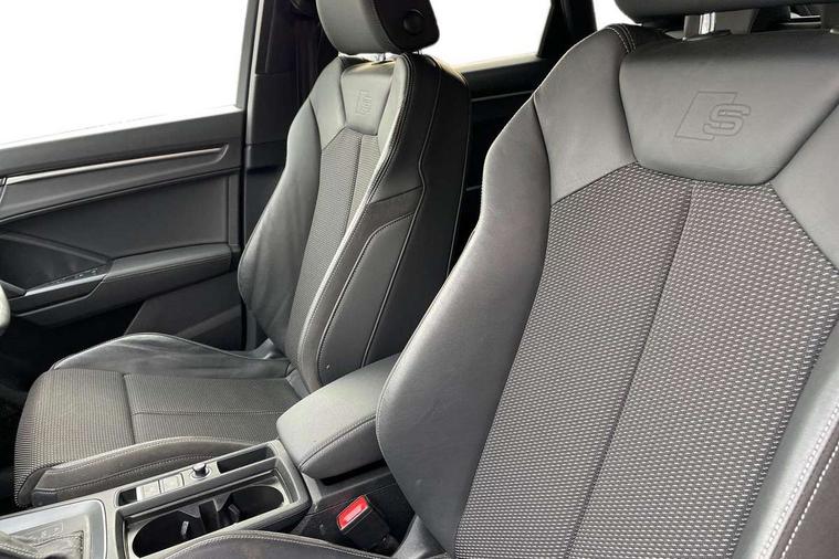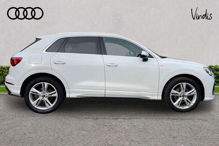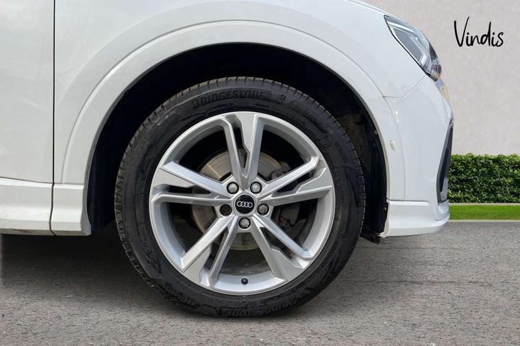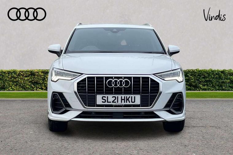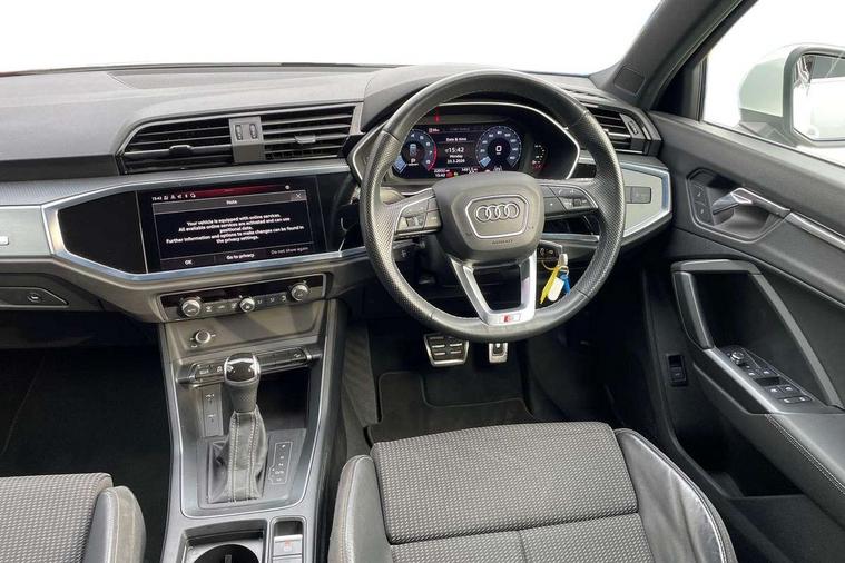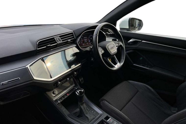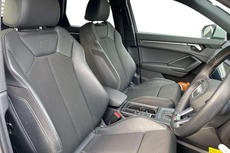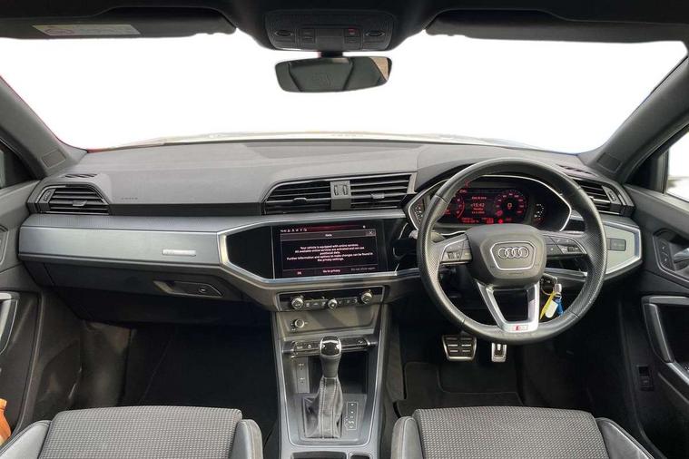 Audi connect safety and service (e-call), Audi drive select, Audi lane departure warning, Audi Virtual Cockpit - 10.25" display, Bluetooth interface, Camera based traffic sign recognition, MMI Navigation Plus with high resolution 10.1 inch touchscreen colour display, Power operated tailgate, Progressive steering, Service interval indicator, Smartphone interface includes wireless Apple carplay/Android Auto, Start stop system with recuperation, Voice control system with natural language interaction, 48V Mild hybrid technology, Sports suspension, 2 USB-C ports with charge and data functions, 6 passive loudspeakers, DAB digital radio module, Acoustic windscreen, Aluminium roof rails, Aluminium window trim, Auto dimming frameless rear view mirror, Body coloured bumpers, Electrically folding, adjustable and heated door mirrors with integrated LED side indicators and kerb view function for passenger side, Front and rear electric windows, Front fog lights, Front side air inlets in matt platinum grey, Front spoiler blade in matt platinum grey, Grille vertical bars in aluminium silver/Matt, High gloss black finish B and C pillars, LED headlights with LED daytime running lights and dynamic rear indicator, LED rear lights, Privacy glass dark tinted rear and rear-side windows (from B-pillar backwards), Rain and light sensors, Rear diffuser strip in matt titanium black, S line badges on front wings, S Line front and rear bumpers, Side skirt insert in matt Platinium grey, Silver chrome grille surround, Titanium black radiator grille, 12V socket in rear centre console, 40:20:40 folding with manual adjustment for 60:40 forwards/backwards position and backrest angle, Adjustable rear seat bench/backrest with centre armrest and cupholder, Black cloth headlining, Dual zone electronic climate control, Front and rear black floor mats with contrast stitching in rock grey, Front and rear headrests, Front and rear roof module including reading lights, Front centre armrest, Glove compartment lighting, Height and reach adjustable steering wheel, Illuminated door sill trims with S logo, ISOFIX child seat mounting for front passenger with airbag deactivation and outer rear seat including top tether attachment point for outer rear seats, Luggage compartment light, Manual front seats with height adjustment, Perforated leather gearknob, Stainless steel luggage compartment sill finisher, Stainless steel pedals, Non smoking pack - Q3, 3x3 point rear seatbelts, 6 airbags - Driver, front passenger, curtain and side windows, Audi pre-sense front with pedestrain and cyclist recognition, Electrically operated child locks on rear doors, Electromechanical parking brake, Electronic stabilisation control including ABS, ASR and EDL, Hill descent control, Hill hold assist, Pre sense basic, Seatbelt monitoring, Tyre pressure warning, Warning triangle and first aid kit, Anti theft alarm, Anti theft wheel bolts, Remote central locking, Dark matt brushed aluminium inlay, Detail dashboard around MMI touch colour display in glass look, black with surround in aluminium look, Leatherette door armrest, Tool kit, Tyre repair kit,