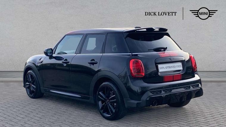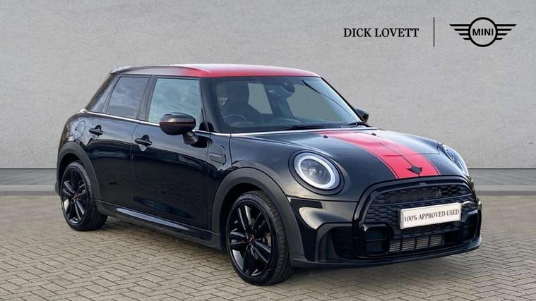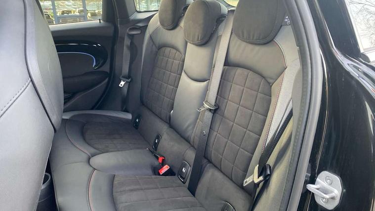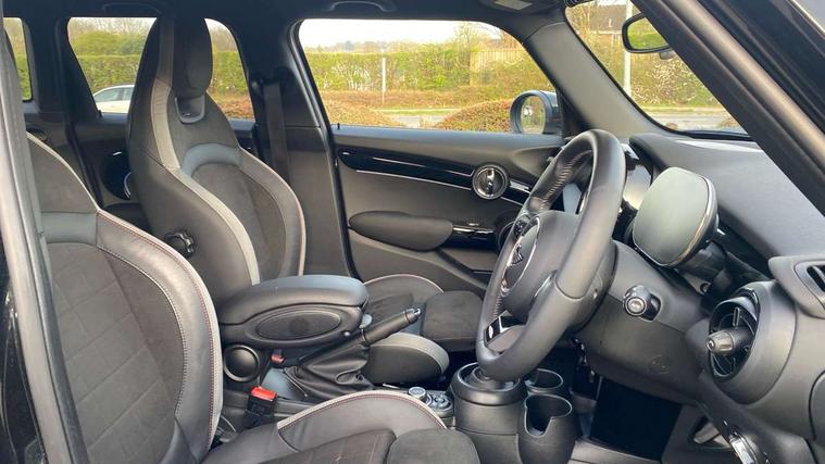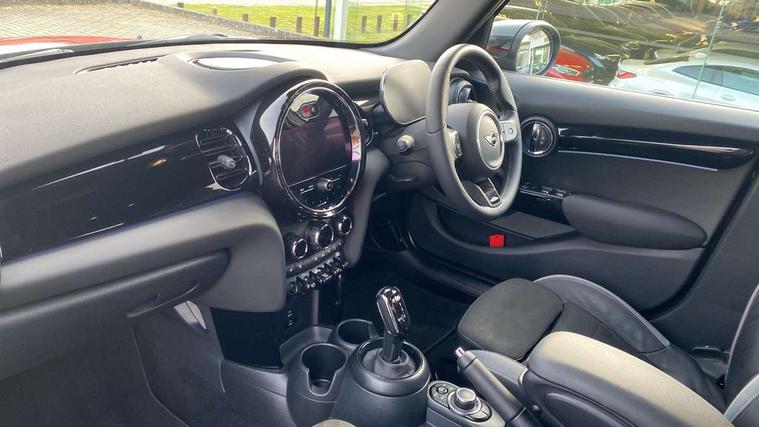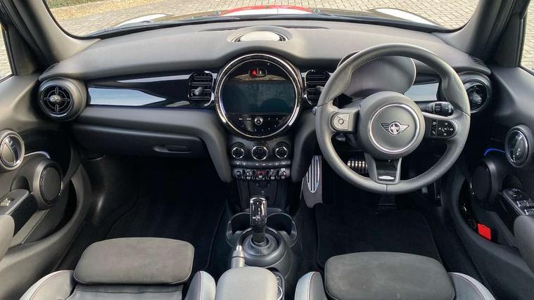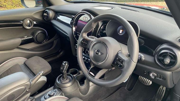 Apple CarPlay, Automatic start/stop function with brake energy recuperation, Compatible mobile phone bluetooth with audio streaming, Electro-mechanical speed dependant steering assistance, Flexible car sharing preparation, MINI Driving Modes - centre toggle switch to control driving setting (sport, mid and green), Mini E-call, MINI TeleServices, On board computer, Rear park distance control, Service interval indicator, Adaptive suspension, Double Vanos system, Fully variable valve control, Gear change indicator display, High precision injection, Performance Control, Steptronic transmission with double clutch, 8.8" touchscreen with LED ring, FM tuner and DAB digital radio, 3rd brake light, Automatic headlight activation switch, Body colour fuel filler cap, Chrome border high gloss black slats radiator grille, Dynamic brake lights, Electric front+rear windows, Exhaust tailpipe on left with chrome finisher, Heated rear window, Heated windscreen washer jets, JCW Aerodynamic kit - Front and rear bumpers with sporty JCW styling and part-painted side sills with MINI John Cooper Works door sill finishers, John Cooper Works rear spoiler, Metal door sill strips with MINI imprint, Model logo Cooper on right of tailgate, Rain sensor window wipers, Rear fog lights, Rear LED lights with union jack design, Rear side wing doors, Rear window wiper, Side scuttle panel with integrated indicator, Sun/heat protection glass, White indicator lenses, 12V Accessory socket in centre console, 3 seat bench in 2nd row, 4 lashing eyes in luggage compartment, 60/40 split folding rear seat, Anthracite headliner including grab handles and clothes hooks, Carbon black colour line - Knee roll and door armrest, Chrome interior highlights, Cupholders, Front and rear isofix with front passenger airbag deactivation, Front and rear velour floor mats, Glove compartment, Height and length steering column adjustment, Interior lighting with 12 different colours across the dashboard, underneath door bezel with illuminated laser-engraved design on central display, JCW Sport seats with integrated headrests, adjustable thigh support and John Cooper Works logo, Leatherette gearshift lever and handbrake gaiters, LED reading lights, vanity mirror lights, front foot well light and spotlight on front seats, Mechanical seat adjustment - forward/back & backrest for front seats and driver seat height adjust, Multifunction steering wheel, Single front passenger seat, Storage compartments in doors, Sunvisors with vanity mirrors, Walknappa leather steering wheel with grey seam and John Cooper Works badge on Piano Black lower steering wheel spoke, Piano black exterior pack - Mini Hatchback Cooper, 3 point seatbelts on all five seats, 6 Airbags - front, side, head and seat belt tensioners, Anti-lock braking system (ABS), Child locks on rear doors, DSC - Dynamic Stability Control, Front and rear disc brakes, Hill start assist, Single tone fanfare horn, Tyre pressure monitoring system, Alarm system with tilt sensor, monitoring doors, bonnet interior and tailgate, Electronic vehicle immobiliser, Start/stop toggle with keyless go, Piano black interior trim, Tool kit,