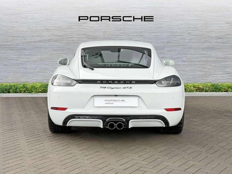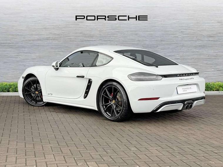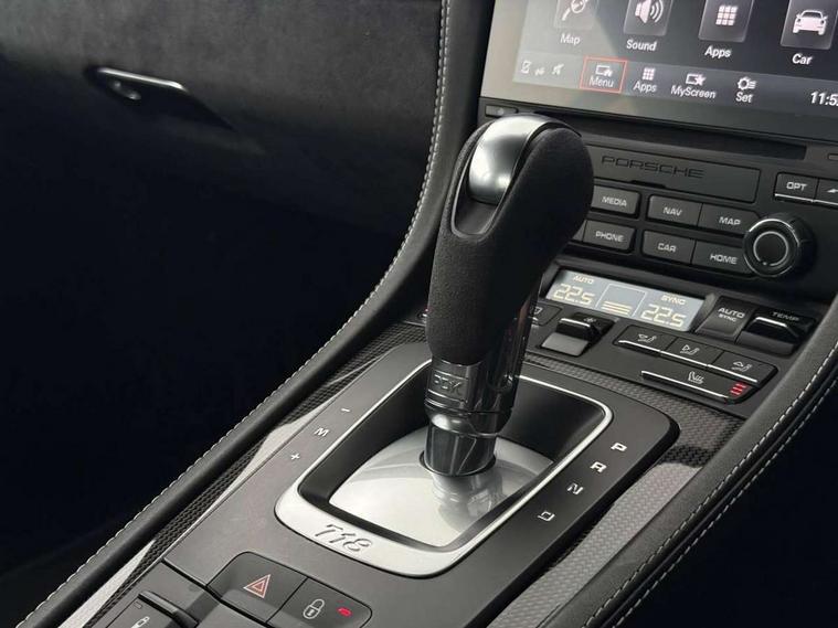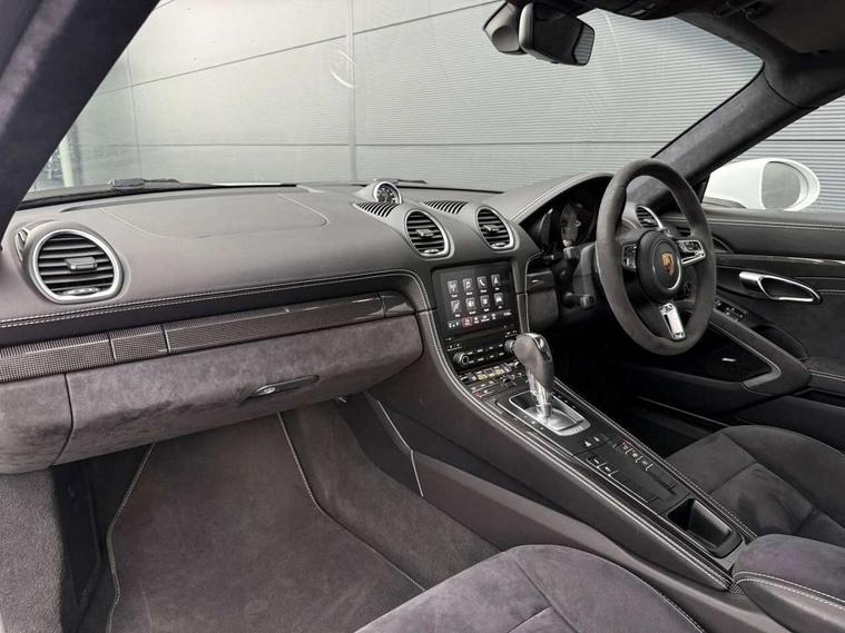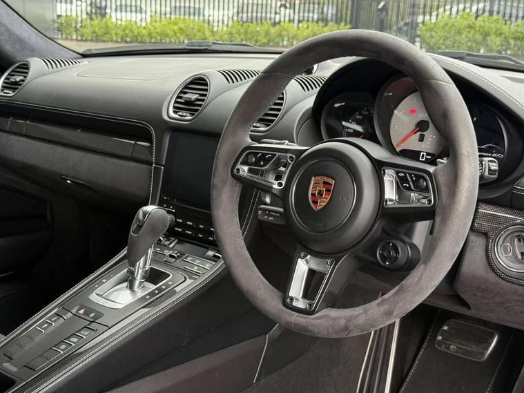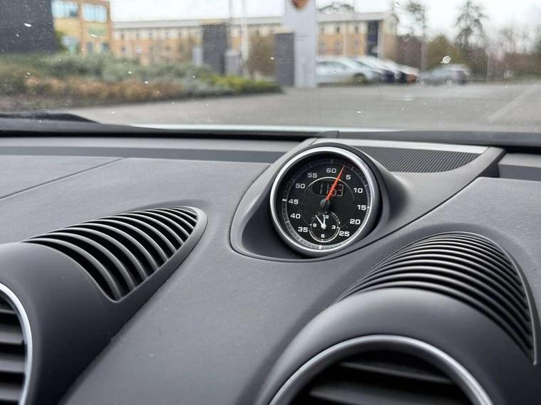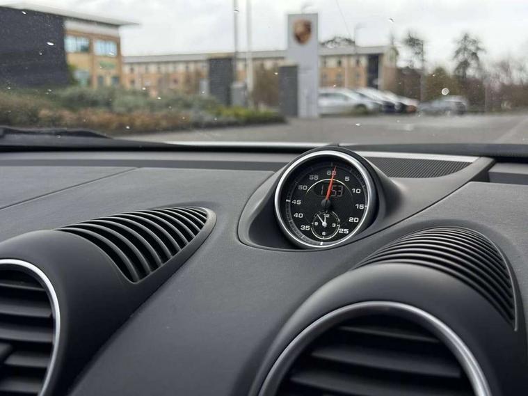 Black rev counter, Instrument cluster with high-resolution 4.6-inch TFT colour display, Mobile telephone preparation, PCM navigation module, Porsche communications management, Porsche Connect Plus, Sports button, Porsche Active Suspension Management (PASM), Porsche stability management (PSM), Porsche TORQUE Vectoring (PTV) with mechanical rear differential lock, Connect Plus with Apple CarPlay, wireless internet access, Carfinder, Remote Vehicle Status and Remote Services, DAB Digital radio, Aerodynamic wipers, Aspherical driver's exterior mirror, Automatic coming home lighting, Automatically extending rear boot spoiler, Black model designation on doors, Body colour bumpers, Door sill guards with logo, Electric windows one touch open/close, Electrically adjustable and heated door mirrors, Green tinted heat insulating glass, Heated rear windscreen, LED brake lights, LED daytime running lights, Painted Porsche logo and model designation, Painted rear apron, Sports exhaust system including sports tailpipes in black, Top tinted windscreen, Windscreen washer jets, 12V sockets in front centre console and passenger footwell, 2 cupholders, Air recirculation control, Clothes hooks on front seat backrests, Defrost switch, Door panel armrests and centre console main storage compartment lid in smooth finish leather, Driver/passenger electric backrest adjustment, Driver/passenger seats fore/aft adjustment, Front and rear luggage compartments, Front centre console storage box, Glovebox illumination, GT alcantara sports steering wheel and PDK gear selector, Ignition Lock illumination, Illumination of luggage compartment, Interior orientation lighting, LED reading lights, Lockable glovebox, Sports steering wheel with manual fore/aft/height adjust, Storage compartments in doors, Sport chrono pack PDK - Cayman (with dynamic transmission mounts), ABS, Electronic parking brake, Full size driver and passenger airbags, Head airbags, POSIP, Red painted brake calipers, Side (thorax) airbags, Tyre pressure monitoring system, Alarm system with interior protection, Anti-theft wheel bolts, Porsche vehicle tracking system (VTS), Remote central locking including luggage compartment, Transponder engine immobiliser, Sealing compound and compressor kit,