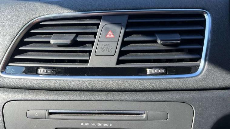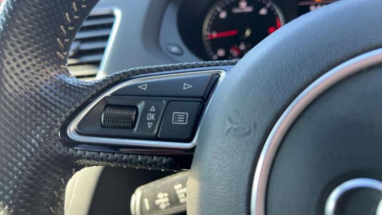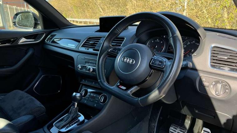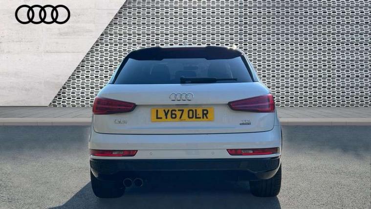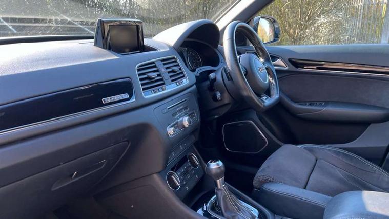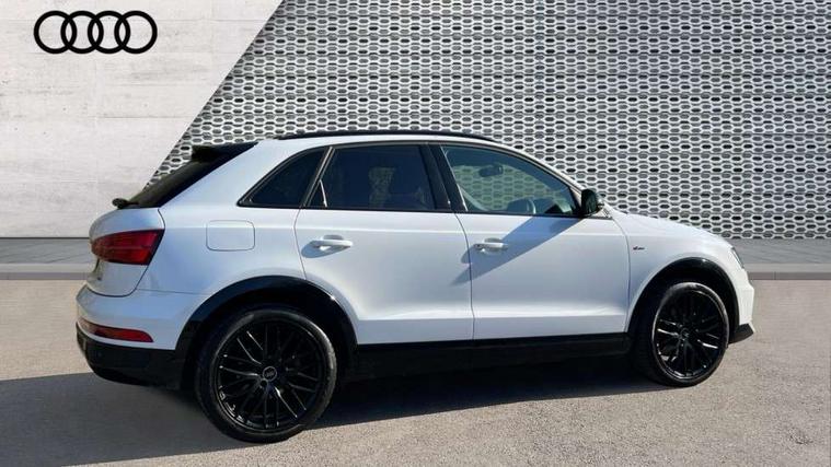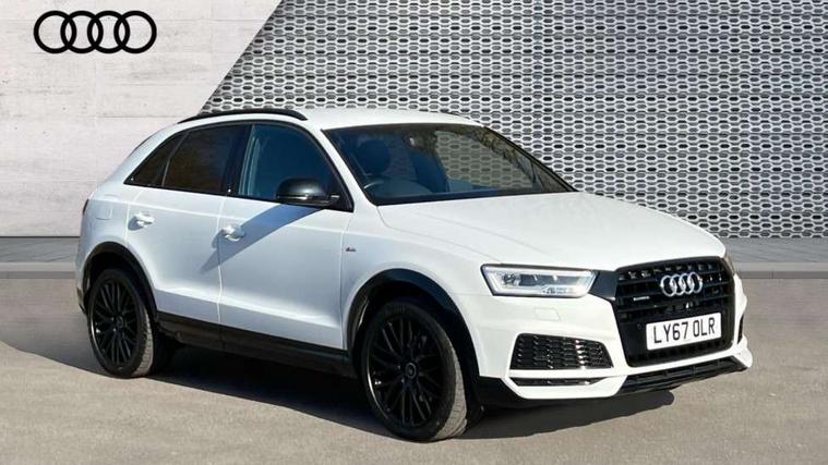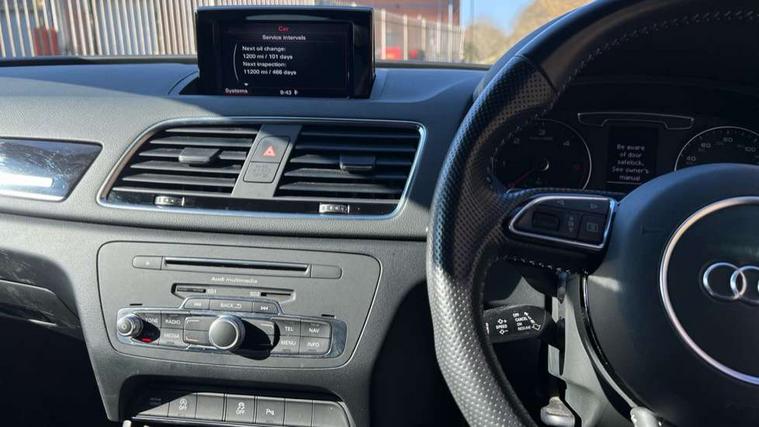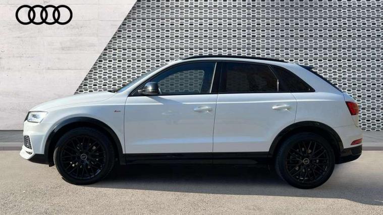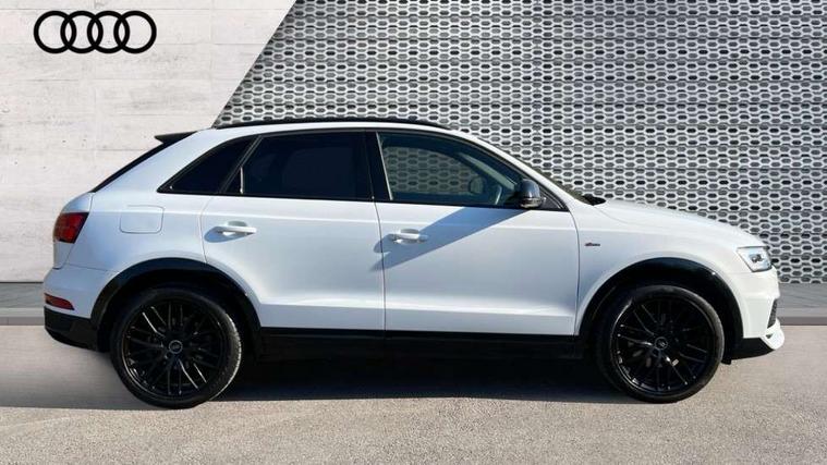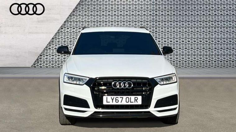 6.5" colour display screen, Audi drive select, Cruise control, Electro-mechanical PAS, Low washer fluid indicator, MMI - Multi Media Interface control system, On board computer, Remote electric boot opening/closing, Service interval indicator, Voice control system, Diesel particulate filter, Sports suspension, Audi music interface, BOSE sound system, DAB digital radio module, Acoustic windscreen, Aluminium window surround, Auto dimming rear view mirror, Black exhaust tailpipes, Black high gloss door mirrors, Black roof rails, Body coloured bumpers, Chrome fog light surround, Chrome grille, Coming home function, Door mirror integrated indicators, Front and rear electric windows, Front lip spoiler, Heated windscreen washer jets, High Gloss Black Contrast Bumpers, High Gloss Black rear spoiler, LED daytime running lights, LED headlights with headlight washers, LED rear lights, Light and rain sensor for auto activation of lights and windscreen wipers, Loading sill protector in stainless steel, Privacy glass, Rear diffuser with platinum insert, Rear wiper, S Line body styling, Sunband for windscreen, 12V socket in rear centre console, 3 spoke flat bottom multi-function perforated leather steering wheel with contrast stitching and aluminium gearshift paddles, Aluminium door sill trims, Aluminium gear knob, Aluminium pedals, Black cloth headlining, Dual zone climate control, Electric front lumbar adjustment, Front and rear headrests, Front and rear velour floor mats, Front centre armrest with storage compartment and angle adjustment, Front sports seats, Height/reach adjust steering wheel, ISOFIX on front passenger and rear outer seats, Jack and tool kit, Retractable luggage cover, Reversible boot floor, Split fold rear seat, Storage compartment and 12V socket, Under floor storage in luggage area, Audi Exclusive black styling pack - Q3, LED interior light pack - Q3, 3x3 point rear seatbelts, ABS+Electronic Brake force Distribution, Curtain airbags, Driver and passenger airbags, Driver and passenger side airbags, EDL + ASR, Electrically operated child locks on rear doors, Electromechanical parking brake, ESP, First aid kit, Front passenger airbag deactivation, Head airbags, Seatbelt warning light, Tyre pressure monitoring system, Warning triangle, Locking wheel bolts, Remote central locking, Thatcham category 1 alarm + immobiliser, Piano black finish inlay, Space saver spare wheel,