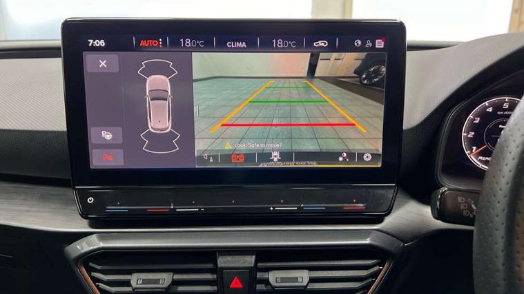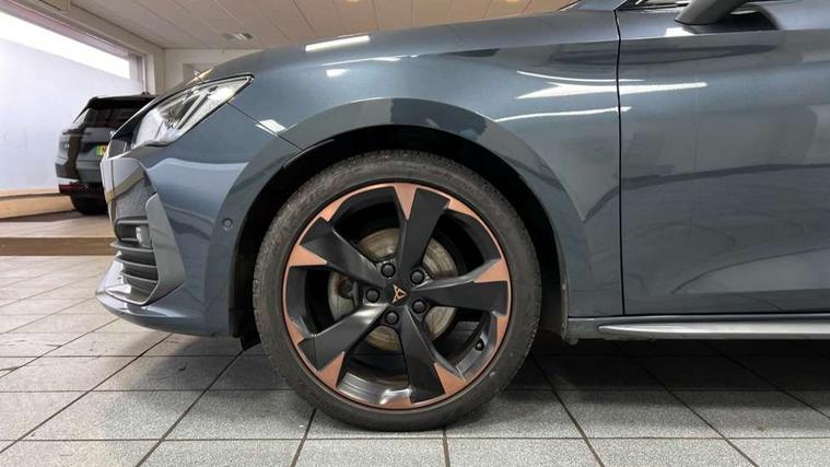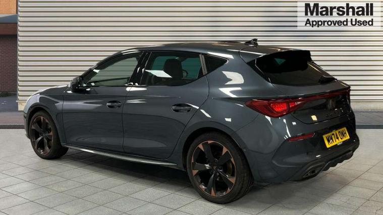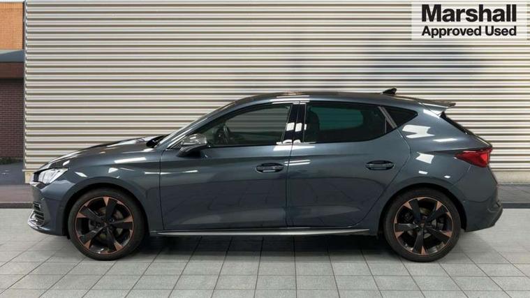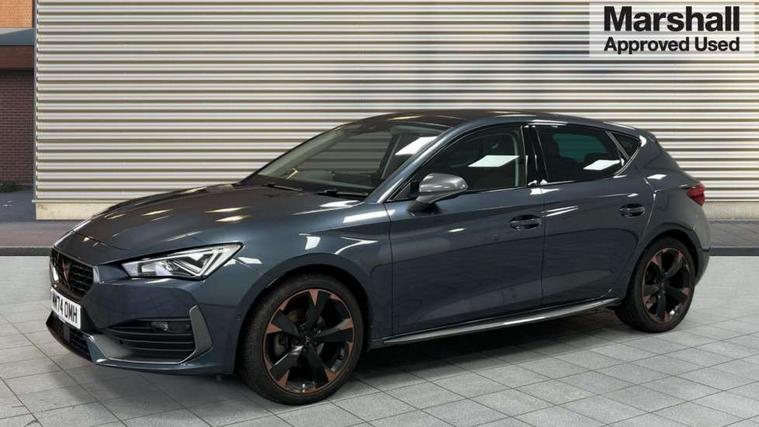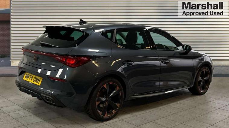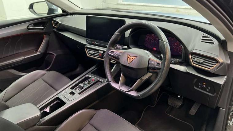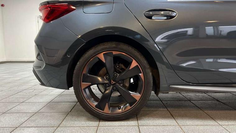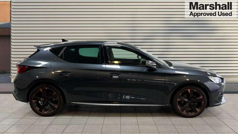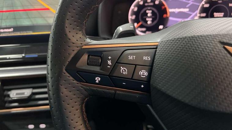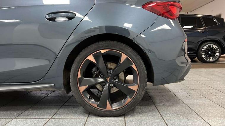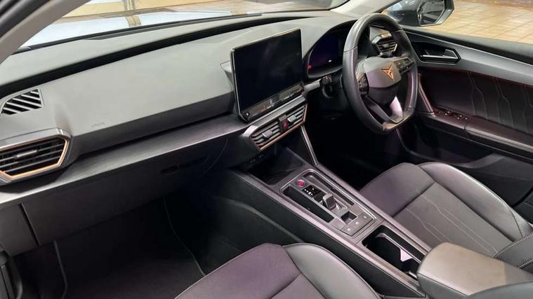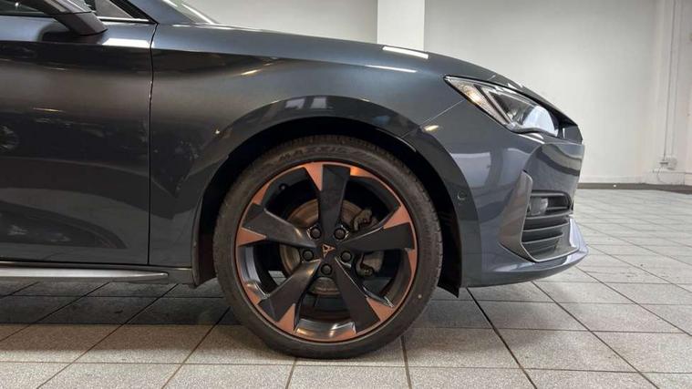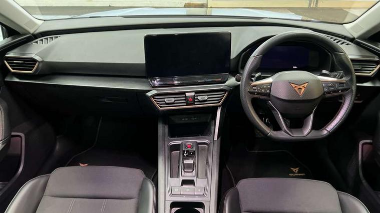 CUPRA drive profile selection with 4 modes (Comfort/Cupra/Sport/Individual), throttle response and gearshift mode, Digital cockpit, E-call, Electro mechanical speed sensitive power steering, Front assist with forward collision warning braking reaction to vehicles, pedestrians and cyclists, Full link smartphone integration with Mirror Link, wireless Apple CarPlay and wired Google Android Auto, Lane assist, Lockable tailgate, Park assist (inc front/rear parking sensors), Rear view camera, RPM, trip computer, outside temp gauge, instrument light brightness, low fuel warning light, lights on reminder, gearshift indicator, Service interval indicator, Start/stop system with regenerative braking, Wireless phone charger, Sports suspension, Auxiliary input socket, Auto dimming rear view mirror, Body colour door handles, Body coloured bumpers, Cupra sports bumpers, Dark tinted rear windows, Electric front/rear windows, Electrically adjustable, heated and folding door mirrors, LED front fog lamps with cornering function, LED headlights with dynamic turn signals, tail lights, rear fog lights with rear coast to coast lighting, Panoramic sunroof, Rain sensing wipers, Rear diffuser with twin exhaust pipe on each side, Rear side wing doors, Rear wash/wipe, Separate daytime running light with automatic headlight control and coming home feature, Third brake light, 12v power supply in centre console, 3 seat bench in 2nd row, 5 headrests, 60/40 split rear bench seat with armrest, Ambient lighting with glovebox, footwell and single monocolour, CUPRA Leather flat bottomed, heated, perforated steering and gearshift paddles, Driver/passenger manual seat height adjustment, Folding boot cover, Four x USB Type C ports (2 in front and 2 in rear), Front and rear reading lights X 4, Front centre armrest, Front seats manual lumbar adjustment, Grey headlining, Height/reach adjust steering wheel, Illuminated interior front door sills, ISOFIX points in outer rear seats with top tether anchorage points, Jack and tool kit, PVC/Cloth upholstery with copper stitching, Single front passenger seat, Sports seats, Storage pockets on rear of front seats, Sunvisors with illuminated mirror, Three zone climate control, Design pack - Cupra Leon, Media system plus with navigation pack - Leon Cupra, Safety and driving pack (M) - Cupra leon, 3 point seatbelts on all rear seats, ABS, Brake control system - ESC and brake booster, Child proof door locks, Cupra black brake calipers, Driver and front passenger airbags with front passenger airbag de-activation, front side and curtain airbags, Electronic parking brake, Extended safety system - seat belt tensioner, window closure and hazard lights, Hill hold control, Rear disc brakes, Seat belt reminder for front and rear seats, Tiredness recognition system, Tyre pressure monitoring system, Anti theft alarm system with interior monitoring in cab, backup horn and towing protection, KESSY Advanced - Keyless start, keyless entry, Locking wheel bolts, Chrome and copper interior detailing, 18" Machined sport black and copper alloy wheels with 92Y sport tyres,