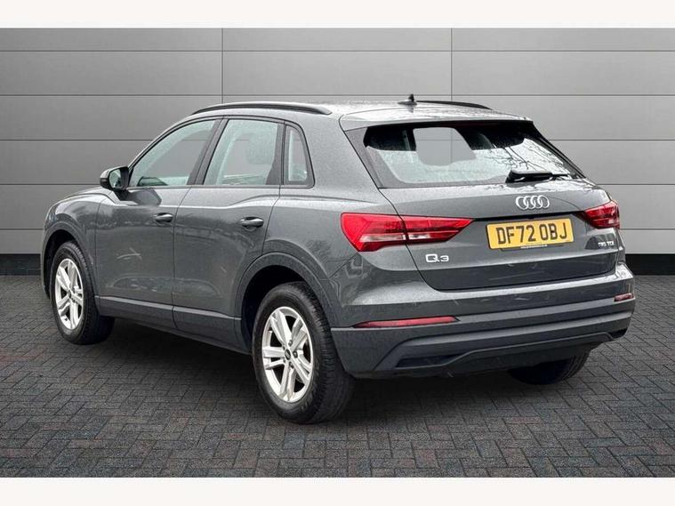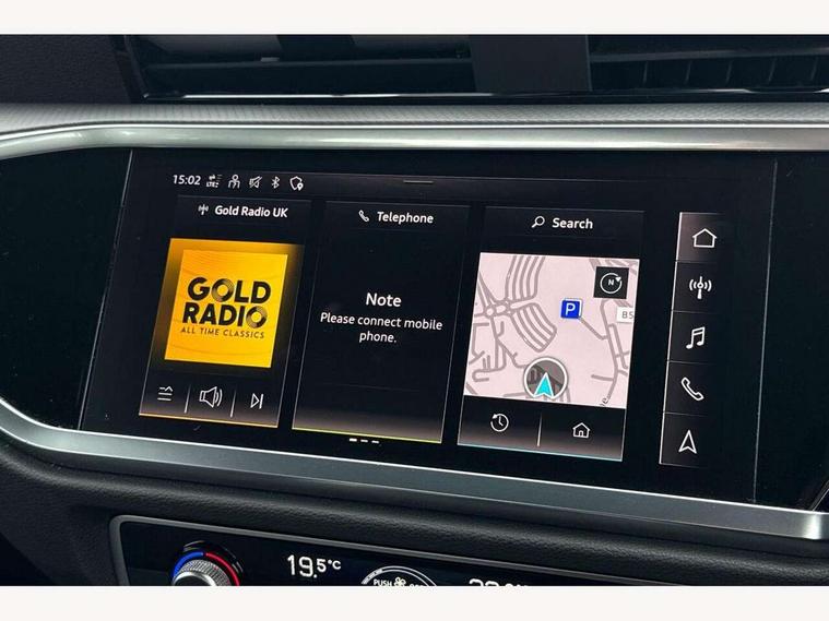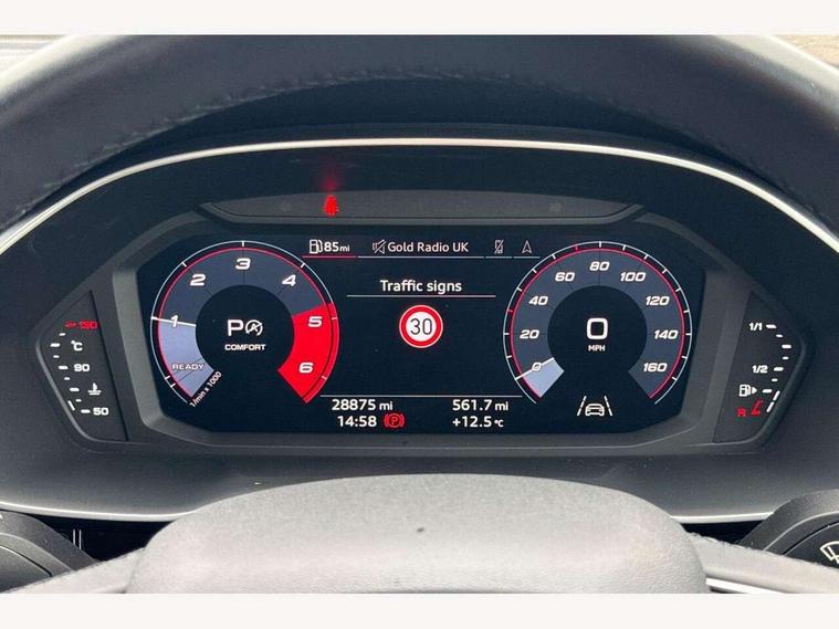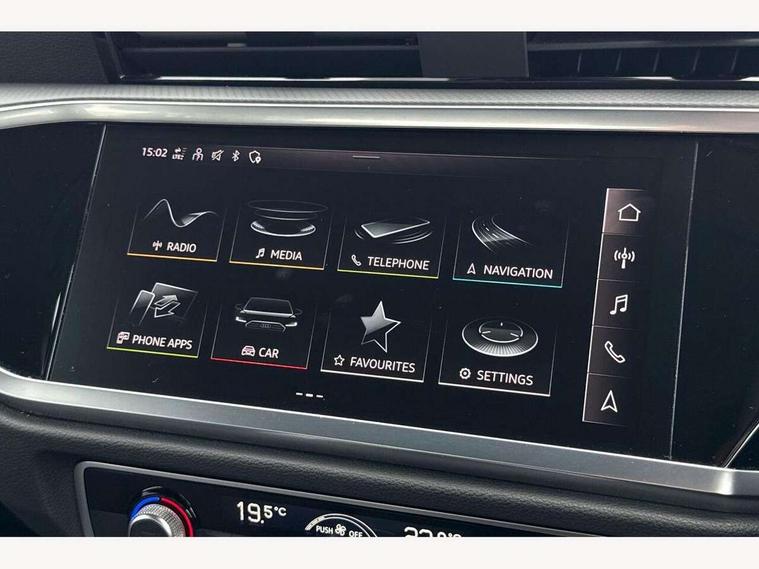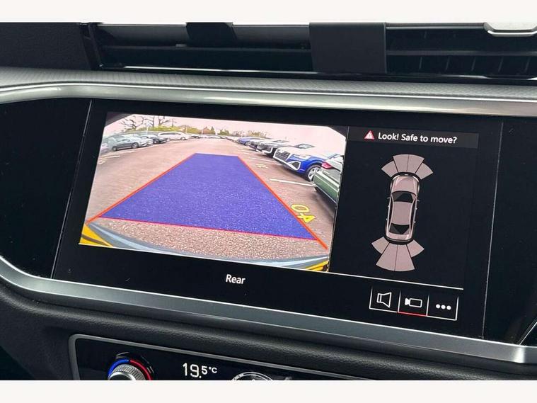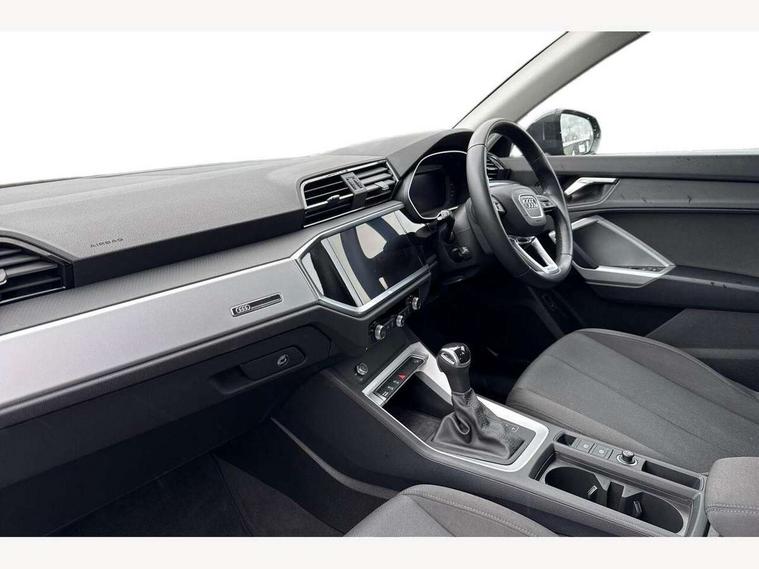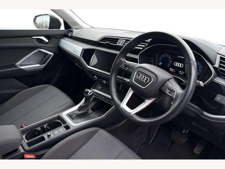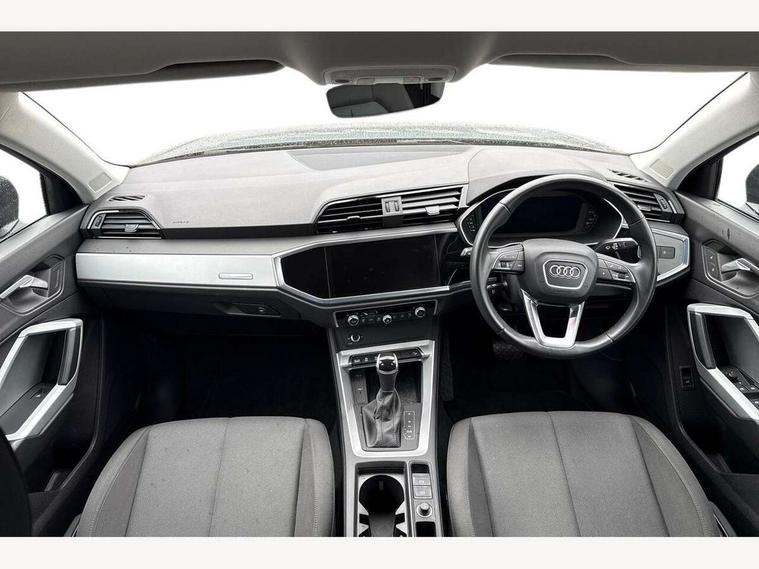 Amazon alexa Integration, Audi drive select, Audi lane departure warning, Audi smartphone interface includes wireless Apple carplay/Android Auto, Audi Virtual Cockpit - 10.25" display, Bluetooth interface, Camera based traffic sign recognition, Legal emergency call, MMI Navigation Plus with high resolution 10.1 inch touchscreen colour display, Power operated tailgate, Progressive steering, Service interval indicator, Start stop system with recuperation, Voice control system with natural language interaction, Diesel particulate filter, Standard suspension, 2 USB-C ports with charge and data functions, 6 passive loudspeakers, DAB digital radio module, Acoustic windscreen, Auto dimming frameless rear view mirror, Black roof rails, Body colour door mirrors, Diffuser in grained anthracite, Electrically folding, adjustable and heated door mirrors with integrated LED side indicators and kerb view function for passenger side, Exterior bumper with wheel arch trims and side sill trims in grained black matt, Front and rear electric windows, Grained radiator protective grille, Halogen rear lights, LED headlights with LED daytime running lights, Rain and light sensors, Rear side wing doors, Rear wiper, Third brake light, Variable front intermittent wipers, 12V socket in rear centre console, 3 seat bench in 2nd row, 3 spoke multi-function leather steering wheel, 40:20:40 folding with manual adjustment for 60:40 forwards/backwards position and backrest angle, Dual zone electronic climate control, Front and rear floor mats, Front and rear headrests, Front and rear roof module including reading lights, Front centre armrest, Glove compartment lighting, Height and reach adjustable steering wheel, ISOFIX child seat mounting for front passenger with airbag deactivation and outer rear seat including top tether attachment point for outer rear seats, Luggage compartment light, Lunar silver cloth headlining, Manual front seats with height adjustment, Single front passenger seat, Stainless steel luggage compartment sill finisher, Non smoking pack - Q3, 3x3 point rear seatbelts, 6 airbags - Driver, front passenger, curtain and side windows, Electrically operated child locks on rear doors, Electromechanical parking brake, Electronic stabilisation control including ABS, ASR and EDL, Front seatbelt reminder, Hill descent control, Hill hold assist, Pre sense basic, Seatbelt monitoring, Tyre pressure warning, Warning triangle and first aid kit, Anti theft alarm, Anti theft wheel bolts, Audi pre-sense front with pedestrain and cyclist recognition, Immobiliser, Remote central locking, Detail dashboard around MMI touch colour display in glass look, black with surround in aluminium look, Micrometallic silver inlay, 17" 5 twin spoke design alloy wheels,