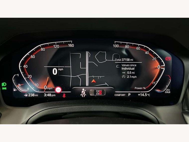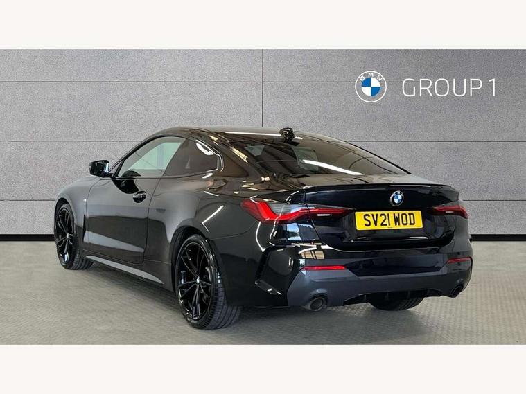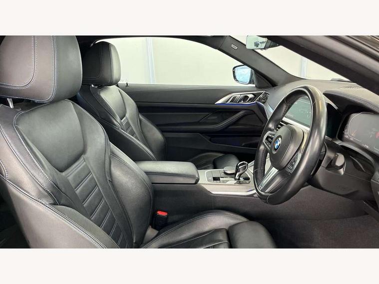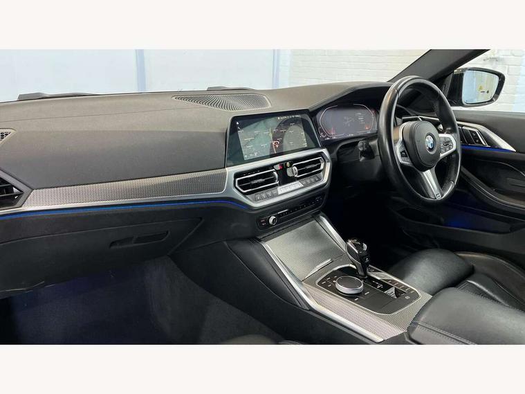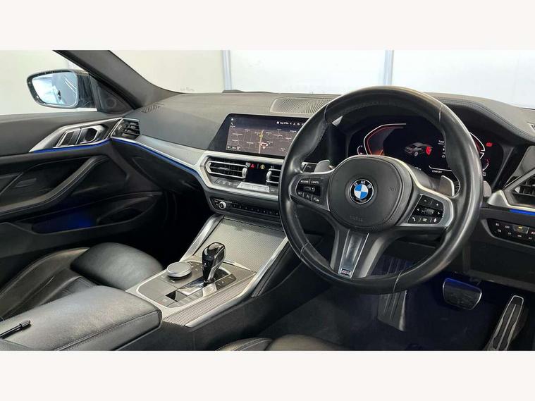 Active guard plus, Attentiveness assist, Auto start-stop, BMW ConnectedDrive online services, BMW iDrive controller on centre console, BMW Live Cockpit Professional Nav with 12.3" instrument display + 10.25" display, Intelligent Voice Assist, BMW OS 7, HDD, 2USB, 4G LTE connect, BMW service history, BMW Teleservices, Brake pad wear indicator in front and rear, Check Control warning system for monitoring of lights and door/luggage compartment open warning, Condition based service, Cruise control with brake assist, Electric power steering, Electric power steering with Servotronic steering optimised at all speed ranges, Gearshift time display in manual mode, Instrument cluster with speedometer with mph readout, tachometer, fuel gauge and oil temperature gauge, Integrated owners handbook, Oil sensor for level and grade, warning by check control system, On board computer - average speed, fuel consumption, outside temp display with acoustic warning, clock/date, service interval, odometer/trip meter, Optimum shift indicator, Variable sport steering, 8 speed automatic steptronic transmission with gearshift paddles, Balanced 50/50 weight distribution, Double VANOS, Drive performance control - ECO PRO, comfort and sport modes, Electronic differential lock control (EDLC), High precision injection, Low centre of gravity, M sport suspension, Petrol Particulate Filter, Stroke dependent dampers, VALVETRONIC engine management, DAB tuner, Electronic service booklet, Acoustic glazing, Adaptive LED Headlights, Automatic headlight beam throw control with load dependent regulating reaction, dynamic compensation of braking dive and acceleration squat, Automatically dimming electrochromatic rear view mirror, BMW emblem on engine compartment lid and tailgate, BMW kidney grille with mesh grille front side of the nuggets in matt aluminium and frame in chrome high gloss, Body colour fuel filler flap, Body colour M sport rear spoiler, Body colour roof fin, Brushed aluminium inserts in the front door sill finishers with BMW designation, Dynamic brake lights, Electric windows - front and rear, with open/close fingertip control, anti trap facility and comfort closing function all round, Exhaust tailpipe - split left and right, Exterior mirrors - electrically folding with anti-dazzle, Fading support, Front and rear bumper system, Front apron plastic in body colour, Green tinted heat protection glazing, High gloss shadow line exterior trim, Illuminated bow type door handles in body colour drivers side with door lock, Interior rear view electrochromatic mirror with automatic anti dazzle function, LED front fog lights, Licence plate panel integrated into front bumper and tailgate, Lightweight engineering, M designation on front side panels, left and right, M rear boot spoiler, Model designation on right side of tailgate, One piece front bumper cover including towing eye cover in body colour, Preparation for high beam assistant, Rain sensor, Side frame decorative moulding black matt, Two part LED tailights in L-shape with components in smoked glass, brake light, LED turn indicator and rear fog light, Visible VIN plate, Welcome lights in interior and door handle area, Widened track and increased camber values for max transverse dynamics, agility and steering precision, Window recess cover black high gloss, Windscreen wipers with integrated washing jets, 12V power socket in front centre console, 2 front cupholder in centre console with clamping elements and matt black inlay, 2 Rear seat headrests, 3 spoke M leather multifunction steering wheel, 3 zone automatic air conditioning, 4 pieces lashing eyelets in luggage compartment, 40:20:40 split folding rear seat and rear centre armrest with two cupholders, Ambient lighting with welcome carpet light, Anthracite headlining, Armrest integrated in front and rear door trim + front centre console armrest, Four grab handles integrated in roof lining, Front and rear door exit lighting (left / right), Front and rear door pockets, Front and rear footwell lights, Front and rear reading lights, Front headrests, Front seat backrest width adjustment, Front sport seats, Heated driver and front passenger seats, Height adjustable mechanically and infinitely variable steering column, Illuminated armrest storage compartment, Illuminated glove compartment with separate small compartment, Luggage compartment light, Make-up mirror lights, Storage compartment in rear centre console, Sunvisors with vanity mirrors and ticket pocket, Toolkit located in luggage compartment, Velour front floor mats, Vernasca leather upholstery, Connected professional package - 4 Series, M sport exterior styling pack - 4 Series, 2 x 3-point rear seatbelts, Battery safety cut-off, BMW emergency call, Brake energy regeneration, Braking pre-tensioning, Child proof locking system in rear door, Child seat ISOFIX attachment for the two outer rear seats, Coasting in idle in ECO PRO mode, Cornering brake control (CBC), Crash sensor activating of airbags, Unlocking doors, hazard warning lights, interior light, safety battery terminal, Driver and front passenger side airbags, integrated in the door side seat backrest bolsters for all seat variants, Driver/Front Passenger airbags, Dry braking, Dynamic brake control, Dynamic stability control + (DSC+) - Anti-lock Braking System (ABS) with brake assist and cornering brake control + Automatic Stability Control (ASC), Dynamic Traction Control - DTC, Electric parking brake including automatic hold function and automatic release of the parking brake when driving off, Front and rear ventilated brake disc, Front passenger manual airbag deactivation, Head airbags for all 4 outer seats, Hill start assistant, Seat belt security check for driver and front passenger, Seat belt with belt stopper, pyrotechnic belt tensioners and belt force limiters, Side impact protection, Tyre pressure monitoring with three level warning strategy, Warning triangle and first aid kit, Alarm system (Thatcham 1) with 
