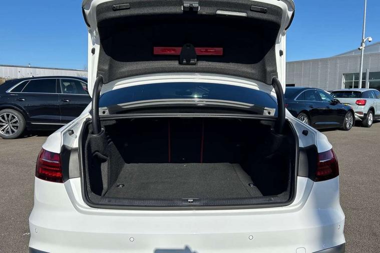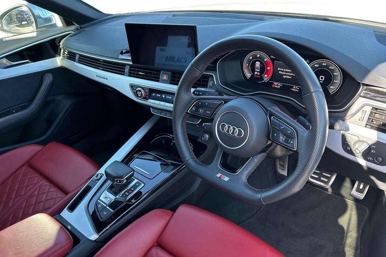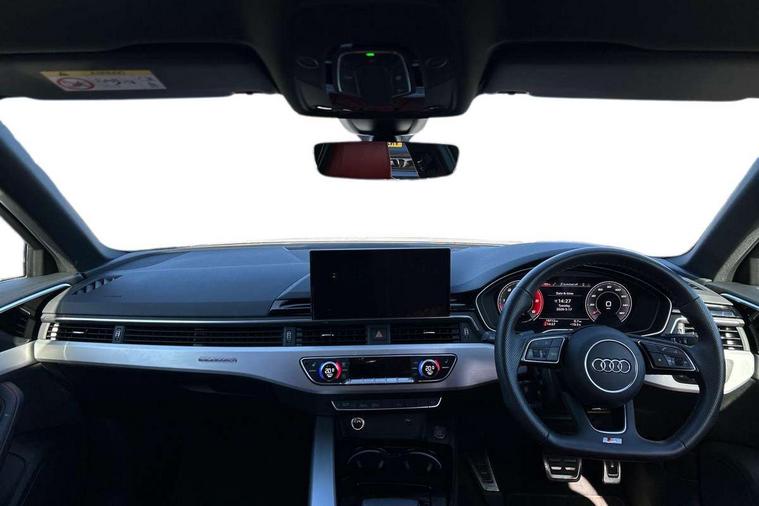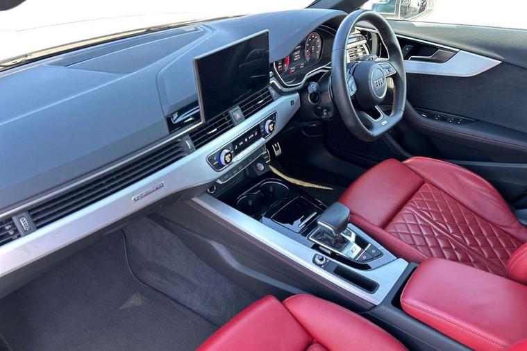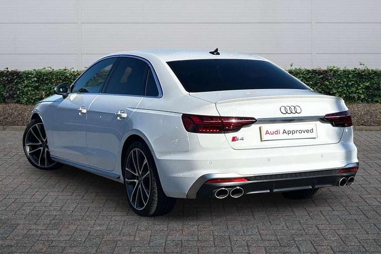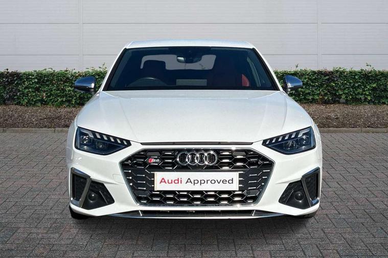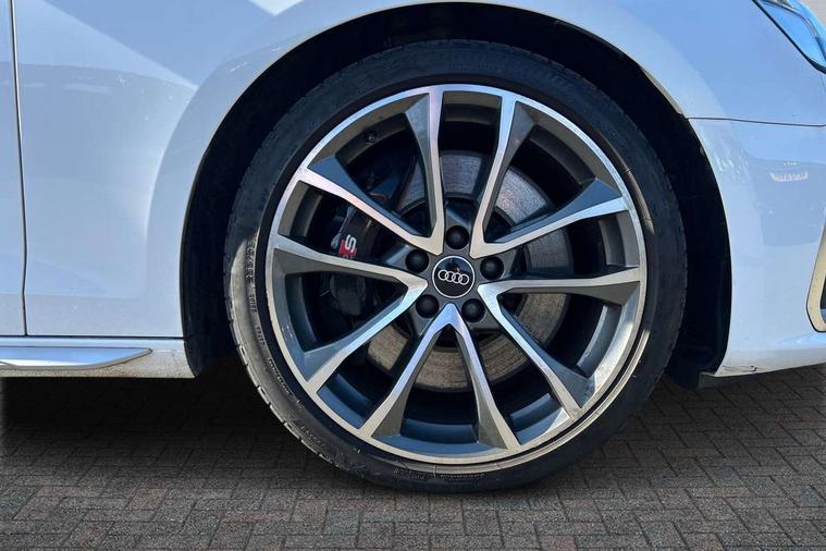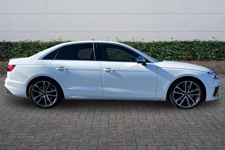 Audi connect safety and service (e-call), Audi connect with Amazon Alexa Integration, Audi drive select, Audi smartphone interface, Audi virtual cockpit, Automatic start-stop system with coasting functionality and efficiency programme, Bluetooth interface, Electric boot lid release, Electromechanical power steering, Email, calendar and text messages displayed via MMI, MMI Navigation plus with MMI touch includes 10.1" high resolution colour MMI display, 3D map, S instrument dials, Voice control system, 58 Litre fuel tank, S sports suspension, 2 USB charging ports, Audi sound system with 10 loudspeakers, DAB digital radio reception, Aluminium effect door mirror housings, Audi Beam uses LEDs to project the Audi logo, Auto dimming rear view mirror, Body colour door handles, Body colour front spoiler lip, Body colour side sill trim, Electrically folding auto dimming/adjustable/heated door mirrors with LED side indicators and kerb view function for passenger side, Front and rear bumpers with side skirts, High beam assistant, LED headlights with LED rear lights + dynamic rear indicators + headlight adjustment and high beam, turning light + LED daytime running lights, LED third brake light, Privacy glass, Rain and light sensors, Rear boot, Rear side wing doors, S Line badges on the front wings, S radiator grille in twilight grey matt with dual struts in aluminium and S4 logo, S rear diffuser in twilight grey matt and honeycomb grille in black, S specific dual branch chrome tailpipes with twin oval pipes on left and right, S specific side air inlets in titan black with chrome inlays in unique S design, S Style rear spoiler, Variable intermittent front wash/wipe, Windscreen with acoustic glazing, 40/20/40 split folding 3 rear seat bench in 3 parts with rear centre armrest, Black cloth headlining, Black leather gear lever knob, Contrast stitching on seats, steering wheel and gear lever gaiter, Deluxe 3 zone electronic climate control, Door sill trims with aluminium inlay, Electrically adjustable front seats, Fine nappa leather upholstery with S embossed logo + super sports seats, Front and rear head restraints, Front centre armrest, Gear lever with diamond S badge, Heated front seats, Illuminated door sill trims with S logo, ISOFIX child seat mounting and top tether, Key with S logo, Pneumatically adjustable lumbar support with massage function, Single front passenger seat, Stainless steel pedals and foot rest, Tool kit, Extended leather pack - A4/S4, High gloss package - A4, LED Interior light pack - A4/S4, 3 rear seatbelts, 6 airbags - Driver, front passenger, curtain and side windows, Electronic Stabilisation Control (ESC) including ABS, ASR and EDL, Front brake calipers painted in black with S4 logo, Hill hold assist, Multi collision brake assist, Pop-up bonnet for pedestrian protection, Pre sense city, Rear door child safety locks, S model enhanced braking system, Seatbelt monitoring, Warning triangle and first aid kit, Anti theft alarm, Anti theft wheel bolts, Central locking, Keyless Go, Matt brushed aluminium inlays, 19" 5 spoke V design contrasting grey alloy wheels, Tyre repair kit,