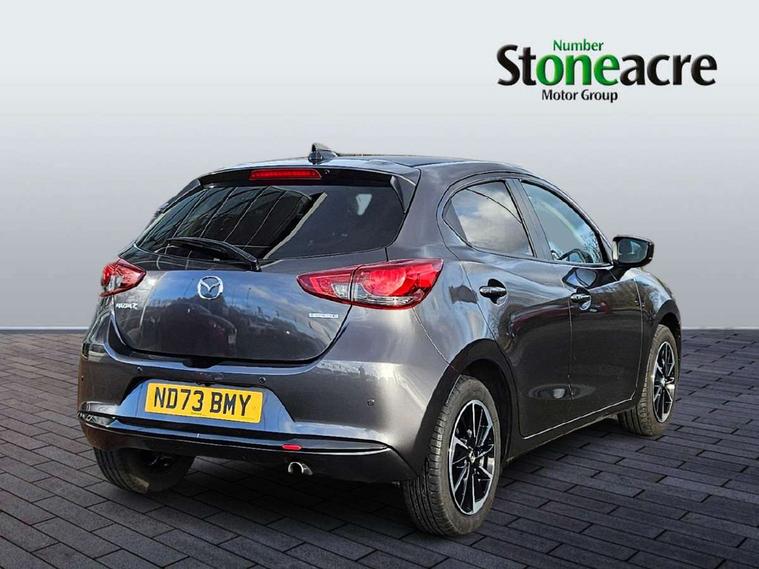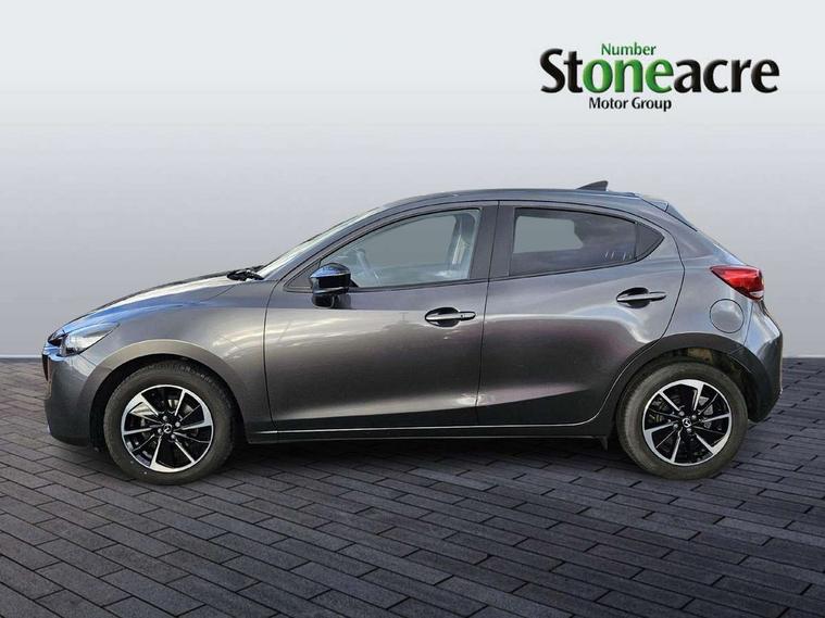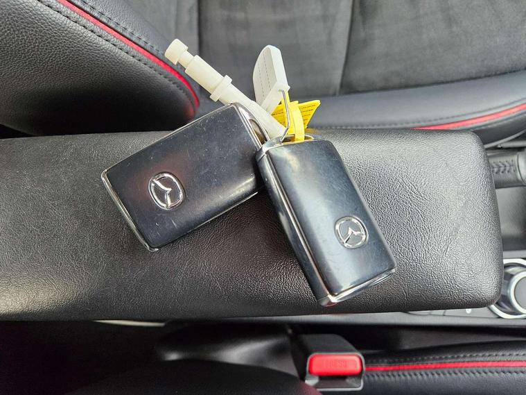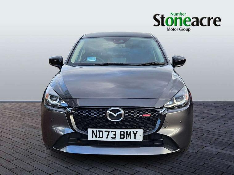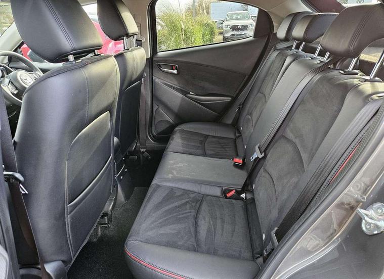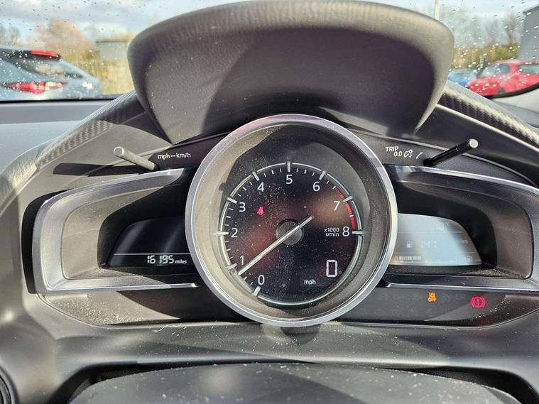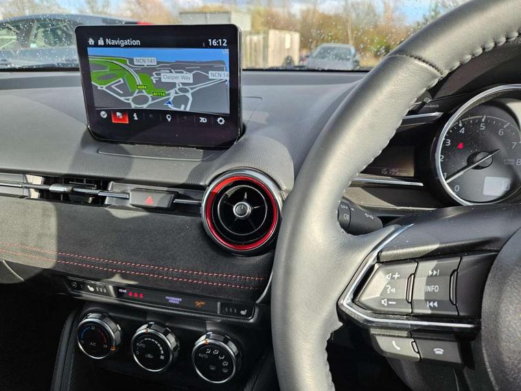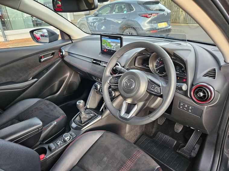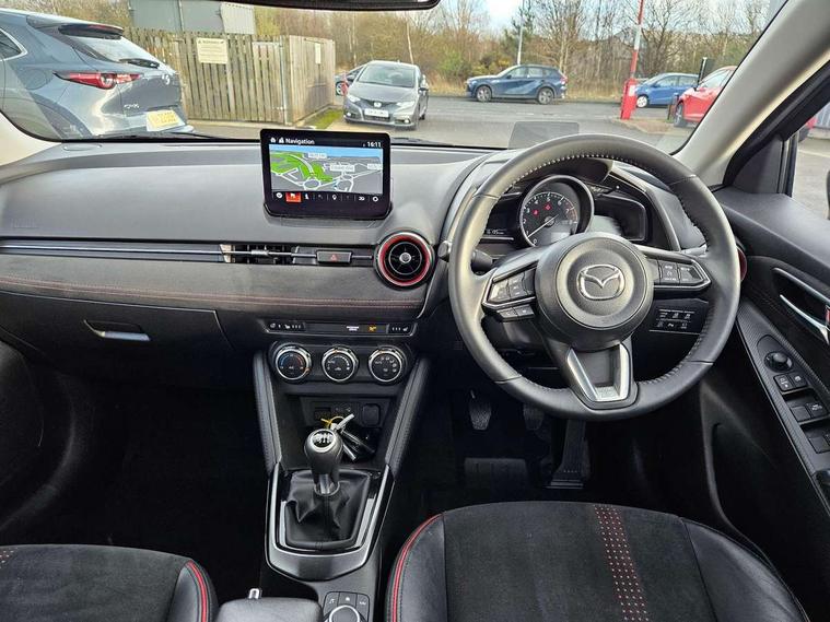 Adjustable speed limiter, Analogue rev counter, Cruise control, Digital instrument cluster, Digital speed display meter, E-call, Emergency stop signalling system, Engine start/stop button, Integrated bluetooth, Lane departure warning system, Lane keep assist, Mazda connect with 8" colour touch screen, Navigation system, PAS, Service indicator, Tailgate, Trip computer, Wireless Apple CarPlay and wired Android Auto, i-stop, Mazda M hybrid, AM/FM/DAB radio with 6 speakers with USB and AUX inputs, Multimedia Commander including separate volume dial, Steering wheel mounted audio/bluetooth controls, Auto dimming rear view mirror, Auto headlight levelling, Black carbon effect roof, Black door mirrors, Black Shark-fin antenna, Body coloured front bumper with black lower bezel, Body coloured rear bumper with black lower mouldings and red accent, Chrome exhaust tailpipes, Coming/leaving home lighting function, Dusk sensing headlights, Electric adjustable/heated/folding door mirrors, Electric front/rear windows with one touch auto up/down for driver's window, Front honeycomb grill with red accent, Gloss black finish signature wing, Heated rear window, LED indicator lights, LED third brake light, Privacy glass, Rain sensing front wipers with adjustable sensitivity and speed, Rear side wing doors, Rear wiper, Signature LED daytime running lights, 3 seat bench in 2nd row, 60/40 split rear seats, Black/red air vent accents, Climate control air conditioning, Driver, Front passenger and two rear grab handles with coathooks, Drivers seat manual slide recline and height adjustment, Drivers/front passengers covered vanity mirrors and drivers ticket holder, Front centre storage with two cupholders, Front head restraints, Front passenger and driver door pockets, Front passenger seat manual slide, recline and height adjust, Front passenger seatback pockets, Gear shift indicator, Glovebox, Heated front seats with 3 stage setting, Heated leather steering wheel, Interior courtesy light with integrated spotlight, ISOFIX child seat anchorage points attached on outer rear seats, Leather gear knob, Leather handbrake, Leather/Cloth upholstery, Luggage compartment light, Single front passenger seat, Three height adjustable rear head restraints, Tilt/telescopic adjustable steering wheel, Driver Assistance pack - Mazda 2, 2x3 point front seatbelts with pre-tensioners, 3 point seatbelts on all rear seats, Anti-lock braking system (ABS), Collision mitigation braking system, Dynamic stability control + Traction control, ESP, Front and rear curtain airbags, Front driver, passenger and rear seat seatbelt warning, Front dual stage driver and single stage front passenger airbags, Front side airbags, Front smart city brake support, G-Vectoring control plus, Hill launch assist, Manual child lock in rear doors, Passenger airbag cut-off switch, Tyre pressure monitoring system, Deadlocking system, Power door locks, Remote central locking, Smart keyless entry, Thatcham accredited alarm and immobiliser, Black soft touch dashboard panel with red stitching colour coordination, 16" Black metallic machined alloy wheels, Emergency tyre repair kit,