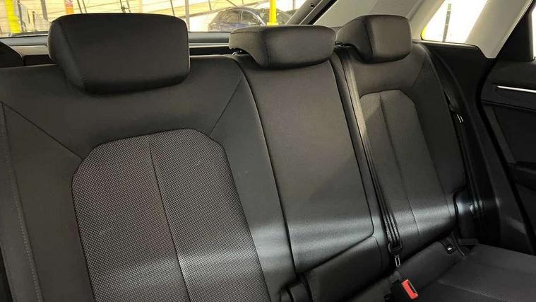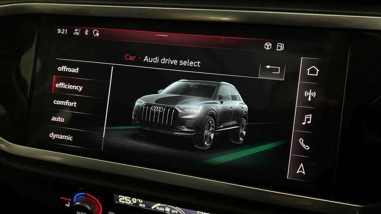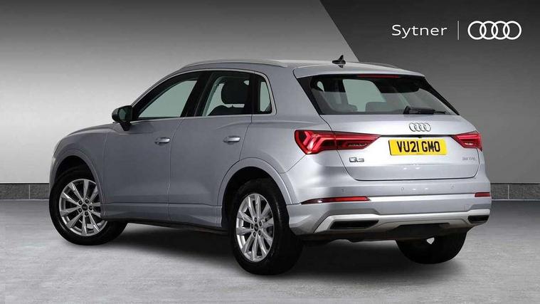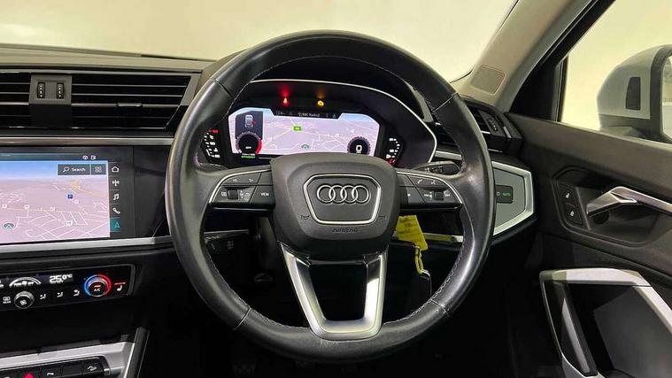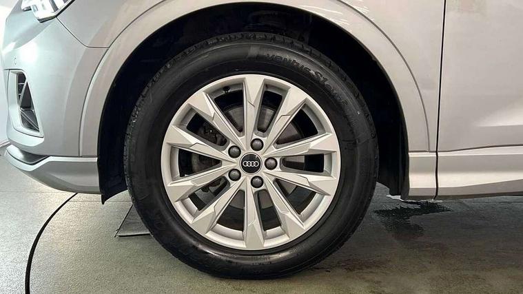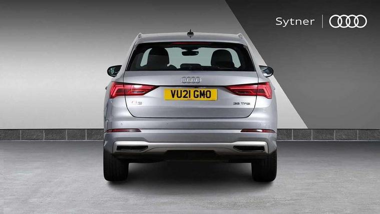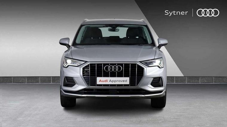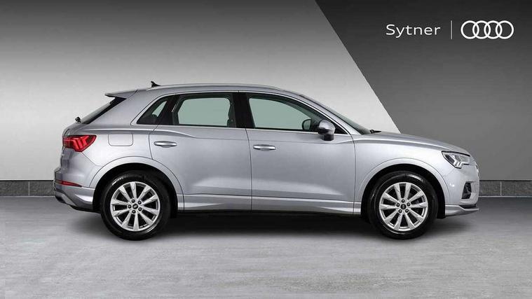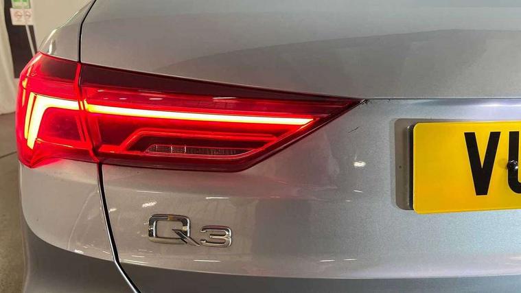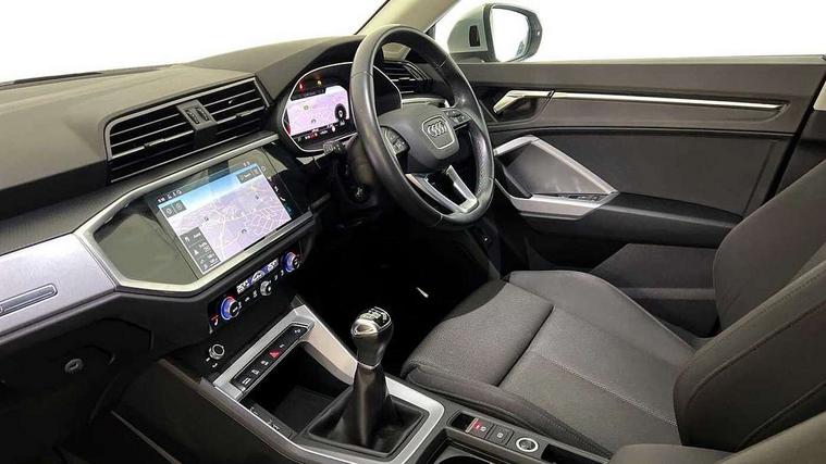 Audi connect safety and service (e-call), Audi drive select, Audi lane departure warning, Audi smartphone interface includes wireless Apple carplay/Android Auto, Audi Virtual Cockpit - 10.25" display, Bluetooth interface, Camera based traffic sign recognition, Cruise control + speed limiter, MMI Navigation Plus with high resolution 10.1 inch touchscreen colour display, Power operated tailgate, Progressive steering, Rear parking sensors, Service interval indicator, Start stop system with recuperation, Voice control system with natural language interaction, Standard suspension, 2 USB-C ports with charge and data functions, 6 passive loudspeakers, DAB digital radio module, Acoustic windscreen, Aluminium roof rails, Aluminium window trim, Auto dimming frameless rear view mirror, Body coloured bumpers, Electrically folding, adjustable and heated door mirrors with integrated LED side indicators and kerb view function for passenger side, Front and rear electric windows, Front fog lights, Front side air inlets in matt selenite silver, Front spoiler in matt selenite silver, Grille vertical bars in aluminium silver/Matt, High gloss black finish B and C pillars, LED headlights with LED daytime running lights and dynamic rear indicator, LED rear lights, Rain and light sensors, Rear diffuser strip in matt selenite silver, Silver chrome grille surround, Titanium black radiator grille, 12V socket in rear centre console, 3 spoke multi-function leather steering wheel, 40:20:40 folding with manual adjustment for 60:40 forwards/backwards position and backrest angle, Adjustable rear seat bench/backrest, Aluminium door sill trims, Dual zone electronic climate control, Front and rear floor mats, Front and rear headrests, Front and rear roof module including reading lights, Front centre armrest, Glove compartment lighting, Height and reach adjustable steering wheel, ISOFIX child seat mounting for front passenger with airbag deactivation and outer rear seat including top tether attachment point for outer rear seats, Luggage compartment light, Lunar silver cloth headlining, Manual front seats with height adjustment, Stainless steel luggage compartment sill finisher, Non smoking pack - Q3, 3x3 point rear seatbelts, 6 airbags - Driver, front passenger, curtain and side windows, Audi pre-sense front with pedestrain and cyclist recognition, Electrically operated child locks on rear doors, Electromechanical parking brake, Electronic stabilisation control including ABS, ASR and EDL, Hill descent control, Hill hold assist, Pre sense basic, Seatbelt monitoring, Tyre pressure warning, Warning triangle and first aid kit, Anti theft alarm, Anti theft wheel bolts, Remote central locking, Detail dashboard around MMI touch colour display in glass look, black with surround in aluminium look, Micrometallic silver inlay,
