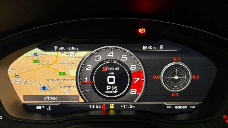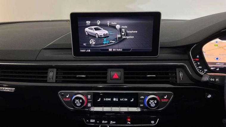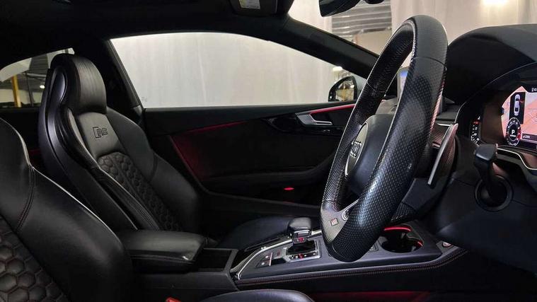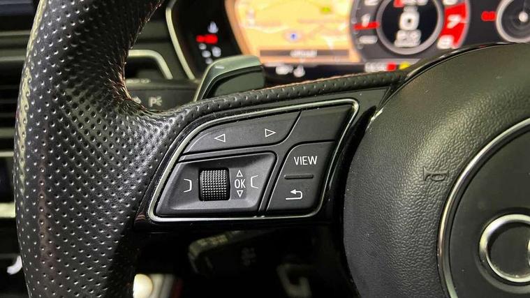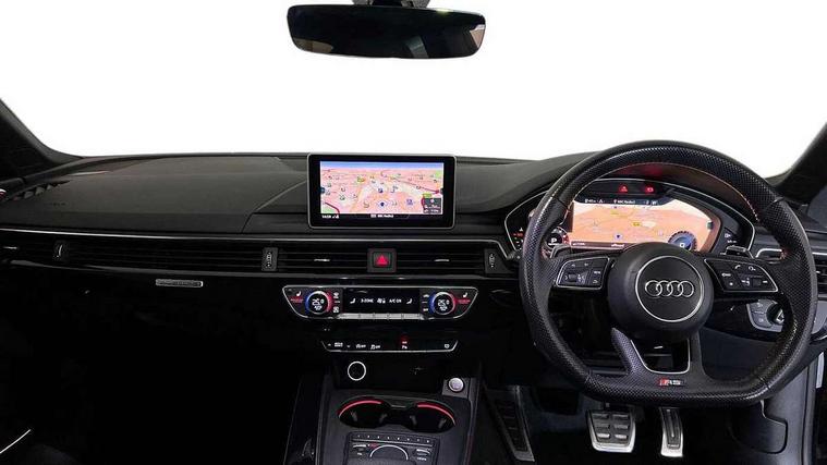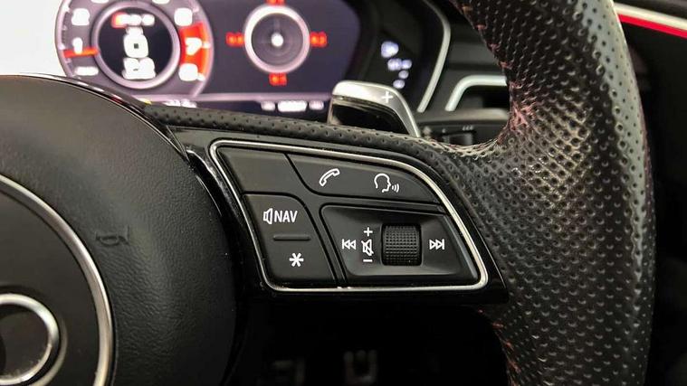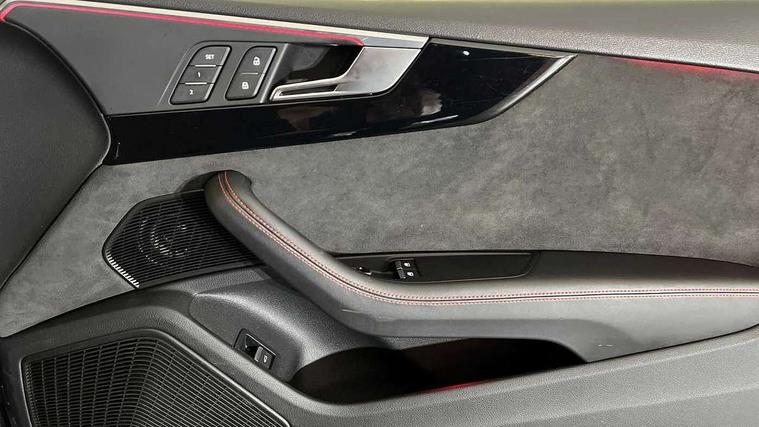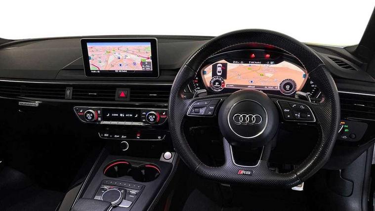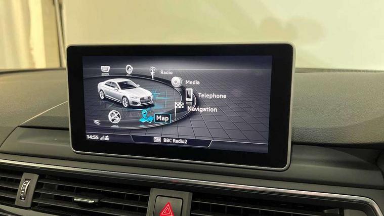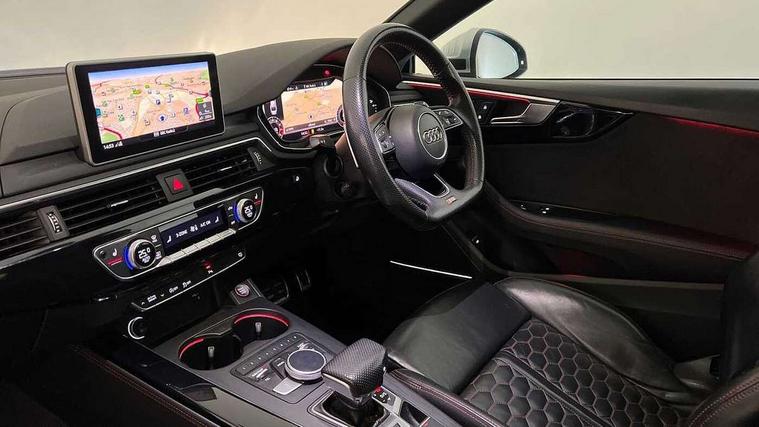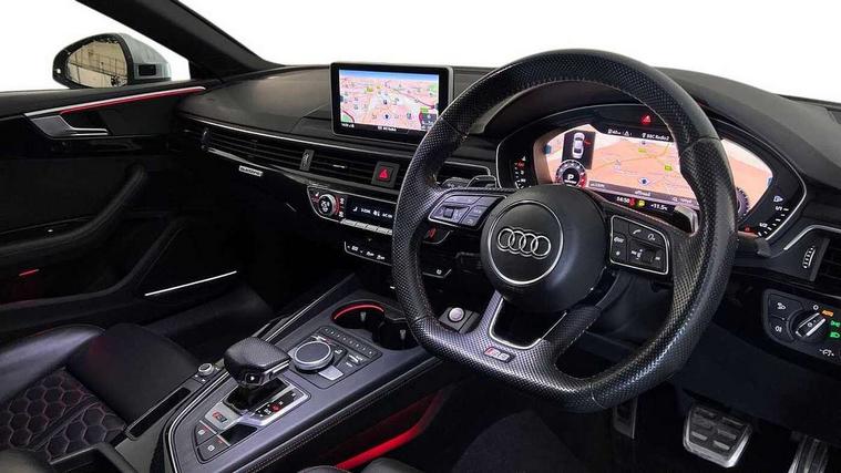 Audi connect, Audi drive select, Audi parking system plus with front and rear sensors, Audi smartphone interface, Colour driver's information system display, Electric boot release, MMI navigation plus with MMI touch, Mobile telephone preparation - bluetooth interface, Service interval indicator, Virtual cockpit, Voice control system, Quattro sports differential, 2 x USB charging port with aux input socket, CD player, DAB Digital radio, MMI radio plus with 7" colour MMI screen and MMI controller, Two SDXC card slots, Air inlets in titanium black, Auto dimming rear view mirror with acoustic windscreen, Body colour bumpers, Body colour door handles, Body colour rear diffuser with chrome strip, Electric front windows, Electrically adjustable and heated door mirrors, Front fog lights, Headlight washers, Heat insulated glass, High beam assistant, Rain and light sensors, Twilight grey matt radiator grille in matt aluminium inlay, Twilight grey matt rear diffuser, Twin chrome exhaust tailpipes x2, Adjustable steering column, Aluminium door sill trims, Automatic tri-zone climate control, Black headlining, Boot mat, Centre console with cupholders, Electric lumbar support, Fine Nappa leather upholstery, Front centre armrest, Front head restraints, Front/rear floor mats, Illuminated door sills, Isofix front passenger and rear seat preparation, Jack and tool kit, Massage function for front seats, Rear centre armrest, Rear headrests, Rear seat storage trays, Split folding rear seat, Stainless steel pedals and foot rest, Super sports seats, Top tether anchor plate for isofix child seat, Extended interior upholstery pack - A5/RS5, Non Smokers pack, ABS, ASR, Driver/Front Passenger airbags, Enhanced braking system, ESP + traction control, First aid kit, Front and rear curtain airbags, Front passenger airbag deactivation, Height adjustable front seatbelts, Multi-Collision braking, Pre-sense city emergency braking system, Seatbelt warning, Side airbags, Warning triangle, Anti theft system, Keyless start, Locking wheel bolts, Remote central locking, Space saver spare wheel,