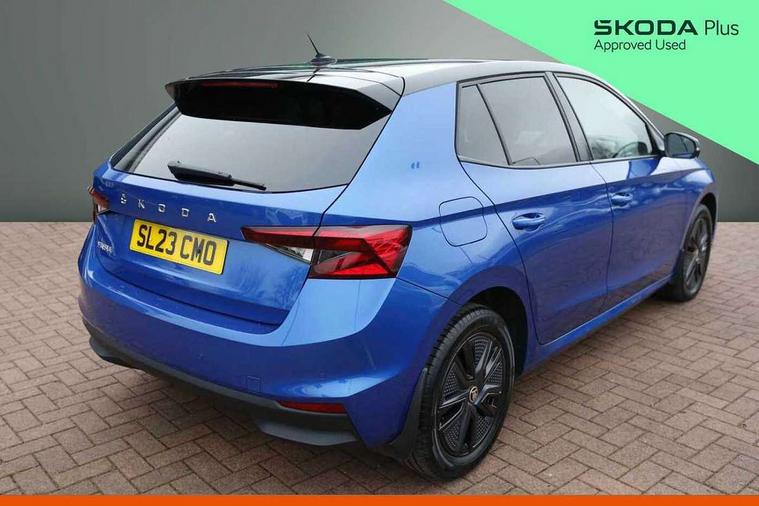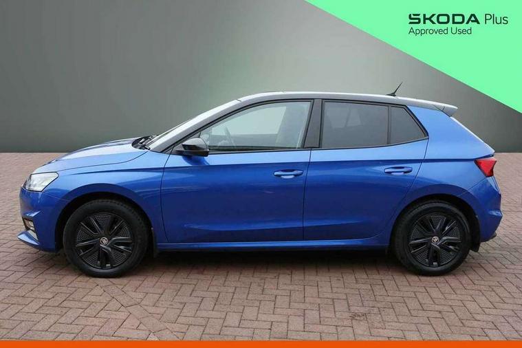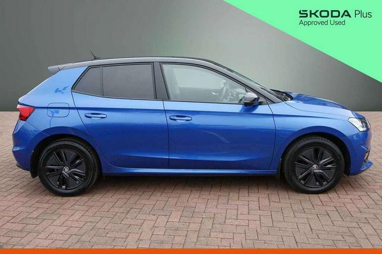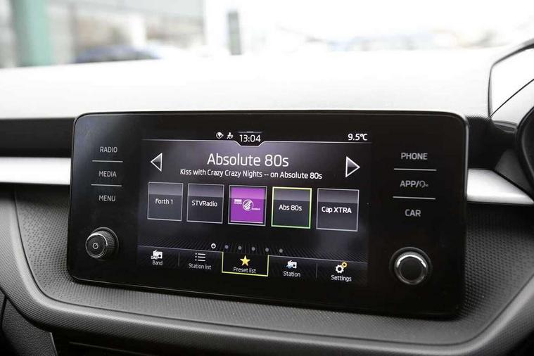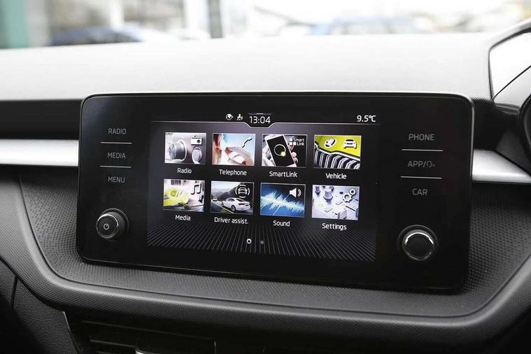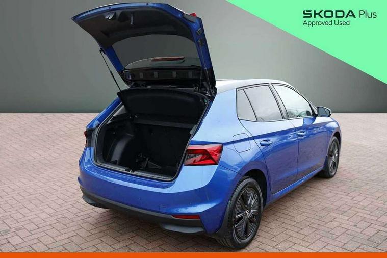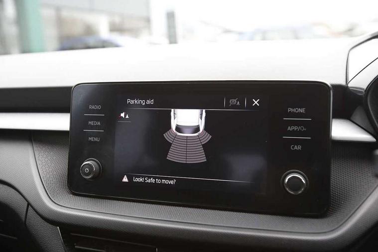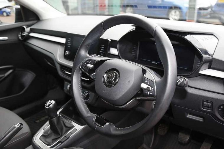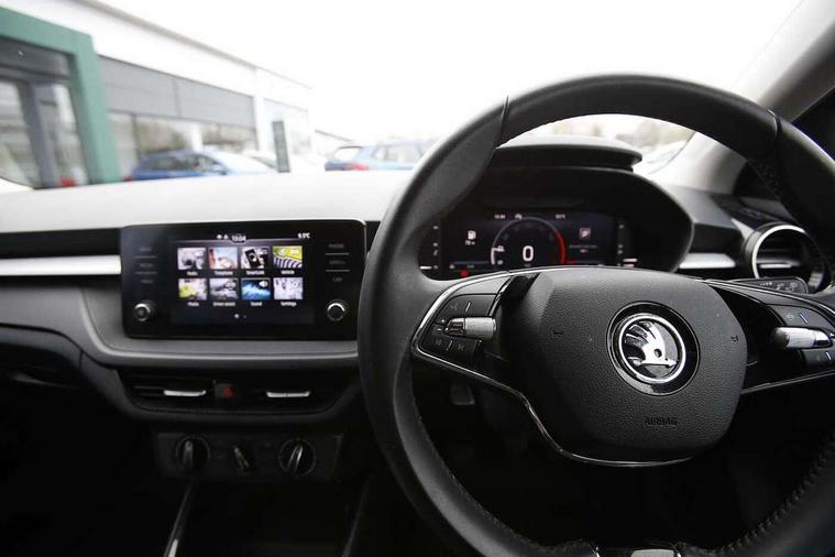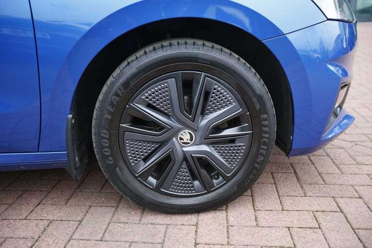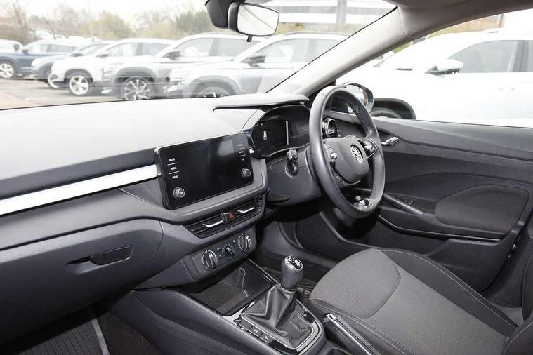 Bluetooth connection, Driver alert system - DAS, Electromechanical power steering, Exterior temperature gauge, Lane assist including road edge detection, Service interval indicator, Virtual cockpit with 10.25" colour display, 2x USB-C in the front (for data transmission and charging), 6 Speakers (4 in front and 2 in rear), Auxiliary socket for external MP3 player, Bolero radio with 8" colour display, DAB digital radio reception, Basic rear lights, Body coloured bumpers, Dimming rear view mirror with black frame, Door mirror integrated indicators, Electrically adjustable and heated door mirrors, Electrically adjustable front windows with function auto up/down, Front window wiper intermittent control, Headlight range control - Automatic, Ice scraper in fuel cap, LED daytime running lights with coming and leaving home feature, Mechanical adjustable rear windows, Privacy glass, Rear LED fog light, Rear side wing doors, Rear window wiper with washing nozzles, Roof mounted spoiler, SKODA tailgate lettering in chrome, Third brake light, 3 rear headrests, Backrest split and folding, Central console with fixed cup holder and storage box, Chrome handbrake release button, Fabric upholstery, Gearshift knob/handle in leather, Grain satin black interior door handles, Hand brake lever handle in leather, Height adjustable front headrests, Height adjustable steering wheel, ISOFIX and TopTether anchorage points to the outer rear seats, ISOFIX and TopTether on the front passenger seat, Luggage compartment lighting, Pollen filter, Rear seat bench unsplit, Single front passenger seat, Storm grey headlining, Sun visors with mirror and airbag label on passenger side, Ticket holder, Umbrella in drivers door, 3-point height adjustable front seats belts with pretensioner and force limiter, Automatic warning lights in case of crash, Driver and passengers airbag with switch off function, e-Call+, ESC including ABS, MSR, ASR, EDS, HBA and XDS, Front and rear seat belt warning, FRONT ASSIST (AEB City and AEB Inter Urban), Front side airbags, Head airbags, One tone horn, Pedestrian protection, Three rear 3-points safety seat belts with pretensioner and force limiter including stop function for outer rear seat belts, Tyre pressure monitoring system, Anti-theft alarm system including immobiliser, interior monitoring, backup horn, and towing protection, Anodized cross line upper decorative trim, Colour Edition air vents, Grain satin black central console cover, Grain satin black lower decorative trim, Satin black door and side trim panel in front, Anti-theft wheel bolts protection, Super-low rolling resistance tyres,