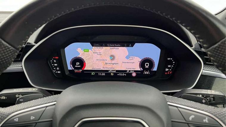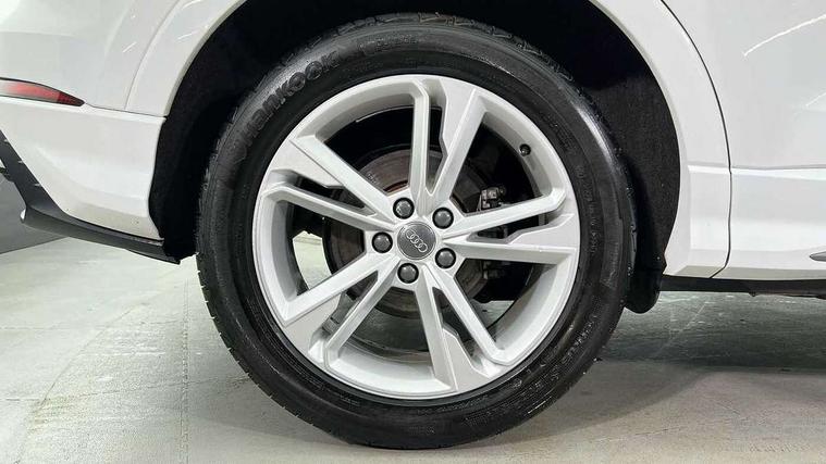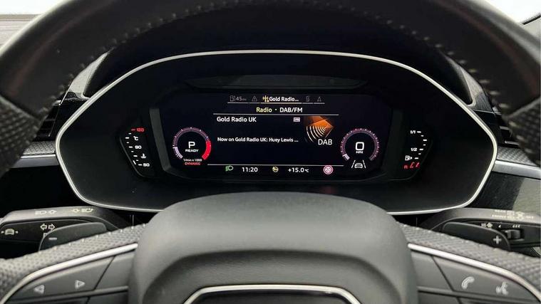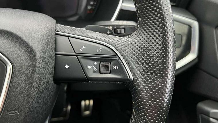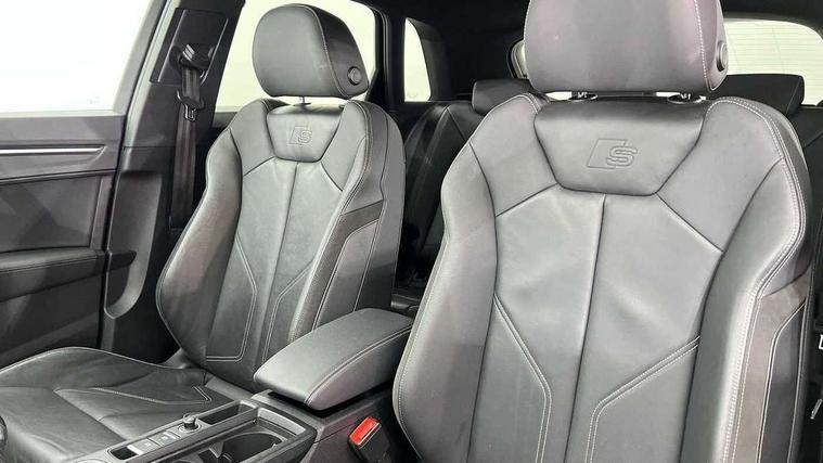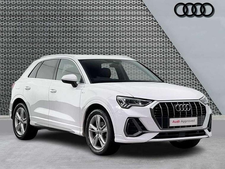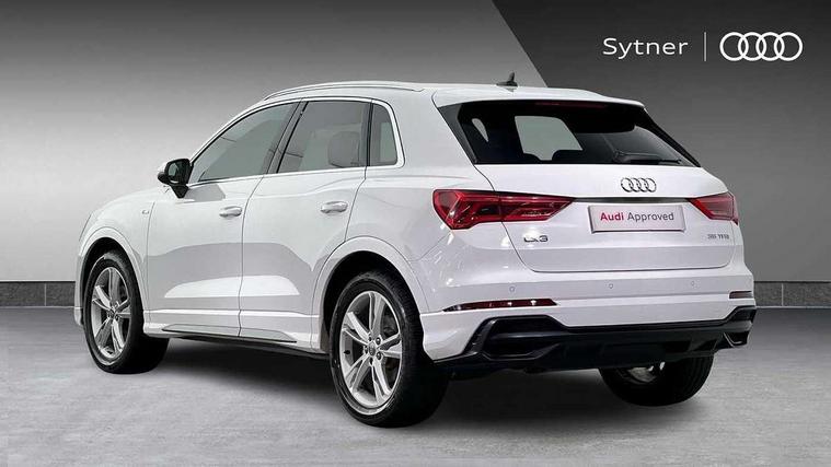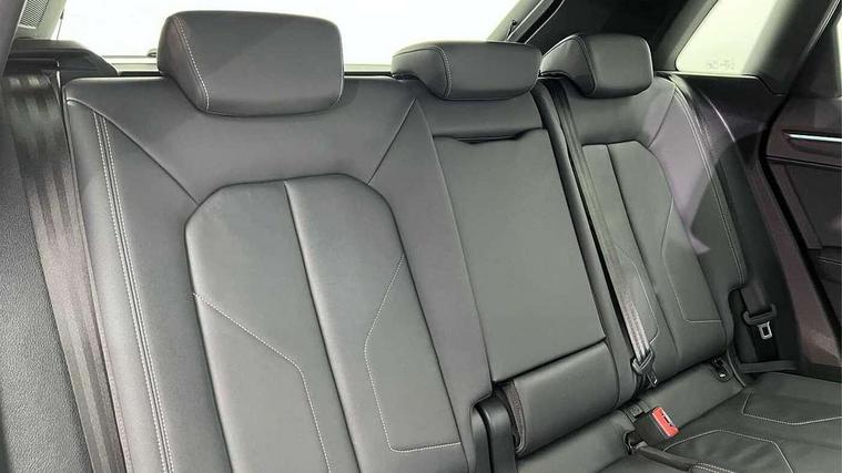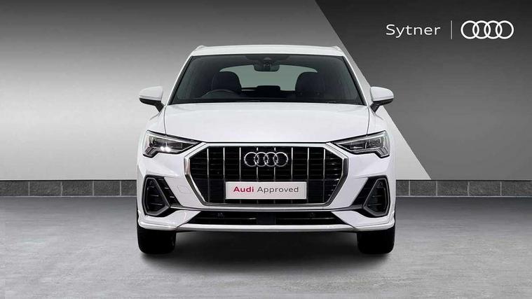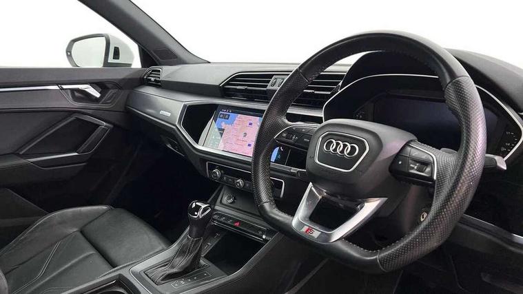 Audi connect safety and service (e-call), Audi drive select, Audi lane departure warning, Audi side assist, Audi Virtual Cockpit - 10.25" display, Bluetooth interface, Camera based traffic sign recognition, MMI Navigation Plus with high resolution 10.1 inch touchscreen colour display, Power operated tailgate, Progressive steering, Service interval indicator, Smartphone interface includes wireless Apple carplay/Android Auto, Start stop system with recuperation, Voice control system with natural language interaction, 48V Mild hybrid technology, Sports suspension, 1 x USB type C and 1 USB type A charging points, 6 passive loudspeakers, DAB digital radio module, Acoustic windscreen, Aluminium roof rails, Aluminium window trim, Auto dimming frameless rear view mirror, Body coloured bumpers, Electrically folding, adjustable and heated door mirrors with integrated LED side indicators and kerb view function for passenger side, Front and rear electric windows, Front fog lights, Front side air inlets in matt platinum grey, Front spoiler blade in matt platinum grey, Grille vertical bars in aluminium silver/Matt, High gloss black finish B and C pillars, LED headlights with LED daytime running lights and dynamic rear indicator, LED rear lights, Privacy glass dark tinted rear and rear-side windows (from B-pillar backwards), Rain and light sensors, Rear diffuser strip in matt titanium black, S line badges on front wings, S Line front and rear bumpers, Side skirt insert in matt Platinium grey, Silver chrome grille surround, Titanium black radiator grille, 12V socket in rear centre console, 40:20:40 folding with manual adjustment for 60:40 forwards/backwards position and backrest angle, Adjustable rear seat bench/backrest with centre armrest and cupholder, Black cloth headlining, Dual zone electronic climate control, Front and rear black floor mats with contrast stitching in rock grey, Front and rear headrests, Front and rear roof module including reading lights, Front centre armrest, Glove compartment lighting, Height and reach adjustable steering wheel, Illuminated door sill trims with S logo, ISOFIX child seat mounting for front passenger with airbag deactivation and outer rear seat including top tether attachment point for outer rear seats, Luggage compartment light, Manual front seats with height adjustment, Perforated leather gearknob, Stainless steel luggage compartment sill finisher, Stainless steel pedals, Non smoking pack - Q3, 3x3 point rear seatbelts, 6 airbags - Driver, front passenger, curtain and side windows, Audi pre-sense front with pedestrain and cyclist recognition, Electrically operated child locks on rear doors, Electromechanical parking brake, Electronic stabilisation control including ABS, ASR and EDL, Hill descent control, Hill hold assist, Pre sense basic, Seatbelt monitoring, Tyre pressure warning, Warning triangle and first aid kit, Anti theft alarm, Anti theft wheel bolts, Remote central locking, Dark matt brushed aluminium inlay, Detail dashboard around MMI touch colour display in glass look, black with surround in aluminium look, Leatherette door armrest, Tool kit, Tyre repair kit,